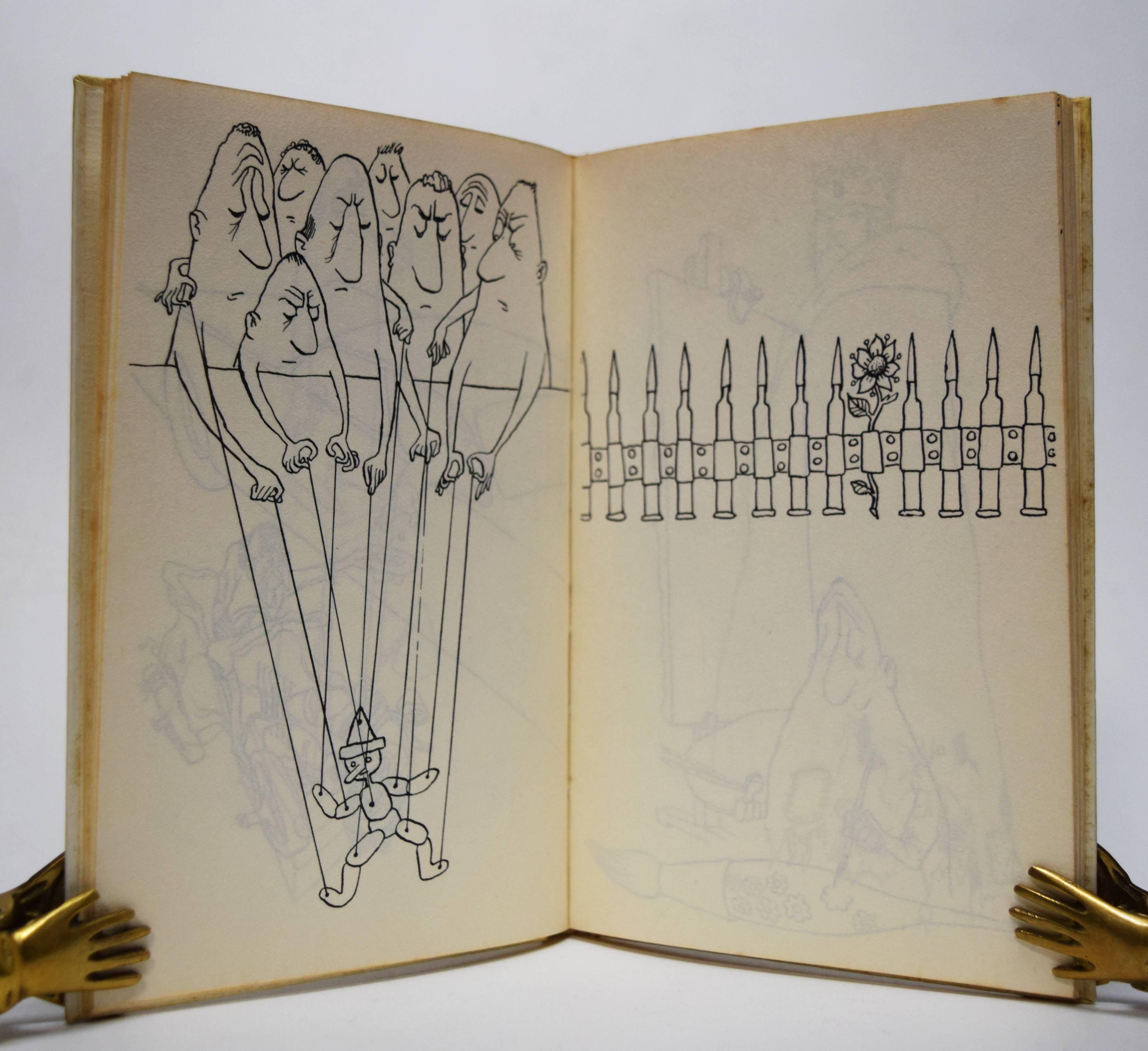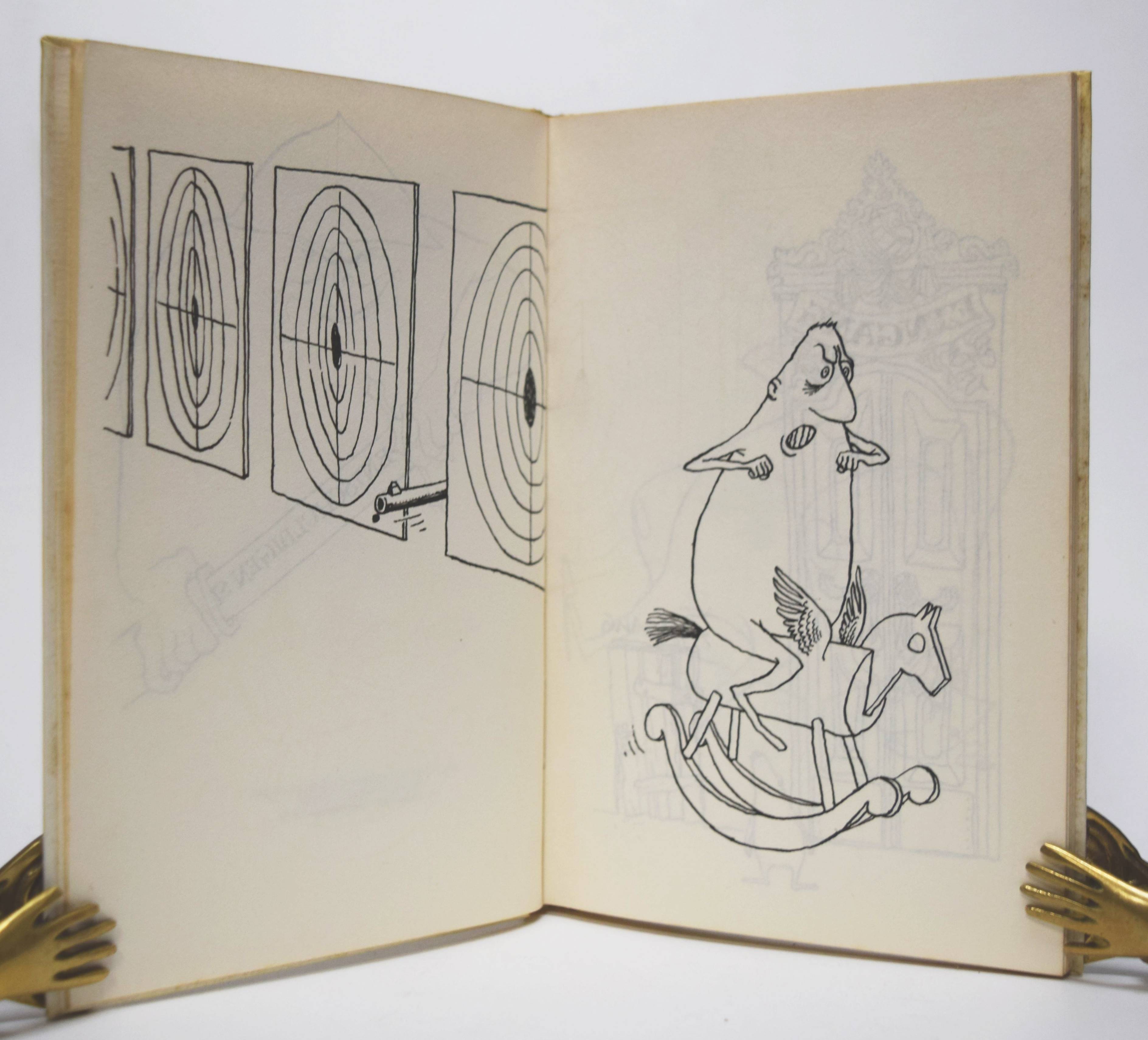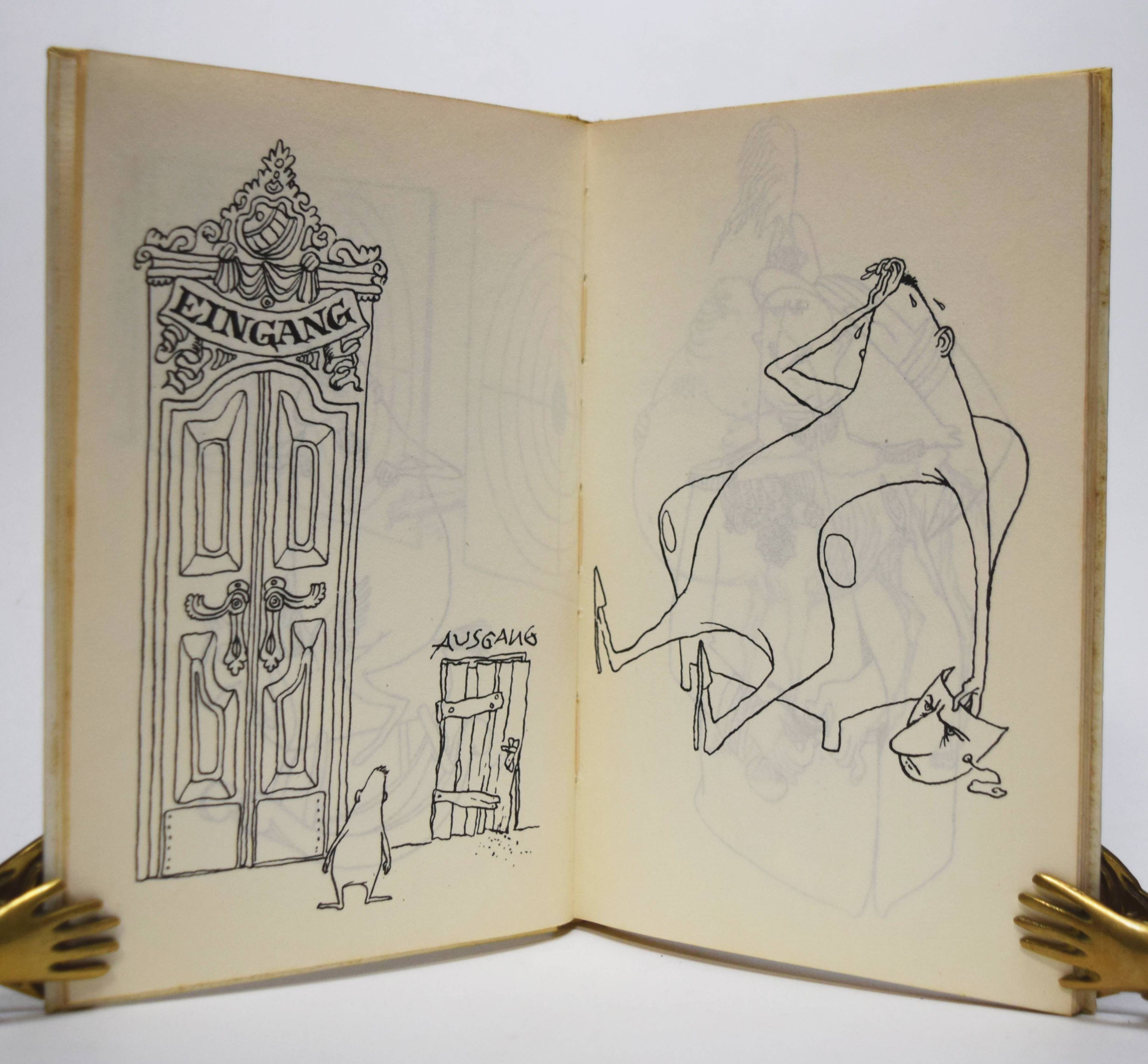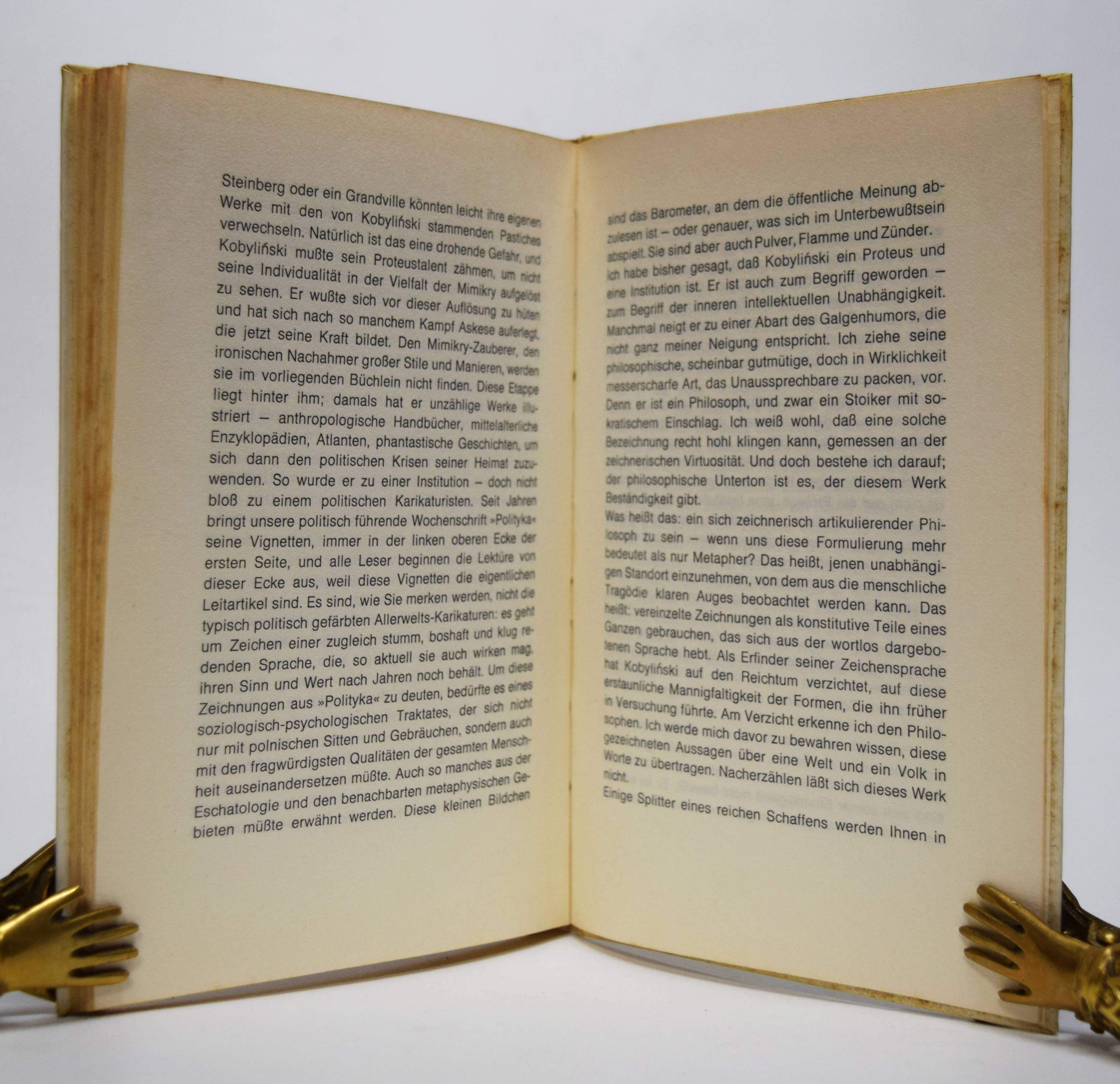 Kobylinski, Szymon. Entschuldigen’s. Gezeichnete Aphorismen. Mit einem Nachwort von Stanislaw Lem. Frankfurt am Main, Insel-Verlag 1972. 8°. [29] Bl. mit ganzs. Illustrationen. Illustr. Orig.-Pappband. (Insel-Bücherei, Band 964). Erste deutsche Ausgabe, selten. – Einband und Schnitt stellenweise etwas braunfleckig, sonst gut erhalten.
