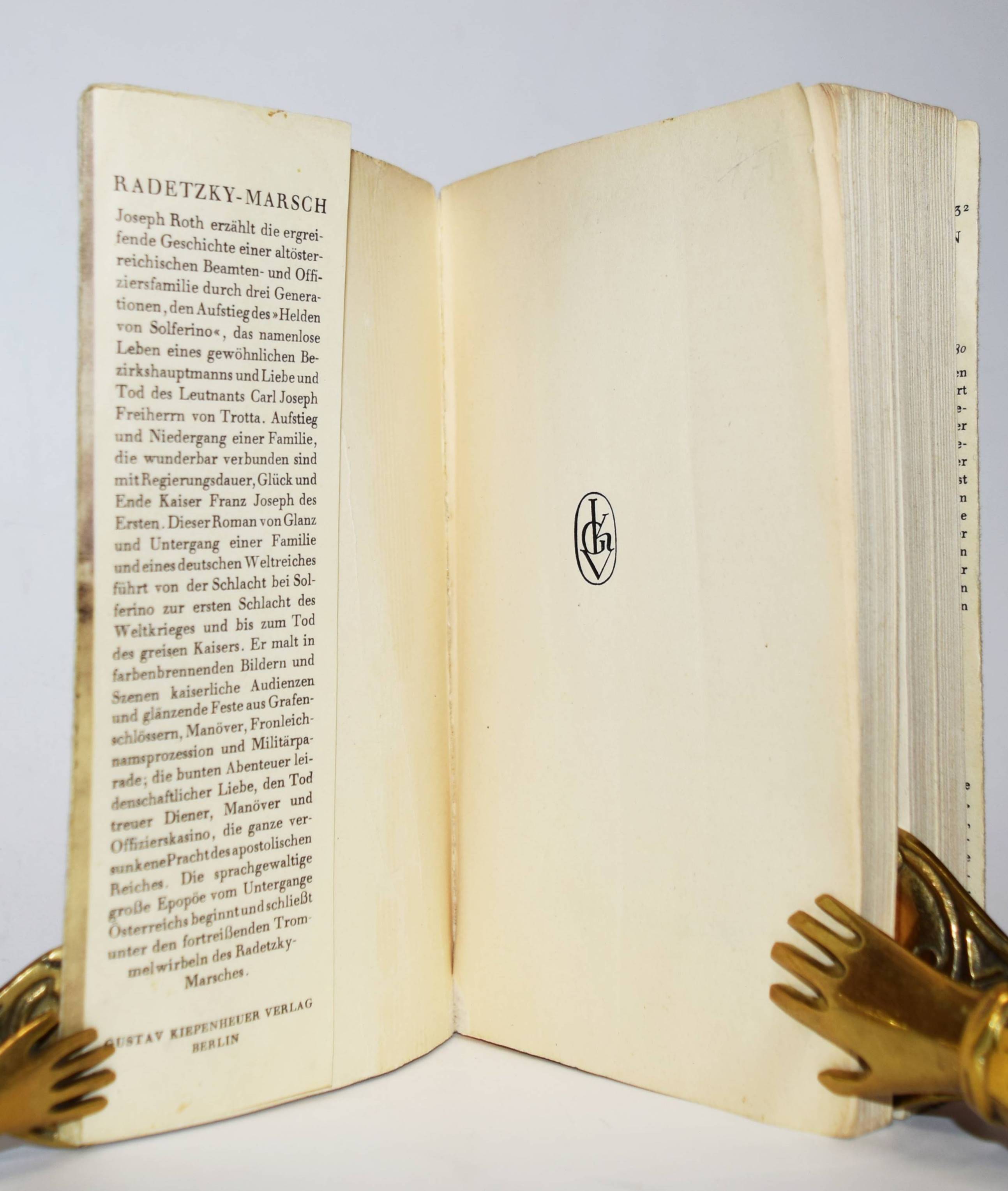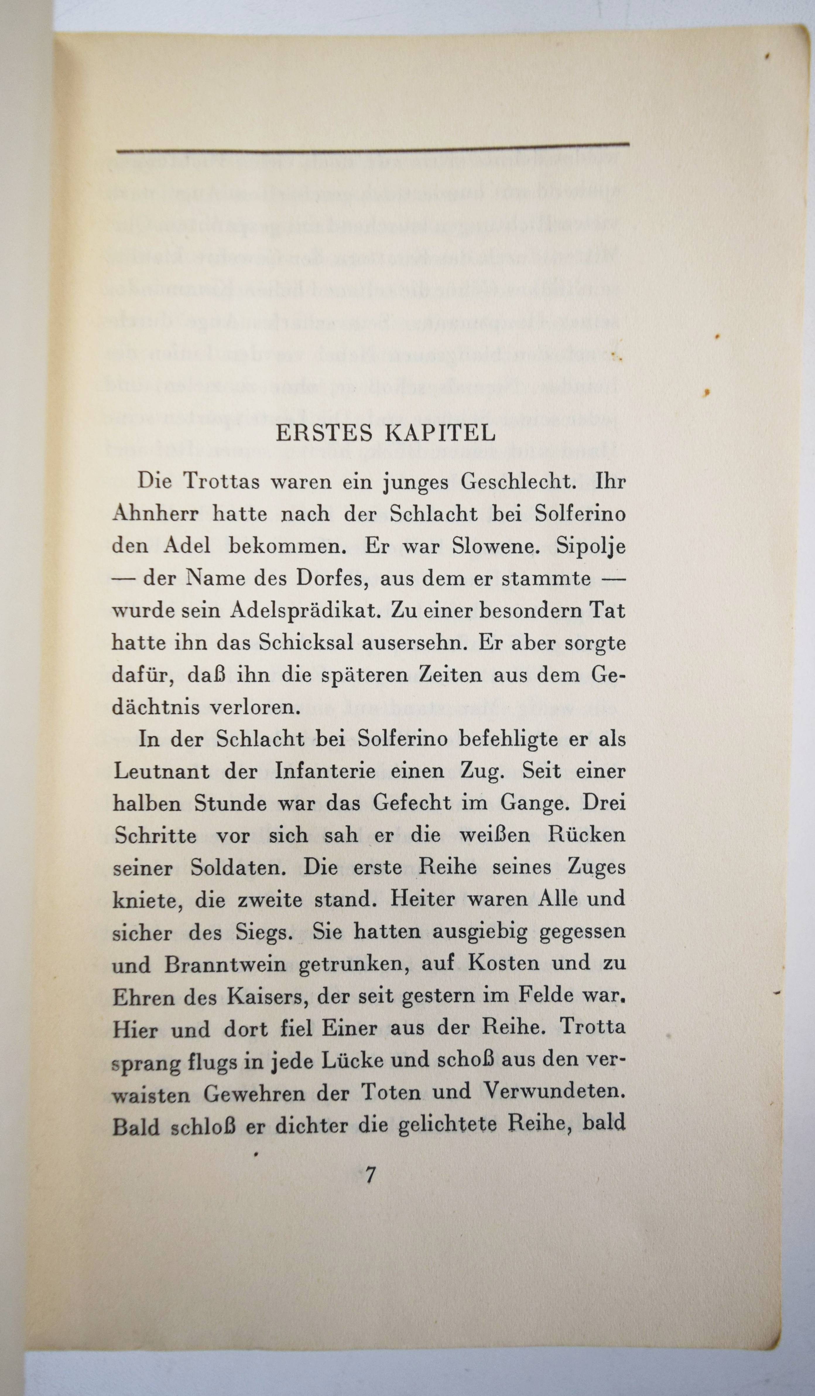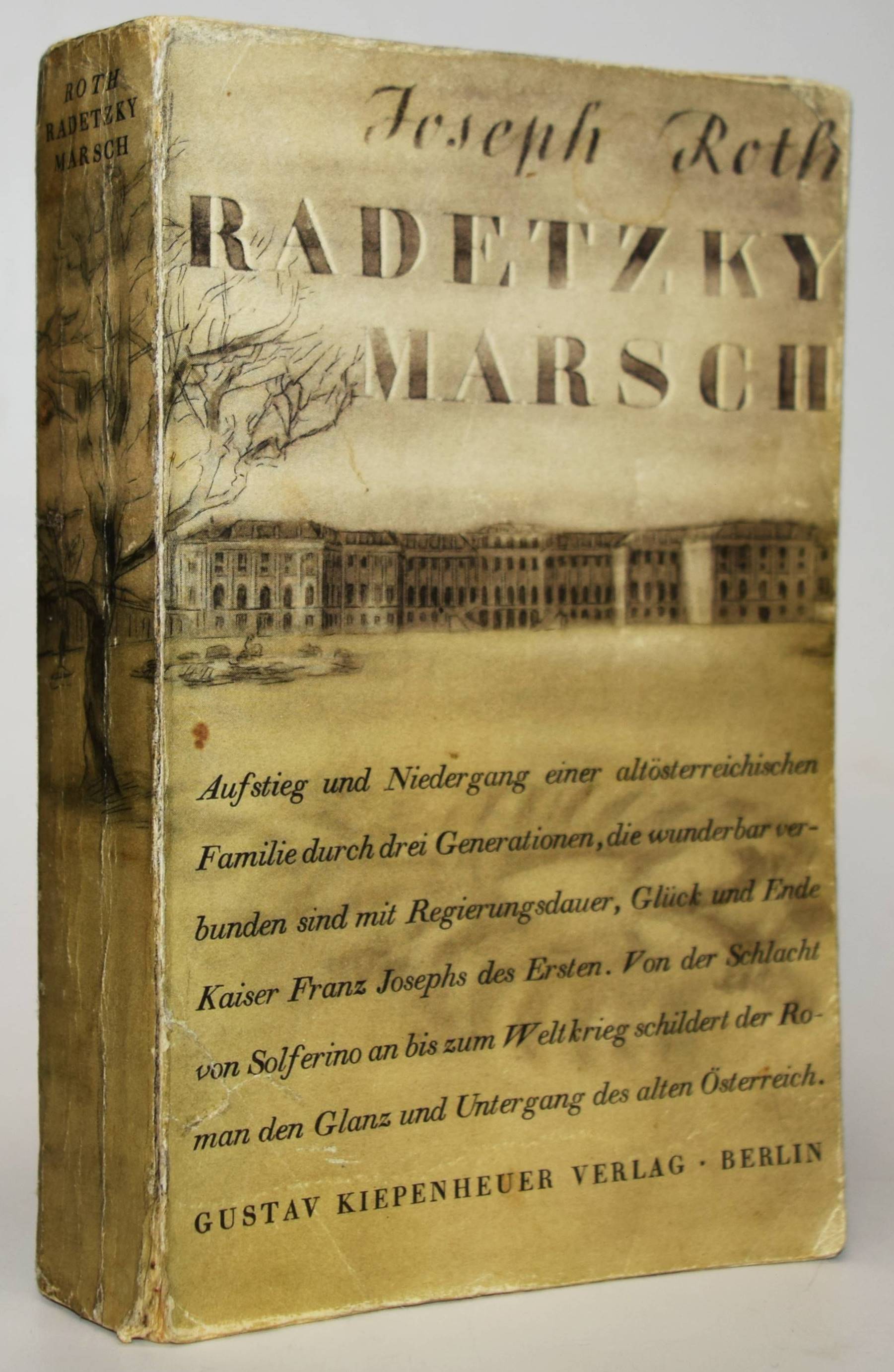 Roth, Joseph. Radetzkymarsch. Roman. Berlin, Gustav Kiepenheuer 1932. 8°. 582 S., [1] Bl. Orig.-Kartonumschlag mit Schutzumschlag (Entwurf: Georg Salter). Holstein, Blickfang 14. Roth-Katalog 609. Sternfeld-Tiedemann 426. W.-G.² 11. – Seltene erste Ausgabe von J. Roth bekanntestem Roman, in dem er am Beispiel des Schicksals von vier Generationen einer Familie den allmählichen Zerfall des Habsburgerreiches darstellt. – Kritiker Marcel Reich-Ranicki zählt das Buch zu den zwanzig wichtigsten Romanen in deutscher Sprache. – „Zur Entstehung des Romans teilt der Verleger Wolf Jobst Siedler mit: „In den letzten Monaten vor der Machtergreifung der Nationalsozialisten [Januar 1933] hatte Joseph Roth monatelang [in Berlin] an einem bestimmten Tisch in Mampes Guter Stube gesessen, hier hatte er grosse Teile seines Radetzkymarschs geschrieben, und seine Trauer über den Untergang Habsburgs und des uralten Kaisers war wohl die Trauer über den Untergang des alten Europa.“ Tatsächlich geschrieben hat Roth diesen Roman, wie sich aus seinen Briefen rekonstruieren lässt, ab Herbst 1930 bei Freunden (u. a. Stefan Zweig) und in Hotels in Frankfurt a. M., Berlin, Paris, Baden-Baden und im französischen Antibes. Die Arbeit konnte im Sommer 1932 abgeschlossen werden. Die ersten Exemplare der Buchausgabe erschienen Ende August/Anfang September 1932 in Berlin“ (Wikipedia). – „The best political novel ever written“ (Mario Vargas Llosa). – „Joseph Roths Radetzkymarsch ist natürlich nicht einfach nur mein Lieblingsbuch. Es ist das schönste Buch der Welt. Das traurigste. Sentimentalste. Wundersamste. Es ist ein Wunder“ (Volker Weidermann: Mein Lieblingsbuch: „Radetzkymarsch“. In: FAZ. 12. Juli 2004, S. 31). – Gelenke und Kanten etwas berieben, Schnitt angestaubt, noch sehr gutes Exemplar der sehr seltenen kartonierten Ausgabe.