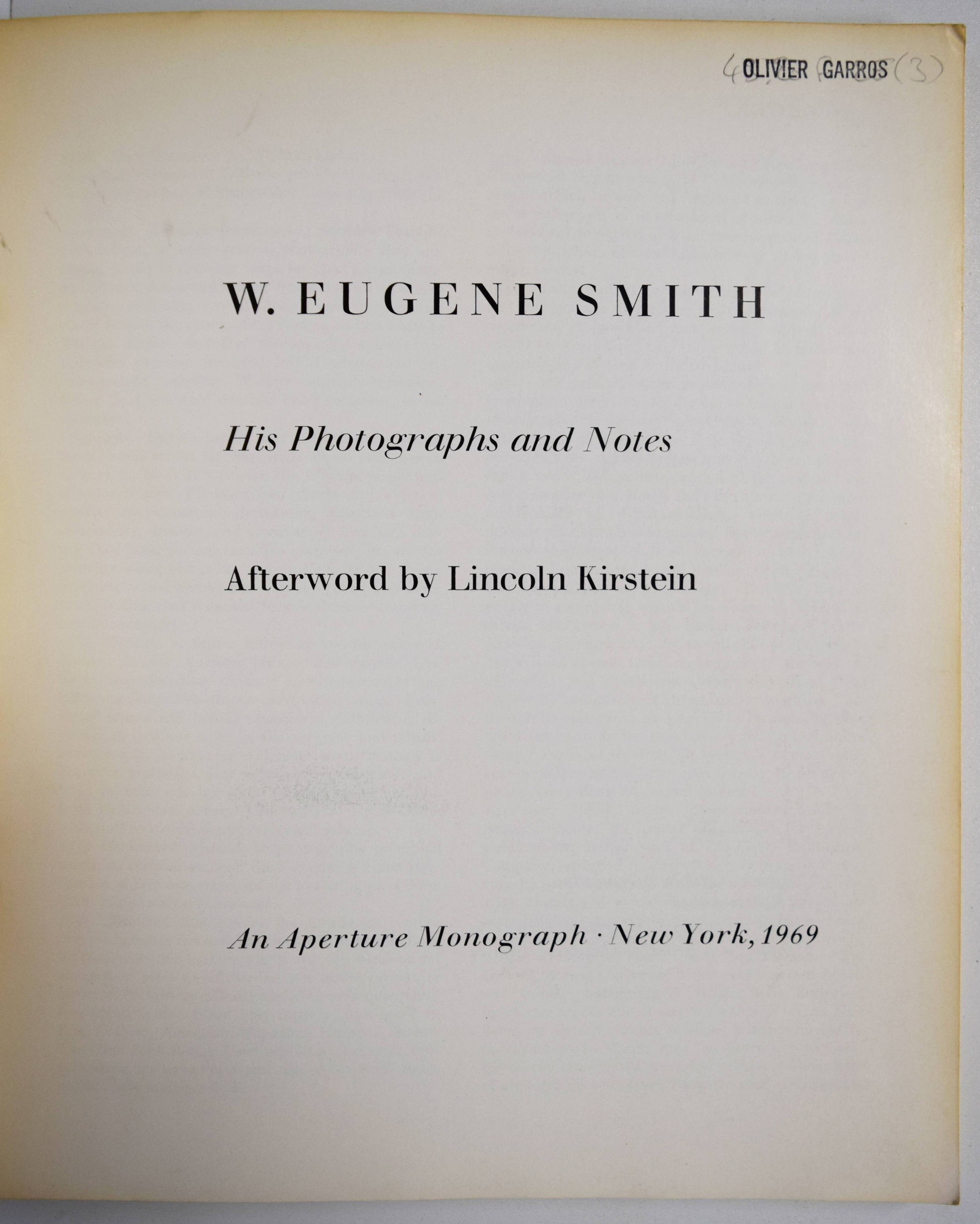 Smith, W(illiam) Eugene. His photographs and notes. Afterword by by Lincoln Kirstein. (Editor: Minor White). New York, Aperture 1969. 4° (24,5 x 21 cm.). [74] Bl. mit ca. 50 Duotone-Tafeln. Illustr. Orig.-Kartonumschlag. (An Aperture Monograph, Vol. 14, Nr. 3 and 4). Koetzle, Fotografen A-Z 374. – Erste Ausgabe der ersten Monographie der „Fotografenlegende der 1940er und 1950er Jahre“ (H.-M. Koetzle). – „Während seiner gesamten Karriere stand alles, was Smith produzierte, unter dem Vorzeichen der Veröffentlichung. Kein einziges Bild wurde aufgenommen oder ausgewählt, ohne dass der Fotograf ein bestimmtes Buch oder Magazin im Kopf gehabt hätte. Von seinen ersten Fotoreportagen für die Zeitschrift News-Week, für die er ab 1937 arbeitete (kurz vor ihrer Umbenennung in Newsweek), bis „Minamata“; (1972) – alle Bilder von Smith wurden narrativ in einen strukturierten Rahmen eingebettet, auf eine fortlaufende Weise, die bis dato für Pressefotografen keine Option gewesen war; dies gilt gleichermaßen für seine gelungene Serie von Fotoessays für Life zwischen 1948 und 1954 sowie für das Essay über Pittsburgh und das endlose (und unvollendete) autobiografische Fotografieprojekt „The Walk to Paradise Garden“.“ (Gilles Mora in Koetzle). – Rücken und Umschlag im Rand gebräunt, Stempel auf dem Titelblatt, sonst gut erhalten.