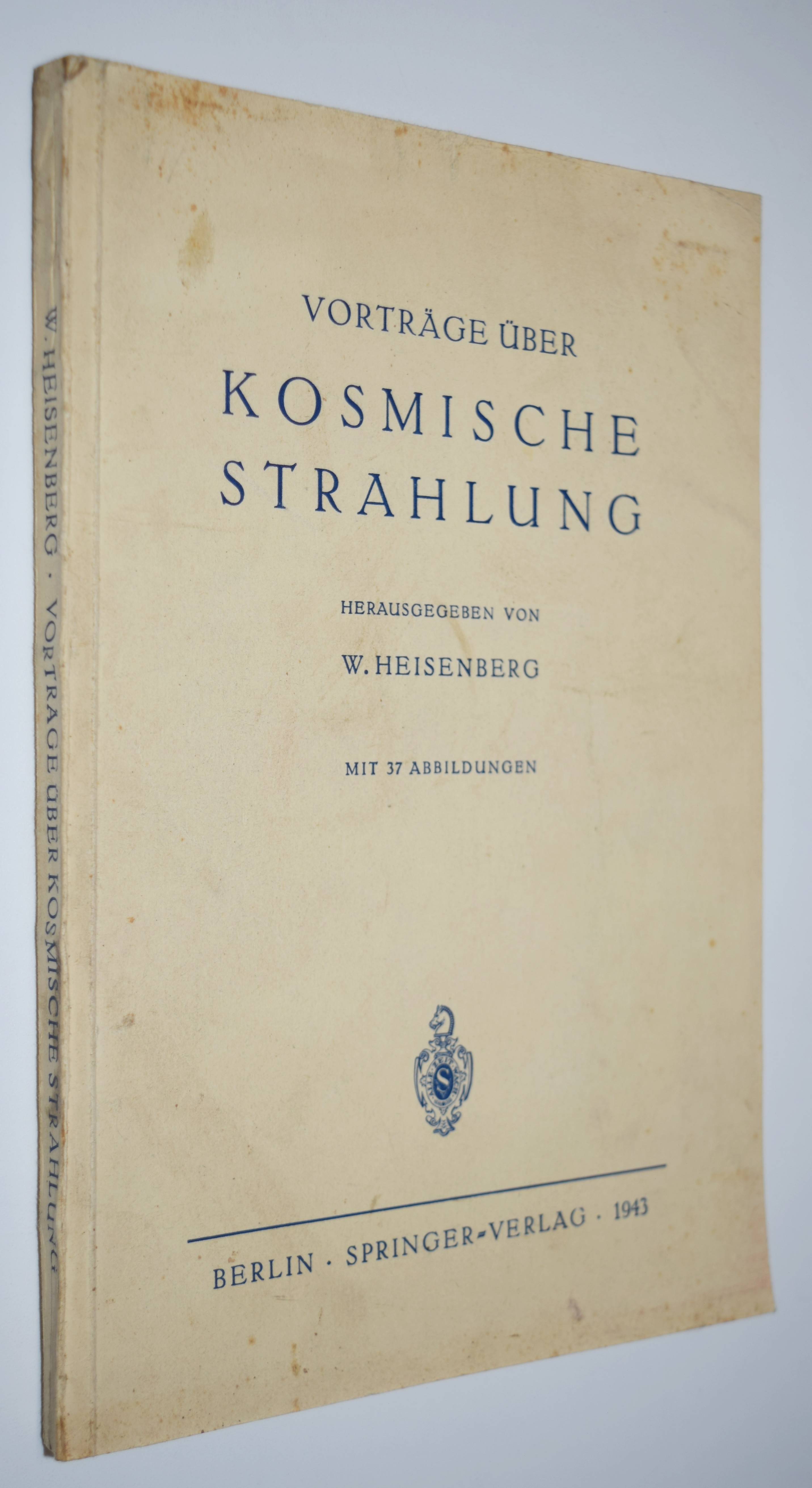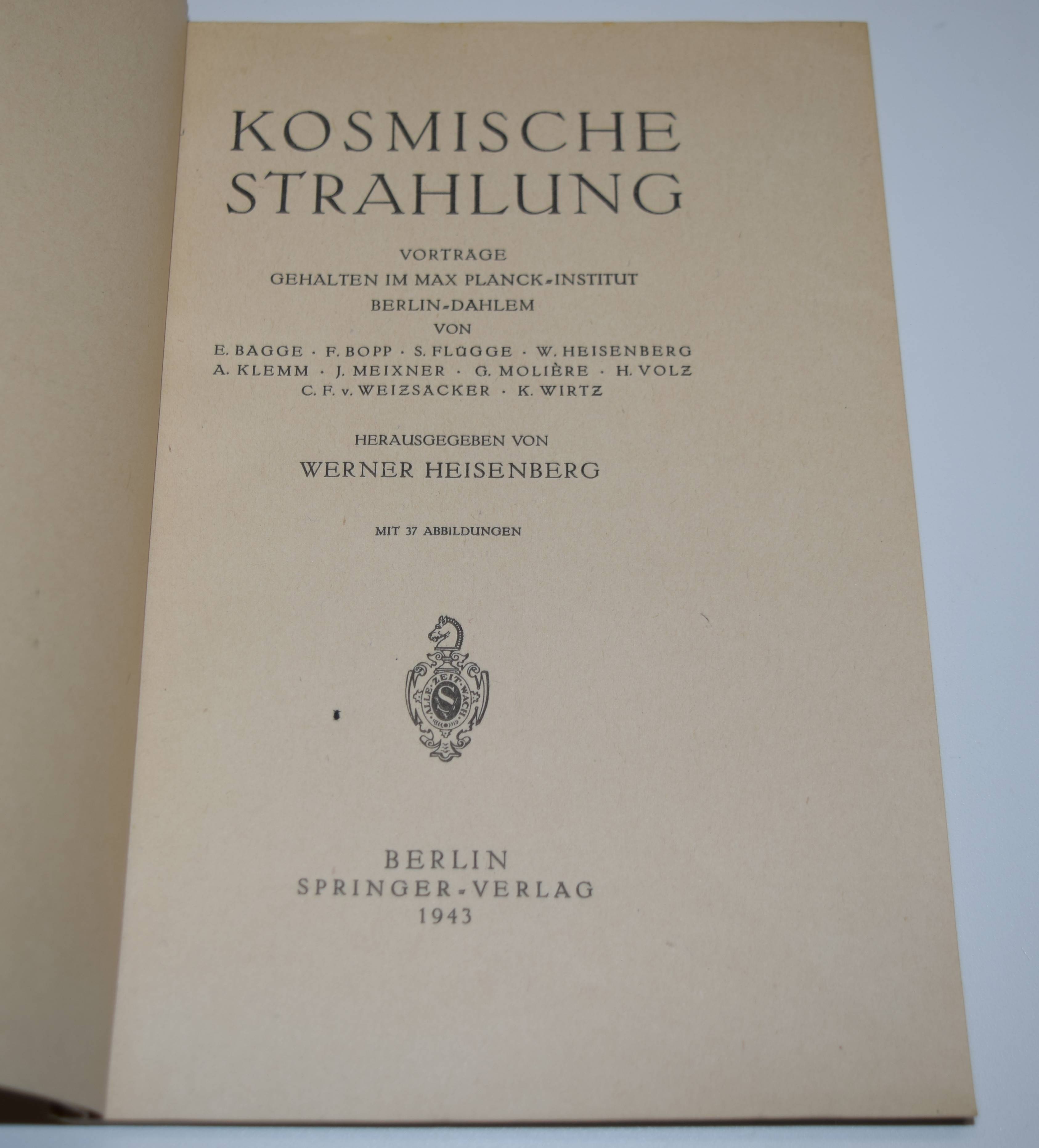 Heisenberg, Werner (Hrsg.). Kosmische Strahlung. Vorträge gehalten im Max Planck-Institut Berlin-Dahlem von E. Bagge, F. Bopp, S. Flügge, W. Heisenberg, A. Klemm, J. Meixner, G. Molière, H. Volz, C. F. v. Weizäcker und K. Wirtz. Berlin, Springer-Verlag 1943. Gr.-8°. VI, 173, (1) S. mit 37 Abbildungen. Orig.-Kartonumschlag. Cassidy, Werner Heisenberg Bibliography 39 f. – Erste Ausgabe. – „Arnold Sommerfeld zu seinem 75. Geburtstag am 5. Dezember 1943 gewidmet.“ – „Wegen der Bombardierung Berlins zog das Kaiser-Wilhelm-Institut für Physik seit Ende 1943 schrittweise nach Hechingen auf der Schwäbischen Alb um. Im April 1945 floh Heisenberg nach Urfeld (Oberbayern), wo sich seine Familie aufhielt. Anfang Mai wurde er, als einer der letzten führenden deutschen Kernphysiker, im Rahmen der US-amerikanischen Alsos-Mission verhaftet und nach zwei Monaten an verschiedenen Internierungsorten in Frankreich und Belgien mit Kollegen an den britischen Geheimdienst übergeben, der sie im Landsitz Farm Hall in Cambridgeshire unterbrachte. Hier wurden die Gespräche der zehn Internierten systematisch abgehört. In Farm Hall erfuhren diese auch vom Abwurf der Atombombe auf Hiroshima, womit offensichtlich wurde, dass die US-amerikanischen Forscher viel weiter gekommen waren als der Uranverein“ (A. S. Blum und E. Philippi in NBD-online). – Umschlag fleckig, sonst gut erhalten.