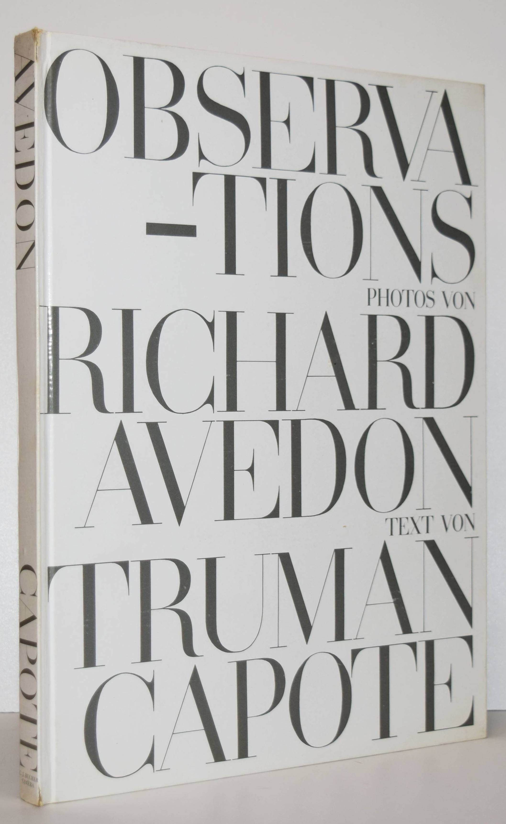 Avedon, Richard. Observations. Text von Truman Capote. (Ins Deutsche übertragen von Jella Lepman. Design: Alexey Brodovitch). Luzern, Camera Verlag Bucher (1959). Folio. 151, (1) S. mit 105 Duetone-Tafeln. Orig.-Pappband in farbig bedr. Pappschuber. Vgl. Auer 386. Koetzle S. 29 (mit Abb.). Roth, The Book of 101 Books 148 f. (Alle amerik. Orig.-Ausgabe aus dem selben Jahr). – Erste deutsche Ausgabe der ersten Sammlung von Porträts prominenter Zeitgenossen. – „Während eines Großteils seines Lebens hat Richard Avedon in unterschiedlichen Genres der amerikanischen Fotografie den Ton angegegeben, sie aber gleichzeitig auch provoziert und ihre Grenzen ausgelotet. Als Porträt-, Mode- und Werbefotograf hat Avedon eine Reihe fotografischer Stile praktisch erfunden“ (J. Livingston in Koetzle). – Schuber mit Gebrauchsspuren, ohne den Klarsicht-Schutzumschlag, Kapital geringfügig beschädigt, sonst gut erhalten.