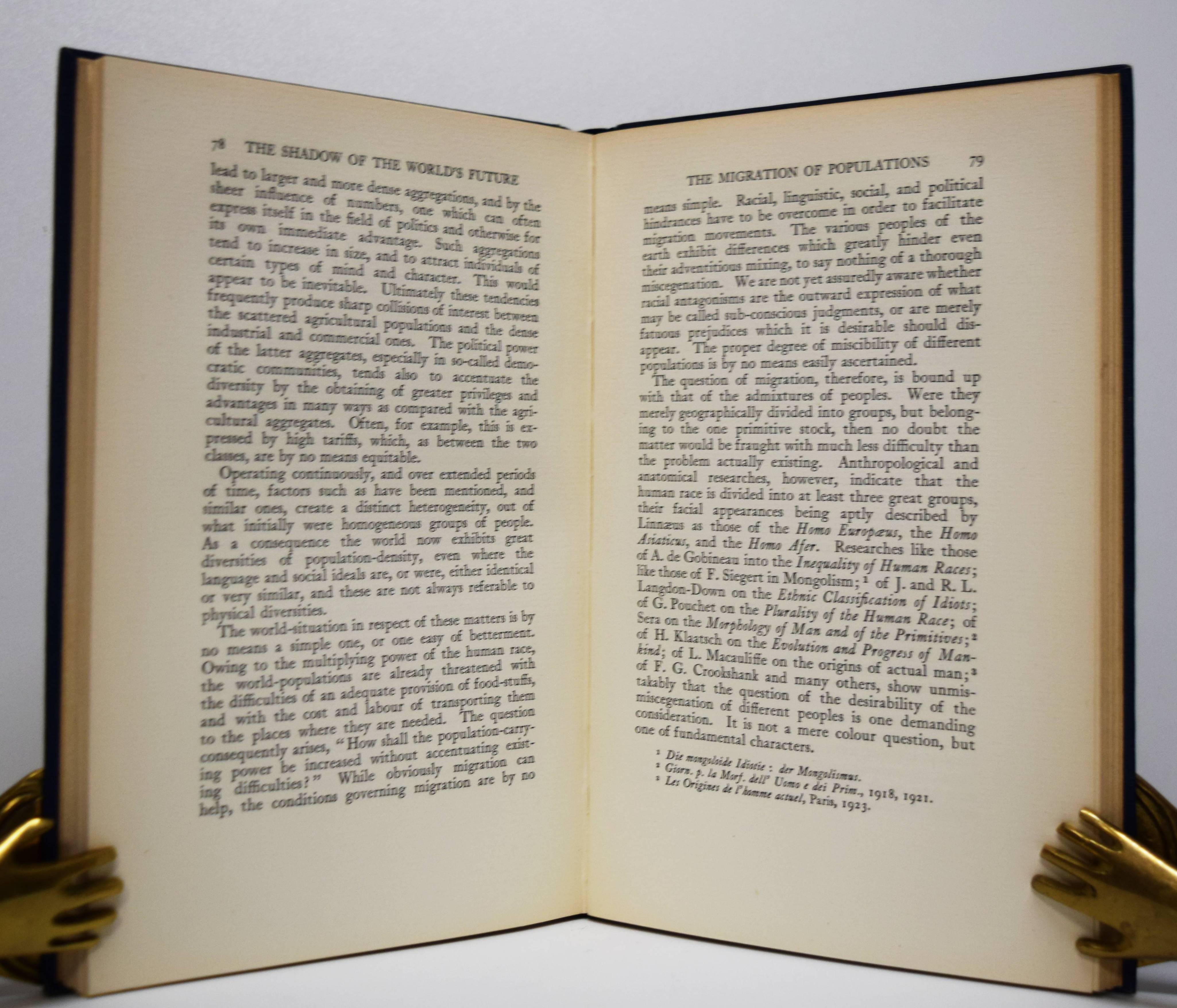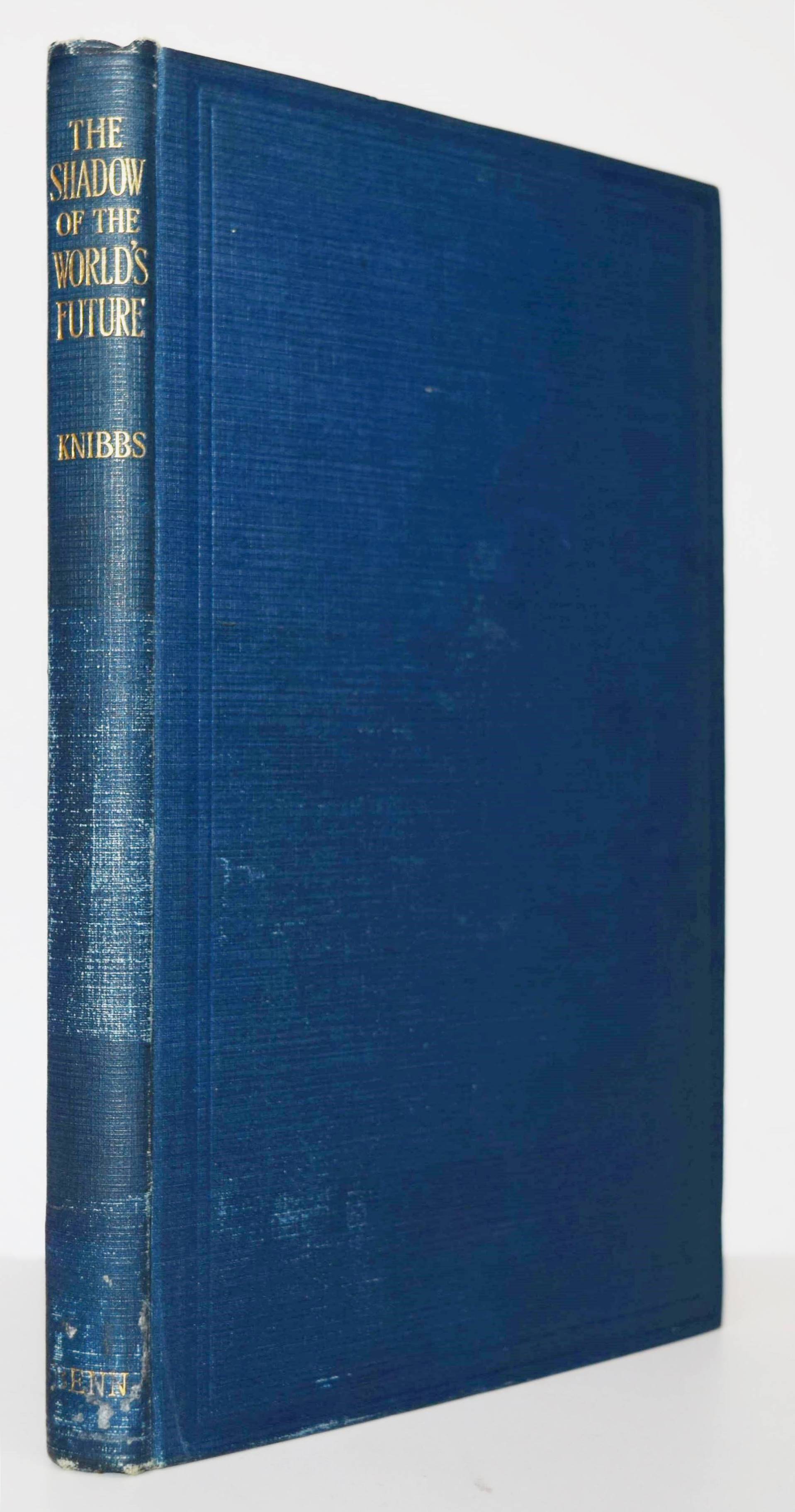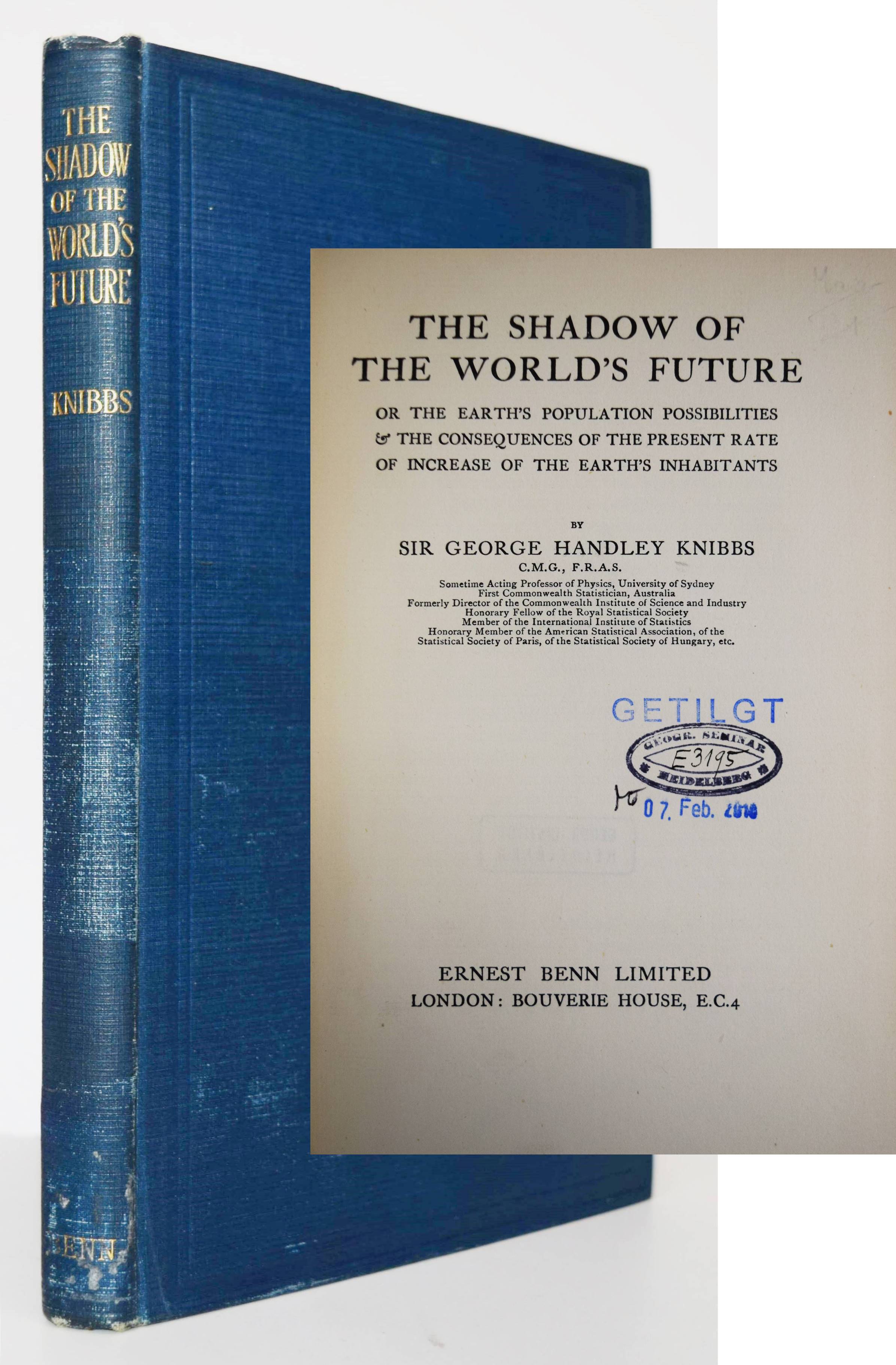 Knibbs, George Handley. The shadow of the world’s future, or The earth’s population possibilities & the consequences of the present rate of increase of the earth’s inhabitants. London, Ernest Benn Limited (1928). 8°. 131 S. Orig.-Leinenband mit goldgepr. Rückentitel. Äußerst seltene erste Ausgabe der wichtigen Arbeit des australisch-britischen Physikers und ersten Statistikers des Commonwealth Sir George Handley Knibbs (1858-1929). – Knibbs (gen. „the Knibb“) war der erste Direktor des 1916 gegründeten Commonwealth Institute of Science and Industry (CSIRO) in Canberra. – „During World War I Knibbs was on the Royal Commission dealing with problems of trade and industry, and was a consulting member of the committee on munitions of war. In 1920 Knibbs played a leading role at the British Empire Statistical Conference in London. In March 1921 he was made director of the newly founded Institute of Science and Industry, a forerunner to the Commonwealth Scientific and Industrial Research Organisation (CSIRO). At the 1921 meeting of the Australasian Association for the Advancement of Science Knibbs was president of the Social and Statistical Science Section, and took as the subject of his address „Statistics in regard to World and Empire development“. Two years later he was president of the association and spoke on „Science and its service to man“. Knibbs resigned his directorship of the Institute of Science and Industry in 1926, and lived in retirement until his death of coronary vascular disease at Camberwell, Victoria, a suburb of Melbourne, on 30 March 1929. … He contributed 29 papers to the Royal Society of New South Wales, and several of his monographs, largely on statistical subjects (The Mathematical Theory of Population, The Census of Wealth), were published as pamphlets; also monographs on pure mathematics, geodesy, and geodetical instruments. In 1913 he published a volume of verse, Voices of the North and Echoes of Hellas, largely translations, carefully written but not important as poetry, and in 1928 appeared a work on population, The Shadow of the World’s Future. He also published Design of the Federal Capital“ (Wikipedia). – Stempel auf dem Titelblatt, sehr gutes sauberes Exemplar.