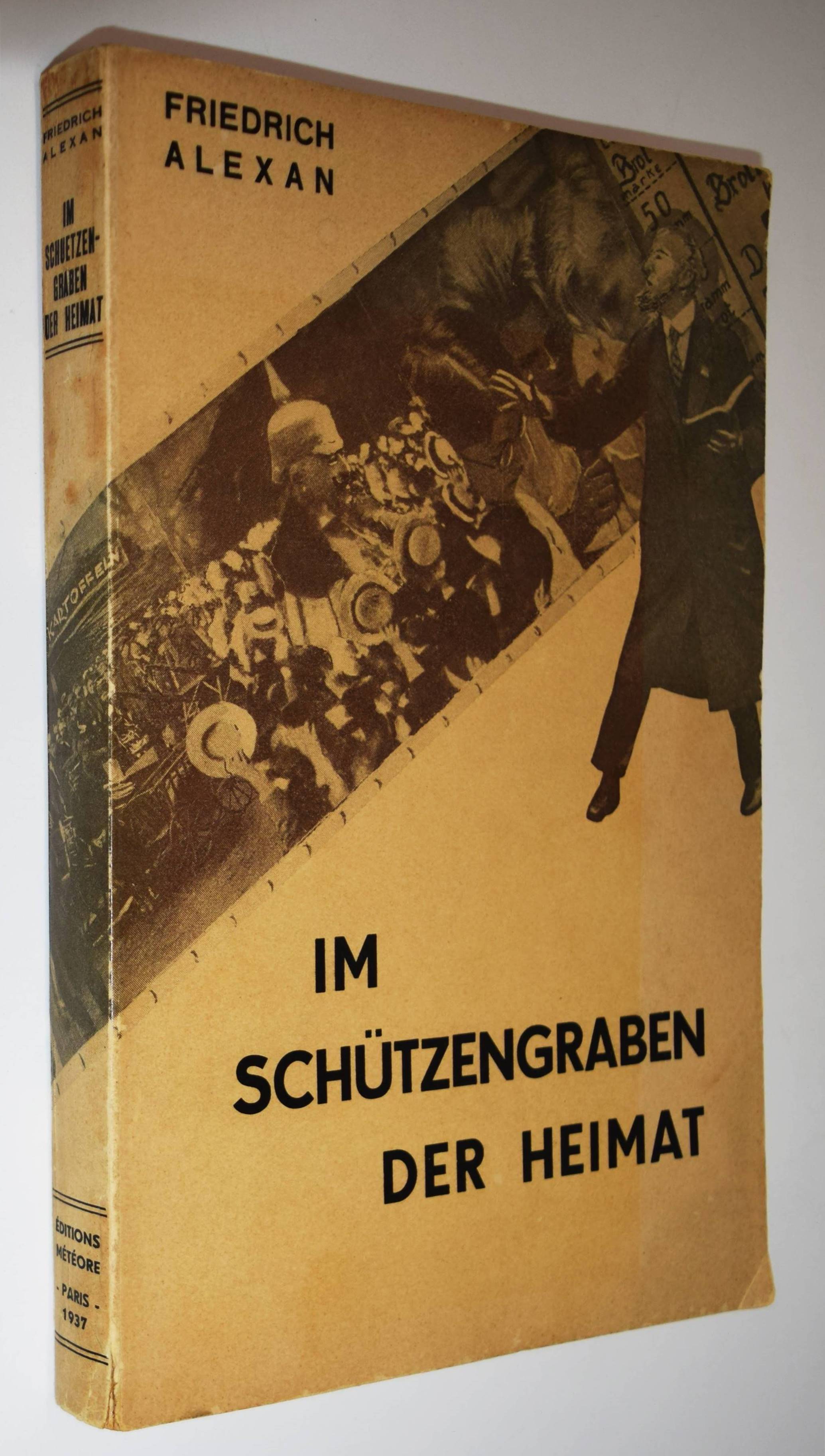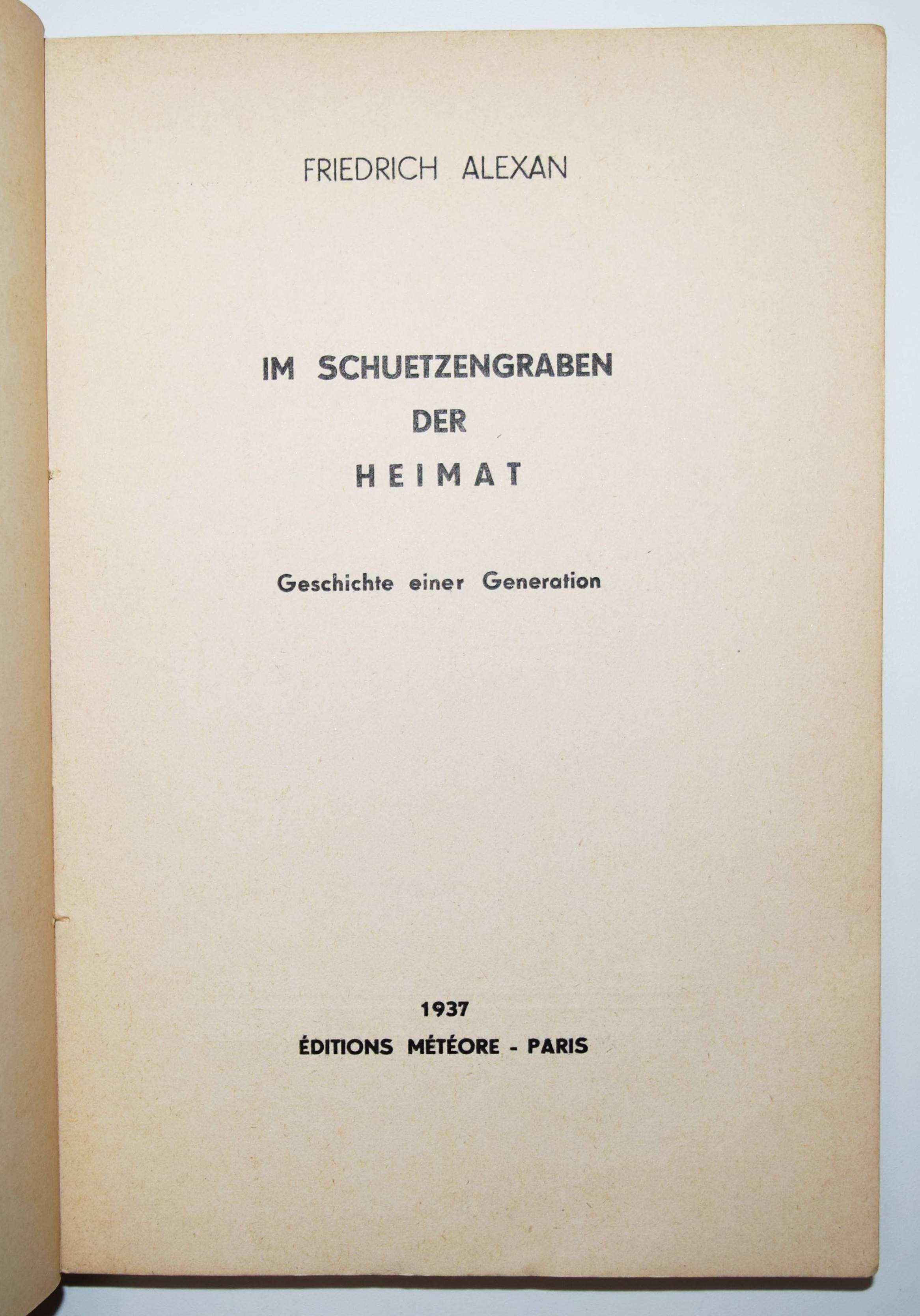 Alexan, Friedrich (d. i. Alexander Kuppermann). Im Schuetzengraben der Heimat. Geschichte einer Generation. (Erster Teil, mehr nicht erschienen). Paris, Édition Météore 1937. Gr.-8°. 287, (1) S. Illustr. Orig.-Kartonumschlag mit einer Fotomontage Spalek, Feilchendeldt u. Hawrylchak, Deutschsprachige Exilliteratur I, 47. Sternfeld/Tiedemann 22. – Erste Ausgabe des im Exil in Paris veröffentlichten Anti-Kriegsromans. Ein am Schluß angekündigter zweiter Teil mit dem Titel „Zwischen Gestern und Morgen“ ist nie erschienen. – „Friedrich Alexans autobiographischer Roman erzählt aus der Sicht eines Jugendlichen vom Alltag an der „Heimatfront“ im Ersten Weltkrieg. Dieser war sowohl von Leid und Entbehrung geprägt, als auch von den kleinen Hoffnungen und Sehnsüchten nach einem glücklicheren Leben. Im Vordergrund des Romans steht das Persönliche, Menschliche ebenso wie die Suche nach Liebe und Geborgenheit, die in einer aus den Fugen geratenen Welt gerade dort zu finden sind, wo man sie vielleicht am wenigsten vermutet. Ich behaupte, dass dieses Buch zu den stärksten und eindringlichsten Arbeiten des freien deutschen Schrifttums gehört. Alexan hat es verstanden, durch die Aufzeichnung vieler Einzelschicksale gleichsam ein gültiges Gesamtbild einer Generation, nämlich der deutschen Kriegsgeneration von der Heimat, zu geben. Alexan sieht konkrete Geschehnisse sehr präzis und versteht das Wesentliche zu gestalten. Vieles, was heute in Deutschland traurige und verständliche Wirklichkeit geworden ist, findet durch Alexans Buch eine ursächliche Erklärung“ (Oskar Maria Graf, 1937). – Rückendeckel oben etwas braunfleckig, sehr gutes Exemplar.