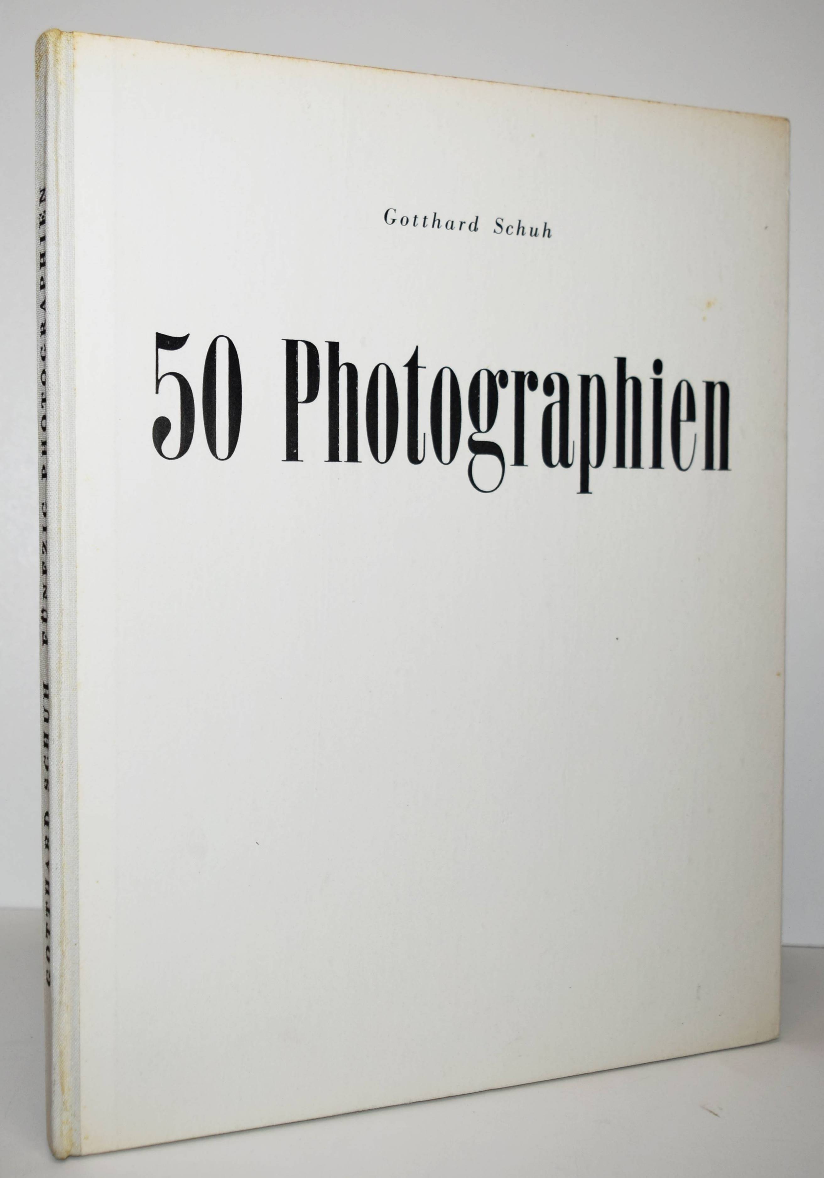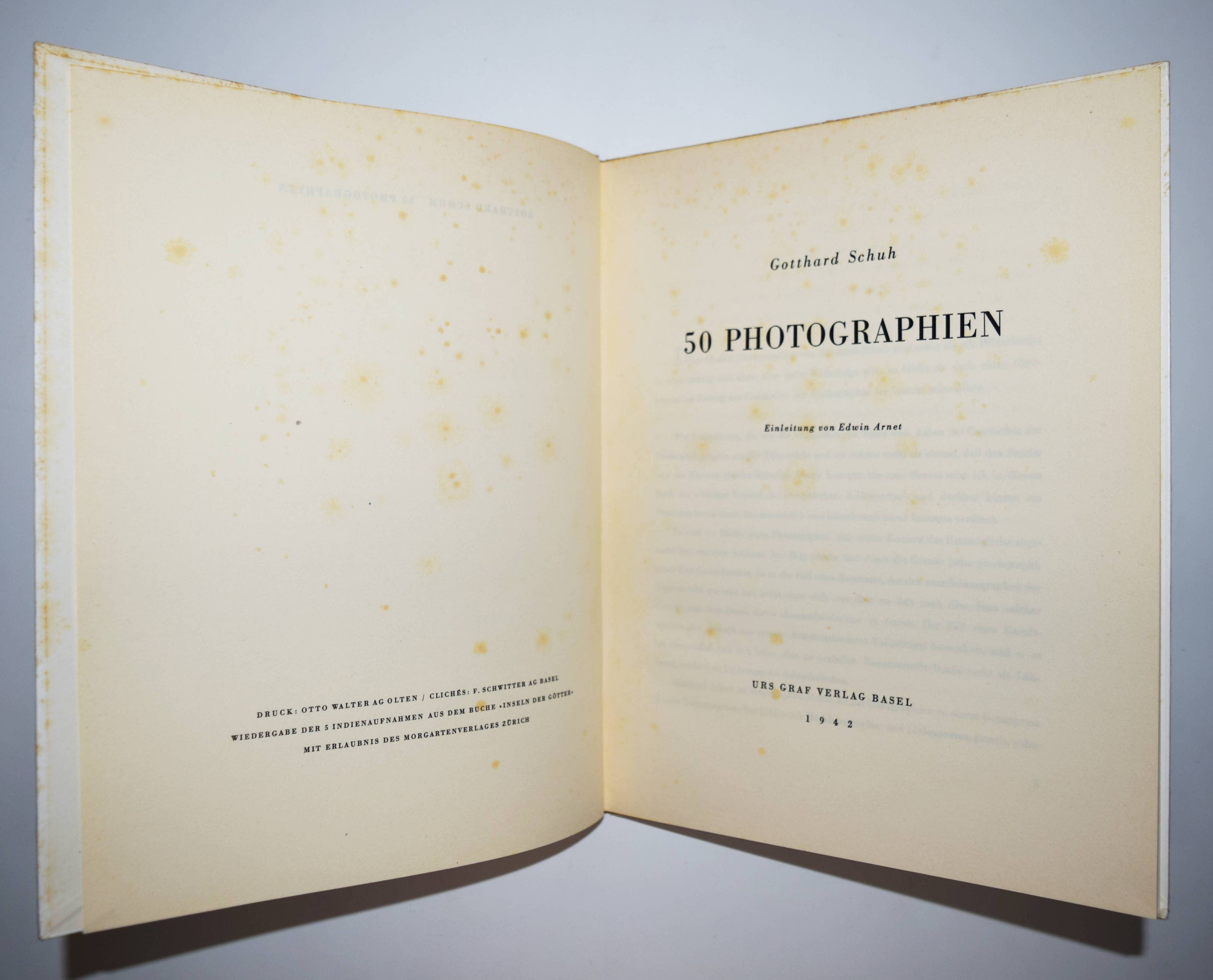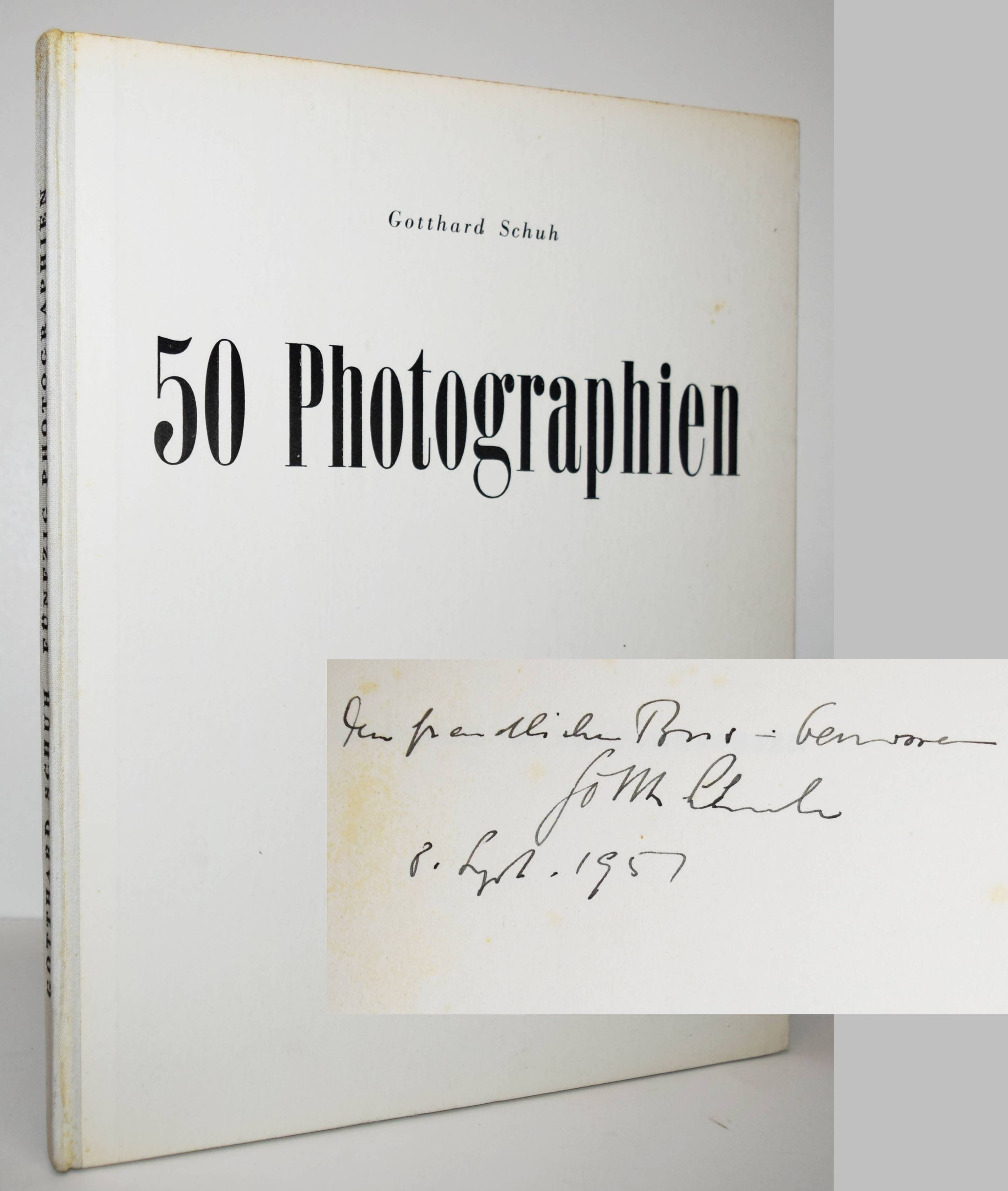 Schuh, Gotthard. 50 Photographien. Einleitung von Edwin Arnet. Basel, Urs Graf Verlag 1942. 4°. 64 S., [2] Bl. mit 50 Abbildungen auf Tafeln. Orig.-Halbleinenband. Heidtmann 10750. Schweizer Fotobücher 122 ff. – Erste Ausgabe. – Mit eigenhändiger Widmung von G. Schuh. – „Die Wahl und Zusammenstellung der Fotografien ergibt alles andere als „Best of…“, vielmehr entsteht ein Gesamtbild, das einerseits von wechselnden Stimmungen, intensiv gelebten Augenblicken, tief empfundener Schönheit, andererseits auch von Verletzlichkeit und Tristesse, von Angst und Melancholie geprägt ist. Diese poetischen Qualitäten sind es, die einen einflussreichen zeitgenössischen Rezensenten zu dem Schluss bringen es handle sich um das „ausserordentlichste Photobuch […], welches die Schweiz bis heute hervorgebracht hat“.“ (P. Pfrunder in Schweizer Photobücher). – Sehr gutes sauberes Exemplar.