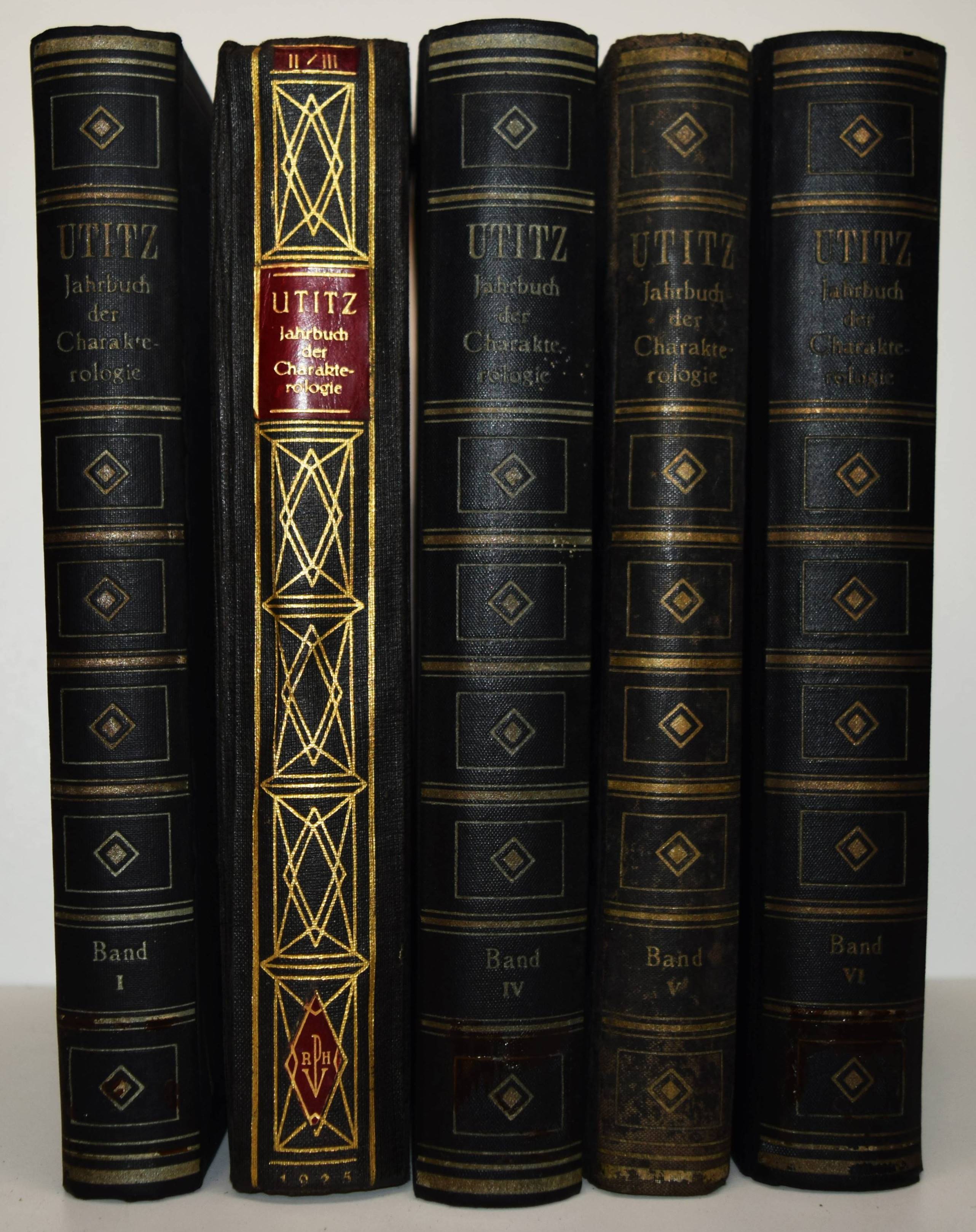 Utitz, Emil (Hrsg.). Jahrbuch der Charakterologie. I.-VI. Jahrgang (alles erschienene). 5 Bände. Berlin, Pan-Verlag Rolf Heise 1924-29. Gr.-8°. Mit zahlr. Abb. auf Tafeln. Orig.-Leinenbände. Ziegenfuß, II, 765. – Vollständige Reihe. – Mit Beiträgen u.a. von L. Klages, R. Heindl, R. Allers, L. Marcuse, A. Lipschütz, R. Müller-Freienfels, R. Fick, St. Zweig, M. Löwy. – Einände etwas berieben und fleckig, Stempel auf den Vorsätzen, Band II/III mit etwas abweichenden Verlagseinband, sonst gut erhalten.