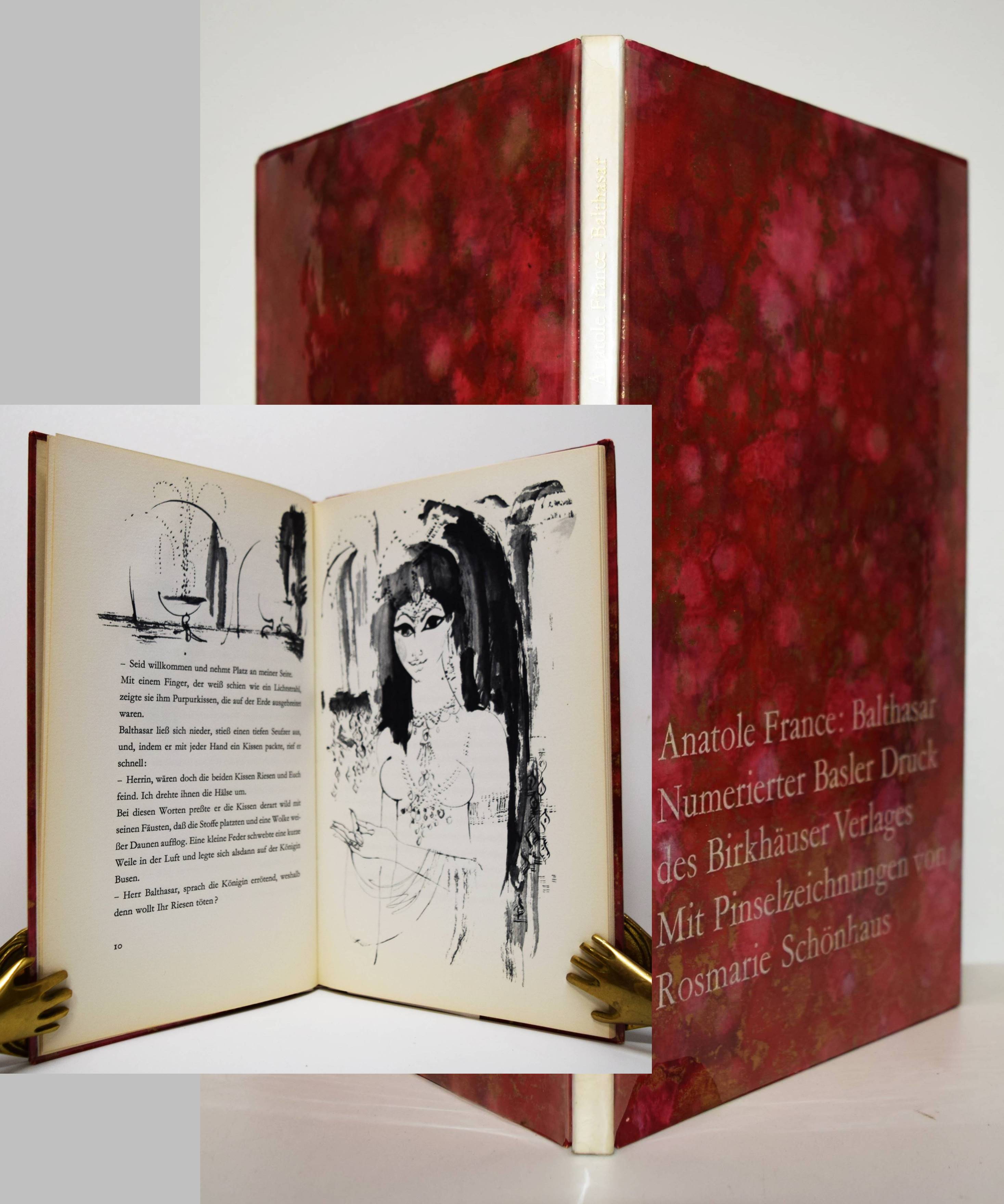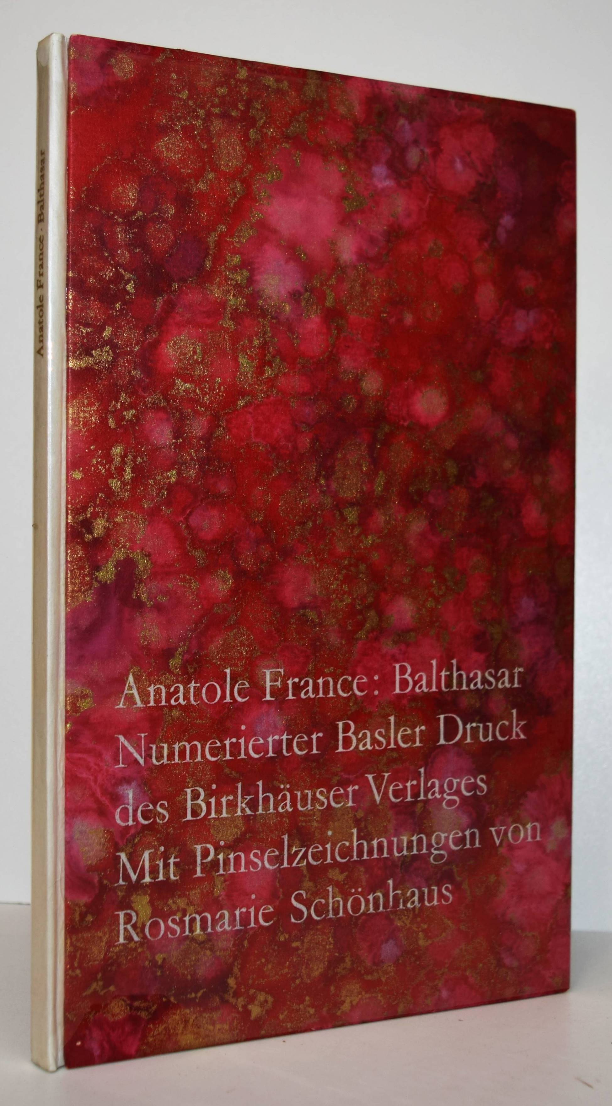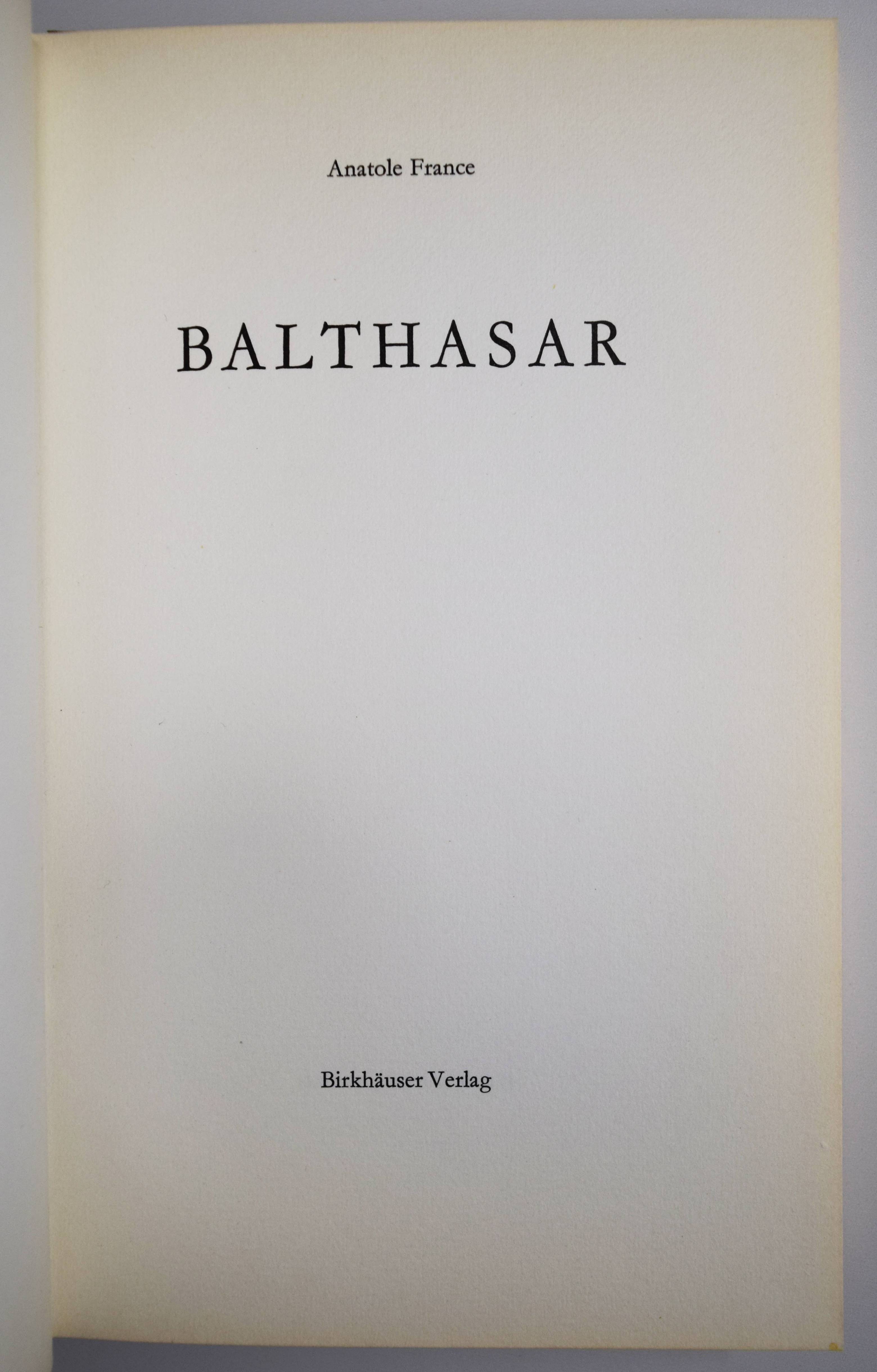 France, Anatole. Balthasar. (Der Text dieser Erzählung wurde von Kurt Jung ins Deutsche übertragen). (Basel), Birkhäuser (1971). Gr.-8°. 36 S., 1 Bl. mit teils ganzs. Illustrationen von Rosmarie Schönhaus-Haefliger. Orig.-Halbpergamentband mit goldgepr. Rückentitel und Klarsichtschutzumschlag. (Basler Drucke, Band 10). Eines von 650 num. Exemplaren (Gesamtauflage 1000 Exemplare). – Mit eigenhändiger Widmung des Übersetzers Kurt Jung im Druckvermerk. – Sehr gutes Exemplar.