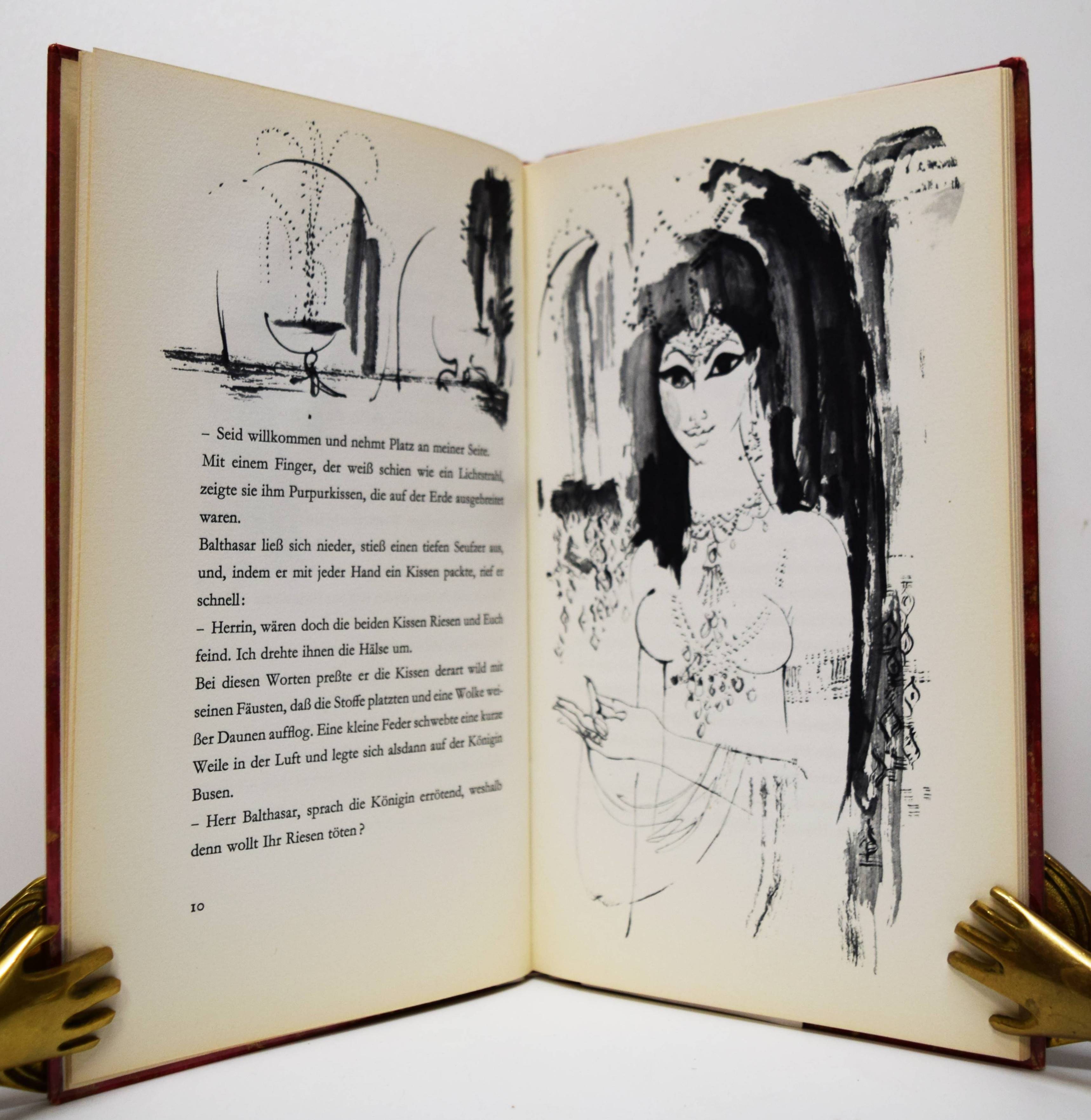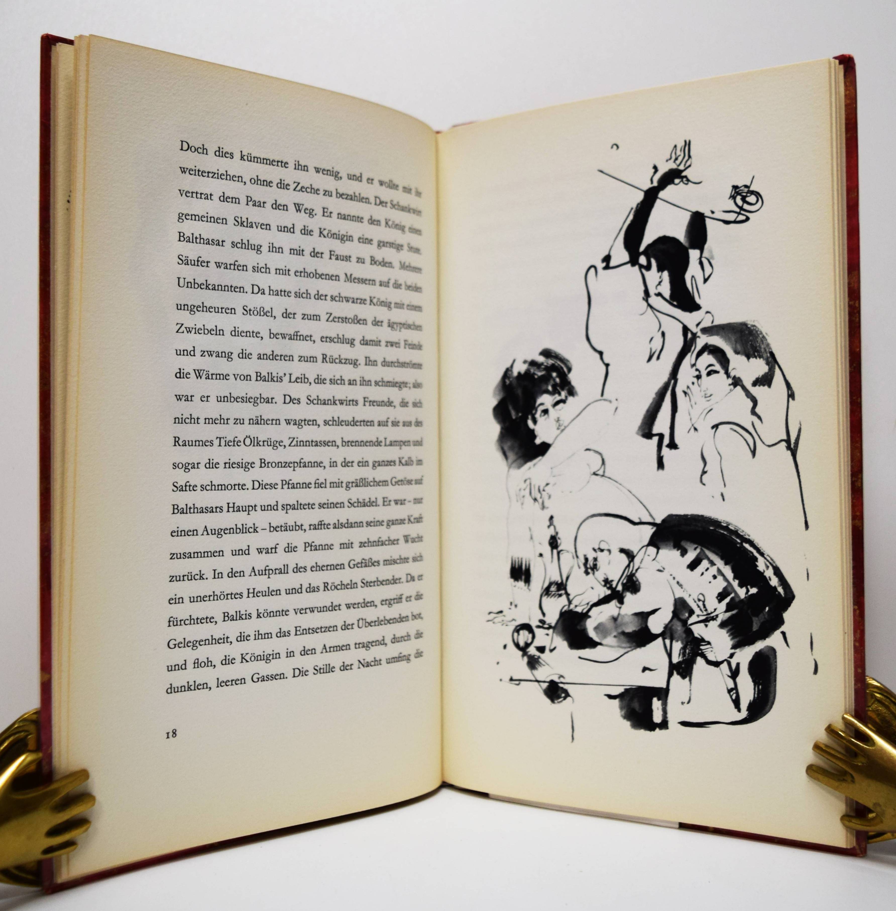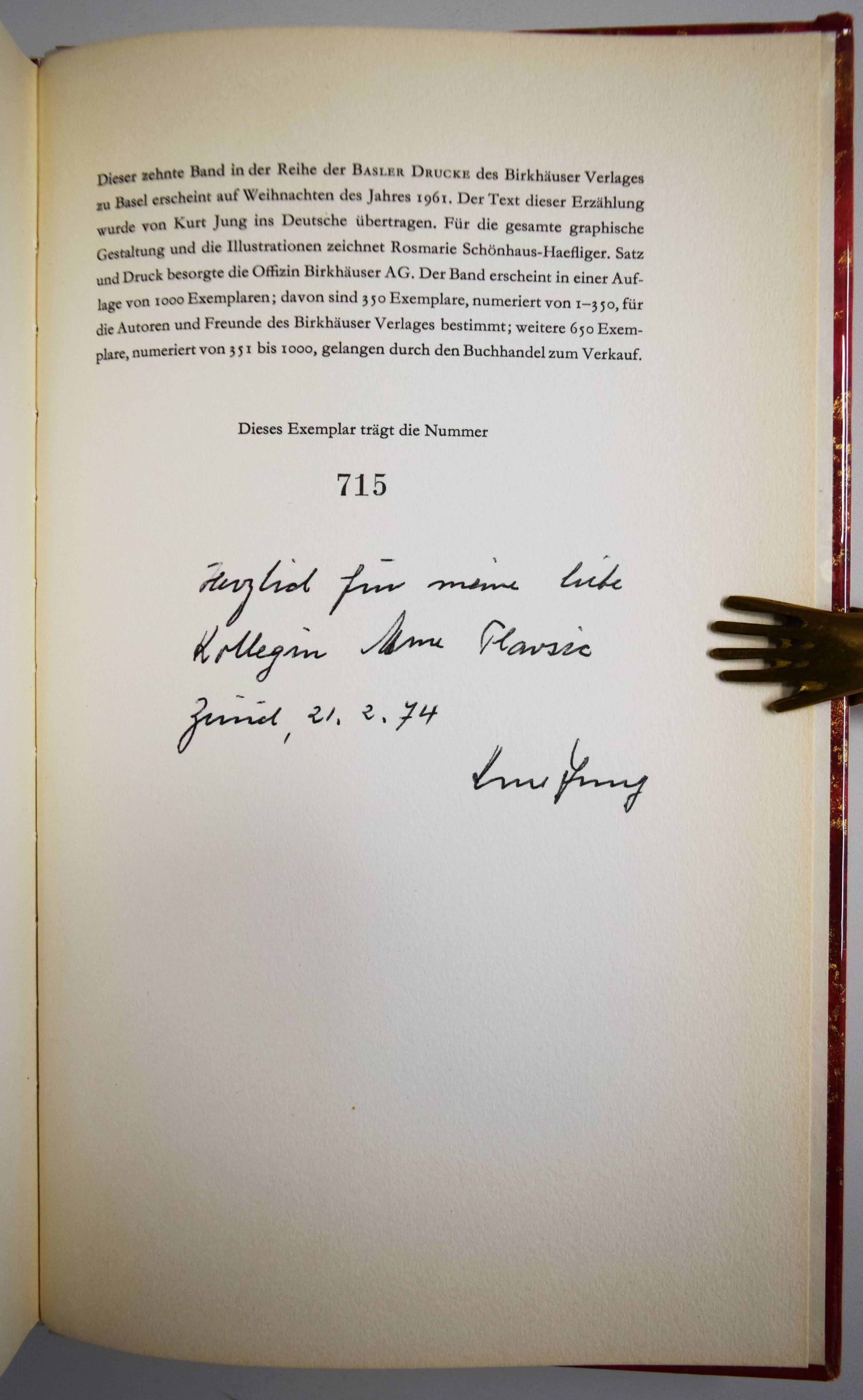 France, Anatole. Balthasar. (Der Text dieser Erzählung wurde von Kurt Jung ins Deutsche übertragen). (Basel), Birkhäuser (1971). Gr.-8°. 36 S., 1 Bl. mit teils ganzs. Illustrationen von Rosmarie Schönhaus-Haefliger. Orig.-Halbpergamentband mit goldgepr. Rückentitel und Klarsichtschutzumschlag. (Basler Drucke, Band 10). Eines von 650 num. Exemplaren (Gesamtauflage 1000 Exemplare). – Mit eigenhändiger Widmung des Übersetzers Kurt Jung im Druckvermerk. – Sehr gutes Exemplar.