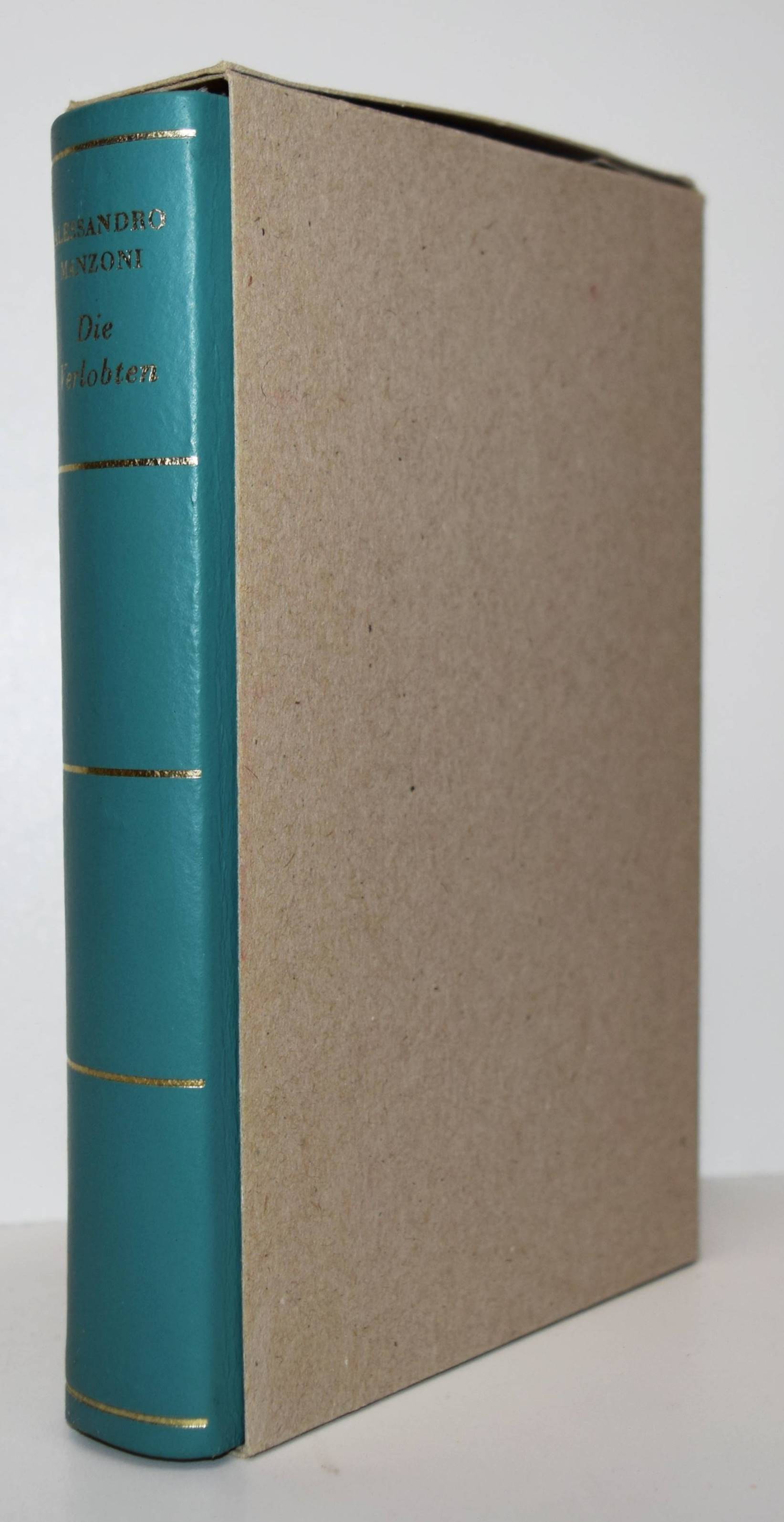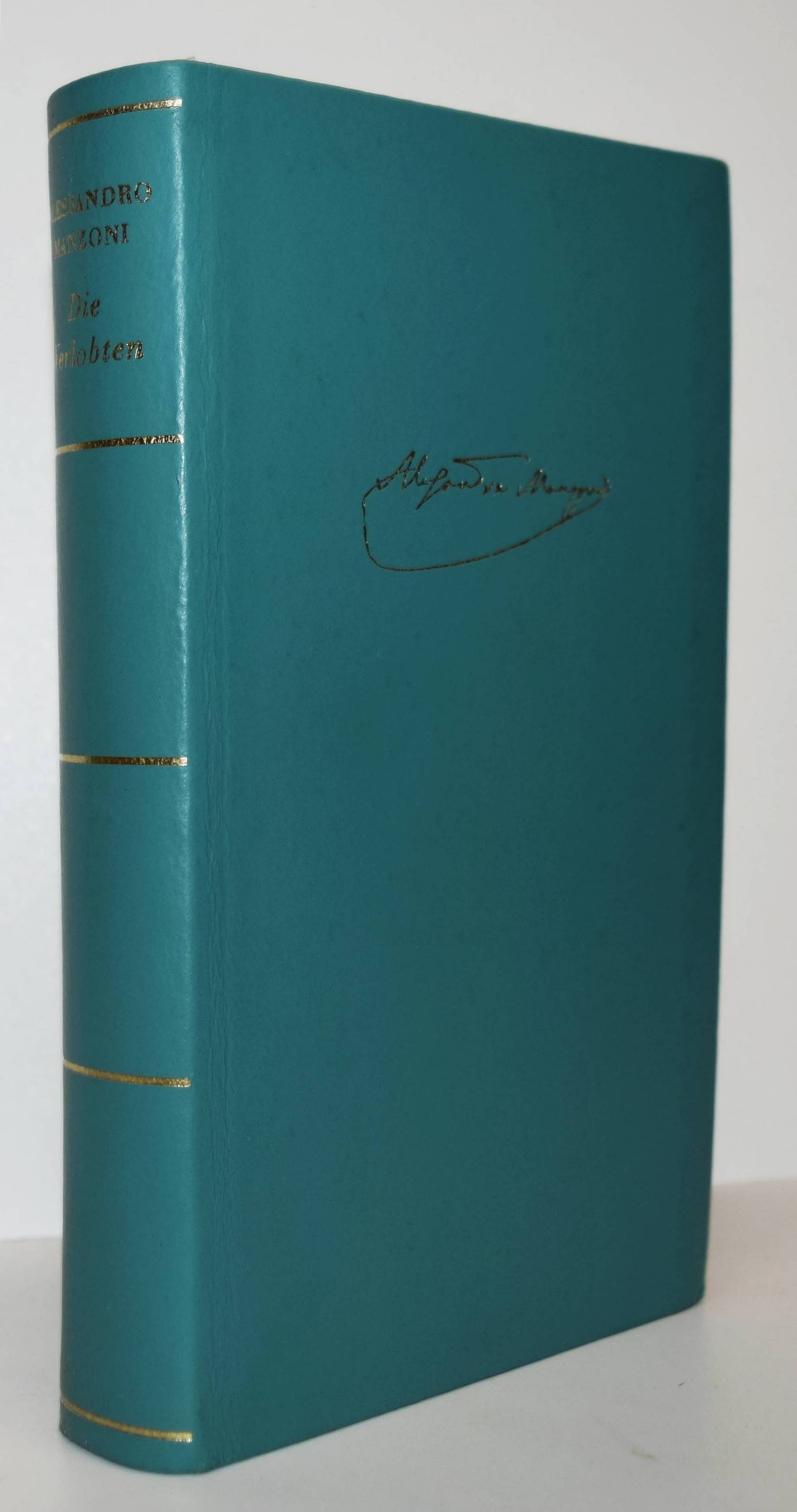 Manzoni, Alessandro. Die Verlobten. Eine Mailandische Geschichte aus dem siebzehnten Jahrhundert entdeckt und neu gestaltet. (Vollständige Ausgabe, aus dem Italienischen übertragen von Ernst Wiegand Junker. Mit einem Nachwort des Übersetzers… und den Illustrationen der Ausgabe von 1840. Mit einem Essay von Umberto Eco, übersetzt von Burkhart Kroeber). 3. Auflage. München, Winkler Verlag (1988) 8°. 953, (1) S. Türkisfarb. Orig.-Lederband mit goldgepr. Rückentitel, Linienvergoldung, Deckelsignatur und Kopfgoldschnitt in Pappschuber. (Winkler Weltliteratur, Dünndruck-Ausgabe). Sehr gutes Exemplar der schönen Ganzlederausgabe.