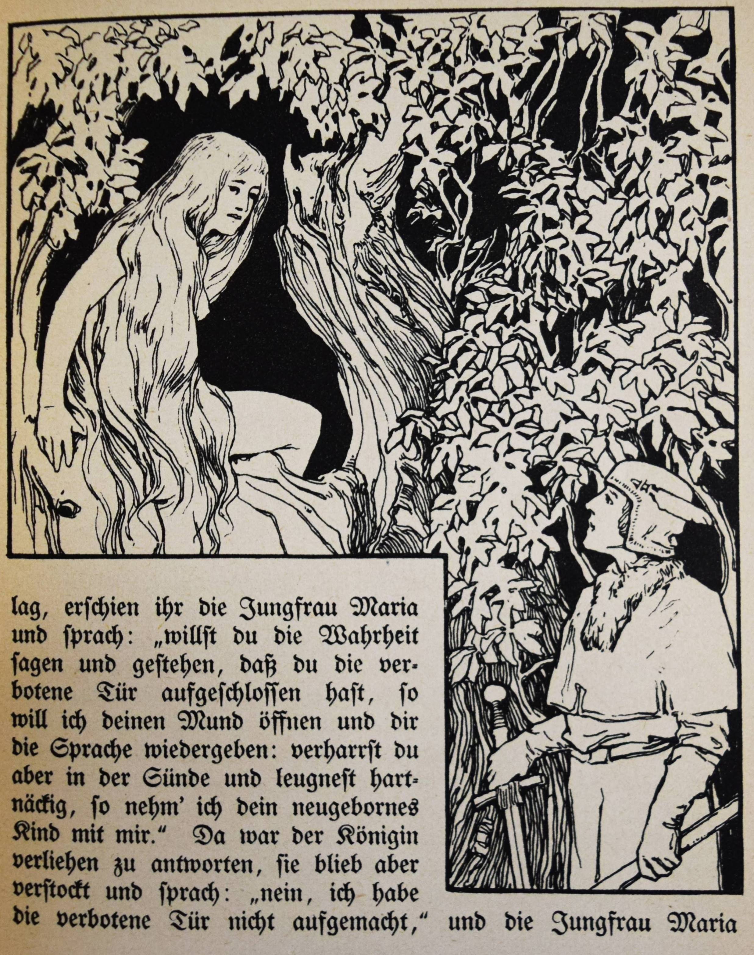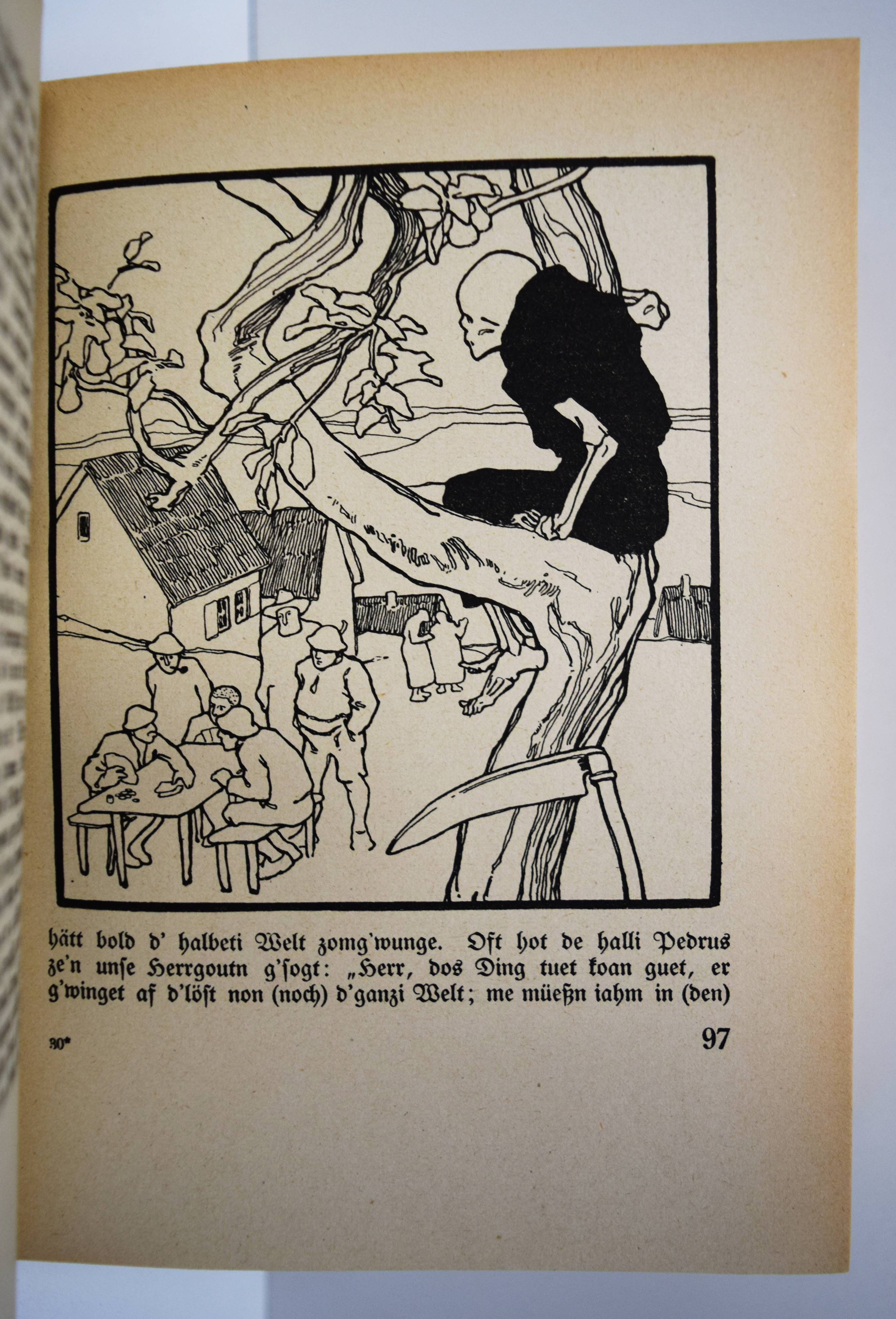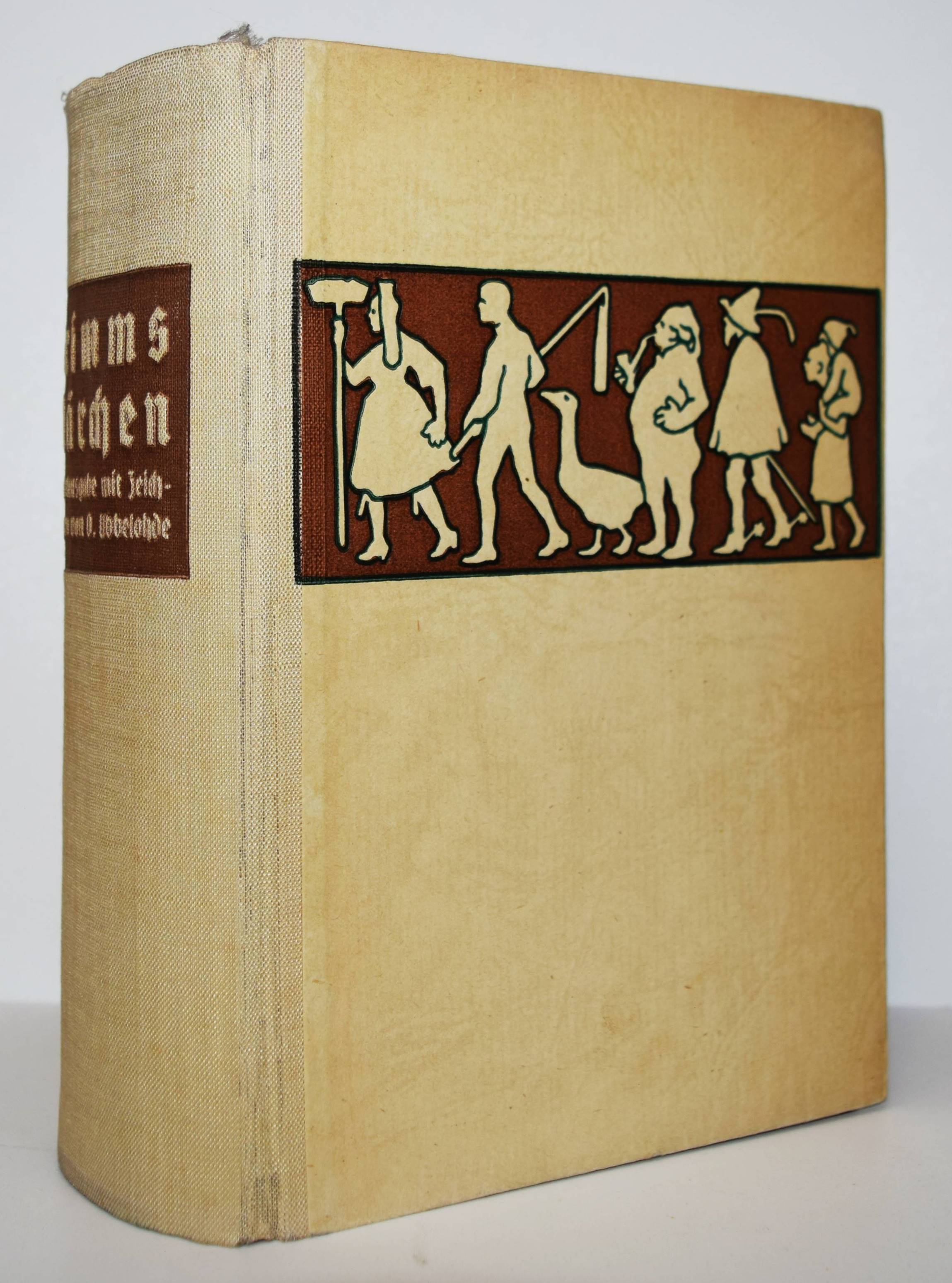 Grimm, (Jakob u. Wilhelm). Kinder- und Hausmärchen. Gesammelt durch die Brüder Grimm. Gesamtausgabe mit 446 Zeichnungen von Otto Ubbelohde. 6. Aufl. (61.-80. Tsd.). 3 Teile in 1 Band. Marburg, N. G. Elwert (1941). 8°. VI, 368 S.; [1] Bl., 380 S.; [1] Bl., 328 S. mit 446 Illustrationen. Illustr. Orig.-Halbleinenband mit illustr. Schutzumschlag. Vgl. Bang S. 99, 141 u. Abb. 230, 231. Bilderwelt 1657. Doderer-Müller S. 261 f. Köster S. 59. LKJ IV,525. Oldenburg, Künstler 14 (mit Abb.). Seebaß II,685. – Erschien zur Erinnerung an den 150. Geburtstag der Brüder Grimm (1935/36). – Otto Ubbelohde (1807-1922) ist der bedeutendste Vertreter der Heimatkunst in der Illustration. „Die strengen, im Formbestand noch dem Jugendstil verhafteten Zeichnungen Ubbelohdes werden in der Fachliteratur oft als adäquateste bildnerische Umsetzung der Kinder- und Hausmärchen bezeichnet. In der Tat hat Ubbelohde als Marburger Künstler, der vor allem umfangreiche Landschafts- und Städtebilder schuf, das Lokalkolorit des hessischen Raumes, in dem die Brüder Grimm lebten und sammelten, in seine Bilder zitathaft einfließen lassen…“ (J. Thiele in Oldenburg, Künstler). – Schutzumschlag gebräunt und mit Randläsuren, sonst nur wie immer papierbedingt gebräunt, gutes Exemplar.