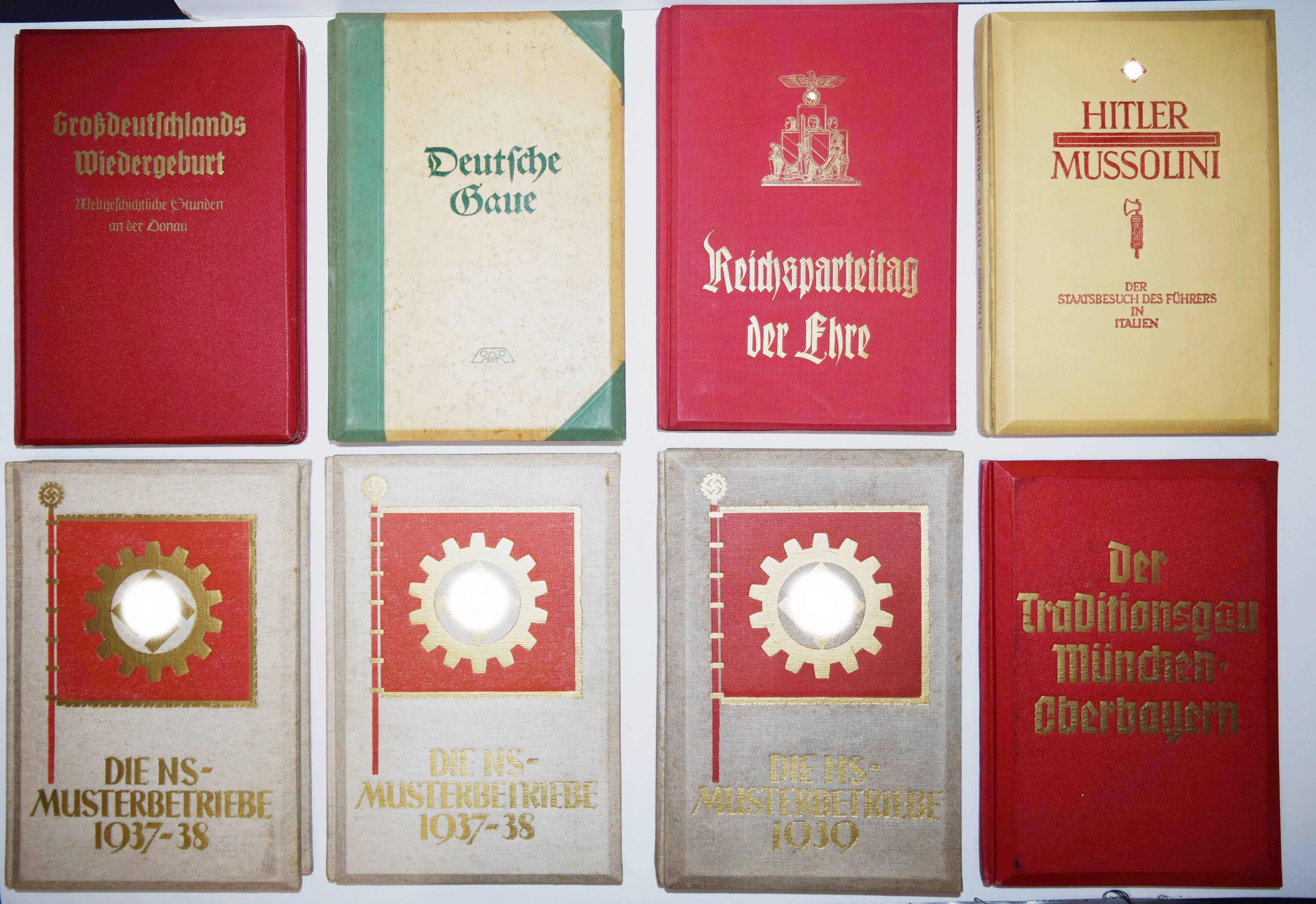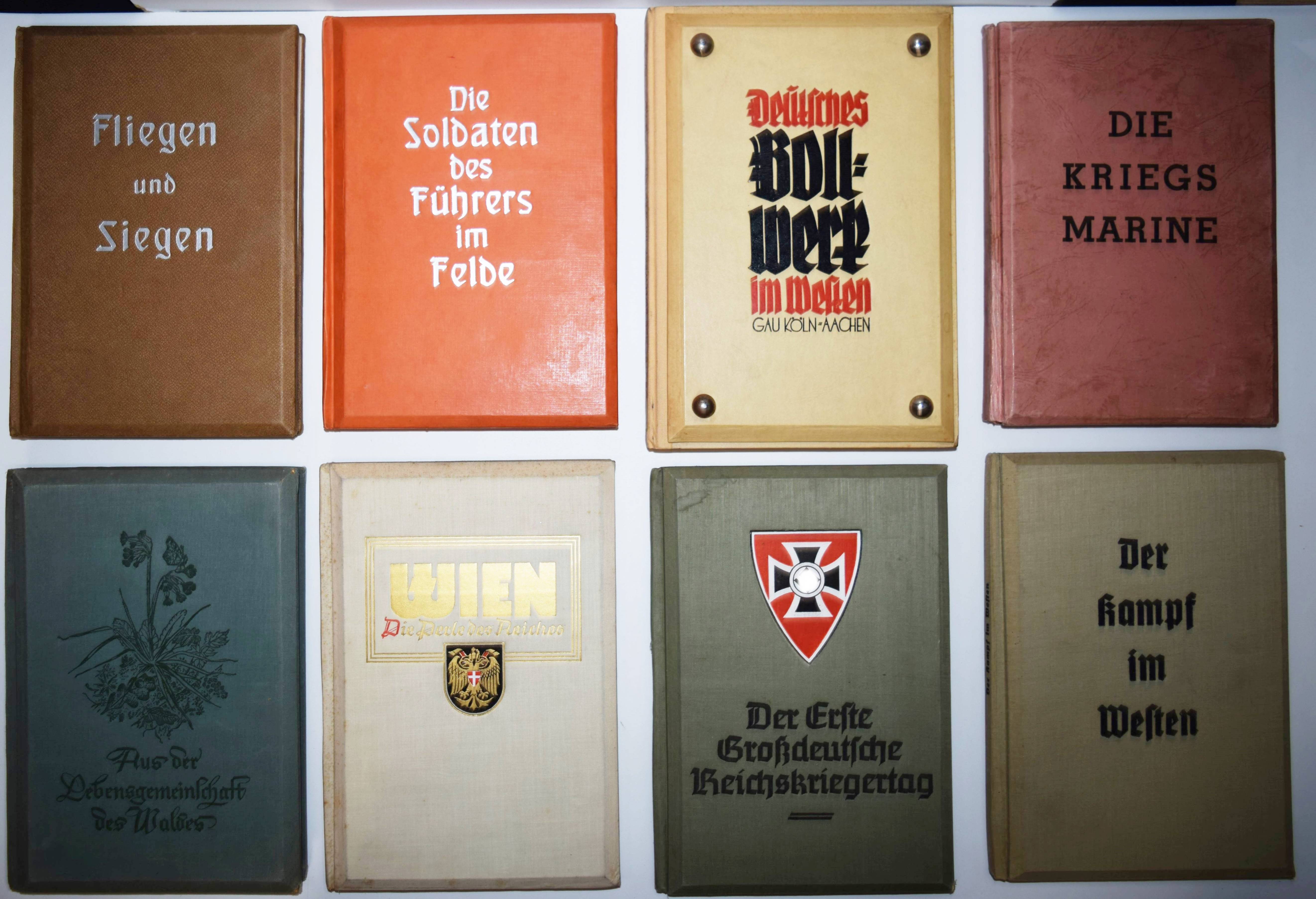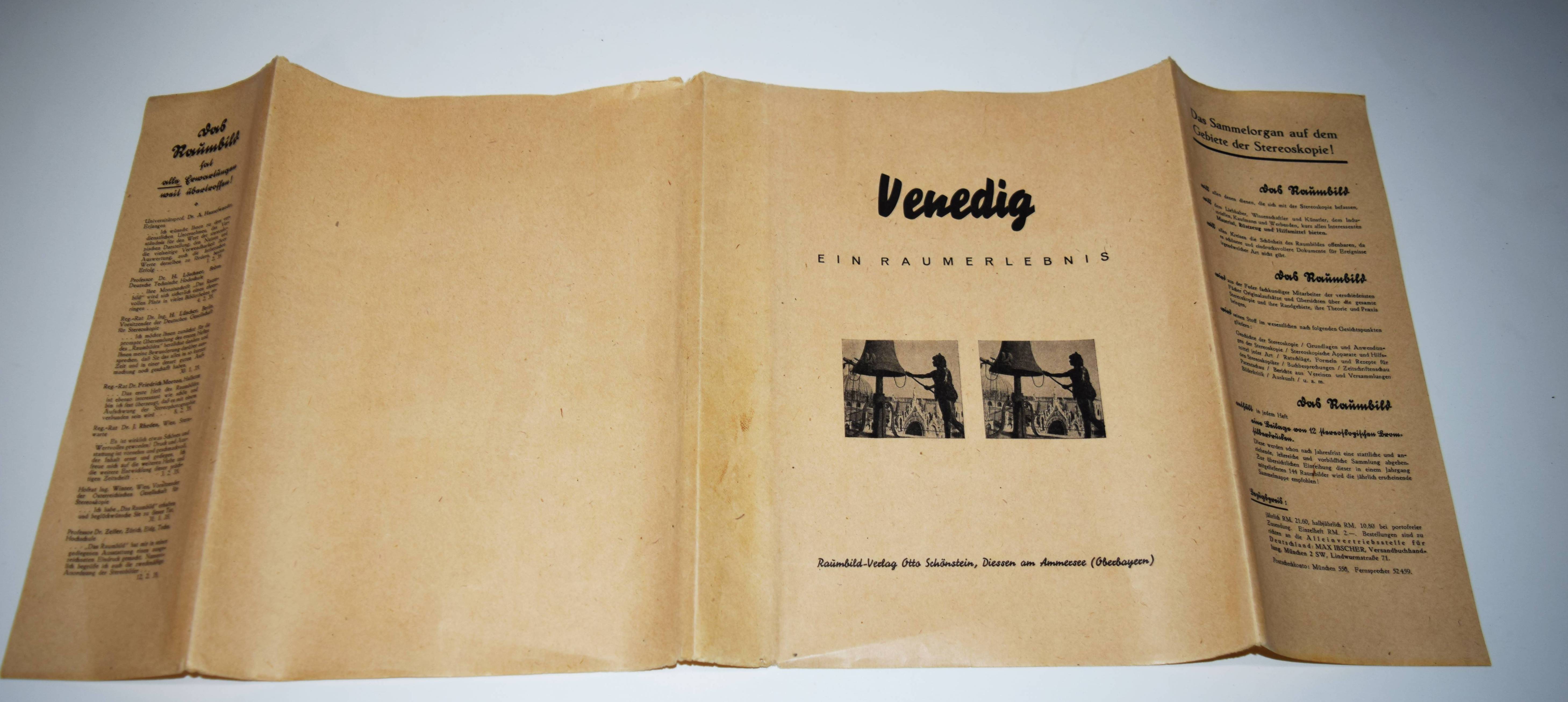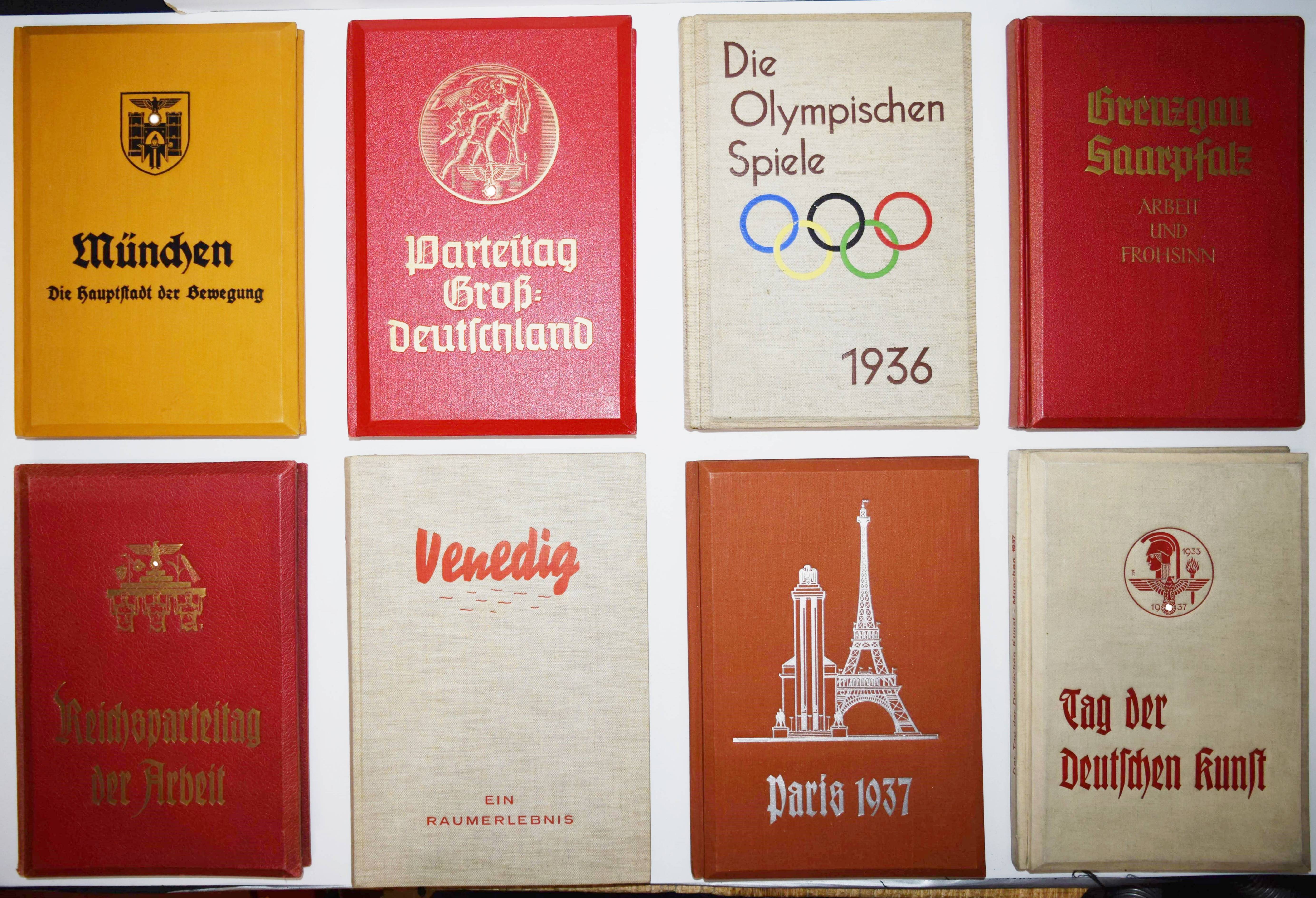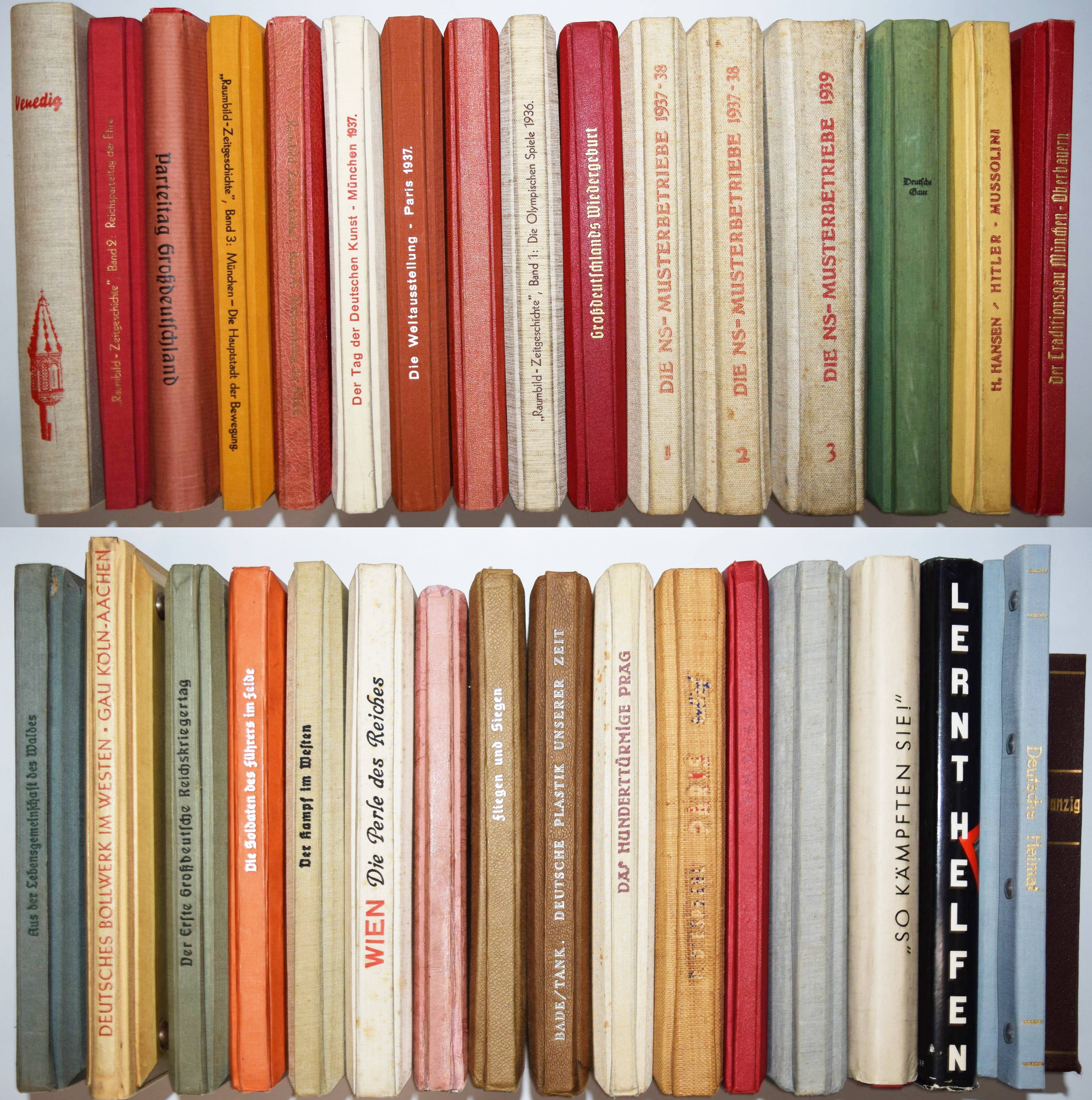 Stereo-Photographie – Schönstein, Otto (Hrsg.). Sammlung mit 30 Raumbild-Alben. Sowie 1 Konkurrenz-Album: Heß, Otto u.a. Danzig. Werden und Behauptung einer deutschen Stadt. München, Carl Röhrig Verlag 1940. Diessen u. München, Schönstein-Verlag u.a. 1935-1952. 4° und Gr.-8° (Röhrig-Album). Mit meist 100 Orig.-Stereo-Photographien. Orig.-Leinen-, Halbleinen- und Pappbände. Heiting/Jaeger I, 456 ff. Vorsteher, Der Raumbildverlag Otto Schönstein. Magazin. Deutsches Historisches Museum. Heft 27, 2001, S. 52 ff. – I. Tank, Kurt Lothar. Venedig. Ein Raumerlebnis. Diessen 1935. 4°. 120 S. mit 60 Stereo-Photographien auf 20 Tafeln und Zeiss-Betrachter. Orig.-Leinenband mit Rücken- und Deckeltitel und Schutzumschlag. – II. Haymann, Ludwig. Die Olympischen Spiele 1936. Diessen 1936. 4°. 59 S. mit 100 Stereo-Photographien und Stereo-Betrachter. Orig.-Leinenband mit Rücken- und Deckeltitel und farb. Olympia-Ringen. – III. Krötz, Robert und Rudolf Jung. Reichsparteitag der Ehre. Diessen 1936. 4°. 61 S. mit 100 Stereo-Photographien und Stereo-Betrachter. Orig.-Leinenband mit Rücken- und Deckeltitel. – IV. Achenbach, Oscar Robert und Hans Thoma. München. Hauptstadt der Bewegung. Diessen 1937. 4°. 59 S. mit 100 Stereo-Photographien und Stereo-Betrachter. Orig.-Leinenband mit Rücken- und Deckeltitel. – V. Gern, Pitter. Reichsparteitag der Arbeit. Diessen 1937. 4°. 62 S. mit 100 Stereo-Photographien u. Stereo-Betrachter. Orig.-Leinenband mit Rücken- und Deckeltitel. – VI. Hansen, Henrich. Parteitag Großdeutschland. München 1939. 4°. 68 S. mit 100 Stereo-Photographien und Stereo-Betrachter. Orig.-Leinenband mit Rücken- und Deckeltitel und Schutzumschlag. – VII. Müller, Albert Burckhard. Tag der Deutschen Kunst. Diessen 1937. 4°. 62 S. mit 100 Stereo-Photographien und Stereo-Betrachter. Orig.-Leinenband mit Rücken- und Deckeltitel. – VIII. Frank, E. P. Weltausstellung Paris 1937. München 1939. 4°. 62 S. mit 100 Stereo-Photographien u. Stereo-Betrachter. Orig.-Leinenband mit Rücken- und Deckeltitel. – IX. Englram, Hans. Grenzgau Saarpfalz. Arbeit und Frohsinn. Diessen 1937. 4°. 64 S. mit 100 Stereo-Photographien und Stereo-Betrachter. Orig.-Leinenband mit Deckeltitel. – X. Bartz, Karl. Großdeutschlands Wiedergeburt. Weltgeschichtliche Stunden an der Donau. Hrsg. Wiener Neueste Nachrichten. (Diessen 1938). 4°. 87 S. mit 100 Stereo-Photographien und Stereo-Betrachter. Orig.-Leinenband mit Rücken- und Deckeltitel. – XI. Biallas, Hans. Die nationalsozialistischen Musterbetriebe 1937-1939. 3 Bände. Bayreuth, Gauverlag Bayerische Ostmark 1938-1939. 4°. Mit zusammen 512 Stereo-Photographien und 1 Stereo-Betrachter. Orig.-Leinenbände mit Rücken- und Deckeltitel. – XII. Czibulka, Alfons v. Deutsche Gaue. Diessen 1938. 4°. 191 S. mit 200 Stereo-Photographien und Stereo-Betrachter. Orig.-Halbleinenband mit Rücken- und Deckeltitel. – XIII. Hansen, Henrich. Hitler-Mussolini. Der Staatsbesuch des Führers in Italien. Diessen 1938. 4°. 48 S. mit 100 Stereo-Photographien und Stereo-Betrachter. Orig.-Leinenband mit Rücken- und Deckeltitel. – XIV. Achenbach, Oscar u. Siegfried Kleinknecht. Der Traditionsgau München-Oberbayern. München, H. Hoffmann 1939. 4°. 60 S. mit 100 Stereo-Photographien und Stereo-Betrachter. Orig.-Leinenband mit Rücken- und Deckeltitel. – XV. Dietrich, Kurt. Aus der Lebensgemeinschaft des Waldes. Diessen, Schönstein 1939. 4°. 119 S. mit 150 Stereo-Photographien und Stereo-Betrachter. Orig.-Leinenband mit Rücken- und Deckeltitel. – XVI. Havertz, Heinz. Deutsches Bollwerk im Westen des Reiches. Gau Köln-Aachen. Köln und Aachen, Westdeutscher Beobachter o. J. (1938 oder 1939). 4°. 56 S., [3] Bl. mit 100 Stereo-Photographien und Stereo-Betrachter. Orig.-Halbleinenband mit Biernägeln. (Rücken restauriert). – XVII. Riebicke, Otto. Der erste Großdeutsche Reichskriegertag. München, Schönstein 1939. 4°. 71 S. mit 100 Stereo-Photographien und Stereo-Betrachter. Orig.-Leinenband mit Rücken- und Deckeltitel. – XVIII. Wedel, Hasso v. und Henrich Hansen. Die Soldaten des Führers im Felde. Der Feldzug in Polen 1939. München, Schönstein 1939. 4°. 61 S. mit 100 Stereo-Photographien und Stereo-Betrachter. Orig.-Leinenband mit Rücken- und Deckeltitel. – XIX. Wedel, Hasso v. u. Henrich Hansen. Der Kampf im Westen. Die Soldaten des Führers im Felde. Band 2. München, Schönstein 1940. 4°. 80 S. mit 100 Stereo-Photographien und Stereo-Betrachter. Orig.-Leinenband mit Rücken- und Deckeltitel. – XX. Holzmann, Ernst. Wien. Die Perle des Reiches. München, Schönstein 1941. 4°. 127 S. mit 100 Stereo-Photographien und Stereo-Betrachter. Orig.-Leinenband mit Rücken- und Deckeltitel. – XXI. Busch, Fritz Otto. Die Kriegsmarine. München, Schönstein 1941. 4°. 83 S. mit 100 Stereo-Photographien und Stereo-Betrachter. Orig.-Pappband mit Deckeltitel. – XXII. Orlovius, Heinz. Fliegen und Siegen. Ein Raumbildwerk von unserer Luftwaffe. München, Schönstein 1942. 4°. 87 S. mit 100 Stereo-Photographien und Stereo-Betrachter. Orig.-Pappband. – XXIII. Tank, Kurt Lothar. Deutsche Plastik unserer Zeit. München, Schönstein 1942. 4°. 119 S. mit 135 Stereo-Photographien und Stereo-Betrachter. Orig.-Leinenband mit Rücken- und Deckeltitel. – XXIV. Zimmermann, Hans Felix. Das hundertjährige Prag. Die alte Kaiserstadt an der Moldau. München, Schönstein 1943. 4°. 117 S. mit 100 Stereo-Photographien und Stereo-Betrachter. Orig.-Leinenband mit Rücken- und Deckeltitel. – XXV. Espezel, Pierre. Paris relief. Histoire de Paris des origines à nos jours. Paris, Éditions Chantecler (1945). 4°. 80 S., 4 Bl. mit 99 (statt 100) Stereo-Photographien und Stereo-Betrachter. Beigefarb. Orig.-Leinenband mit zweifarb. Rücken- und Deckeltitel. – Erste Ausgabe. – Eines von 500 Exemplaren. (Rückentitel berieben, Bild 26 fehlt). – XXVI. Schulz, Fritz Traugott. Der Stadt Nürnberg Ursprung und Werdegang. Saarbrücken, Schönstei