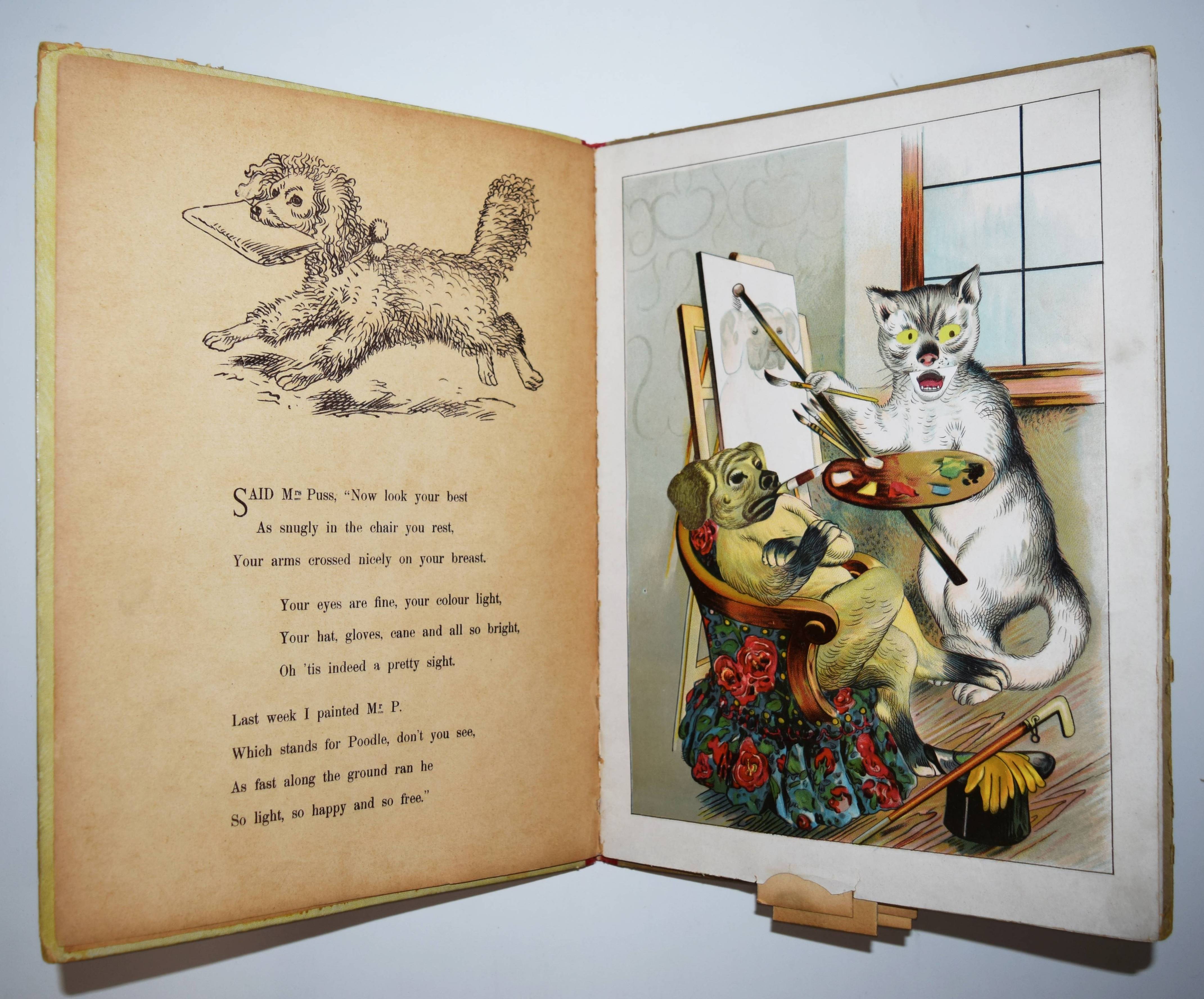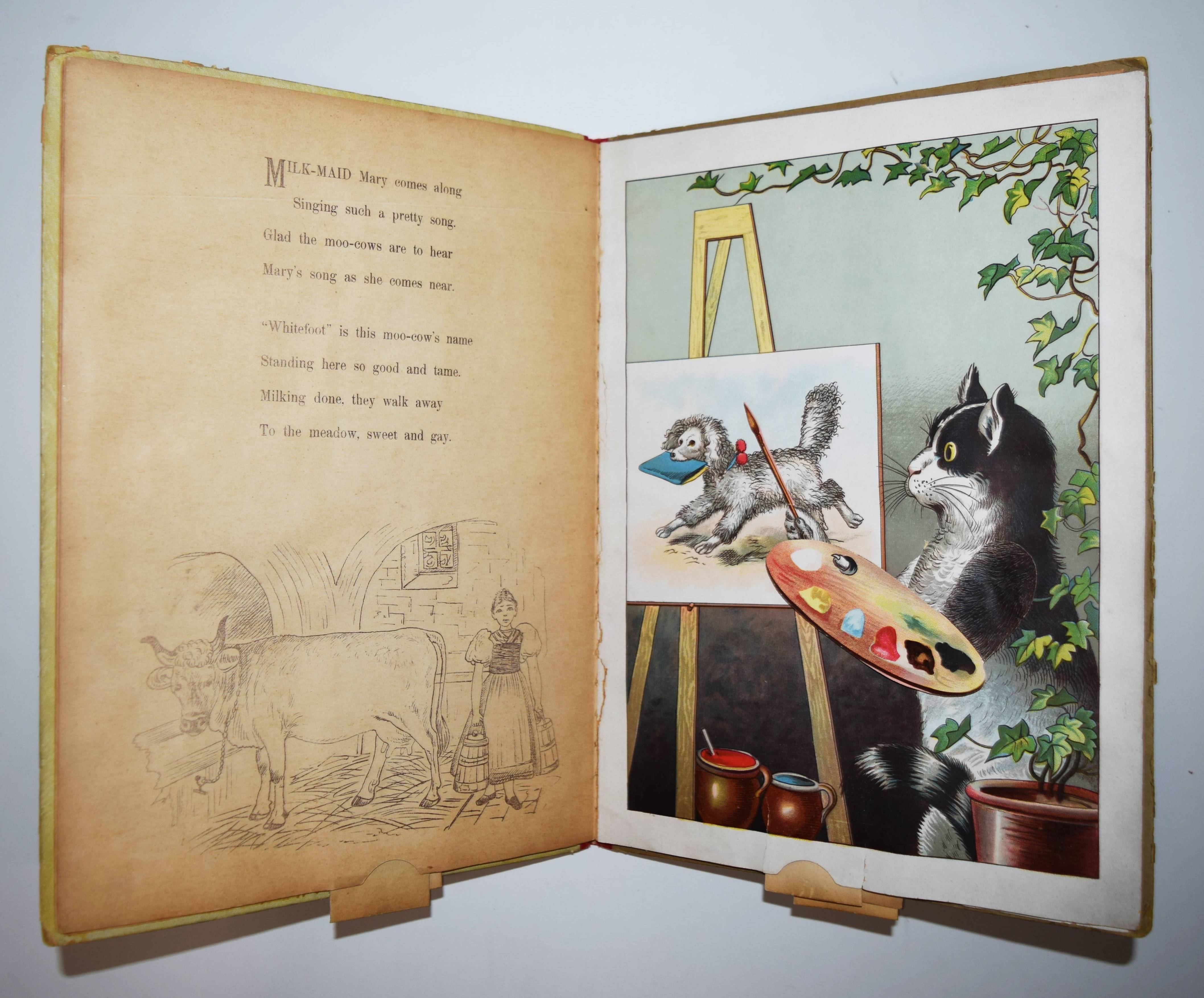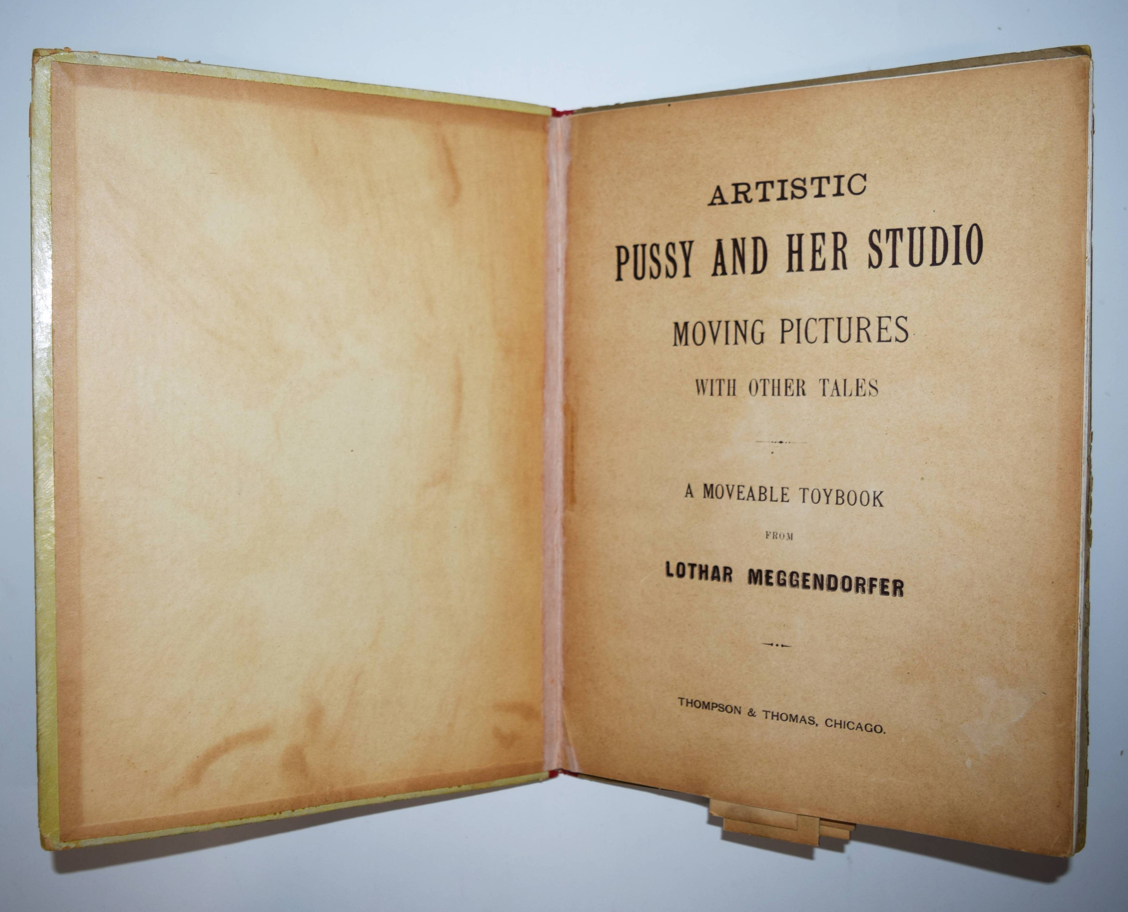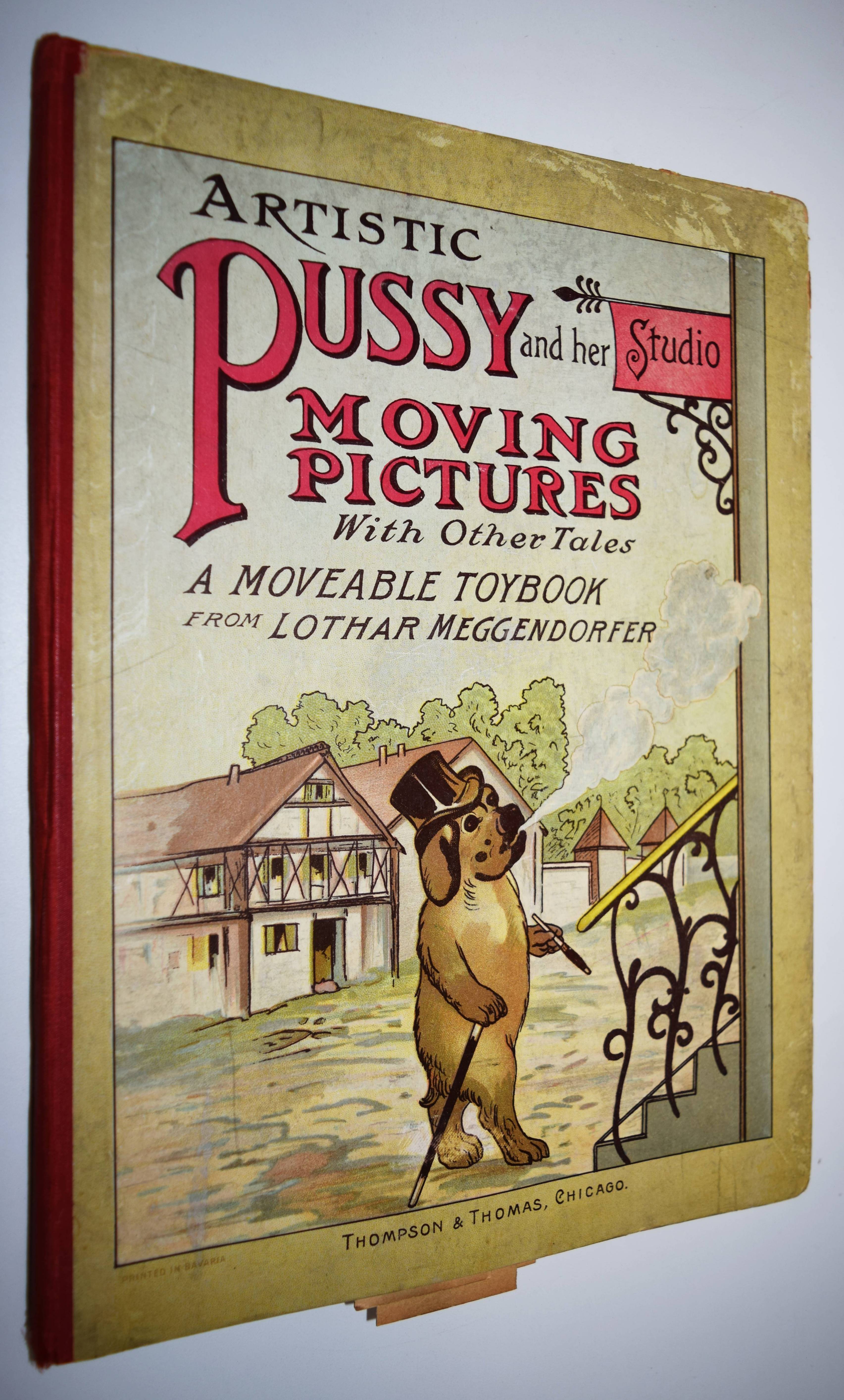 Meggendorfer, Lothar. Artistic Pussy and her studio. Moving pictures with other tales. A moveable toybook. Chicago, Thompson & Thomas (″printed in Bavaria“) o. J. (1895). 4° (31,5 x 23 cm.). [8] Bl. mit 6 chromolithogr. Tafeln mit beweglichen Teilen und Ziehmechanismus und 7 Illustrationen im Text. Farbig illustr. Orig.-Halbleinenband. Katzenheim S. 36. Nicht bei Krahé, Laub und der Osborne Collection. – Seltenes für den englischen Sprachraum konzipiertes Spiel-Bilderbuch. Erschien gleichzeitig auch bei The L. W. Walter Co. in Chicago und bei H. Grevel & Co. in London. Außerdem erschien eine französische Ausgabe mit dem Titel „Histoires pour rire“ mit Texten von A. Reynaud bei A. Capenda in Paris (ca. 1890). – Sechs illustre Geschichten in Versform, in denen Katze, Affe, Henne, Fuchs und Hase malen, die Kinder hüten, sich im Kohl verstecken oder Gänse stehlen. Kurzum: ein tierisch komisches Allerlei. – „Den Ziehbildern und den Zeichnungen stehen keine Vorlagen aus deutschen Veröffentlichungen gegenüber. Die illustrative Gestaltung und Farbgebung weichen von dem bei Lothar Meggendorfer gewohnten Stil ab“ (G. F. v. Katzenbach). – Vorderdeckel im Rand etwas berieben, im Blattrand und Ziehstreifen etwas fingerfleckig, sonst von leichten Gebrauchs- und Altersspuren abgesehen sehr gut erhalten, alle Ziehmechanismen voll funktionsfähig.