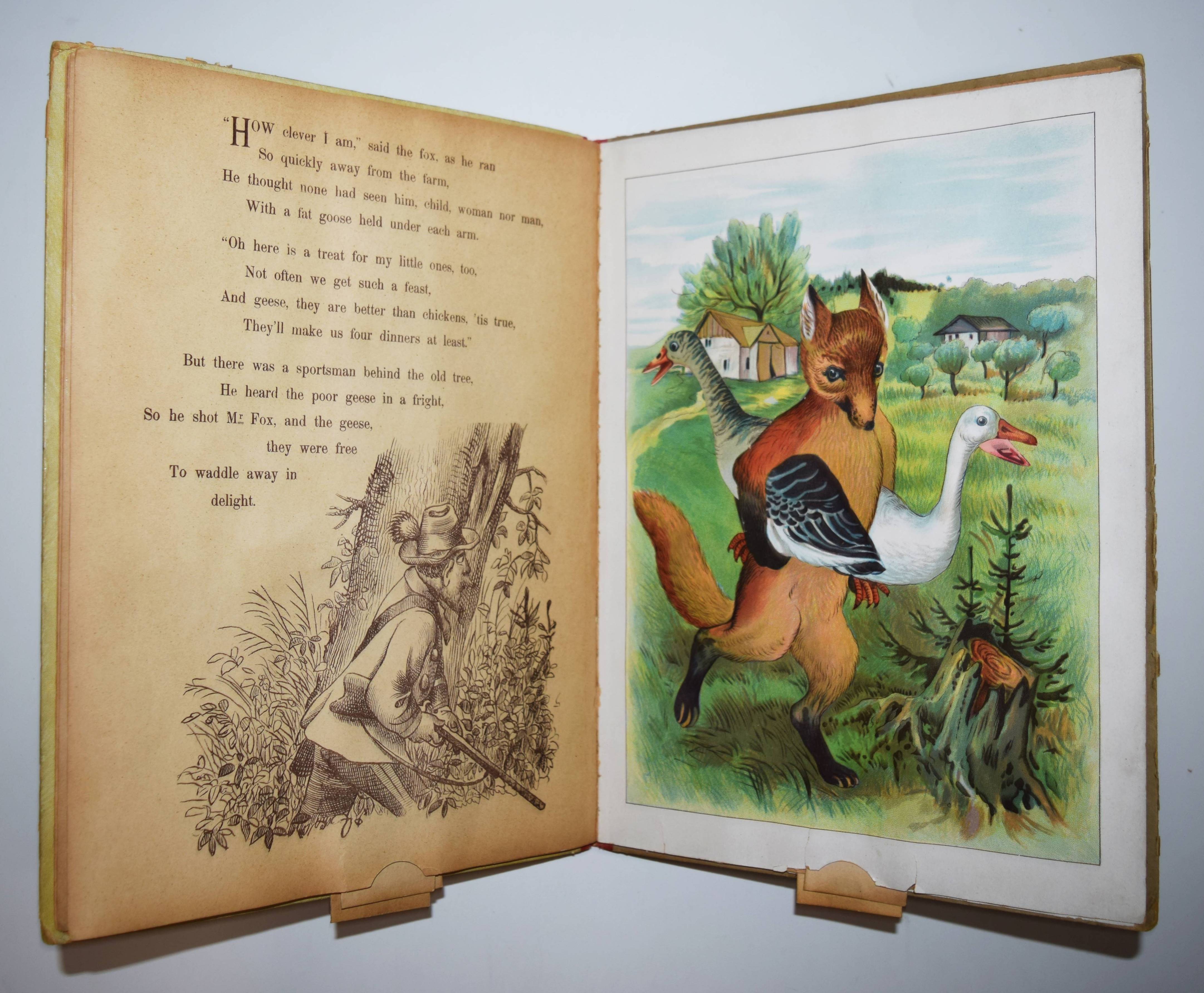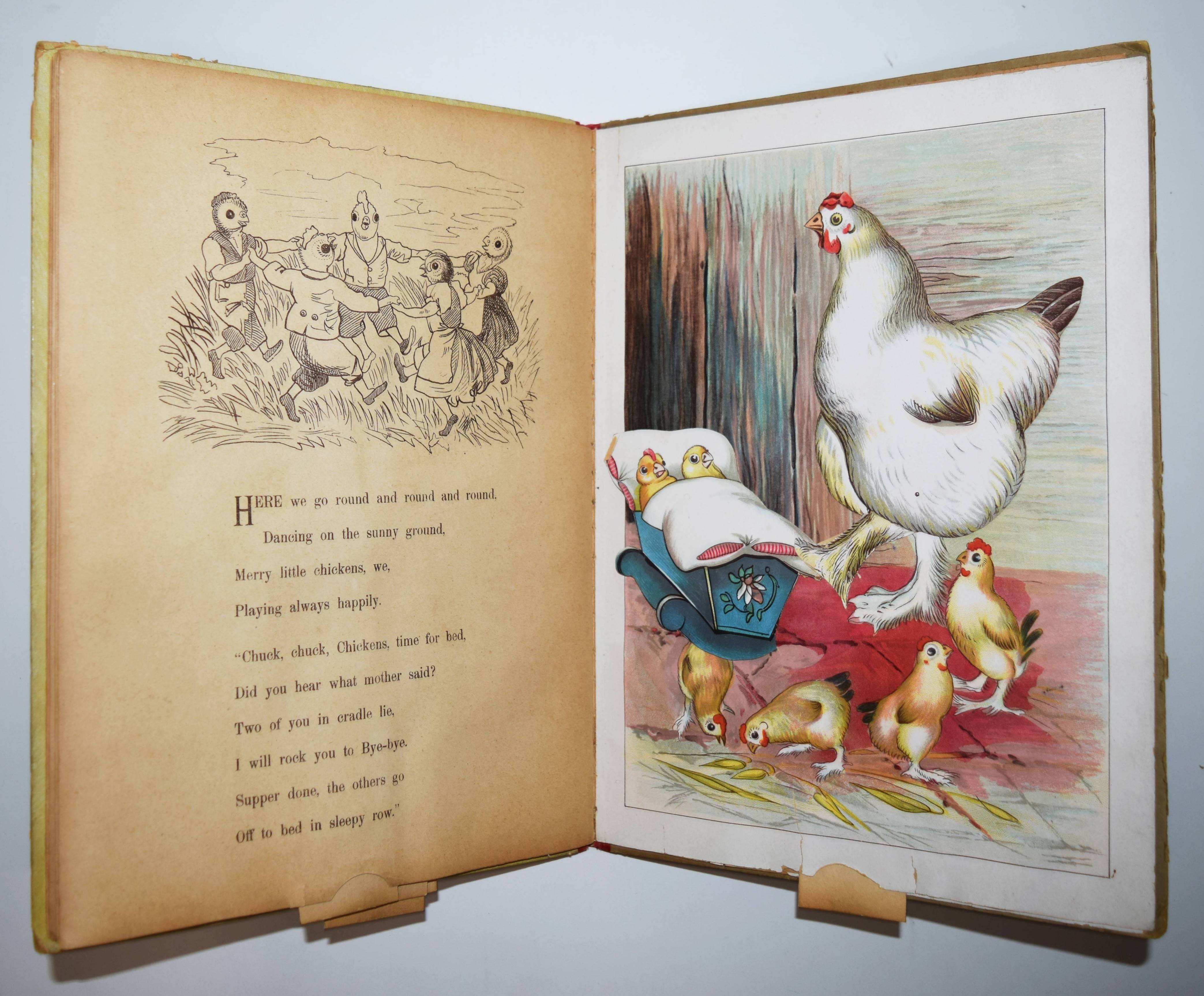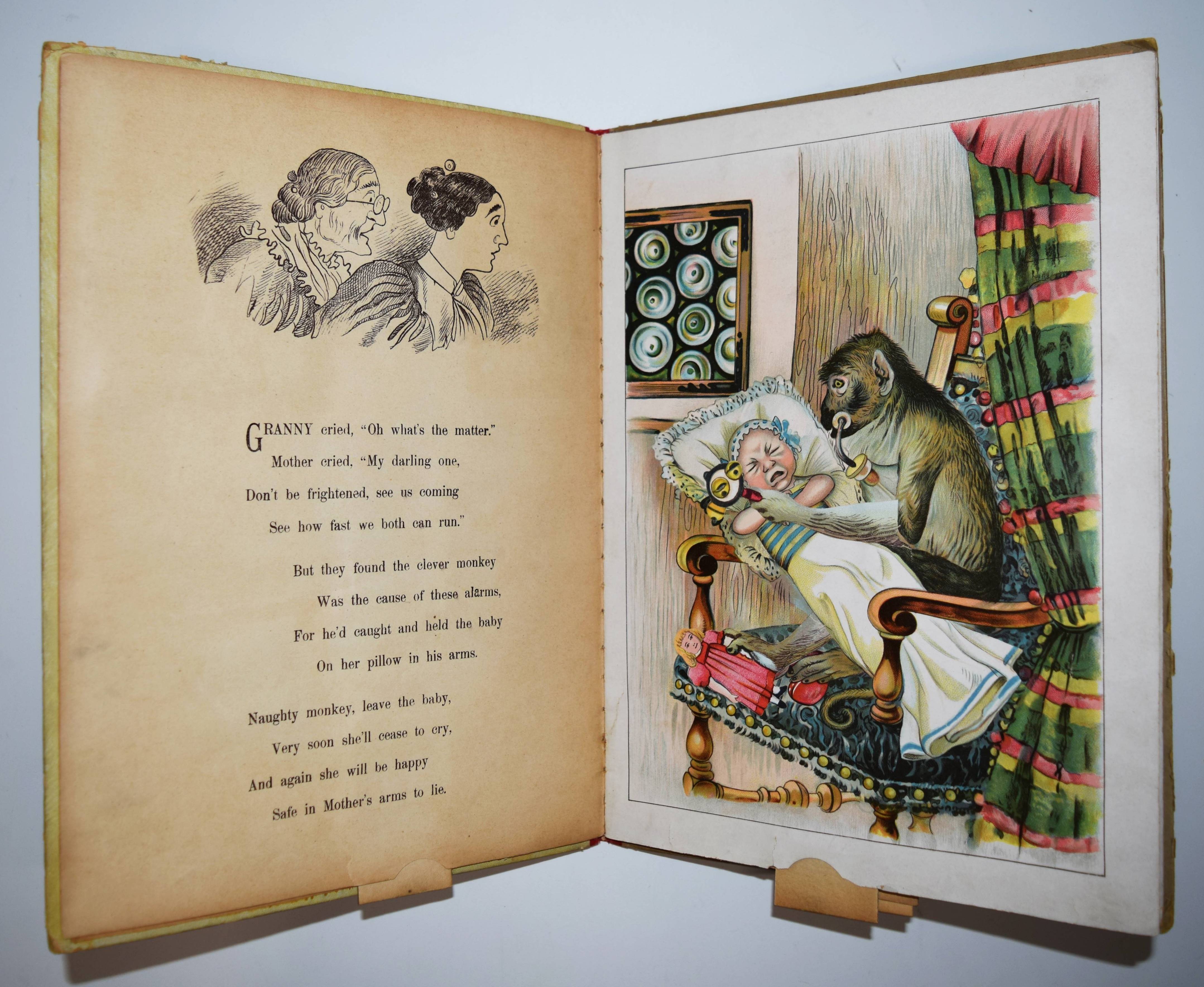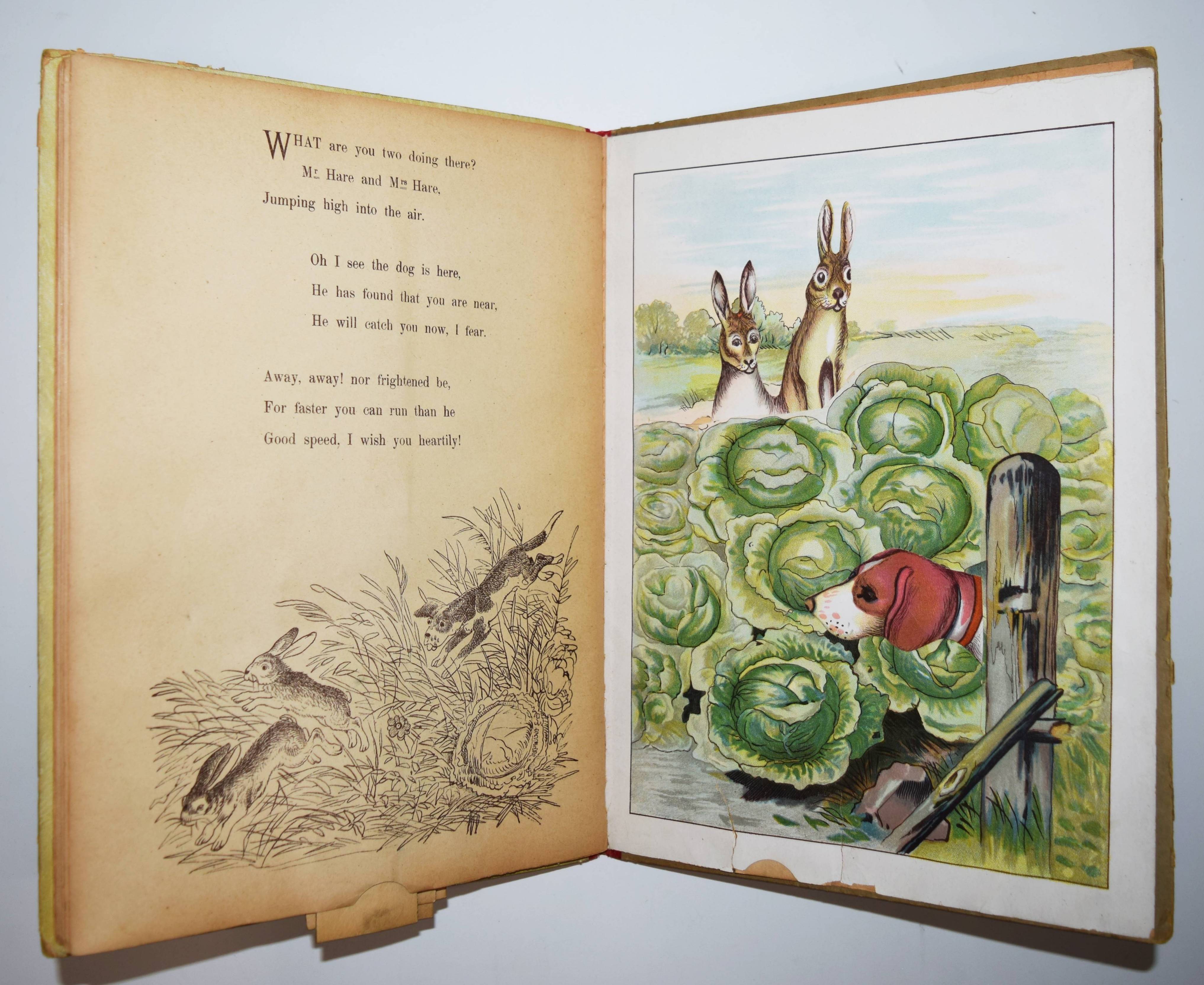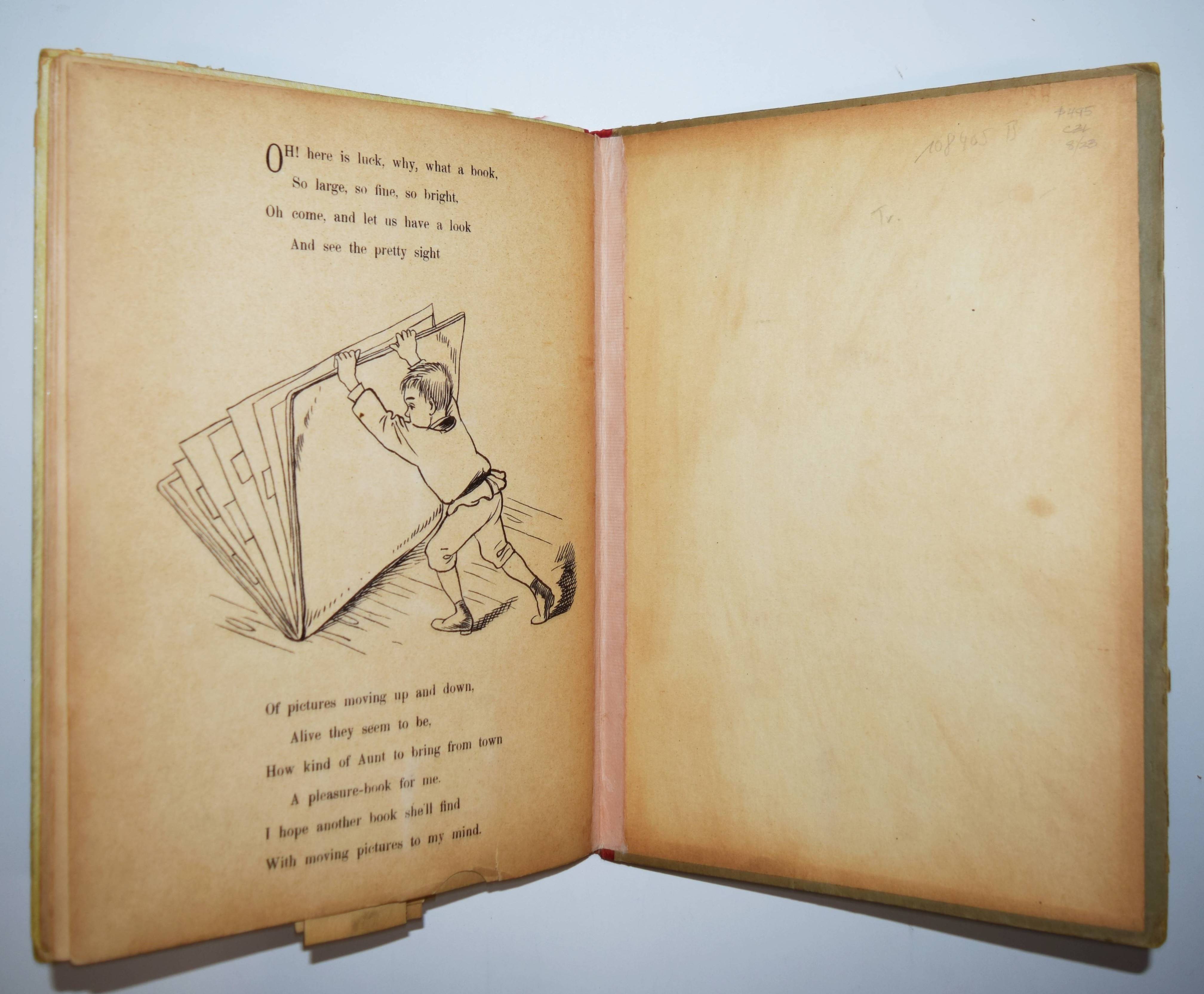 Meggendorfer, Lothar. Artistic Pussy and her studio. Moving pictures with other tales. A moveable toybook. Chicago, Thompson & Thomas (″printed in Bavaria“) o. J. (1895). 4° (31,5 x 23 cm.). [8] Bl. mit 6 chromolithogr. Tafeln mit beweglichen Teilen und Ziehmechanismus und 7 Illustrationen im Text. Farbig illustr. Orig.-Halbleinenband. Katzenheim S. 36. Nicht bei Krahé, Laub und der Osborne Collection. – Seltenes für den englischen Sprachraum konzipiertes Spiel-Bilderbuch. Erschien gleichzeitig auch bei The L. W. Walter Co. in Chicago und bei H. Grevel & Co. in London. Außerdem erschien eine französische Ausgabe mit dem Titel „Histoires pour rire“ mit Texten von A. Reynaud bei A. Capenda in Paris (ca. 1890). – Sechs illustre Geschichten in Versform, in denen Katze, Affe, Henne, Fuchs und Hase malen, die Kinder hüten, sich im Kohl verstecken oder Gänse stehlen. Kurzum: ein tierisch komisches Allerlei. – „Den Ziehbildern und den Zeichnungen stehen keine Vorlagen aus deutschen Veröffentlichungen gegenüber. Die illustrative Gestaltung und Farbgebung weichen von dem bei Lothar Meggendorfer gewohnten Stil ab“ (G. F. v. Katzenbach). – Vorderdeckel im Rand etwas berieben, im Blattrand und Ziehstreifen etwas fingerfleckig, sonst von leichten Gebrauchs- und Altersspuren abgesehen sehr gut erhalten, alle Ziehmechanismen voll funktionsfähig.
