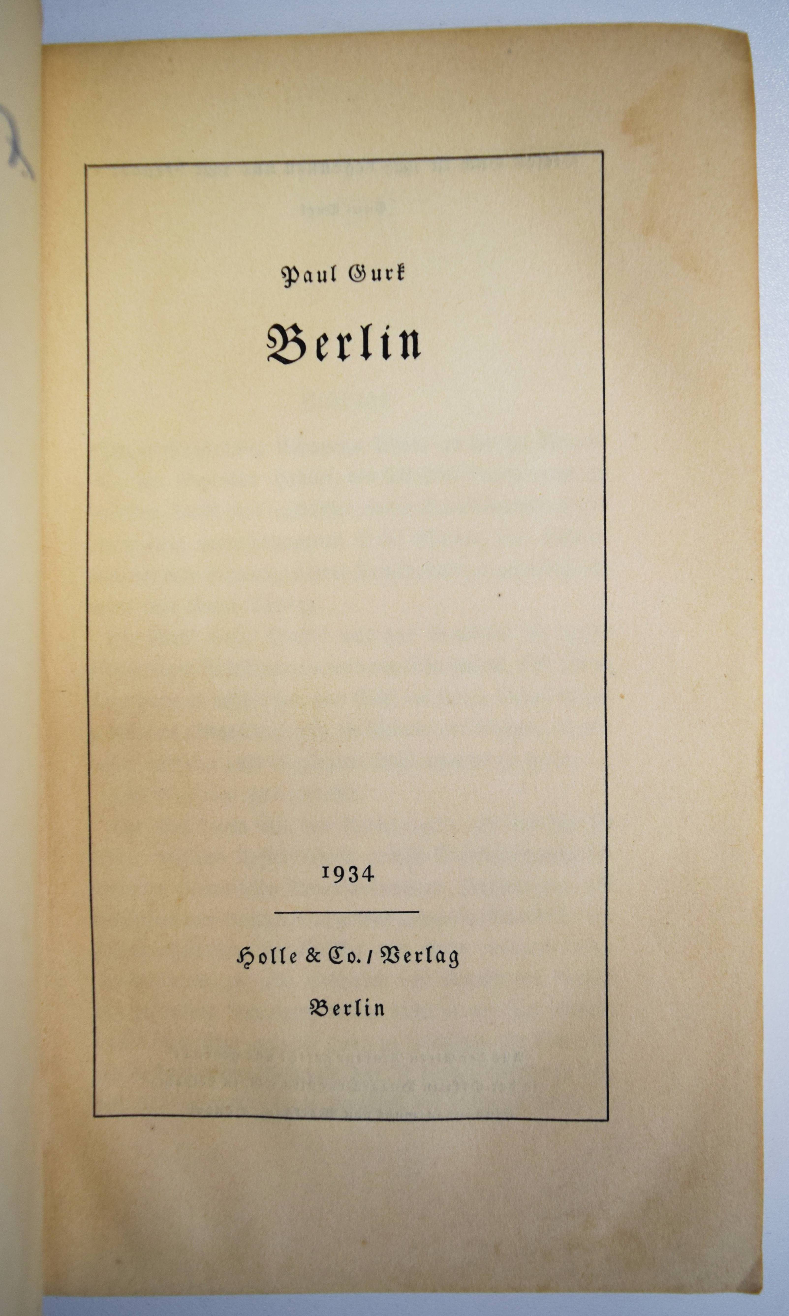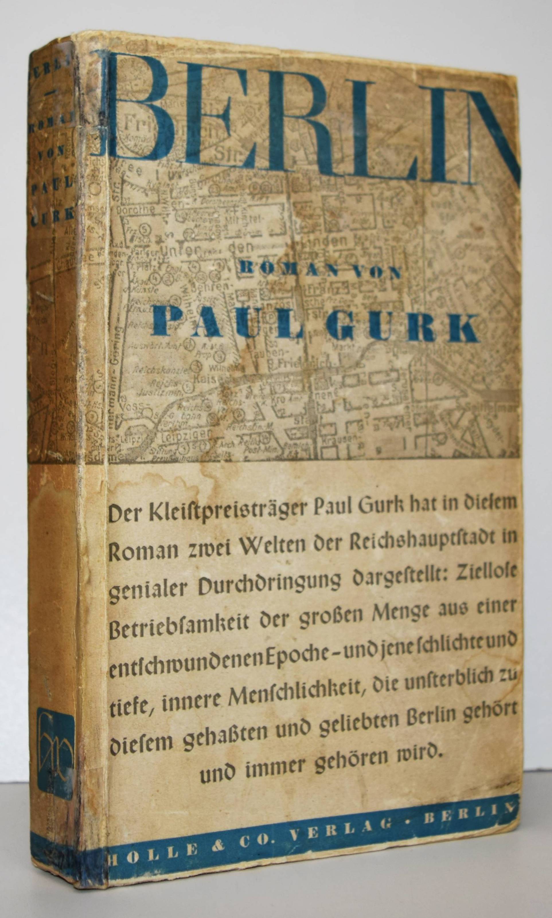 Gurk, Paul. Berlin. Berlin, Holle & Co. 1934. 8°. 362 S., [1] Bl. Orig.-Kartonumschlag mit illustr. Schutzumschlag (von Wolfgang Bender). W.-G.² 12. – Erste Ausgabe des klassischen Berlin-Romans, entstanden in den Jahren 1923 bis 1925. – „Der Kleistpreisträger Paul Gurk hat in diesem Roman zwei Welten der Reichshauptstadt in genialer Durchdringung dargestellt: Ziellose Betriebsamkeit der großen Menge aus einer entschwundenen Epoche – und jene schlichte und tiefe, innere Menschlichkeit, die unsterblich zu diesem gehaßten und geliebten Berlin gehört und immer gehören wird“ (Umschlagtext). – „Der Buchtrödler kam aus dem Schwingen seiner Gedanken zurück. Ein hastiger Mensch stieß ihn, vorwärtsdrängend, vom Bürgersteig auf das Straßenpflaster hinab. Er entschuldigte sich nicht.“ (S. 99). – „Gurks Roman Berlin ist Döblins Werk Berlin Alexanderplatz durchaus ebenbürtig“ (Hans Frey, Aufbruch in den Abgrund. München, Berlin 2020). – Umschlag angestaubt, berieben und fleckig, im ersten Drittel zwei Lagen etwas gelockert, noch gutes Exemplar.