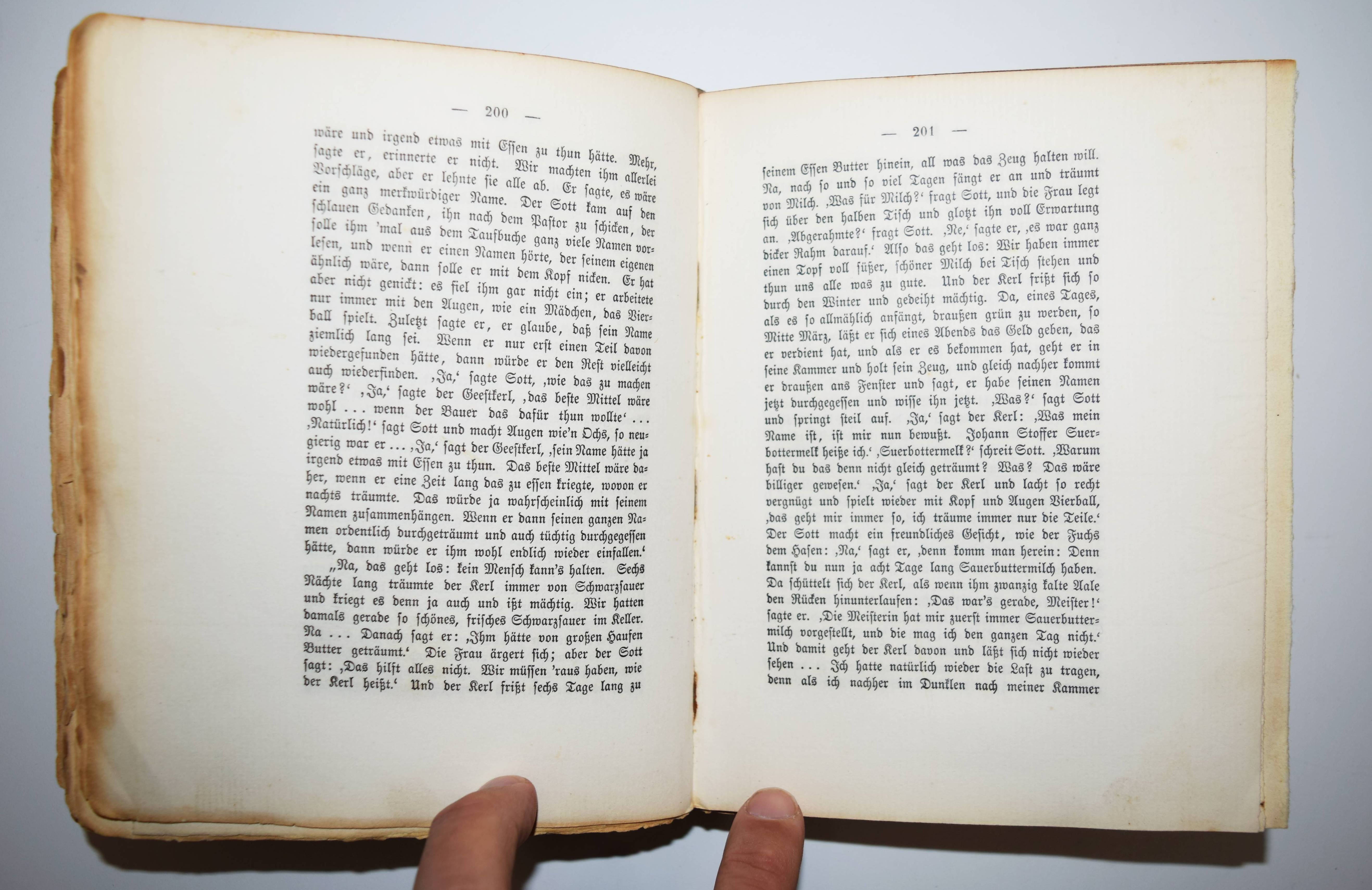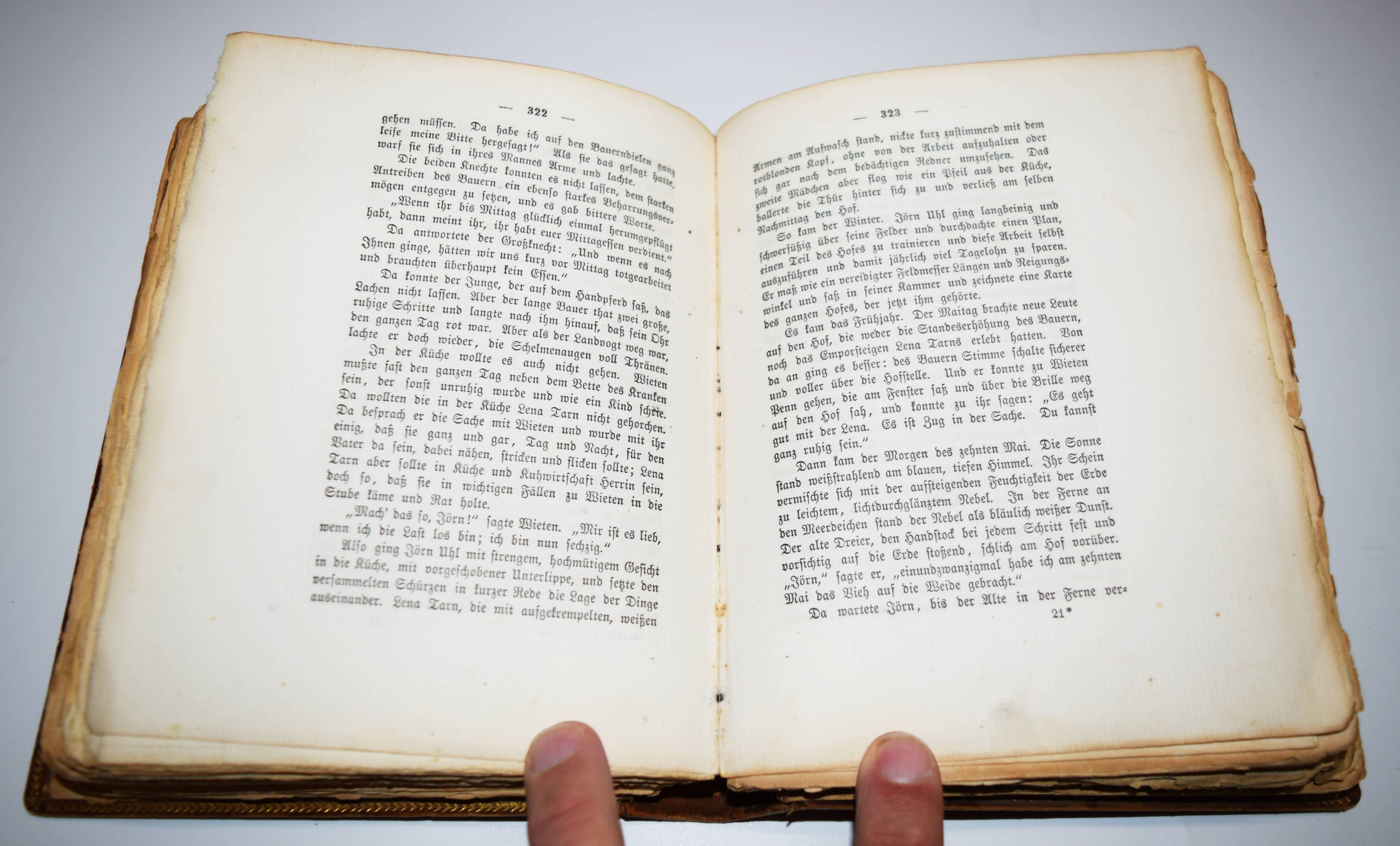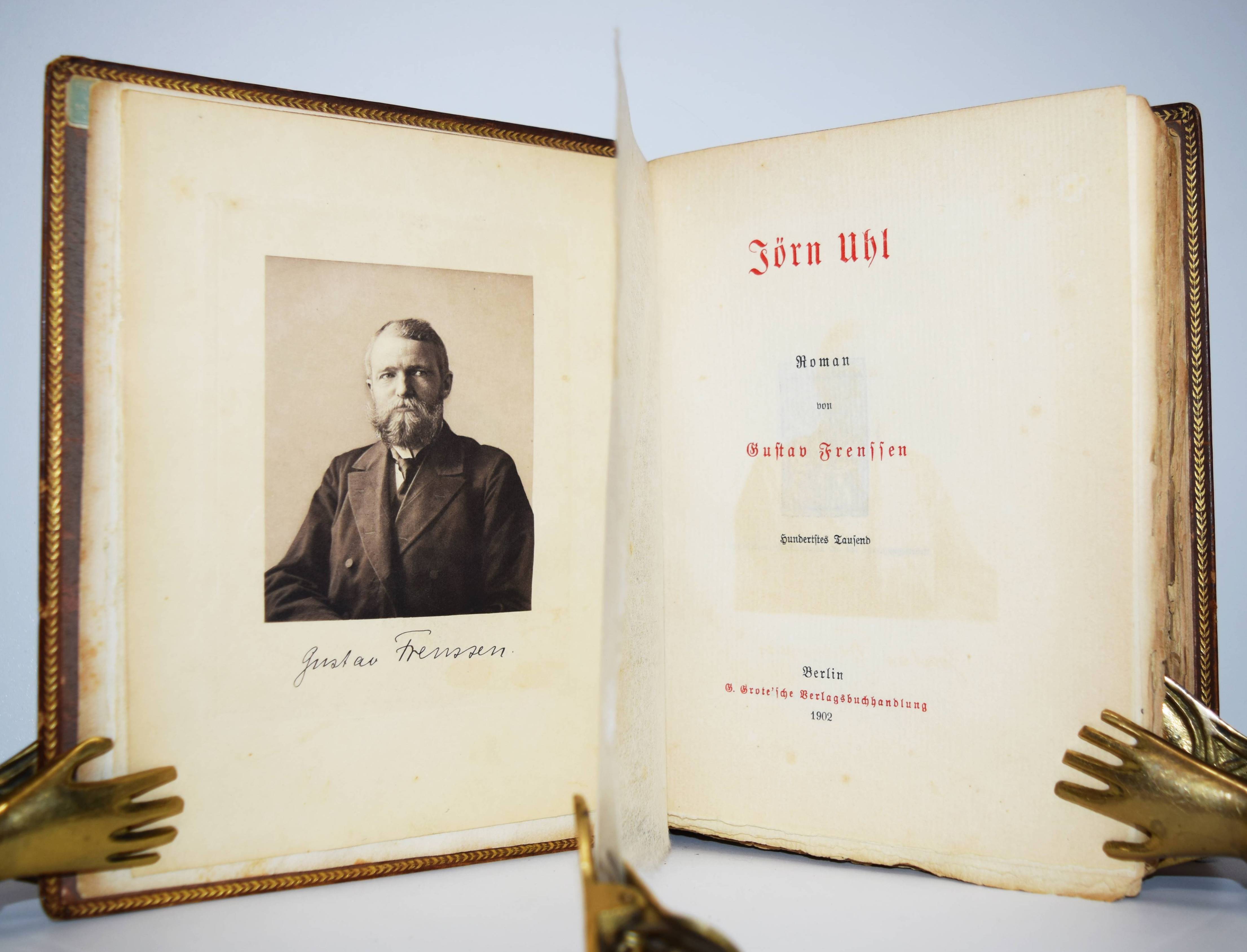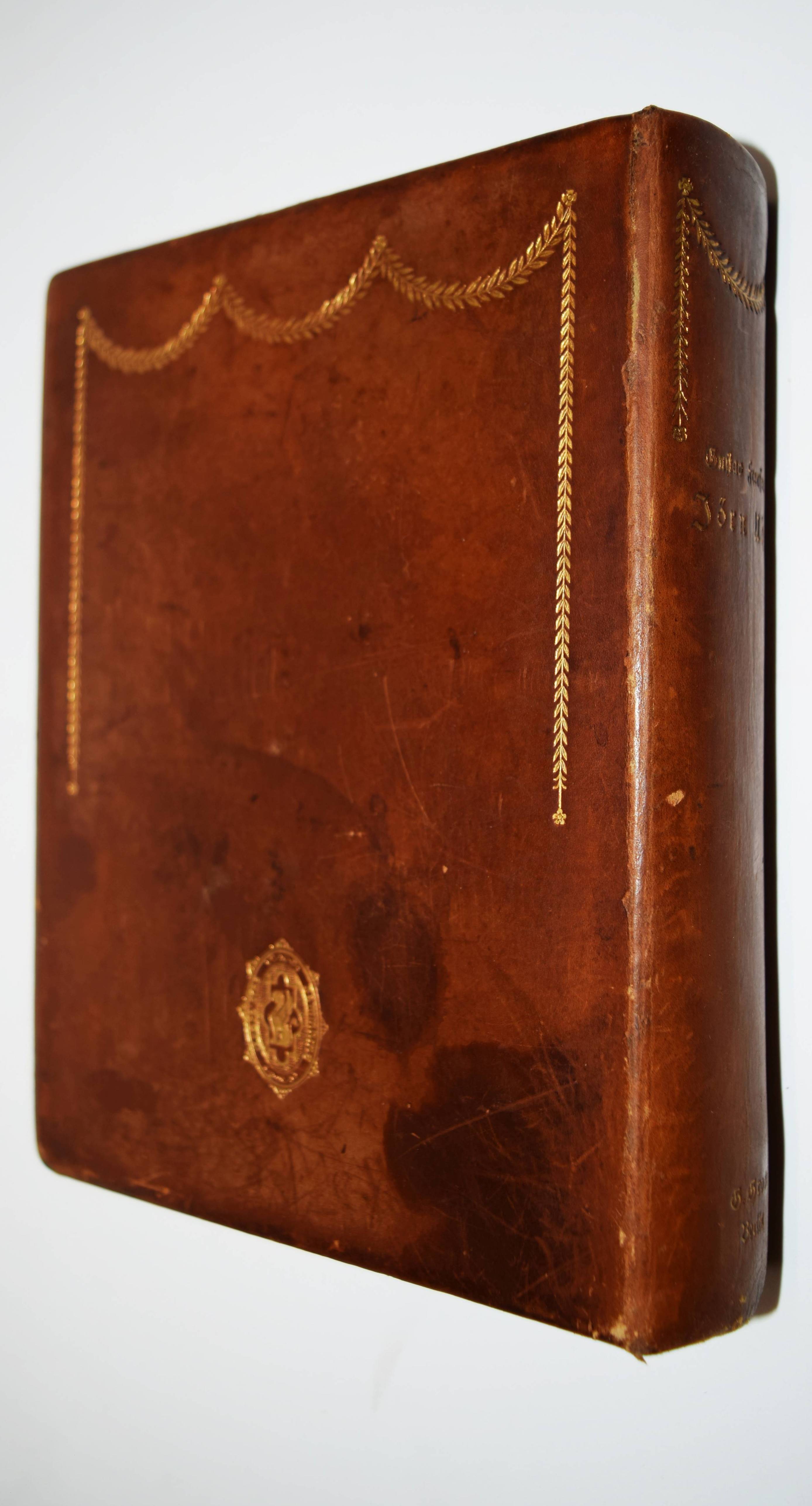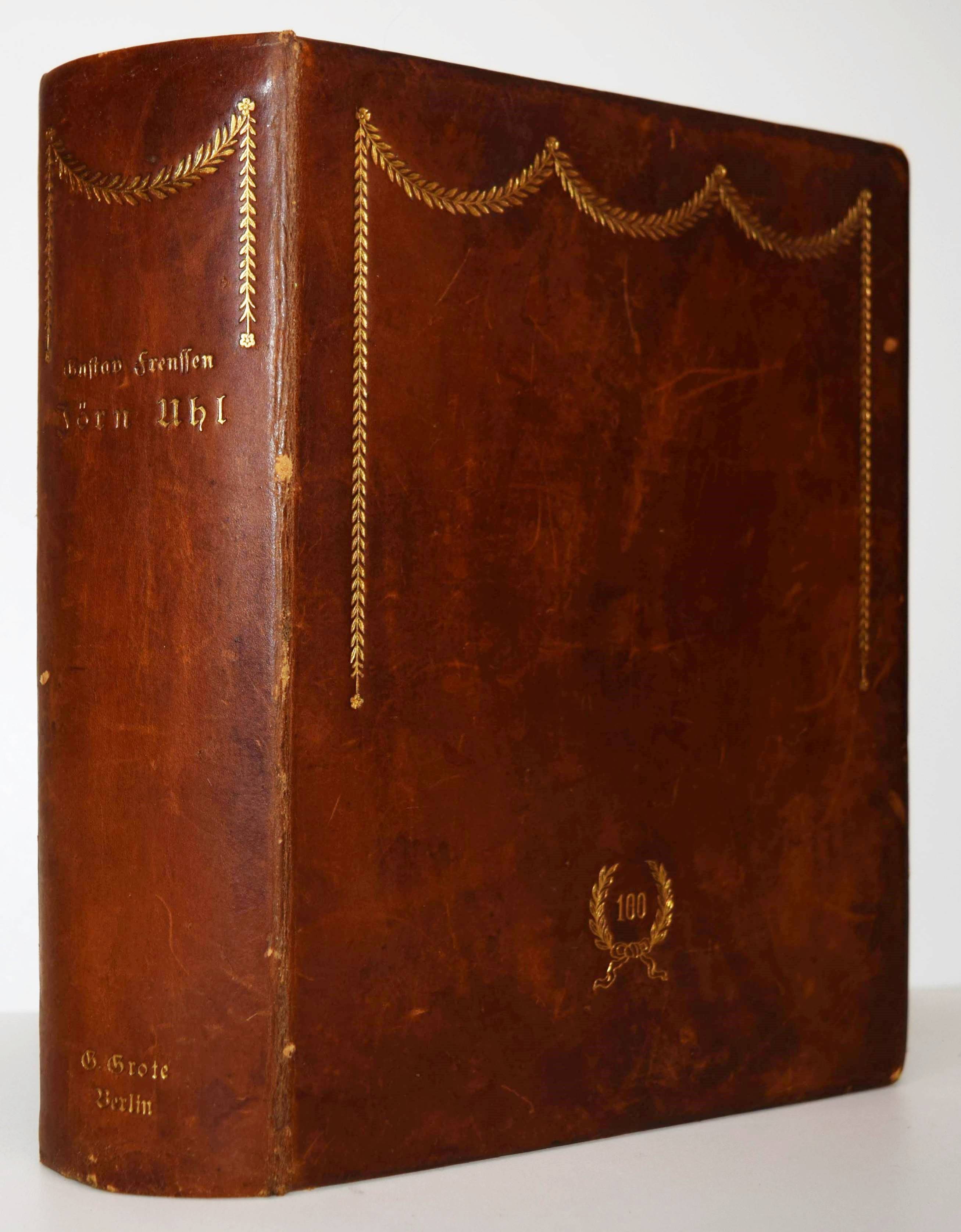 Frenssen, Gustav. Jörn Uhl. Roman. Hundertstes Tausend. Berlin, G. Grote 1902. 8°. [3] Bl., 525, (1) S. mit photogr. Portrait. Orig.-Kalbslederband goldgepr. Rückentitel, Rücken-, Deckel- und Innenkantenvergoldung. (Grote’sche Sammlung von Werken zeitgenössischer Schriftsteller, 73 Band). Schön ausgestattete Jubiläums-Ausgabe, im Handeinband und auf seitlich und unten unbeschnittenes Büttenpapier gedruckt. – „Mit einer eindrucksvollen Erzählweise, die sowohl poetische als auch realistische Elemente vereint, gelingt es Frenssen, die komplexe Beziehung zwischen Mensch und Natur zu thematisieren und die inneren Konflikte seiner Protagonisten zu explorarieren. Das Werk ist in der Tradition des volkstümlichen Romans angesiedelt und reflektiert die sozialen Umwälzungen der frühen 20. Jahrhunderts, während es gleichzeitig zentrale Fragen von Identität, Gemeinschaft und Zugehörigkeit aufwirft. Gustav Frenssen, 1873 in Nordfriesland geboren, war ein Schriftsteller und Theologe, dessen eigene Erlebnisse in der ländlichen Umgebung als Inspiration für seine Werke dienten“ (Zu einer Neuausgabe 2022). – Einband geringfügig berieben, gutes Exemplar.