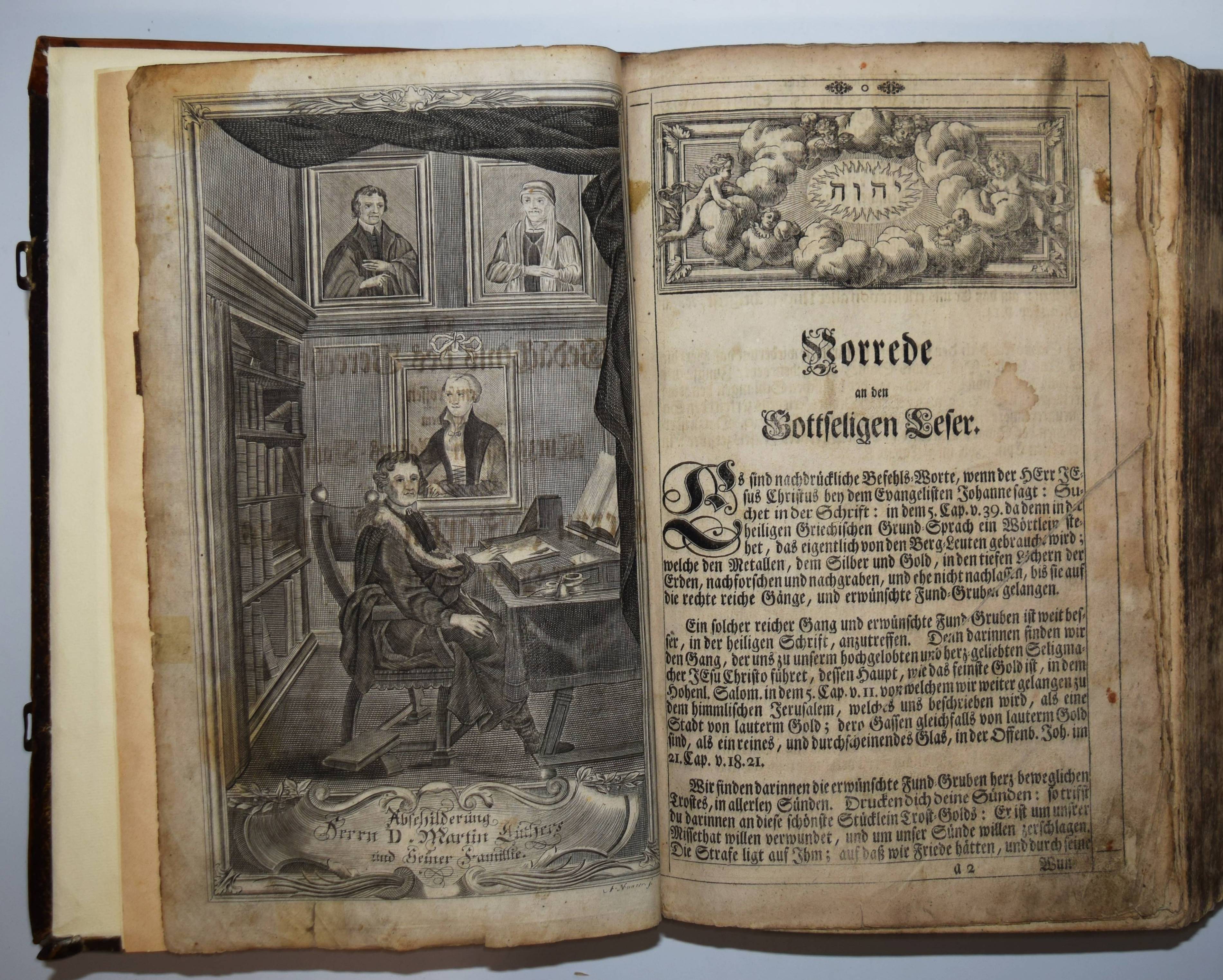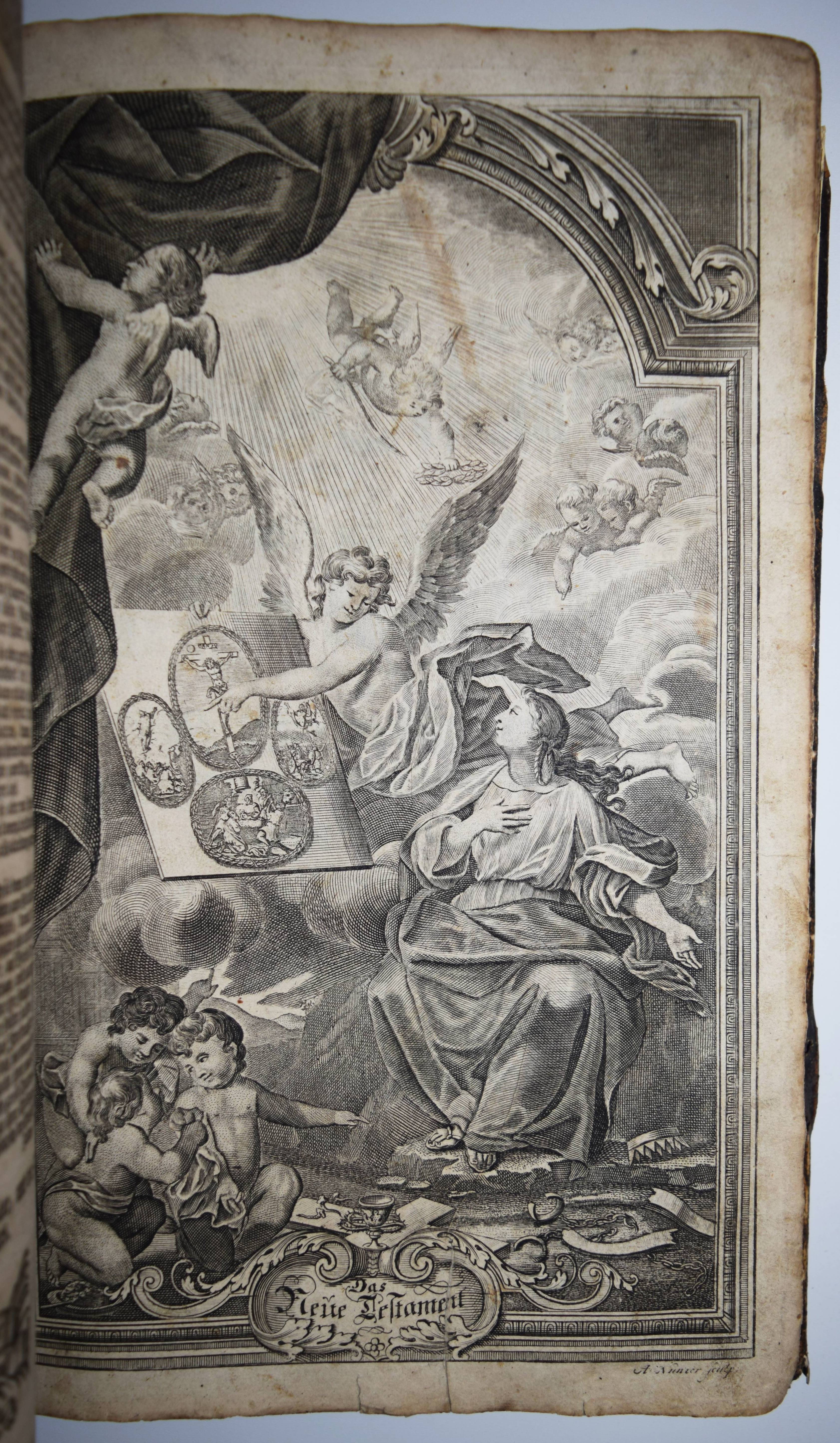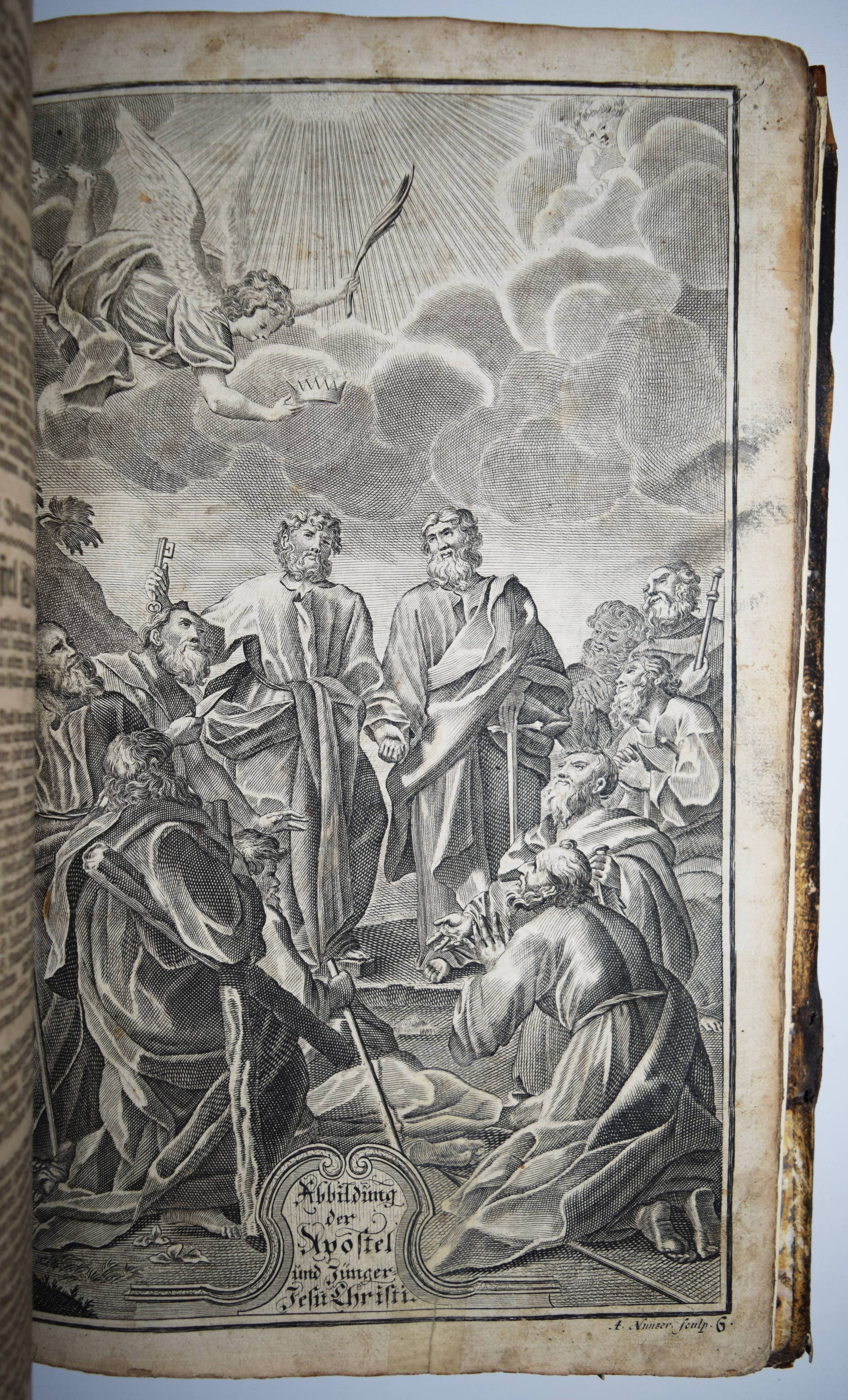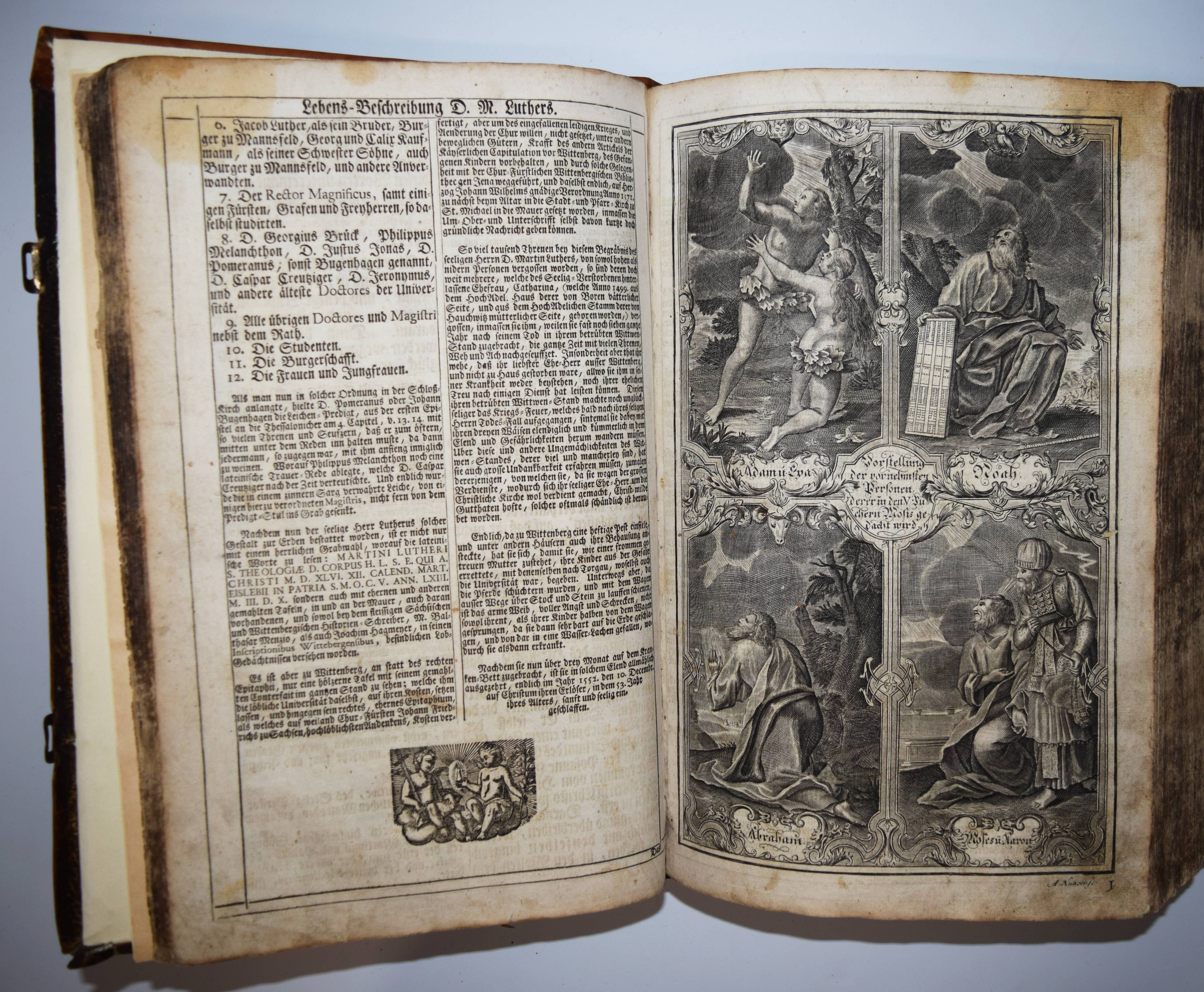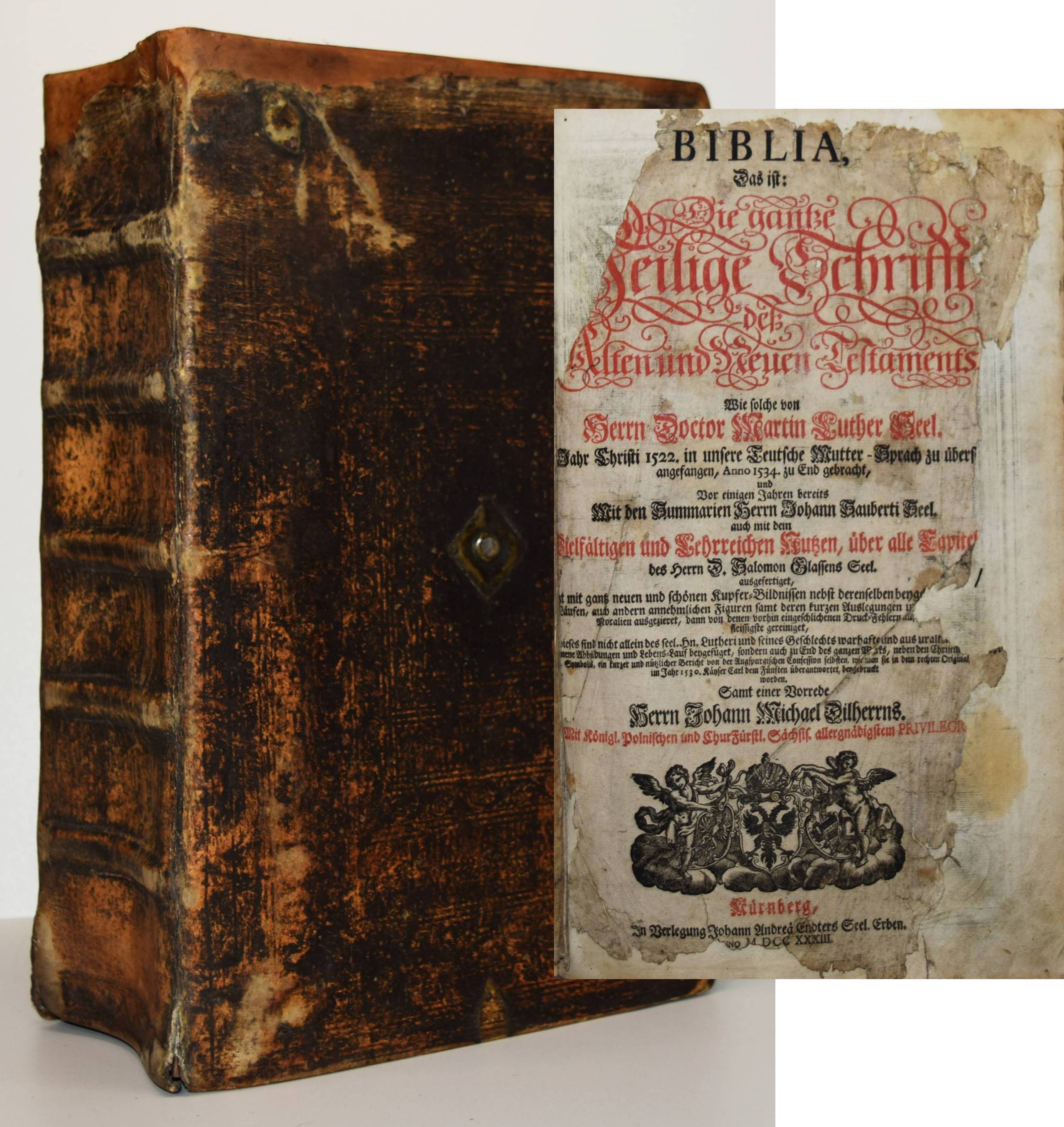 Biblia germanica – Luther, Martin (Übers.). Biblia, Das ist: die gantze Heilige Schrifft, Altes und Neues Testaments, Teutsch, Herrn Doctor Martin Luther … Mit den Summarien Herrn Johann Sauberti … Samt einer Vorrede Herrn Johann Michael Dilherrns. 2 Teile in 1 Band. Nürnberg, Johann Andreä Endters Seel. Söhne 1733. Folio (39 x 26 cm.). [32] Bl, 706 S., [2] Bl., S. 707-912,; gestoch. Frontispiz, Titel, S. 913-1034, [2] Bl., S. 1035-1181, (9) S. mit Titel in Rot und Schwarz, 2 gestoch. Frontispizen, gestoch. Portrait Luthers, 4 gestoch. illustr. Zwischentiteln und 226 Text-Holzschnitten von Paul Creutzberger. Zeitgenöss. blindgepr. Schweinsledereinband über Holzdeckeln auf 5 Bünden mit 2 Messingschließen. Bibelslg. der Württ. Landesbibliothek E 1322. Darlow/Moule 4234. Jahn 117 f. Schmidt 372 ff. – 21. Auflage der berühmten Dilherr-Bibel des Endter-Verlages. – „Wegen des sehr hohen Aufwandes, den die Weimarer Bibel erfordert hatte, gab Wolfgang Endter der Ältere 1656 eine kleinere Variante heraus, die unter der Verantwortung des eben genannten Nürnberger Pfarrers und Rhetorikers Johann Michael Dilherr (1604-1669) stand. Die Dilherr-Bibel garantierte den Endters die größten Erfolge. Von 1656 bis 1788 erschienen mindestens 29 Auflagen. Sie bieten den reinen Text der Luther-Bibel fortlaufend, eignen sich demnach auch zum Vorlesen in Kirche und Familie und sind durch ihre in den Text eingestreuten zweispaltigen Holzschnitte Bilderbuch zugleich“ (E. Zwink, Württ. Landes-Bibliothek, Stuttgart). – Einband berieben und an der oberen Kante restauriert, das Verschlußteil der oberen Schließe fehlt, Vorsätze erneuert, Titelblatt mit Fehlstellen im Rand (minimaler Textverlust) und verso auf das Frontispiz aufgezogen, 1 Kupfertafel mit hinterlegter Fehlstelle, durchgehend gebräunt und im Blattrand fingerfleckig, insgesamt noch ordentliches und vollständiges Exemplar in einem zeitgenössischen Einband.