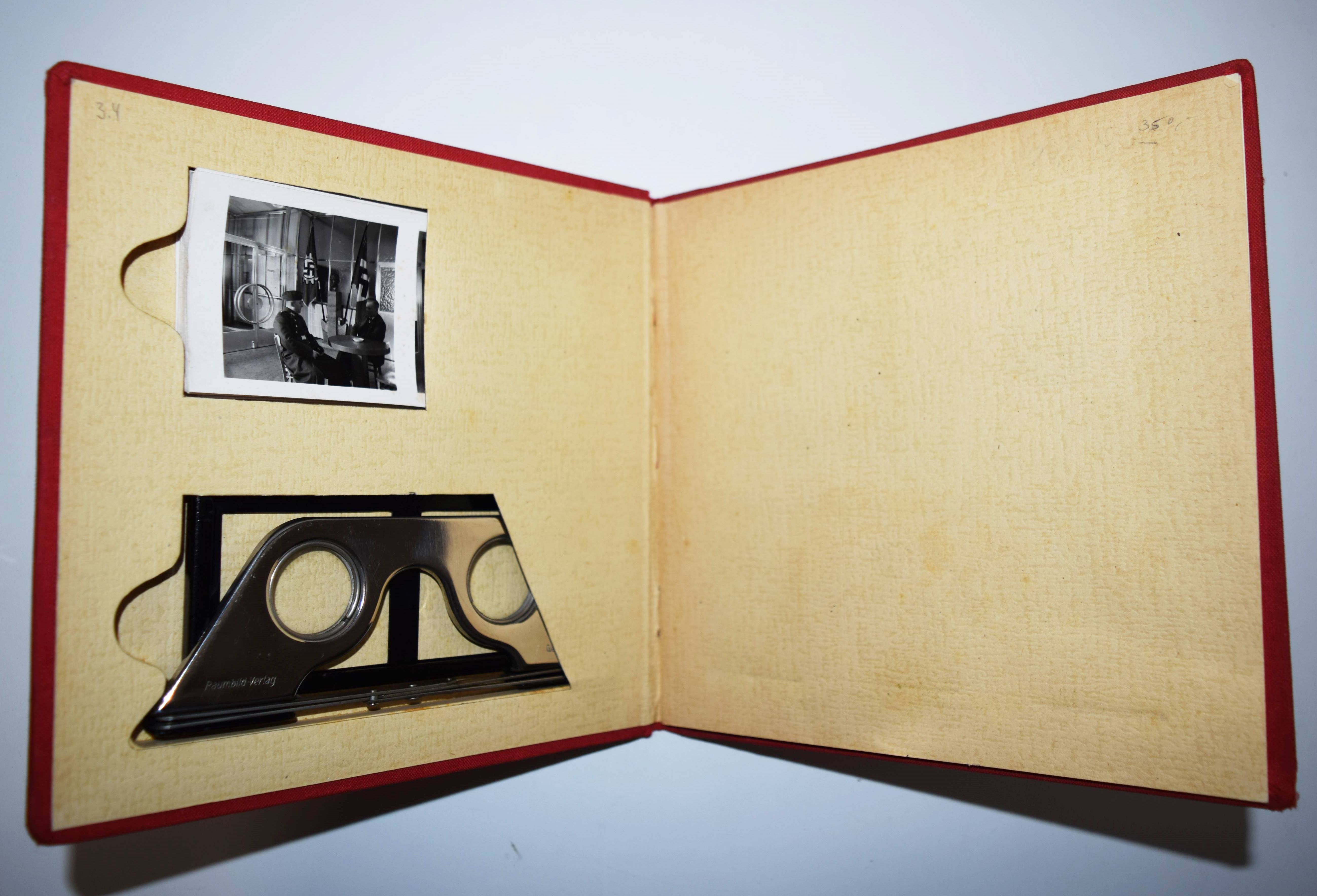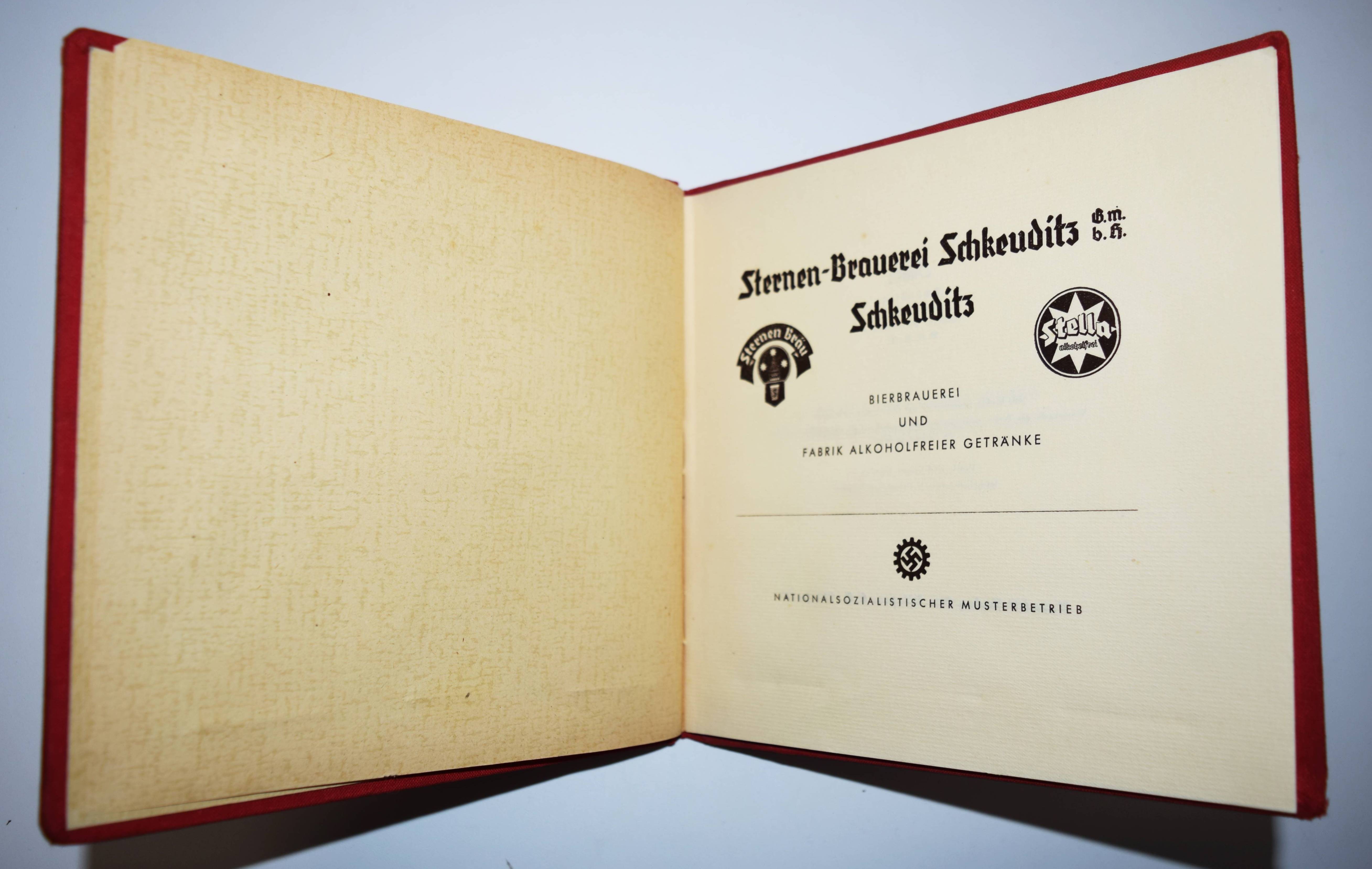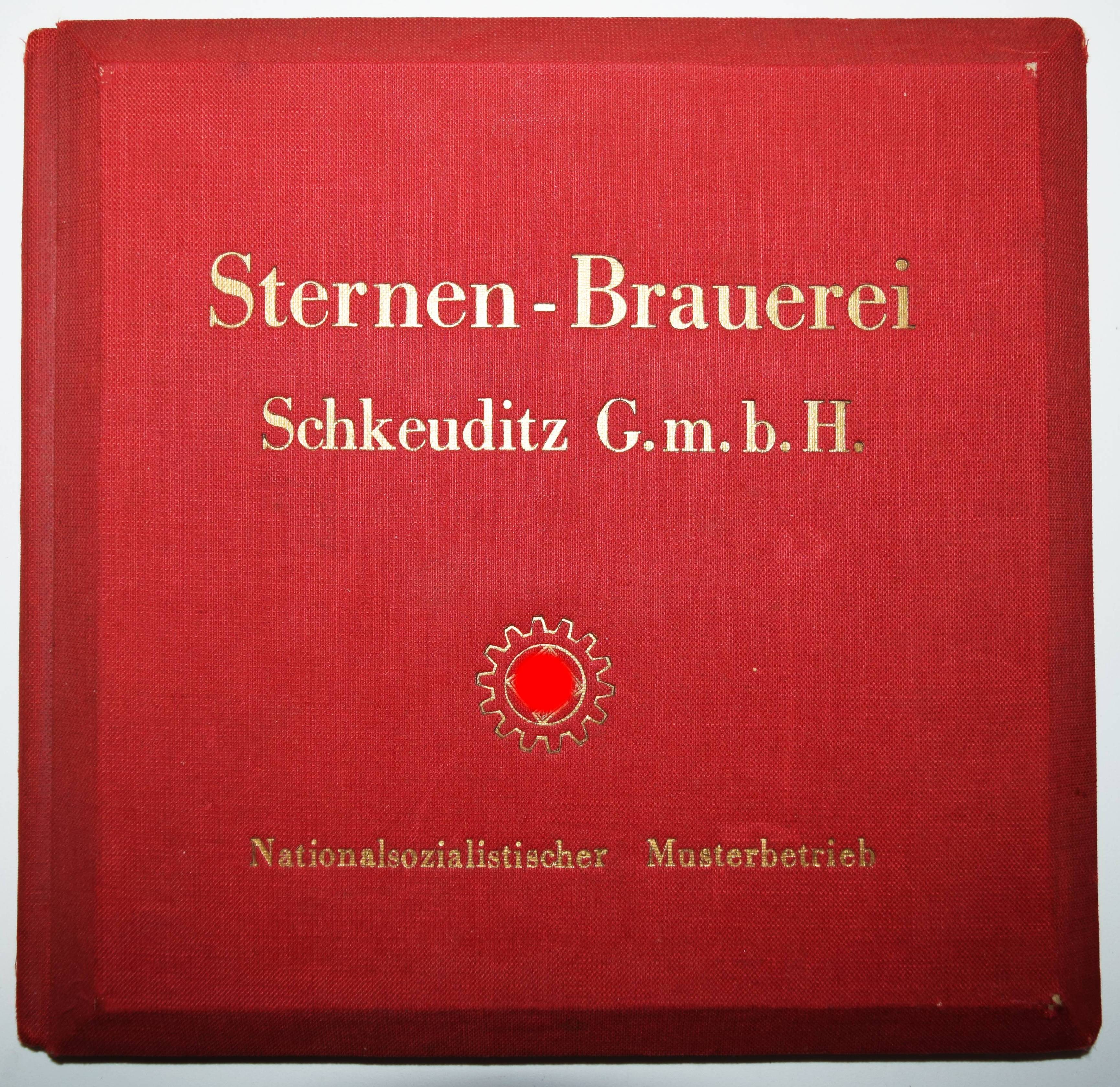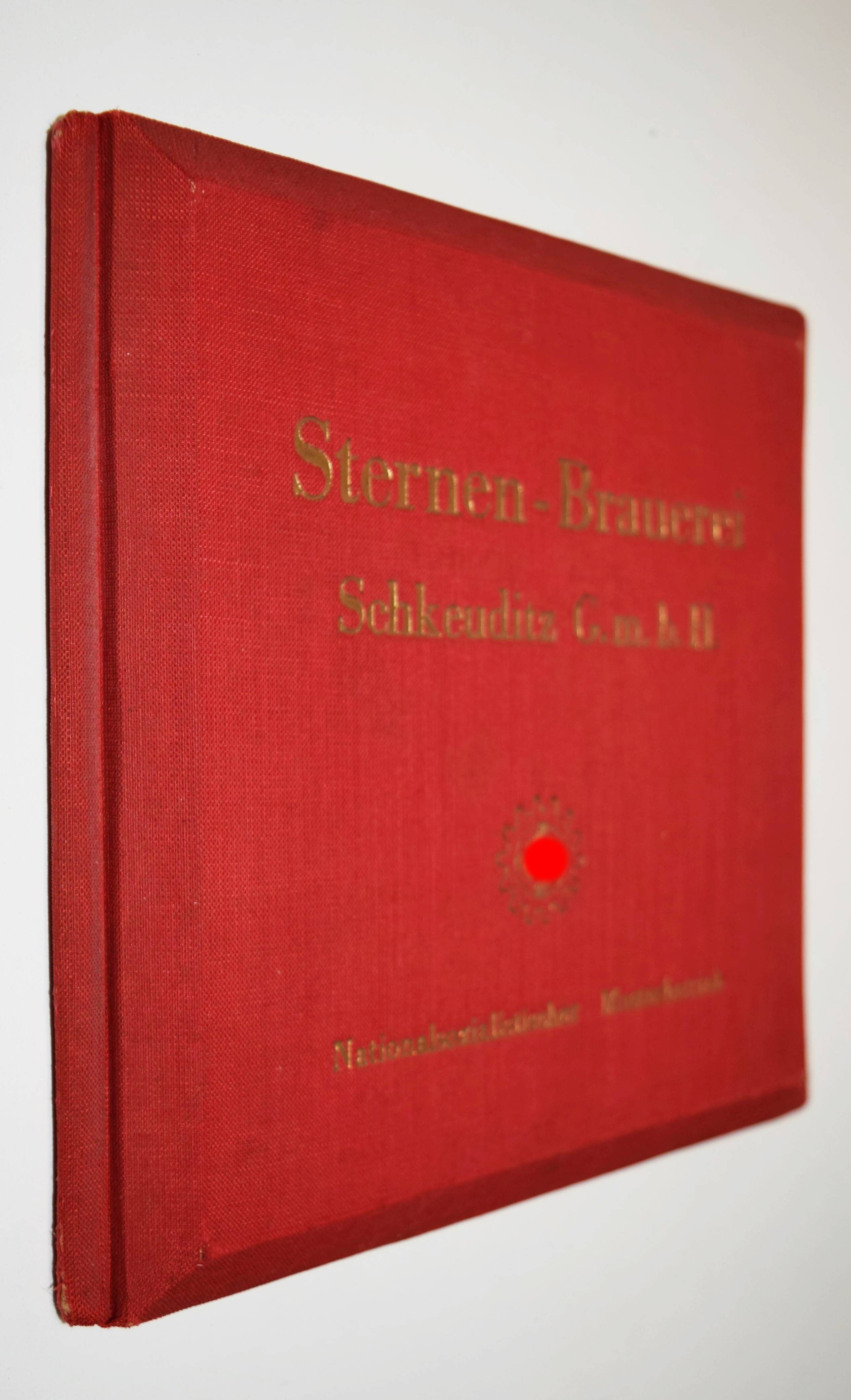 Stereo-Photographie – Sternen-Brauerei Schkeuditz GmbH. Bierbrauerei und Fabrik alkoholfreier Getränke. Nationalsozialistischer Musterbetrieb. München, Raumbild-Verlag Otto Schönstein o. J. (ca. 1939). Quer-8° (19 x 20 cm.). 23, (1) S. mit 25 Stereo-Photographien und Stereo-Betrachter aus Metall. Orig.-Leinenband mit goldgepr. Deckeltitel. Vorsteher, Der Raumbildverlag Otto Schönstein. Magazin. Deutsches Historisches Museum. Heft 27, 2001, S. 53, 3.4. – Der vierte Band der Sonderausgaben der Raumbild-Verlags Otto Schönstein. Vermutlich nur in sehr kleiner Auflage erschienen. – „Unsere Brauerei besteht seit mehr als hundert Jahren. Sie liegt inmitten der Stadt Schkeuditz an der Reichsstraße Halle-Leipzig. Bis zum Jahre 1845 gehörte sie der Brauerschaft Schkeuditz. In diesem Jahre wurde sie von dem Bürger Kaufmann Karl Heinrich Hoffman gekauft. Nach dessen Tode im Jahre 1855 bewirtschaftete die Brauerei seine Witwe, später die beiden Söhne Heinrich und Karl Hoffmann, bis am Anfang der achtziger Jahre der dritte Bruder Hugo Hoffmann noch in das Geschäft eintrat. Vom Jahre 1886 führte letzterer die Brauerei als alleiniger Inhaber weiter, nachdem seine beiden Brüder verstorben waren. Ab 1. März 1898 ging das Brauereigrundstück durch Kauf an den Brauereibesitzer James Alexander Freiherr Speck von Sternburg, Lützschena-Leipzig über. Derselbe führte den Betrieb neben der ihm gehörigen Freiherrlich von Sternburgschen Brauerei, Lützschena als Abteilung II dieser Brauerei fort.“ (S. 5). Alexander Maximilian Speck von Sternburg bewirtschaftete die Brauerei bis zu seinem Tod im Jahr 1911, sein Sohn James Alexander (1856-1916) wandelte die Brauerei 1913 zur Brauerei Sternburg G.m.b.H. Leipzig-Lützschena um. Zu diesem Zeitpunkt war das Unternehmen die größte Einnahmequelle der Familie Speck von Sternburg und zählte zu den größten Brauhäusern Mitteldeutschlands. – Einband leicht angestaubt, sehr gutes Exemplar.