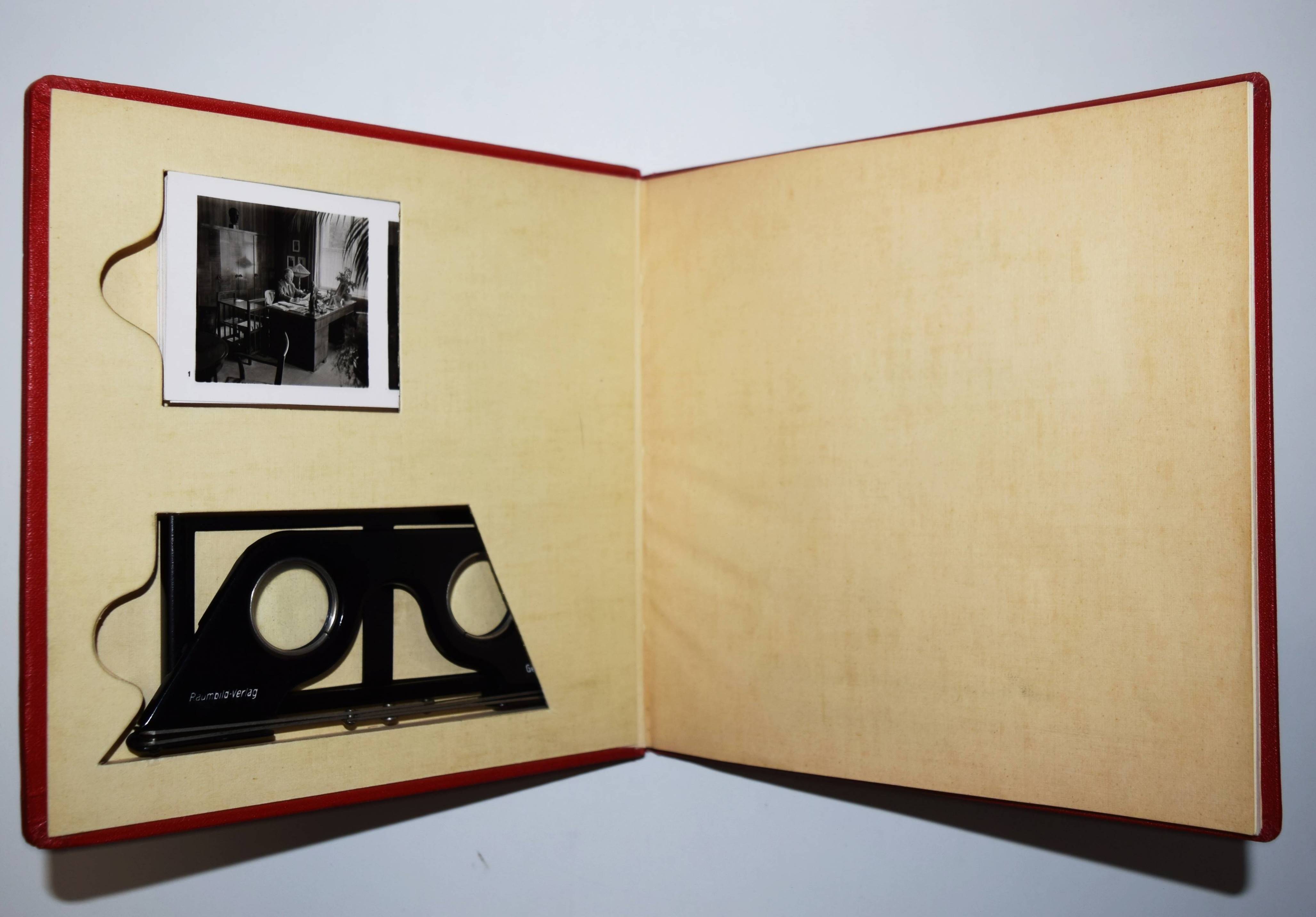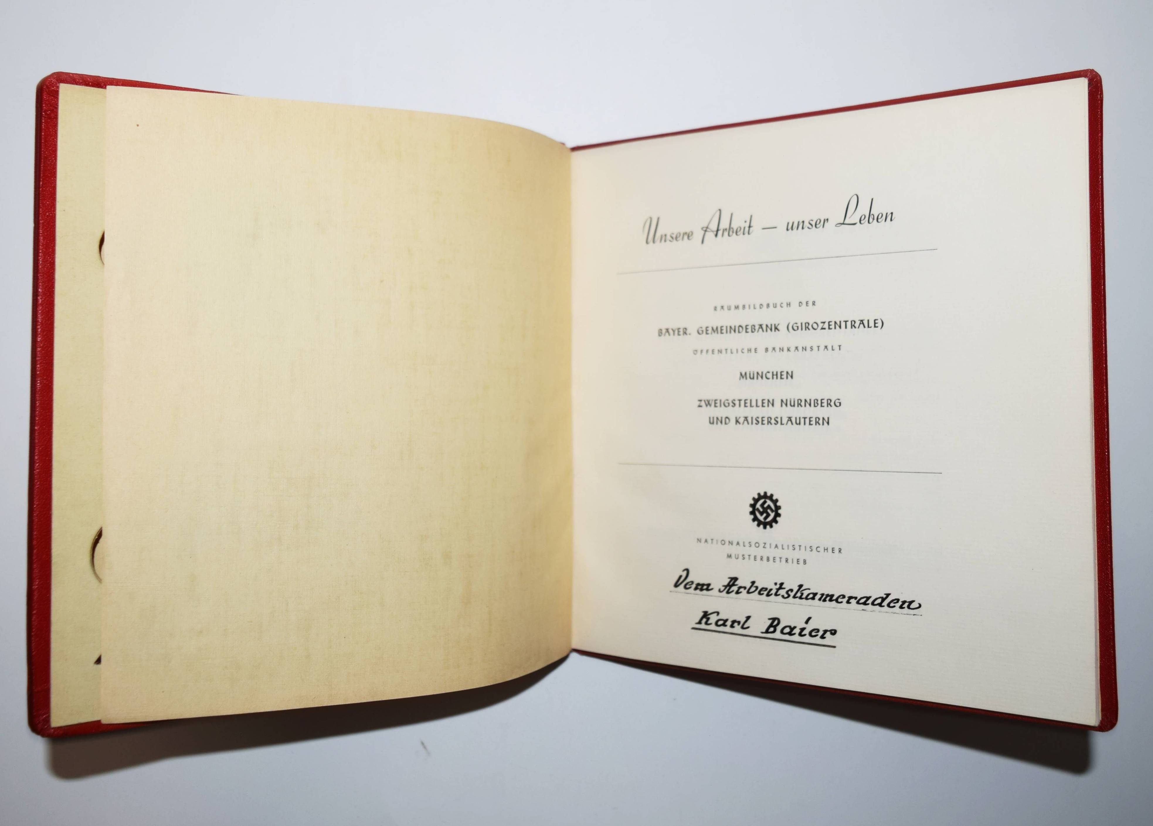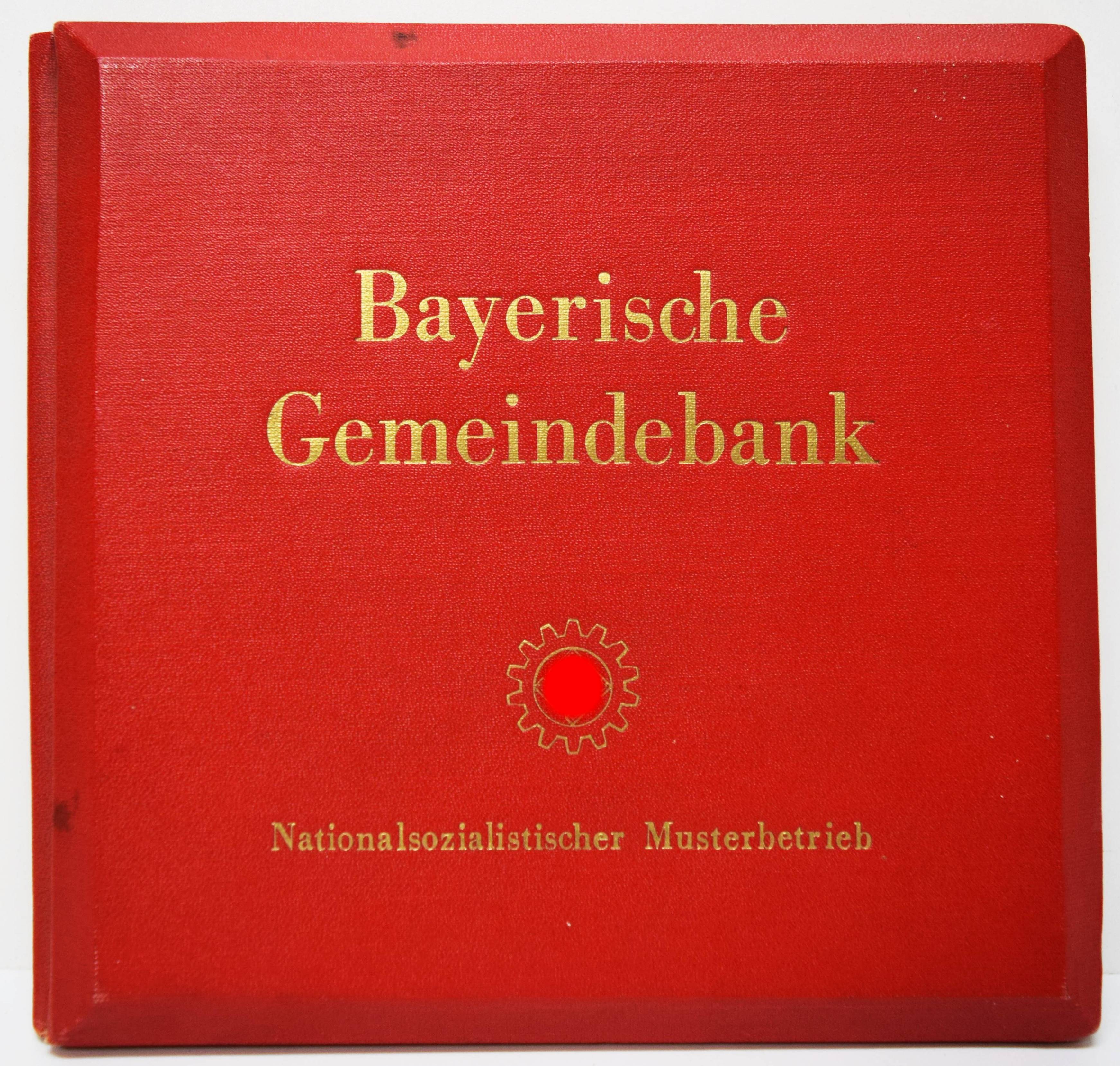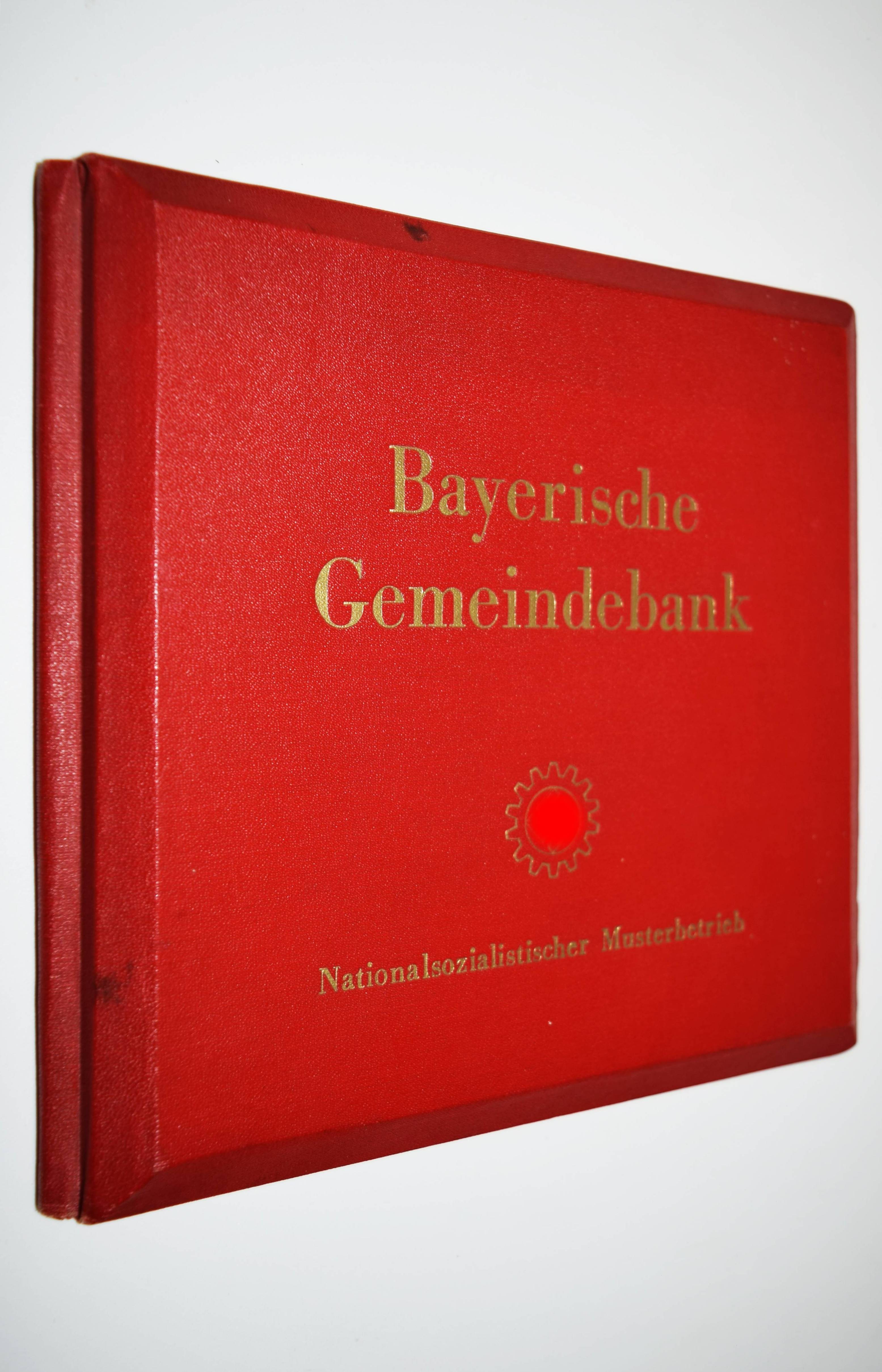 Stereo-Photographie – Bayerische Gemeindebank (Deckeltitel). Unsere Arbeit – unser Leben. Raumbildbuch der Bayer. Gemeindebank (Girozentrale) öffentliche Bankanstalt München, Zweigstellen Nürnberg und Kaiserslautern. Nationalsozialistischer Musterbetrieb. München, Raumbild-Verlag Otto Schönstein o. J. (ca. 1939). Quer-8° (19 x 20 cm.). 23, (1) S. mit 30 Stereo-Photographien und Stereo-Betrachter aus Metall. Orig.-Leinenband mit goldgepr. Deckeltitel. Vorsteher, Der Raumbildverlag Otto Schönstein. Magazin. Deutsches Historisches Museum. Heft 27, 2001, S. 53, 3.7. – Der siebte Band der Sonderausgaben der Raumbild-Verlags Otto Schönstein. Vermutlich nur in sehr kleiner Auflage erschienene Firmenfestschrift für Mitarbeiter. – „1914 gegründete Girozentrale der bayerischen Sparkassen, 1925 unter dem Namen Bayerische Gemeindebank verselbständigt. Die Gemeindebank wickelte den überörtlichen Giroverkehr ab und finanzierte kommunale Investitionsvorhaben. 1929 gründete sie auch eine Bausparkasse, die heutige LBS Bayern. 1972 fusionierte sie mit der Bayerischen Landesbodenkreditanstalt zur Bayerischen Landesbank“ (M. Wagner-Braun in Historisches Lexikon Bayerns). – Einband leicht angestaubt, handschr. Widmung auf dem Titelblatt, sehr gutes Exemplar.