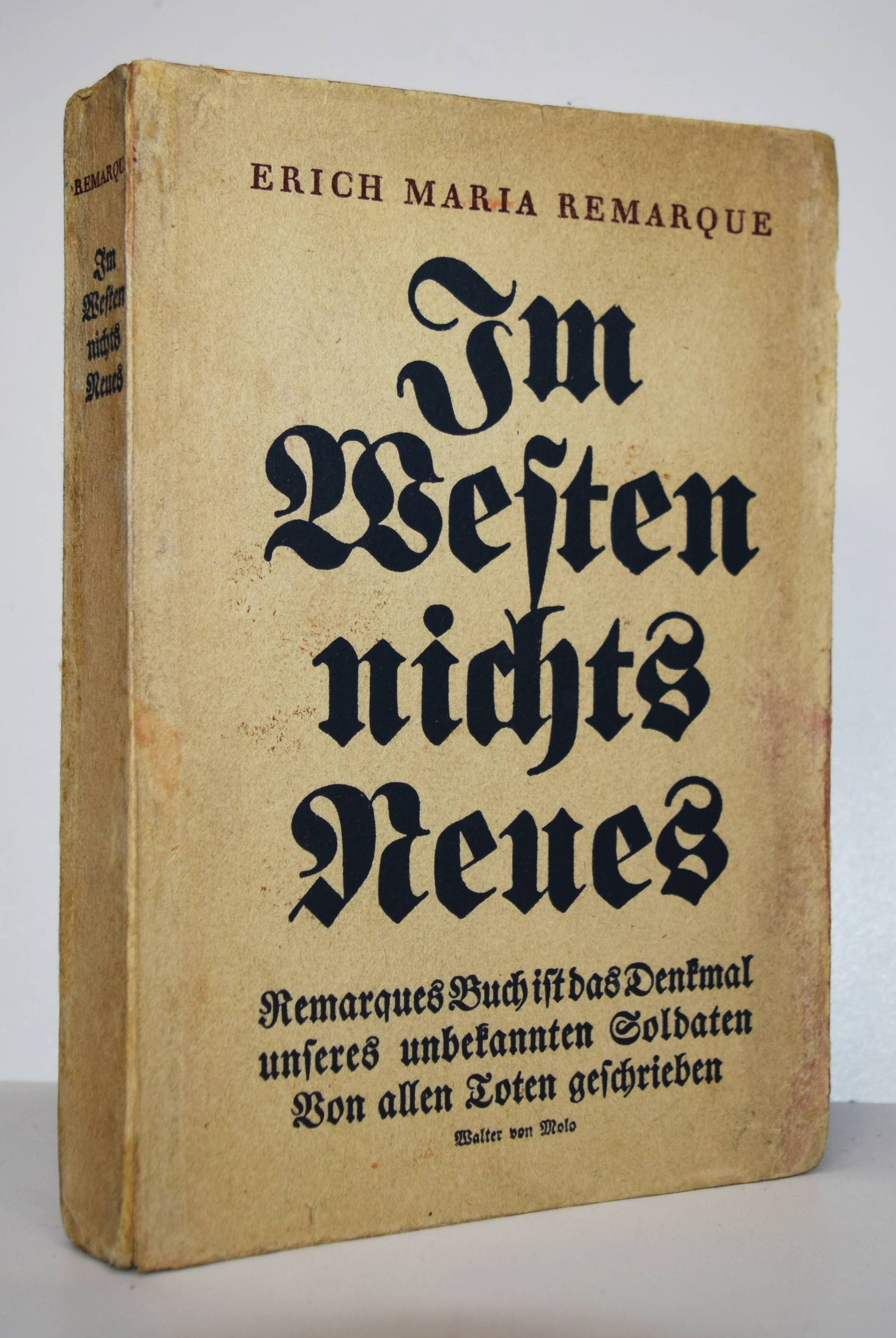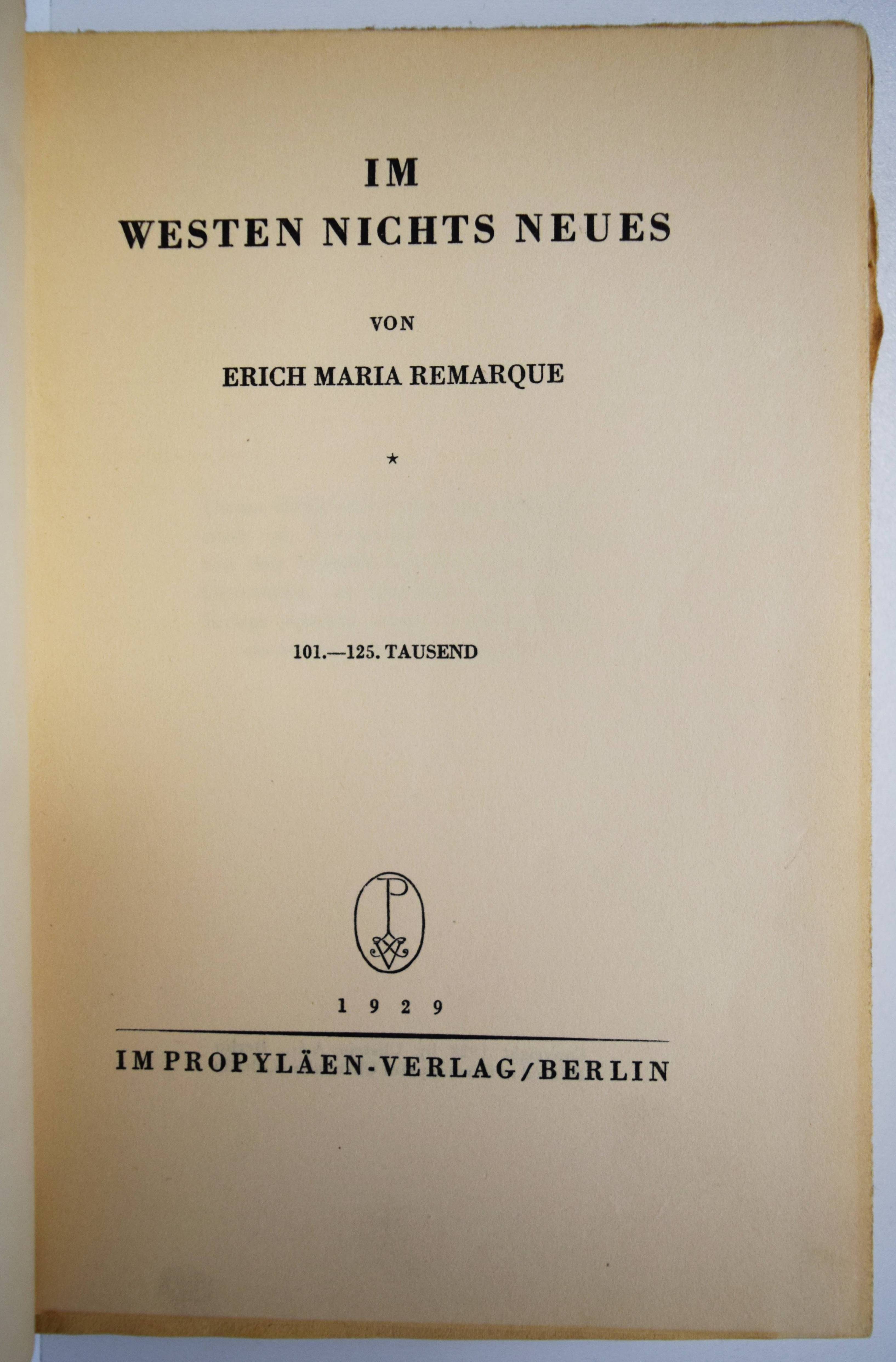 Remarque, Erich Maria. Im Westen nichts Neues. 101.– 125. Tausend. Berlin, Propyläen-Verlag 1929. 8°. 287, (1) S. Typogr. Orig.-Kartonumschlag. Frühe Auflage der seltenen kartonierten Ausgabe des berühmten Anti-Kriegsromans. – „Remarques Buch ist das Denkmal unseres unbekannten Soldaten. Von alllen Toten geschrieben“ (Walter von Molo, Umschlagtext). – Sehr gutes sauberes Exemplar.