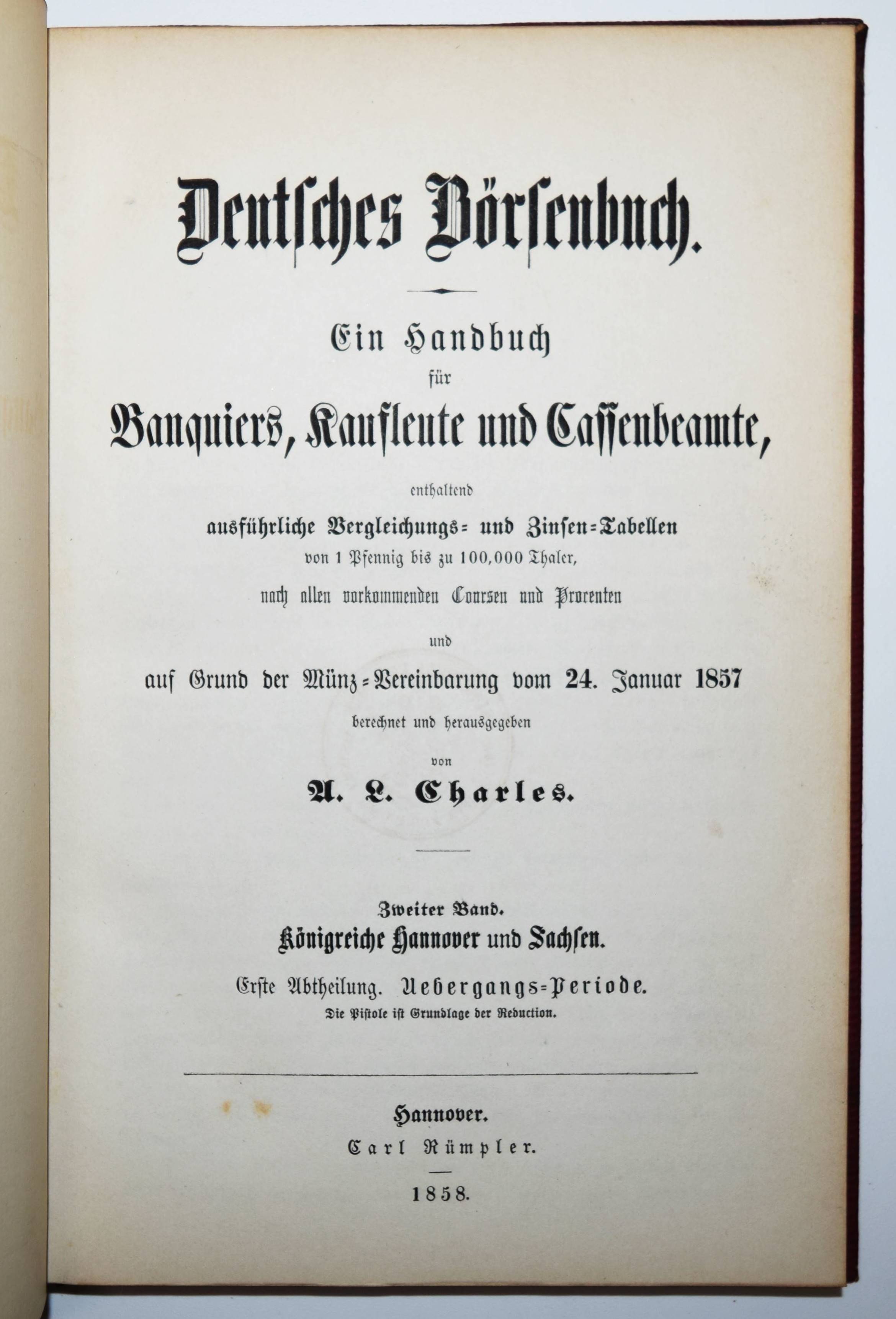 Charles, A. L. (Hrsg.). Deutsches Börsenbuch. Ein Handbuch für Banquiers, Kaufleute und Cassenbeamte enthaltend ausführliche Vergleichungs- und Zinsen-Tabellen… Auf Grund der Münz-Vereinbarung vom 24. Januar 1857 berechnet und herausgegeben. Erster Band. Königreich Preußen. (Und) Zweiter Band. Königreich Hannover und Sachsen. (Jeweils) Erste Abtheilung (mehr nicht erschienen). Uebergangs-Periode. 2 Bände. Hannover, Carl Rümpler 1858. Gr.-8°. XV, (1), 168 S.; XV, (1), 168 S. Weinrote Maroquin-Lederbände der Zeit mit Rückenvergoldung, goldgepr. Deckel-Wappen und Deckeltiteln, Deckel-Filetten und Goldschnitt (signiert: C(arl) Bergmüller, Königl. Bibliothekbuchbinder, Hannover). Sehr seltenes Tabellenwerk für Bankiers und Kaufleute. – Prachtvoll gebundenes Exemplar aus der Bibliothek von Ernst August, König von Hannover (1771-1851) mit Wappen-Stempel verso Titel.