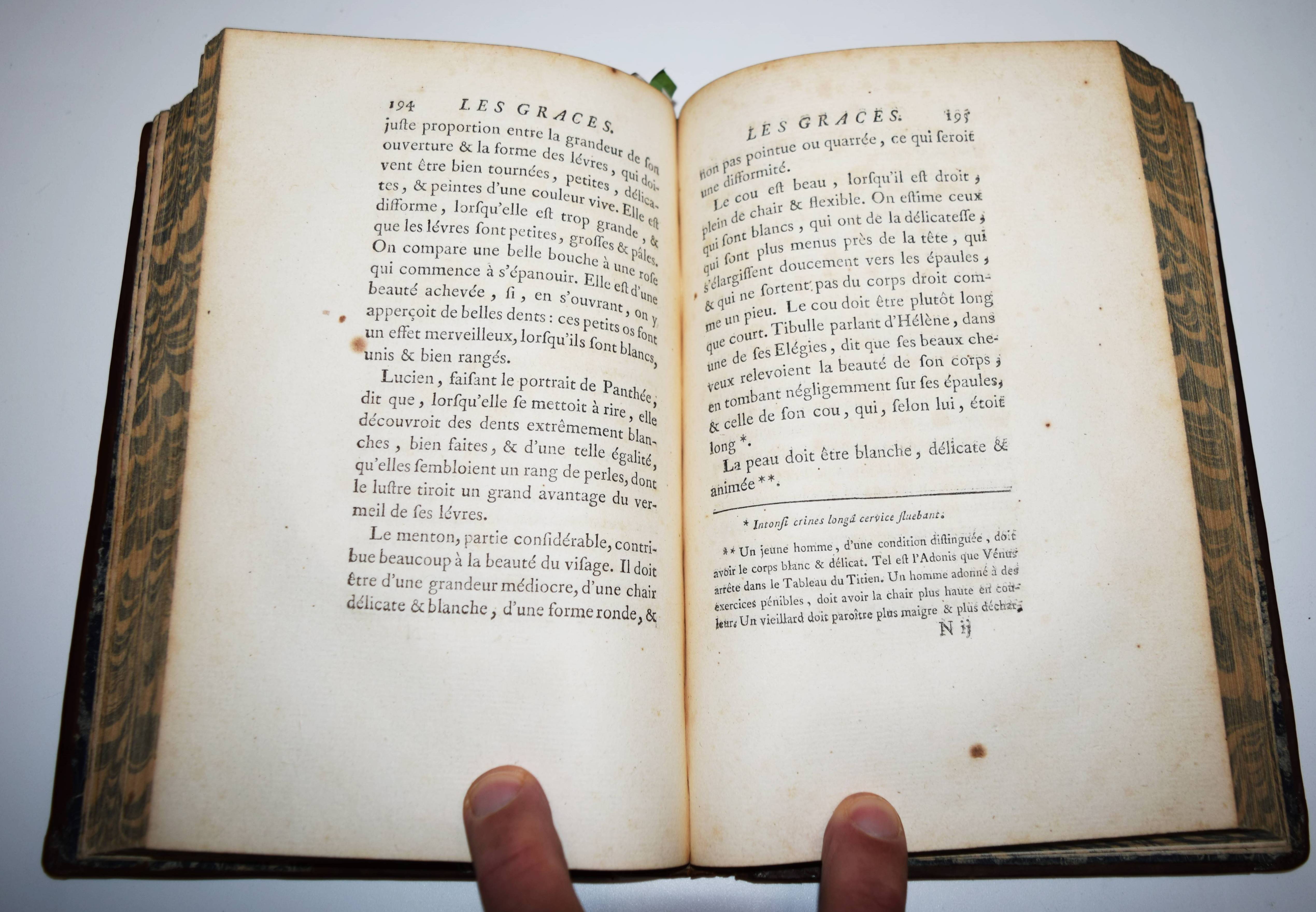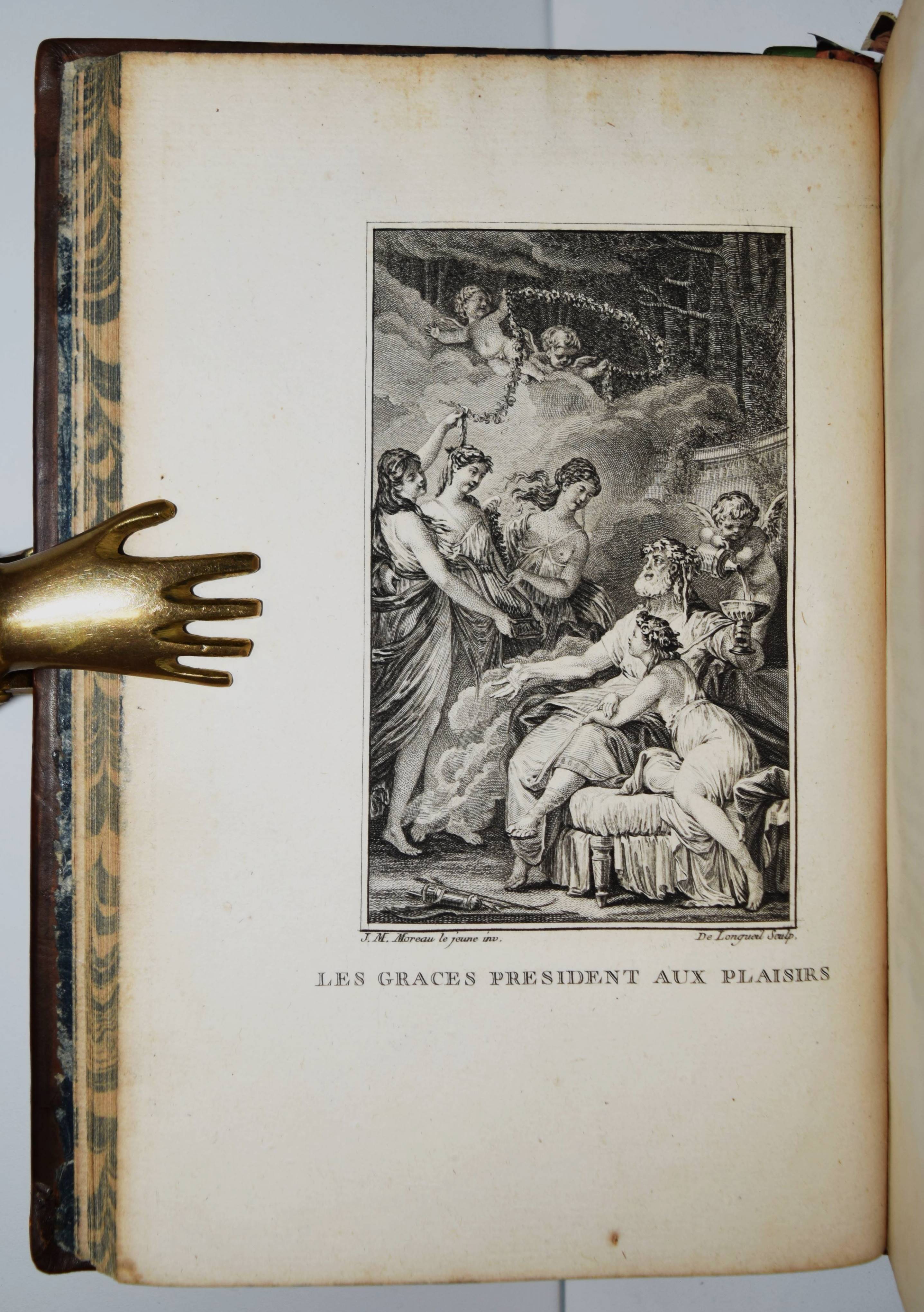 (Querlon, Anne Gabriel Meusnier de). Les Graces. Paris, Laurent Prault & Bailly 1769. 8° (21,5 x 14,5 cm.). VIII, 330 S., [3] Bl. mit gestoch. Titel von J. M. Moreau le jeune, gestoch. Frontispiz von J. B. Simonet nach F. Boucher und 5 Kupfertafeln von de Launey, de Longueil, Massard und Simonet nach Moreau. Marmorierter Kalbslederband der Zeit mit floraler Rückenvergoldung, Deckel-Filetten und marmoriertem Schnitt. Bocher 468. Cohen-Ricci II, 847. Slg. Fürstenberg 66 (mit Abb.). Gay-Lem. II, 417. Lewine S. 436. Sander 1623. – Erste Ausgabe dieser Sammlung mit Texten von Pindar, Ovid, Metastasio, Winckelmann u.a., beispielhaft für die galante Literatur des 18. Jahrhunderts. – Exemplar auf „grand papier d’Auvergne“. – „Charmant ouvrage galamment illustré…“ (Cohen-Ricci). – „(T)he illustrations are few, but their beauty and quality make up for their scanty number“ (Lewine). – Sehr schöne Illustrationsfolge von Moreau le jeune; mit zwei Kupfern in Découvertes-Zustand (S. 1 u. 86). „Im nächsten Jahre liefert der Meister die gesamte Illustration (mit Ausnahme von Bouchers Titelkupfer) zu Querlons „Les Graces“, 1769, darunter ein selbstgestochenes Titelblatt. Den eigenhändigen Kupferstichen Moreaus verlohnt es sich, in allen Fällen nachzuspüren, denn sie pflegen zum Reizvollsten in seinem Oeuvre zu gehören. Kein anderer hat es so gut verstanden wie er selbst, den Charme seiner Entwürfe auf die Kupferplatte zu bannen. Leider sind derartige Arbeiten nicht allzu zahlreich“ (Fürstenberg S. 108). – Gelenke fachgerecht restauriert, Kanten u. Ecken geringf. berieben, gutes nahezu fleckenfreies und breitrandiges Exemplar, in einem dekorativem zeitgenöss. Einband.