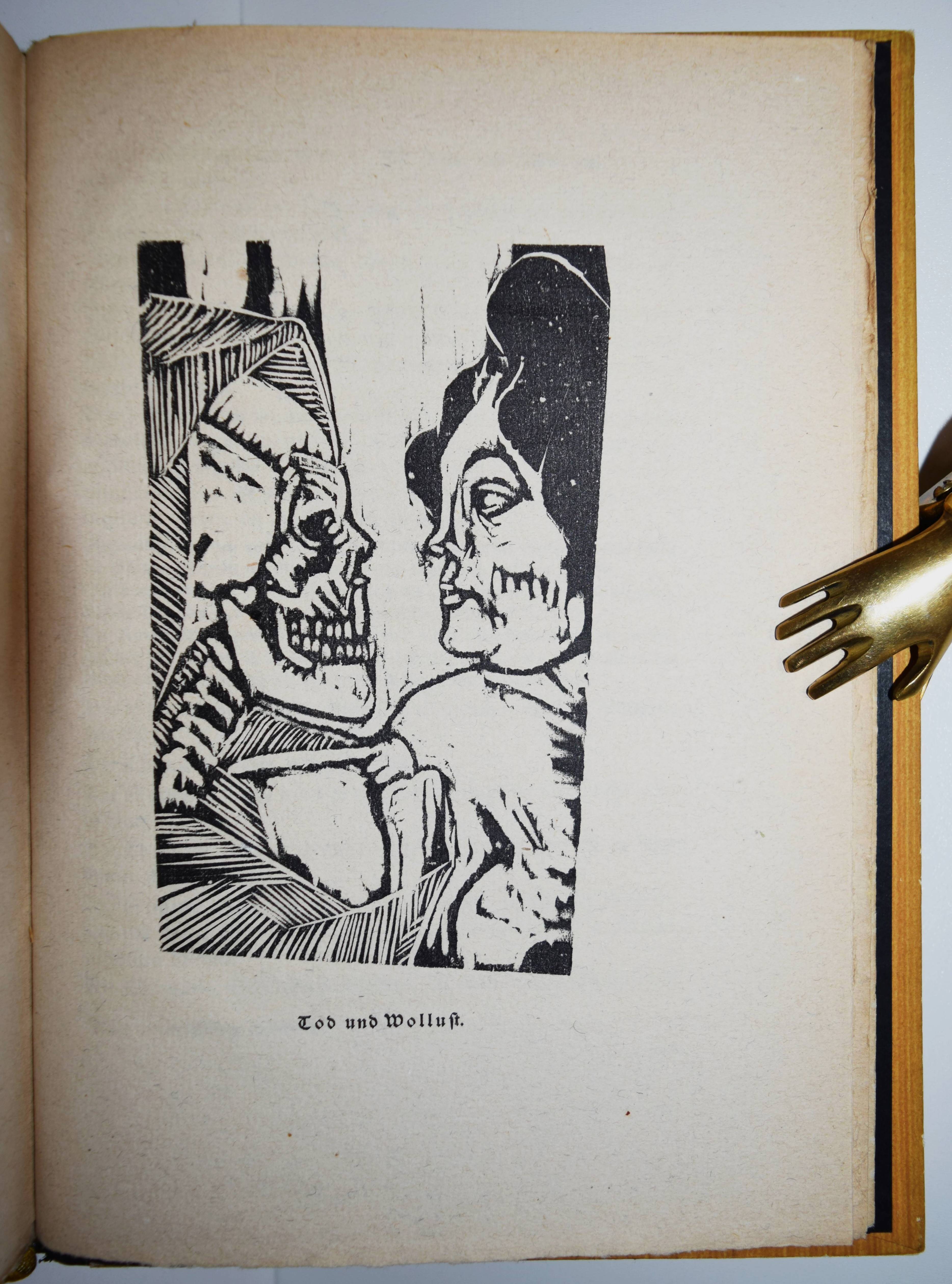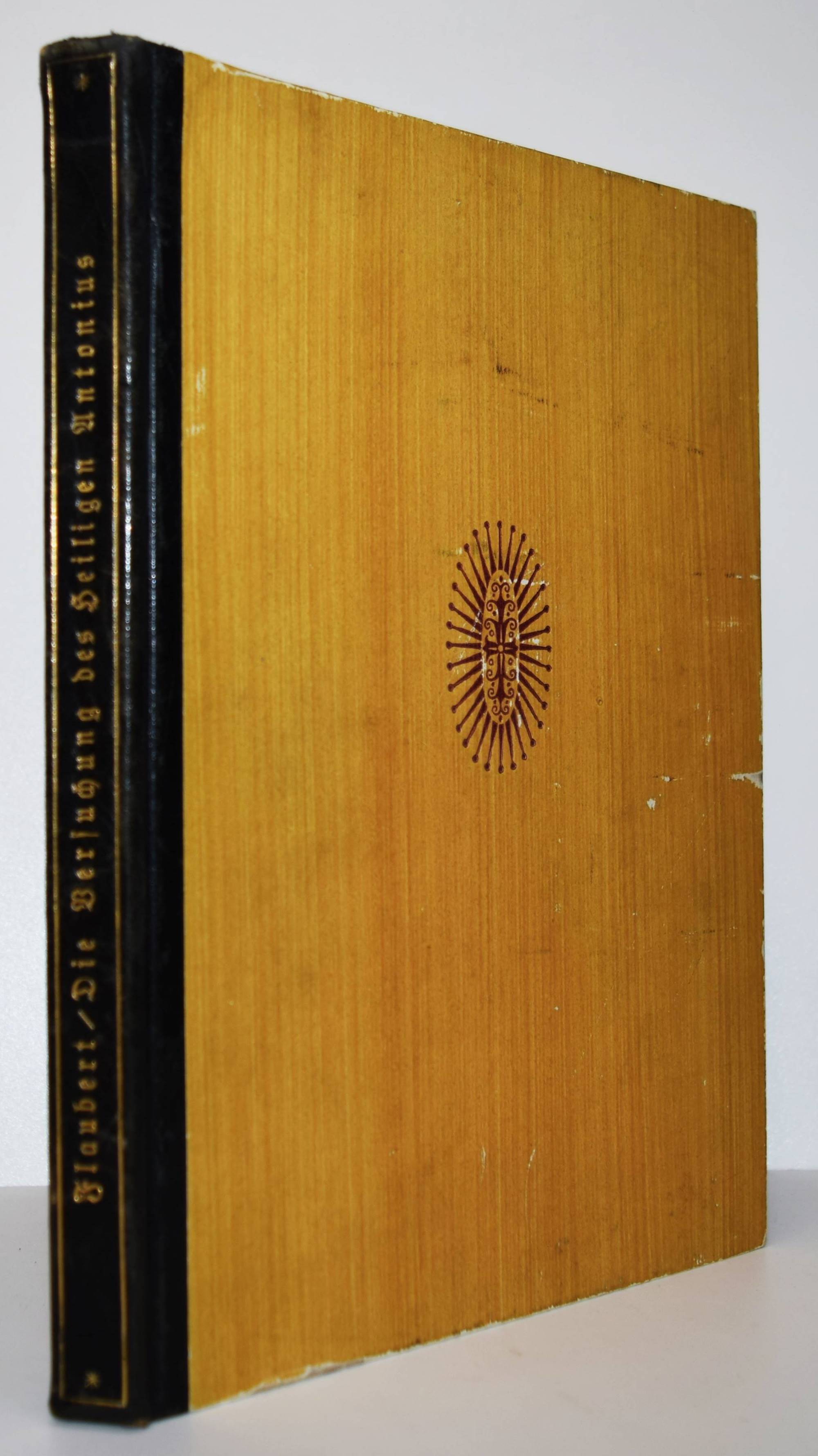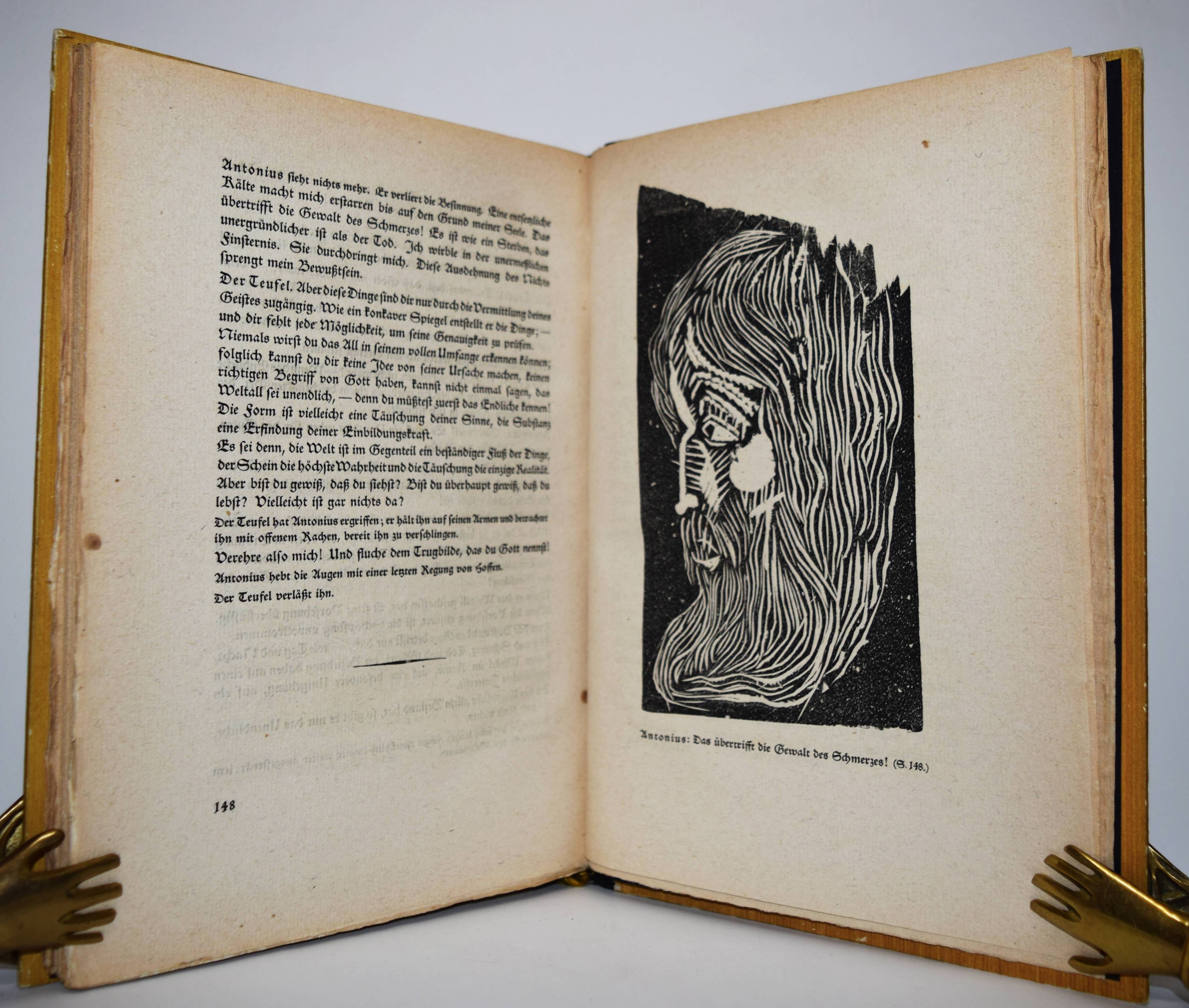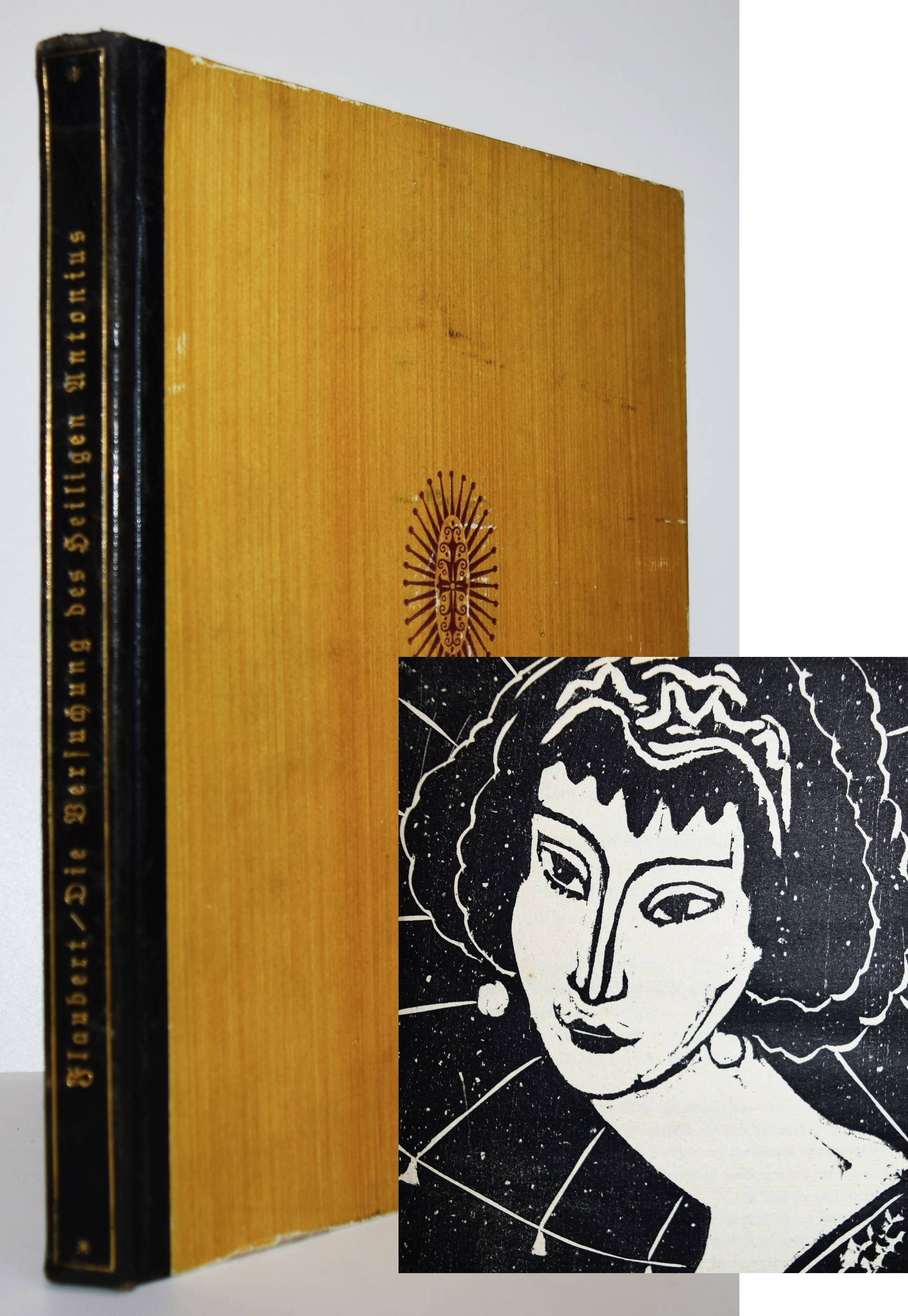 Flaubert, Gustave. Die Versuchung des Heiligen Antonius. Übersetzung und vierzehn Holzschnitte von Hermann Lismann. München, Berlin, Leipzig, Verlag für praktische Kunstwissenschaft F. Schmidt 1921. 4°. 170, [1] S. mit 14 Orig.-Holzschnitten. Orig.-Halblederband mit goldgepr. Rückentitel, Deckelvignette und Kopfgoldschnitt. Lang, Expressionismus 218. – Schöner bibliophiler Druck auf seitlich und unten unbeschnittenes Büttenpapier. – Der Expressionist H. Lismann (1878-1943) war Schüler von Franz Stuck in München und gehörte 1904 bis 1914 zum Kreis deutscher, dem Fauvismus nahestehender Künstler des Café du Dôme in Paris, so mit Rudolf Levy und Wilhelm Uhde. – Deckel etwas berieben, gutes Exemplar.
