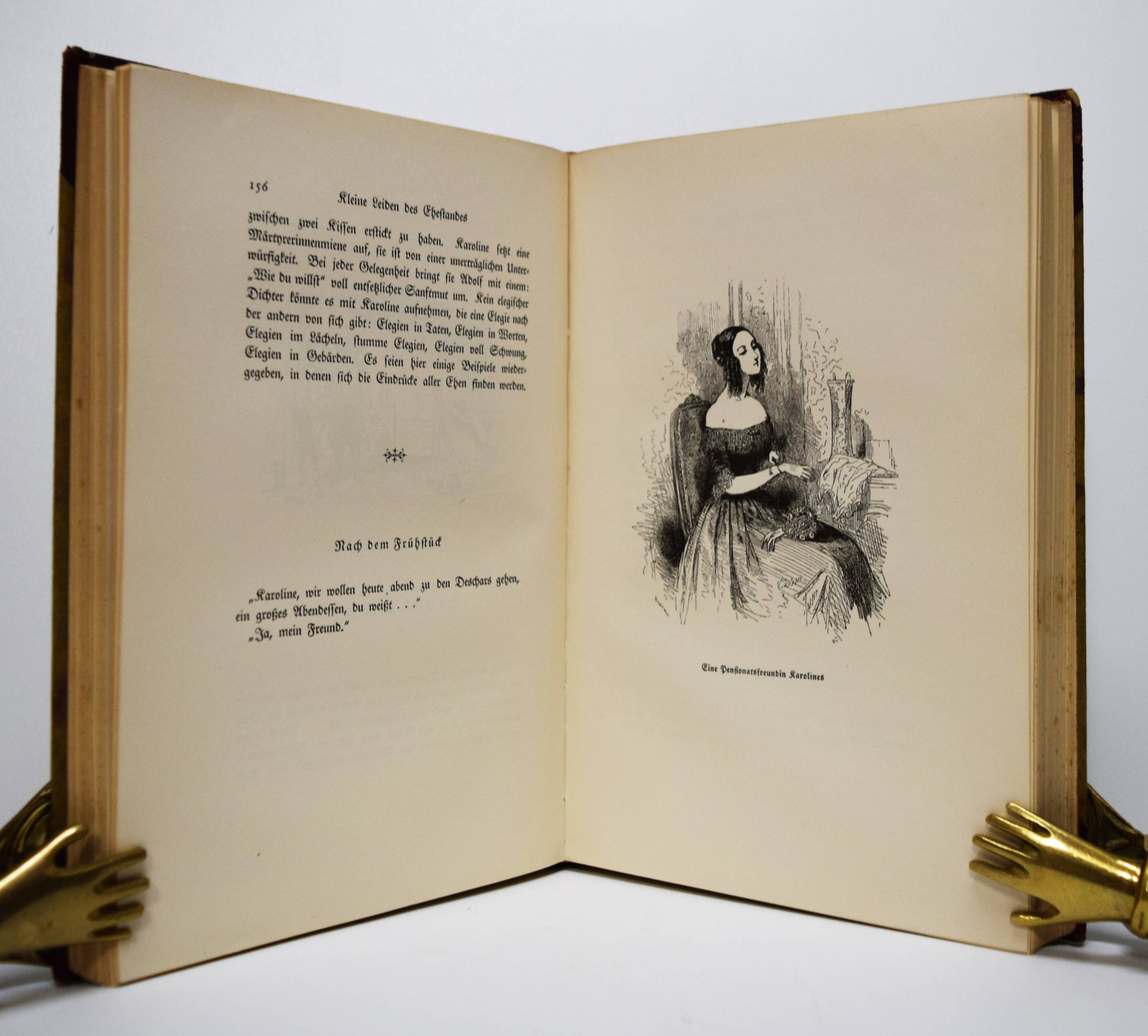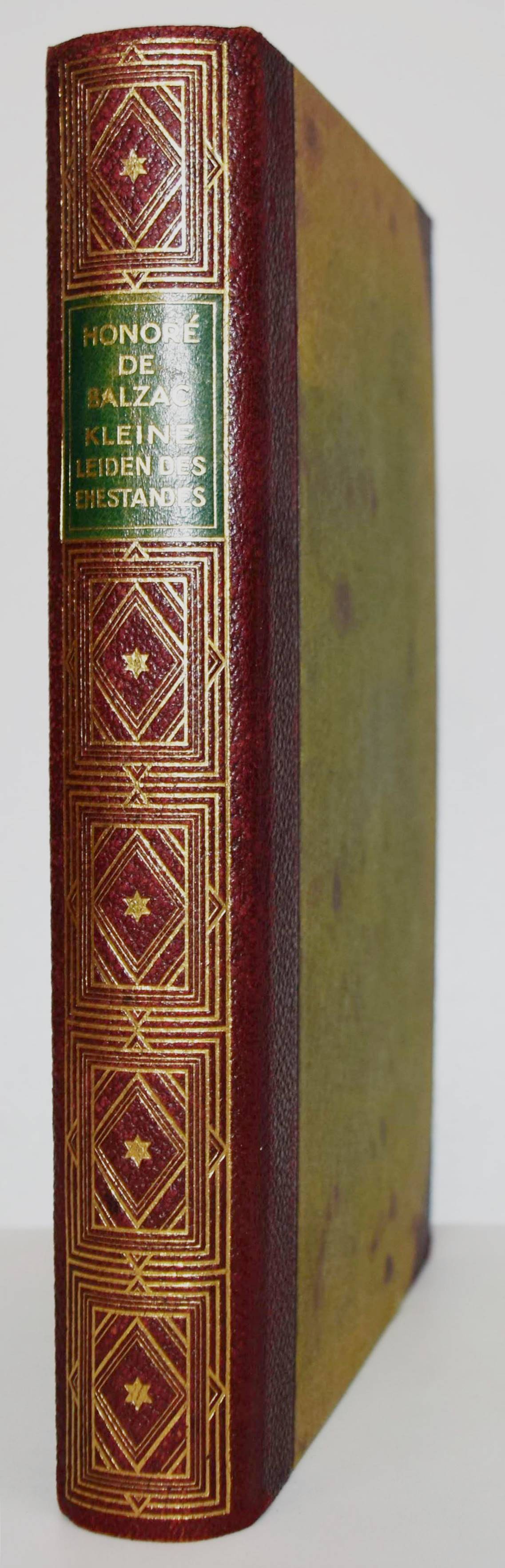 Balzac, H(onoré) de. Kleine Leiden des Ehestandes. Illustriert von Bertall (Charles Albert d’Arnoux). (Ins Deutsche übertragen von Camill Hoffmann). München, Hyperionverlag (1922). Gr.-8° (24 x 16,5 cm.). 385 S., [1] Bl. mit zahlr. Illustrationen nach Holzschnitten. Orig.-Halblederband mit goldgepr. Rückenschild, reicher Rückenvergoldung und Kopfgoldschnitt. Eines von 2150 Exemplaren. – Sehr gutes Exemplar.