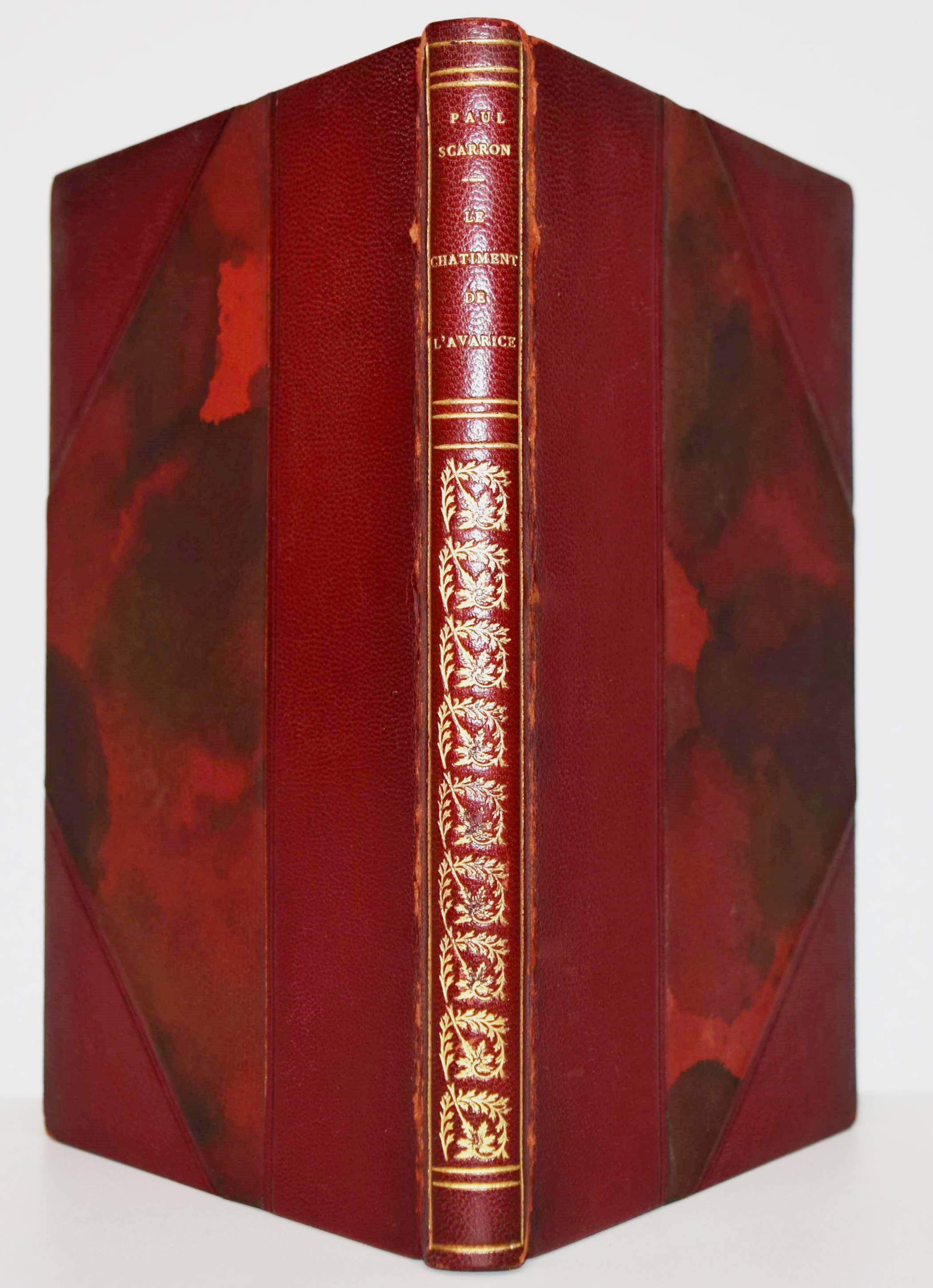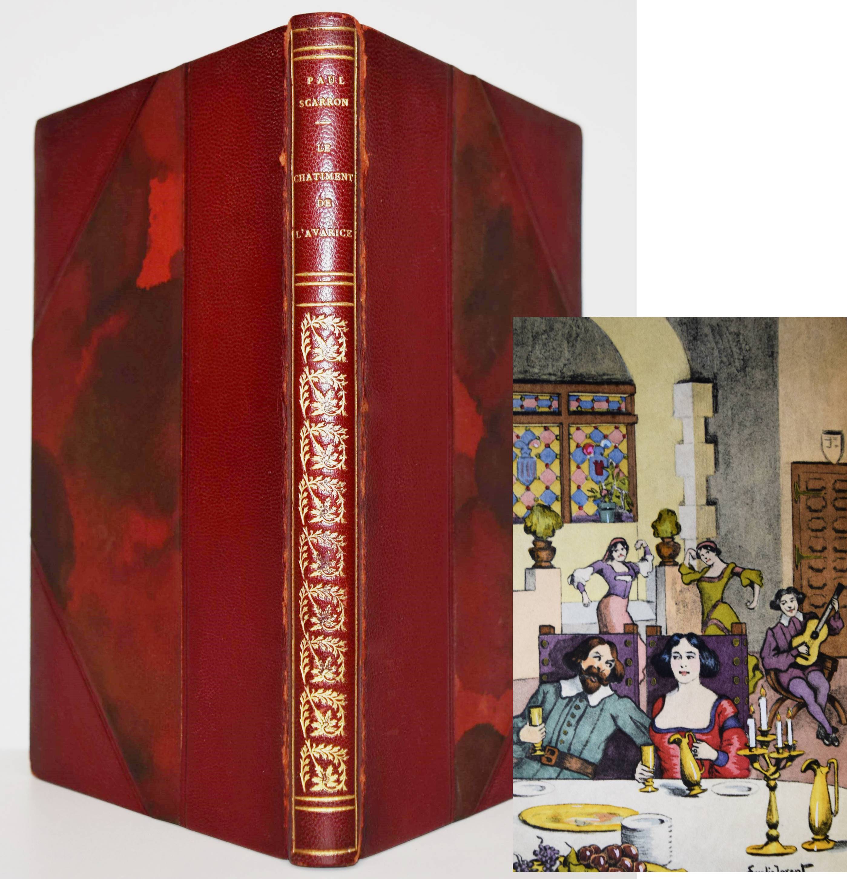 Scarron, Paul. Le Chatiment de l’Avarice. Paris, Maurice Glomeau 1913. 8°. VIII, 51 S., [1] Bl. mit farbigem Frontispiz von Emile Jovent, sowie zweitem Druck von Frontispiz und der Umschlag-Illustration in Schwarzweiß. Weinroter Halblederband der Zeit mit goldgepr. Rückentitel, reicher Rückenvergoldung und Kopfgoldschnitt (farbig illustr. Orig.-Umschlag beigebunden). Eines von 50 num. Exemplaren auf Japan (Gesamtauflage 300 Exemplare) mit Doppel-Suite des Frontispiz und der Umschlag-Illustration. – „Il n’y a pas longtemps qu’un jeune garçon aussi ambitieux que pauvre, et se piquant encore plus d’être cru Gentilhomme que d’être estimé animal raisonnable, sortit des montagnes de Navarre et vint avec son père chercher dans Madrid ce qui ne se rencontrait pas dans son pays, je veux dire des bienfaits de Fortune…“ (S. 1). – Gelenke etwas berieben, sehr schönes Exemplar in einem prachtvollen Handeinband.