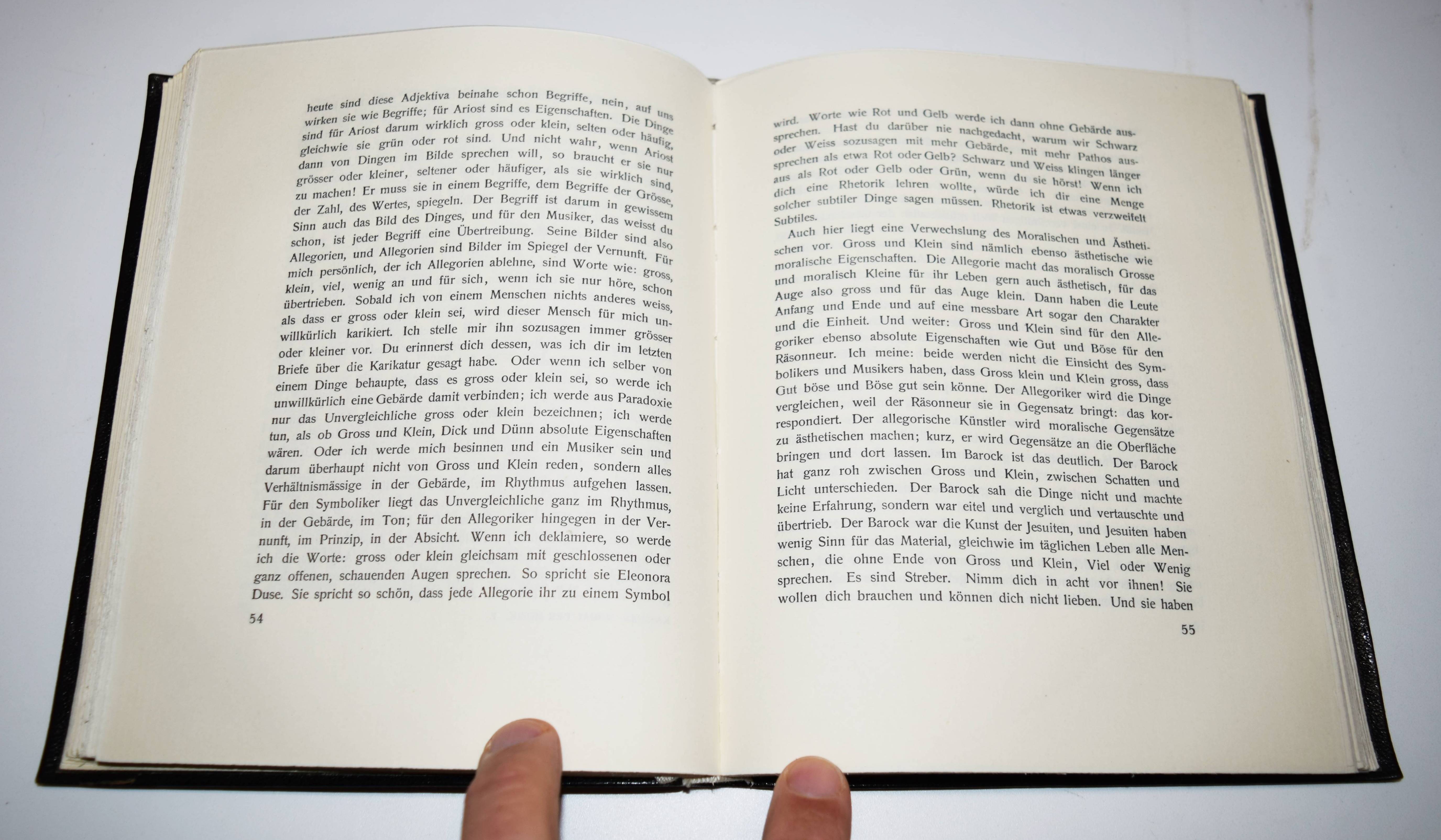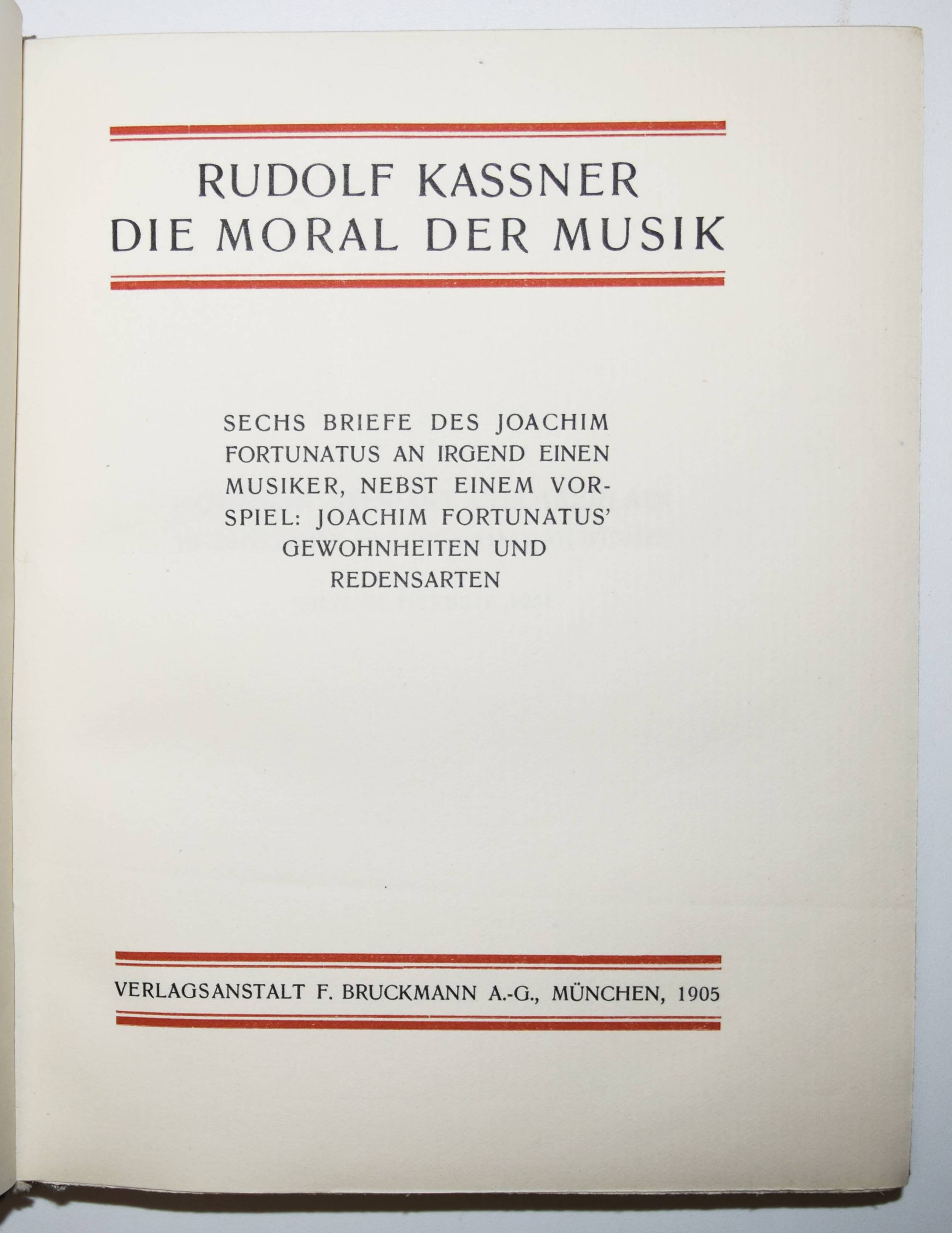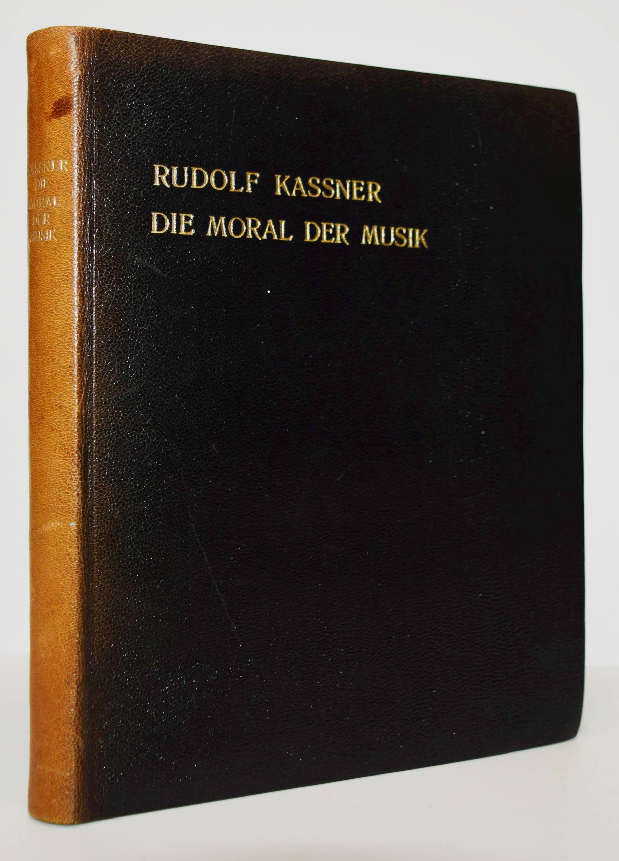 Kassner, Rudolf. Die Moral der Musik. Sechs Briefe des Joachim Fortunatus an irgendeinen Musiker, nebst einem Vorspiel: Joachim Fortunatus’ Gewohnheiten und Redensarten. München, F. Bruckmann 1905. 8°. XLIV, 210 S. Flexibler Orig.-Lederband mit goldgepr. Rücken- und Deckeltitel und Kopfgoldschnitt. W.-G.² 8. – Seltene erste Ausgabe „… eines seiner ersten Meisterwerke, das von der Helligkeit seiner dichterischen Natur erfüllt ist, von der warmen Strahlung, die dem glücklichen Kräftespiel seines Wesens entströmt.“ (S. Lesniak, Rudolf Kassner als „Kulturschriftsteller“, Gadansk 2003). – „Houston Stewart Chamberlain in dankbarer Freundschaft gewidmet…“ – Rücken wie meist aufgehellt, gutes Exemplar.