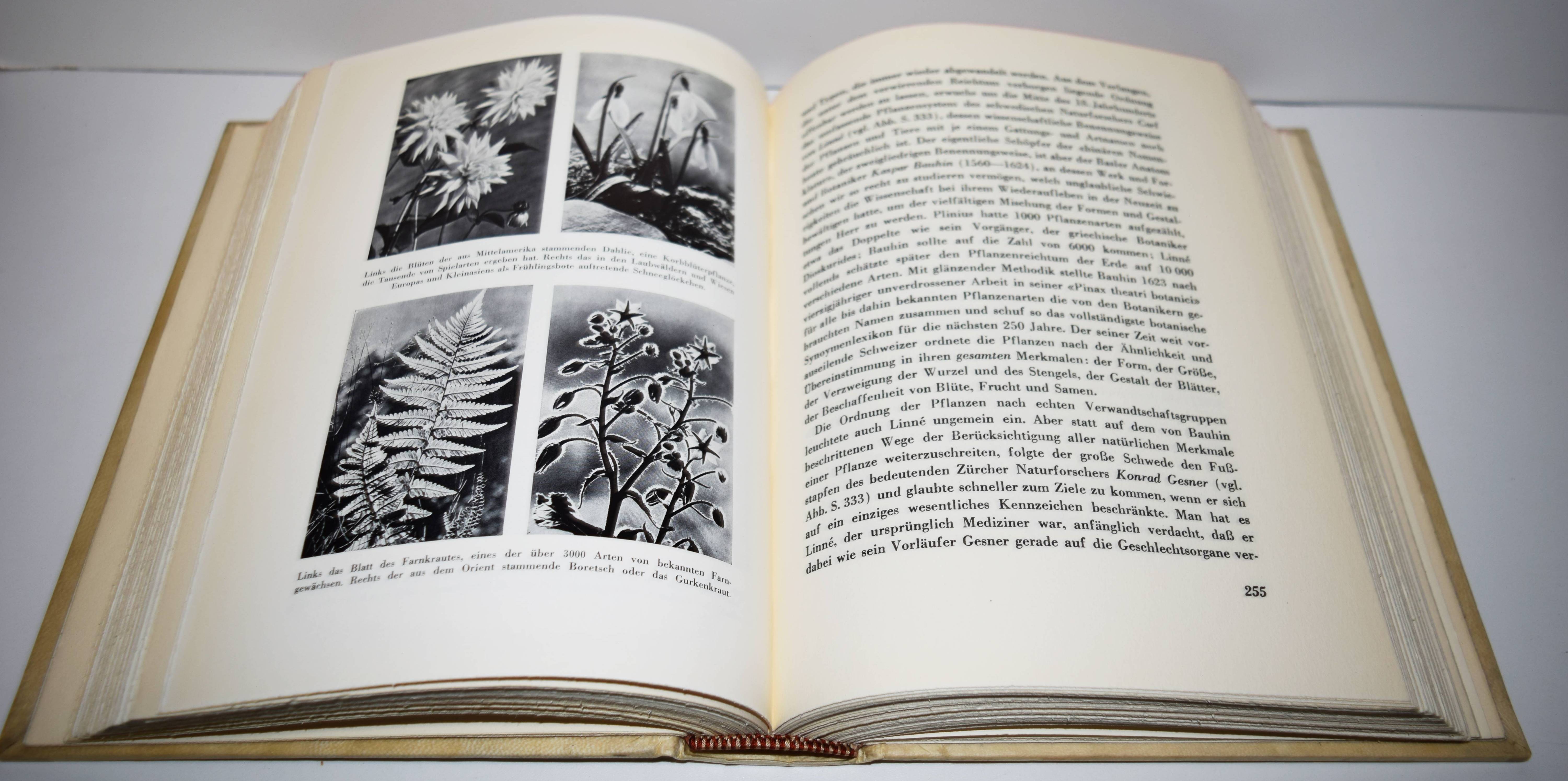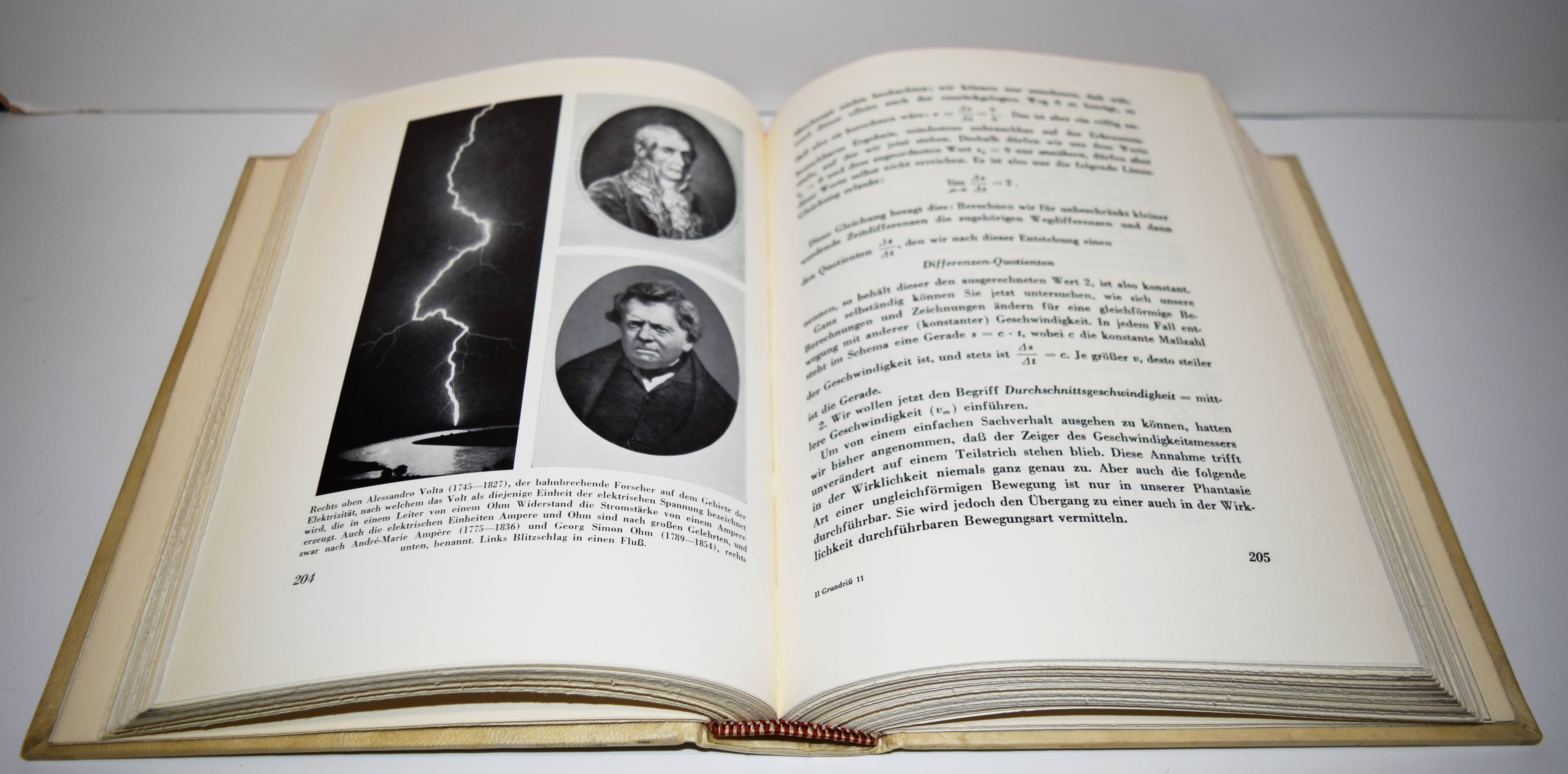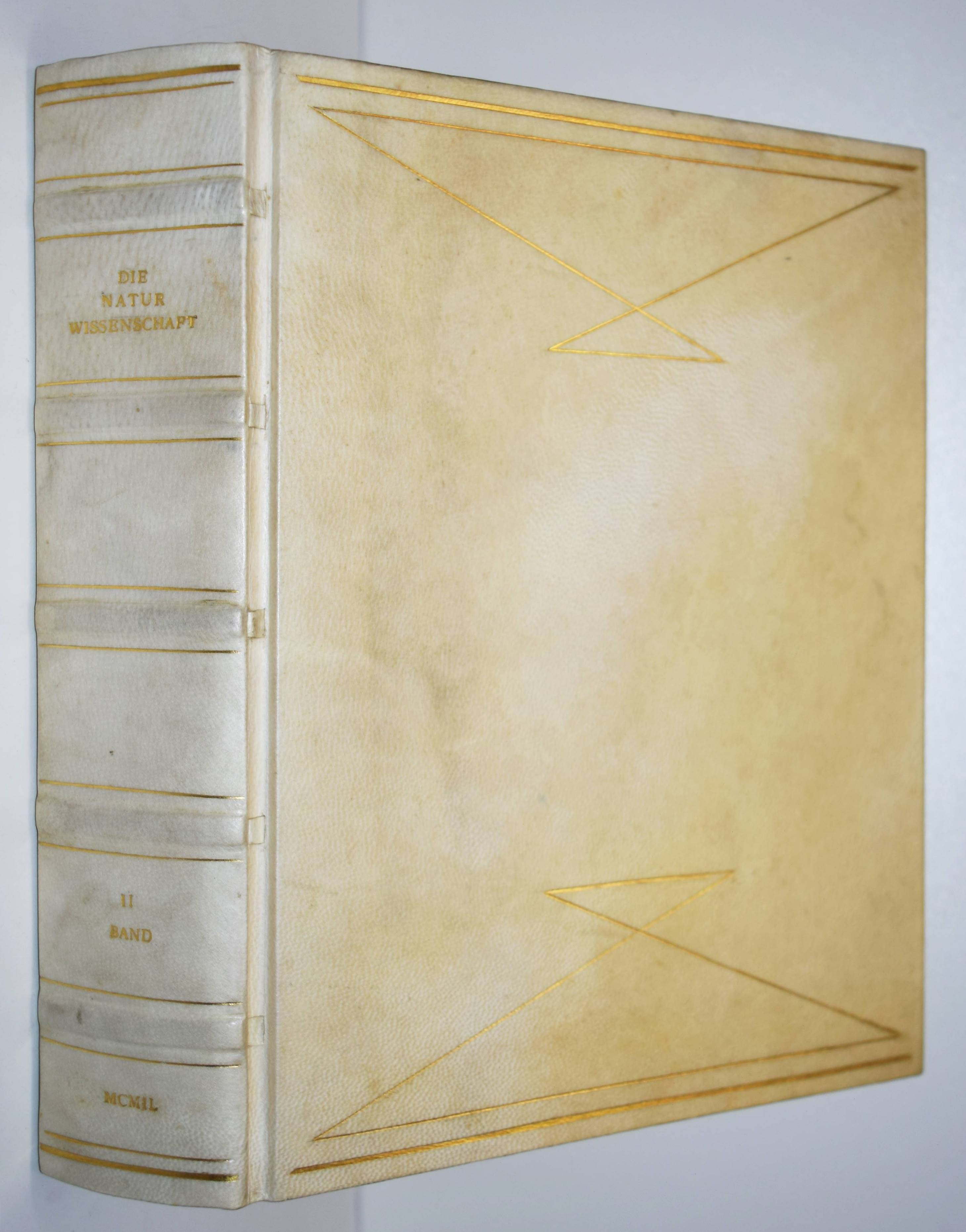 Bradish, J. A. v., Hermann Leicht und Otto Springer (Hrsg.). Grundriss der allgemeinen Bildung. Zweiter Band (von 2). Die Naturwissenschaften. Fachbearbeiter der deutschsprachigen Ausgabe: Hermann Baumhauer, Gaston Borel, Knut Eckener u. a. 3. Auflage. 7 Teile in 1 Band. Bern, London, Universitäts Verl.– und Vertriebs-Gesellschaft und Zürich, Emil Frei (1949). Gr.-8° (24,5 x 19 cm.). 528 S. mit zahlr., teils farb. Abbildungen im Text und auf Tafeln. Pergamenteinband der Zeit mit goldgepr. Rückentitel, Linienvergoldung auf dem Rücken und den Deckeln und Kopfgoldschnitt. Inhalt: I. Das Universum. – II. Von der Himmelskunde zur Atomphysik. – III. Wege zur Mathematik. – IV. Das Reich des Organischen. – V. Vom Wesen des Menschen. – VI. Das Wirtschaftsleben und seine Entfaltung. – VII. Die Technik des Maschinenzeitalters. – Außergewöhnliches Exemplar in einem kostbaren Hand-Einband.