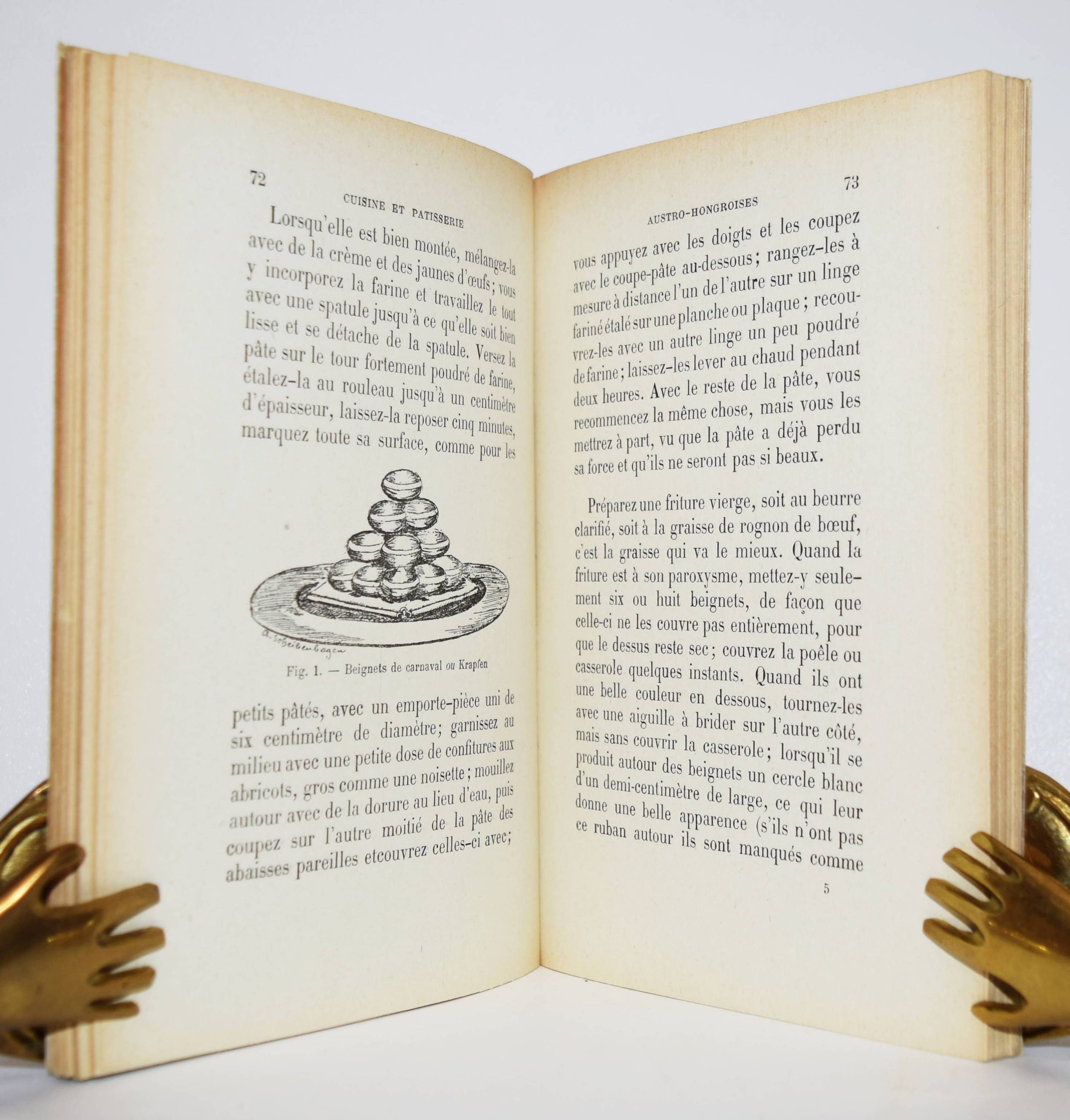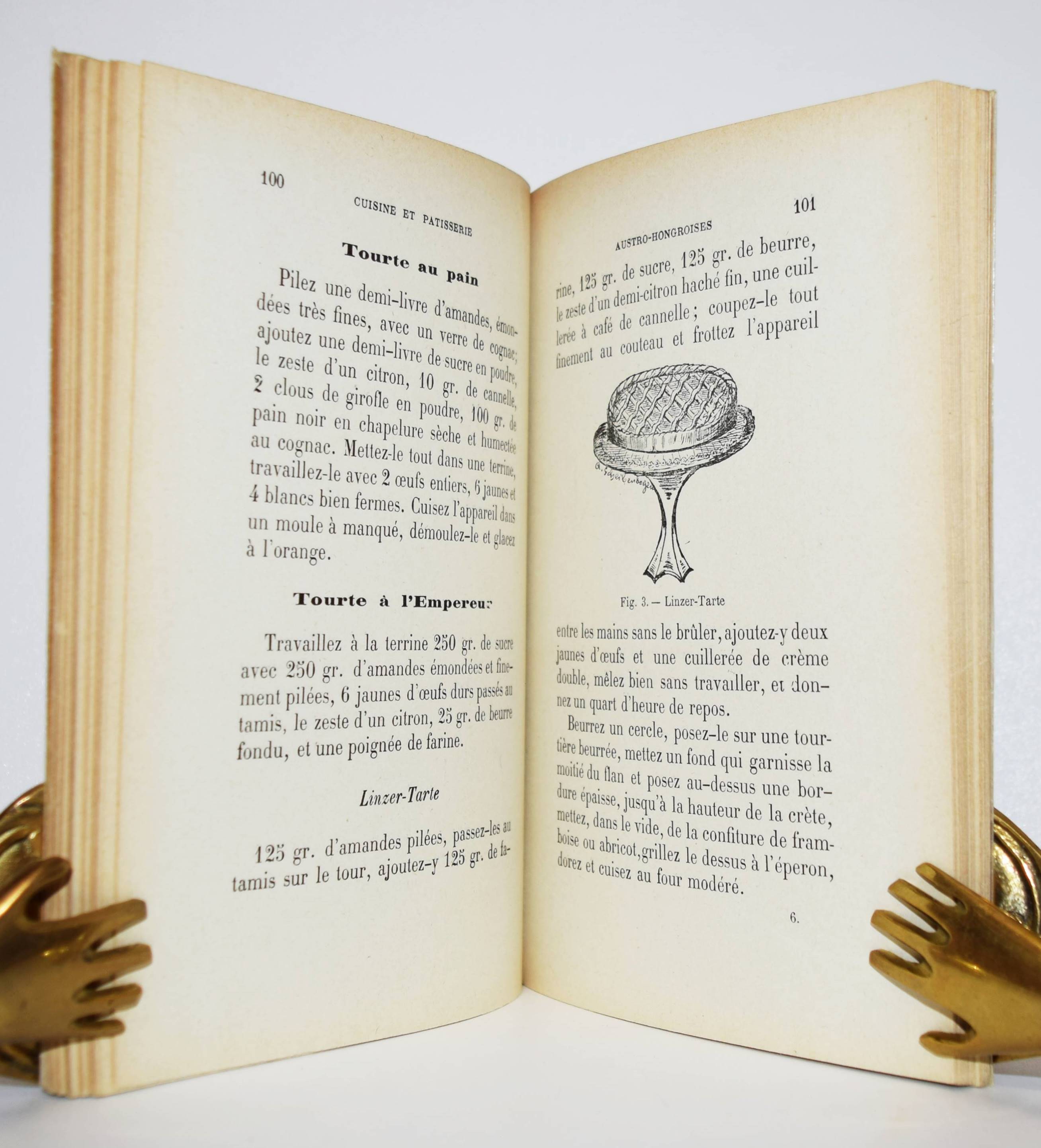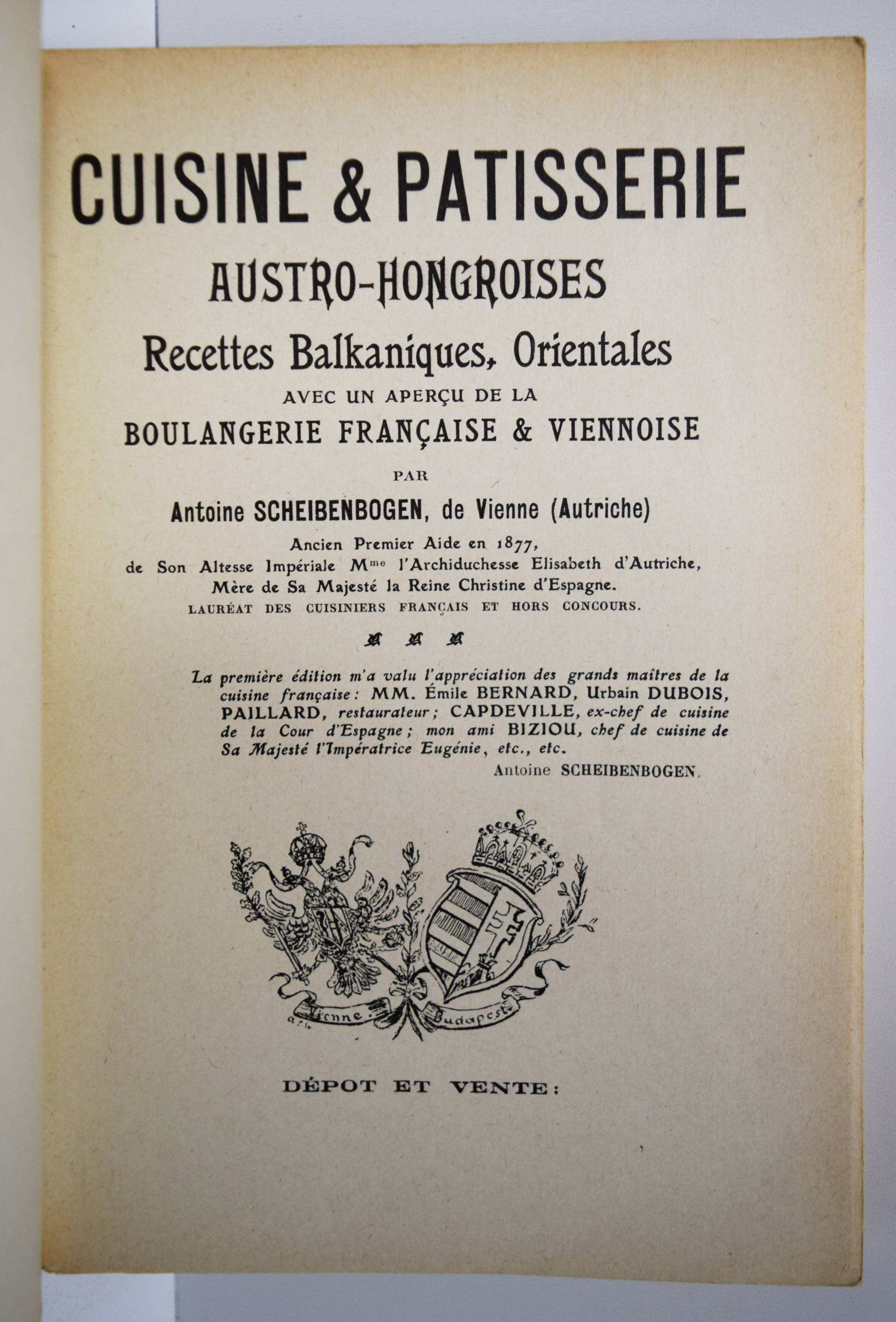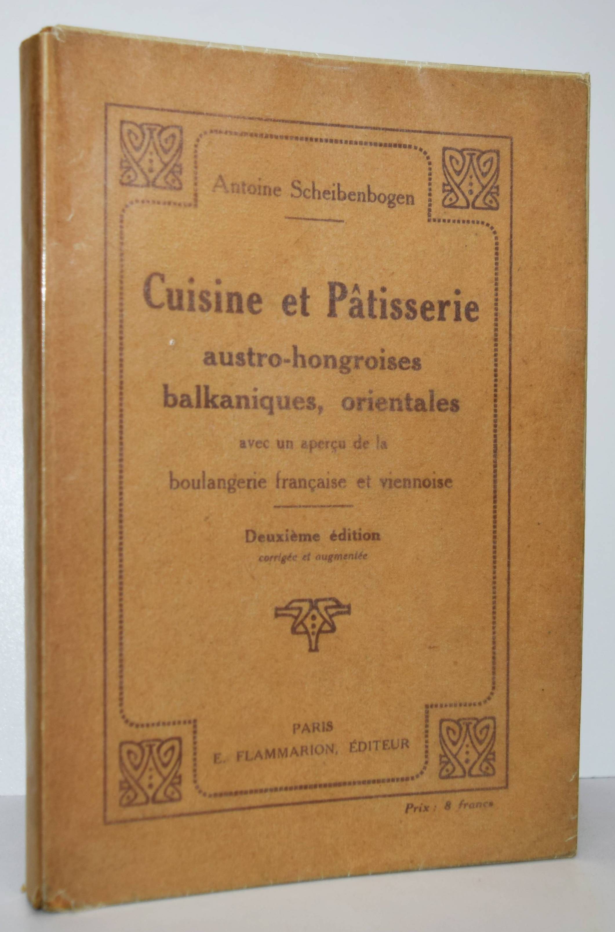 Scheibenbogen, Antoine. Cuisine et Pâtisserie austro-hongroises, balkaniques, orientales avec un aperçu de la boulangerie française et viennoise. Deuxième édition corrigée et augmentée. Paris, E. Flammarion (1928). Kl.-8° (18 x 12 cm.). 167 S. mit 14 Illustrationen im Text. Typogr. Orig.-Broschur. „…par Antoine Scheibenbogen, de Vienne (Auriche) ancien premier aide en 1877, de son Altesse Impériale Mme l’Archiduchesse Elisabeth d’Autriche, Mère de Sa Majesté la Reine Christine d’Espagne. Lauréat des cuisiniers français et hors concours“.″La première édition m’a valu l’appréciation des grands maîtres de la cuisine française: MM. Émile Bernard, Urbain Dubois, Paillard, restaurateur; Capdeville, ex-chef de cuisine de la Cour d’Espagne; mon ami Biziou, chef de cuisine de Sa Majesté l’Impératrice Eugénie, etc. etc.“. – Sehr gutes Exemplar.