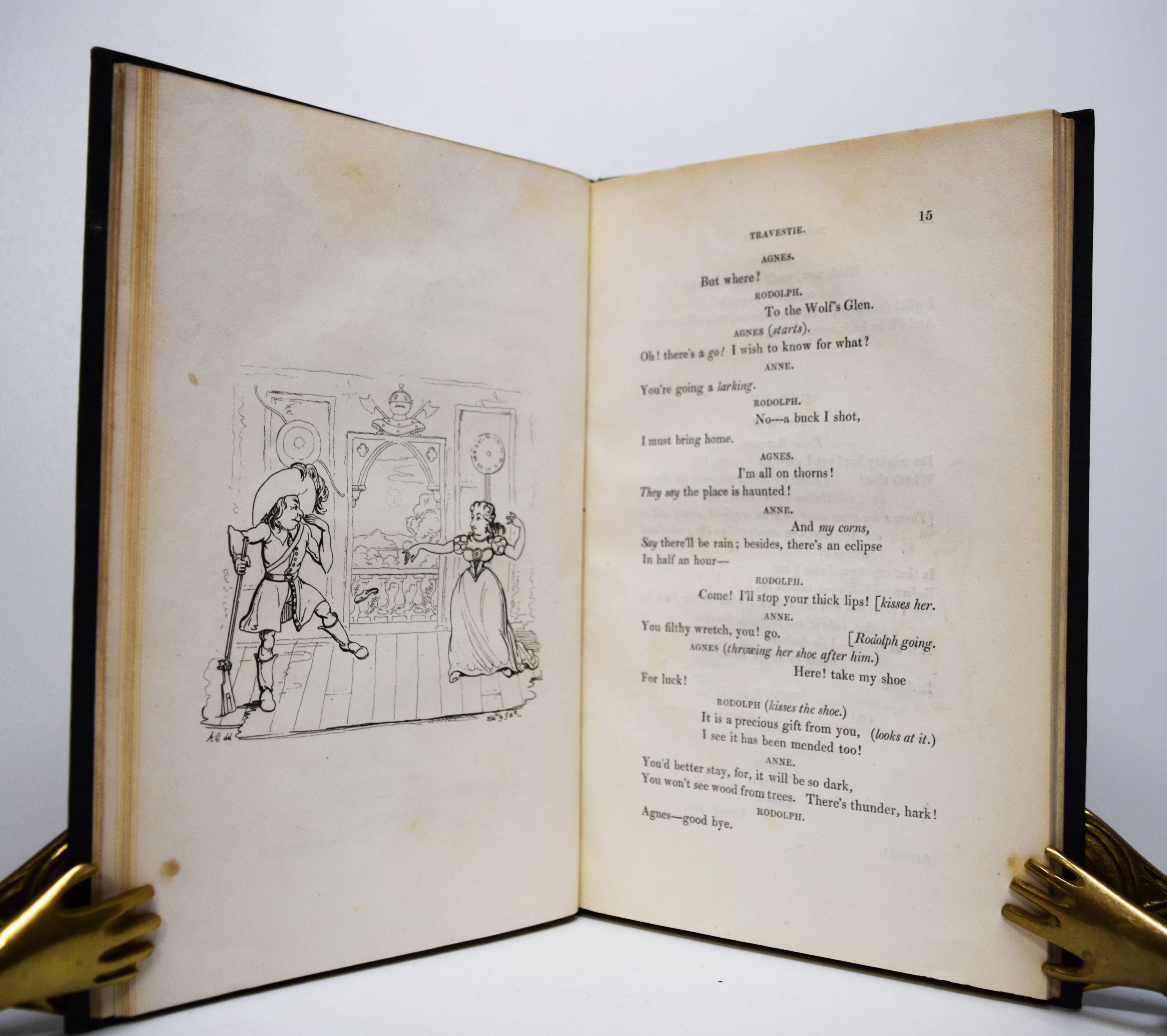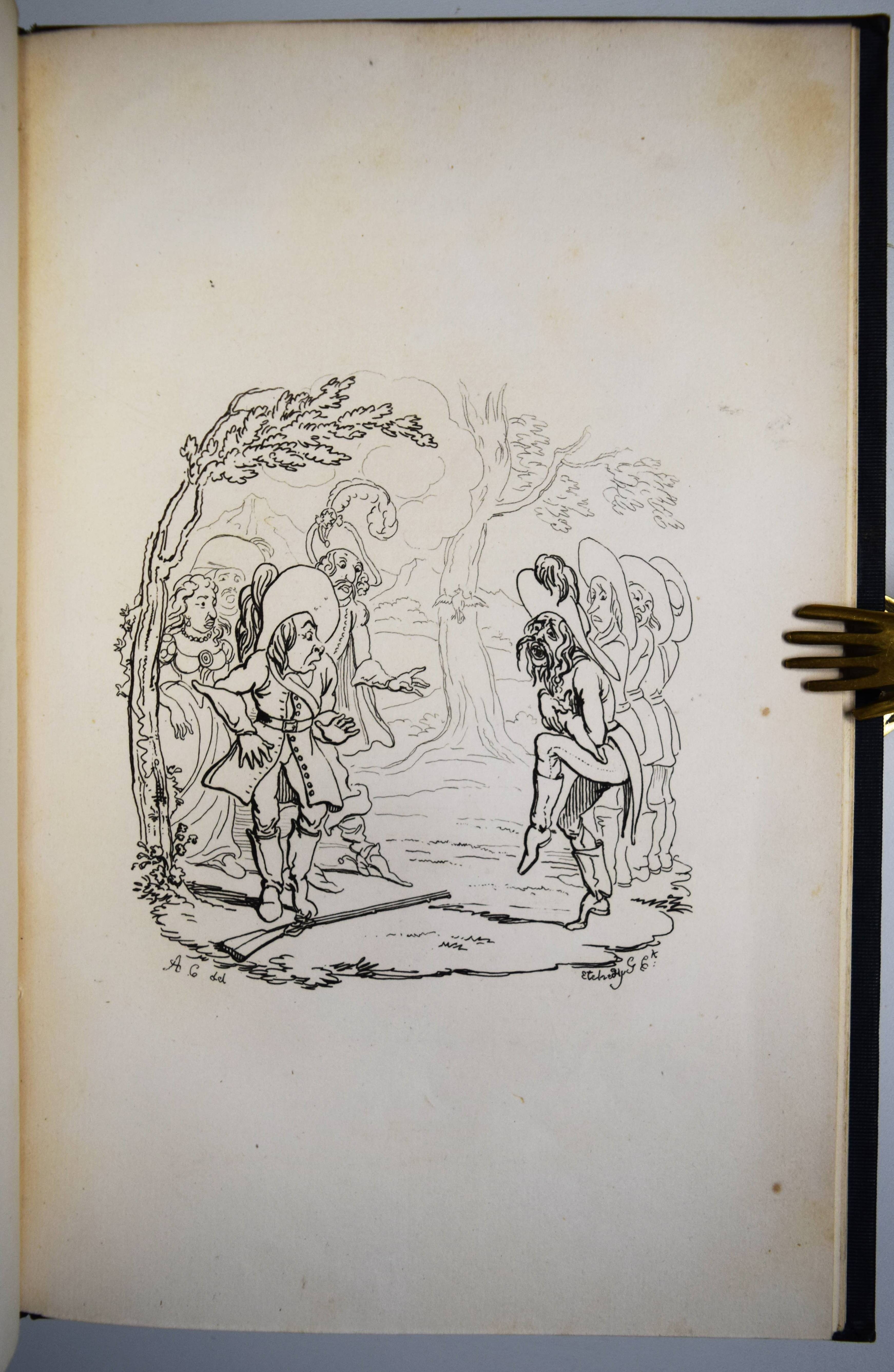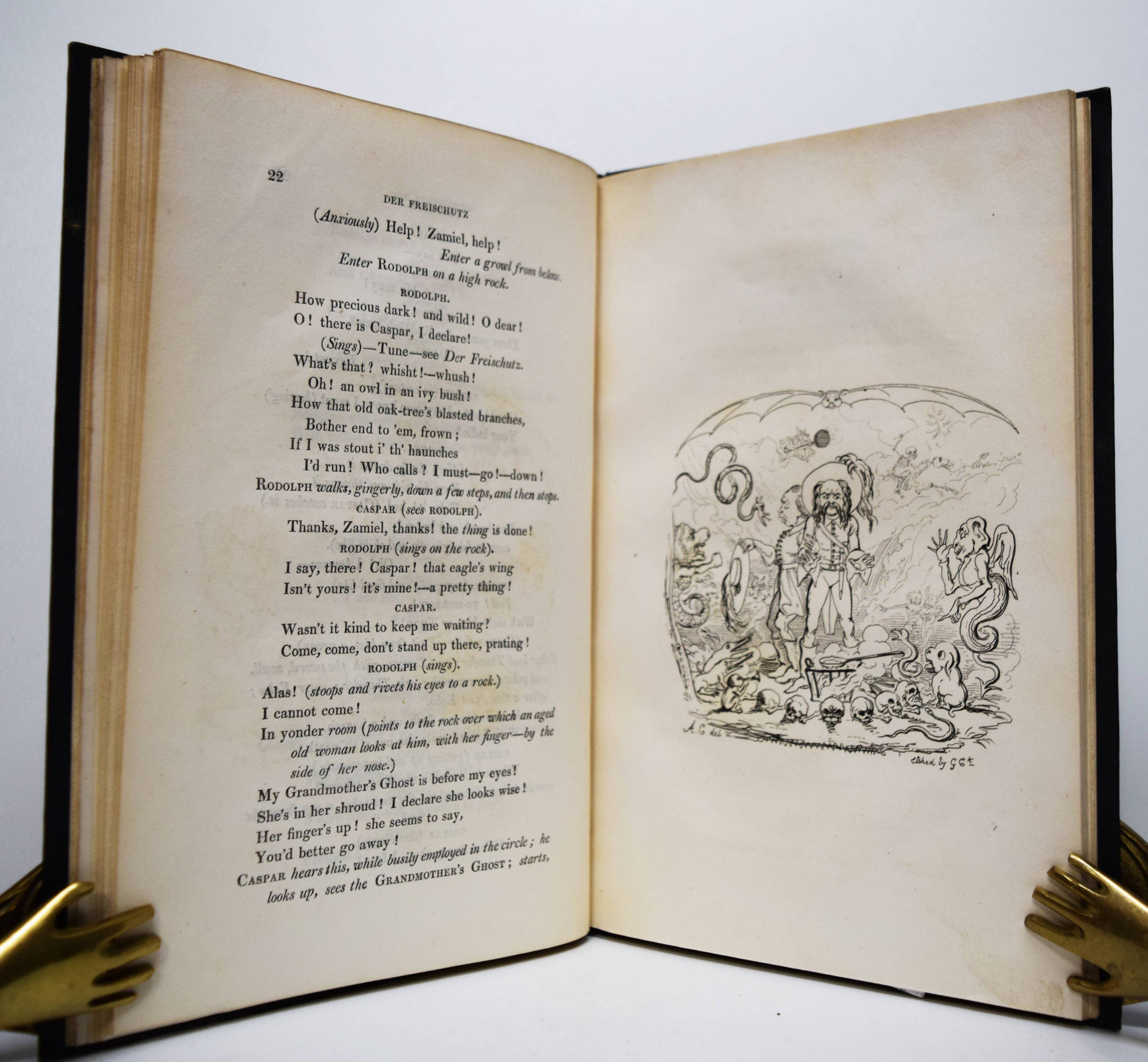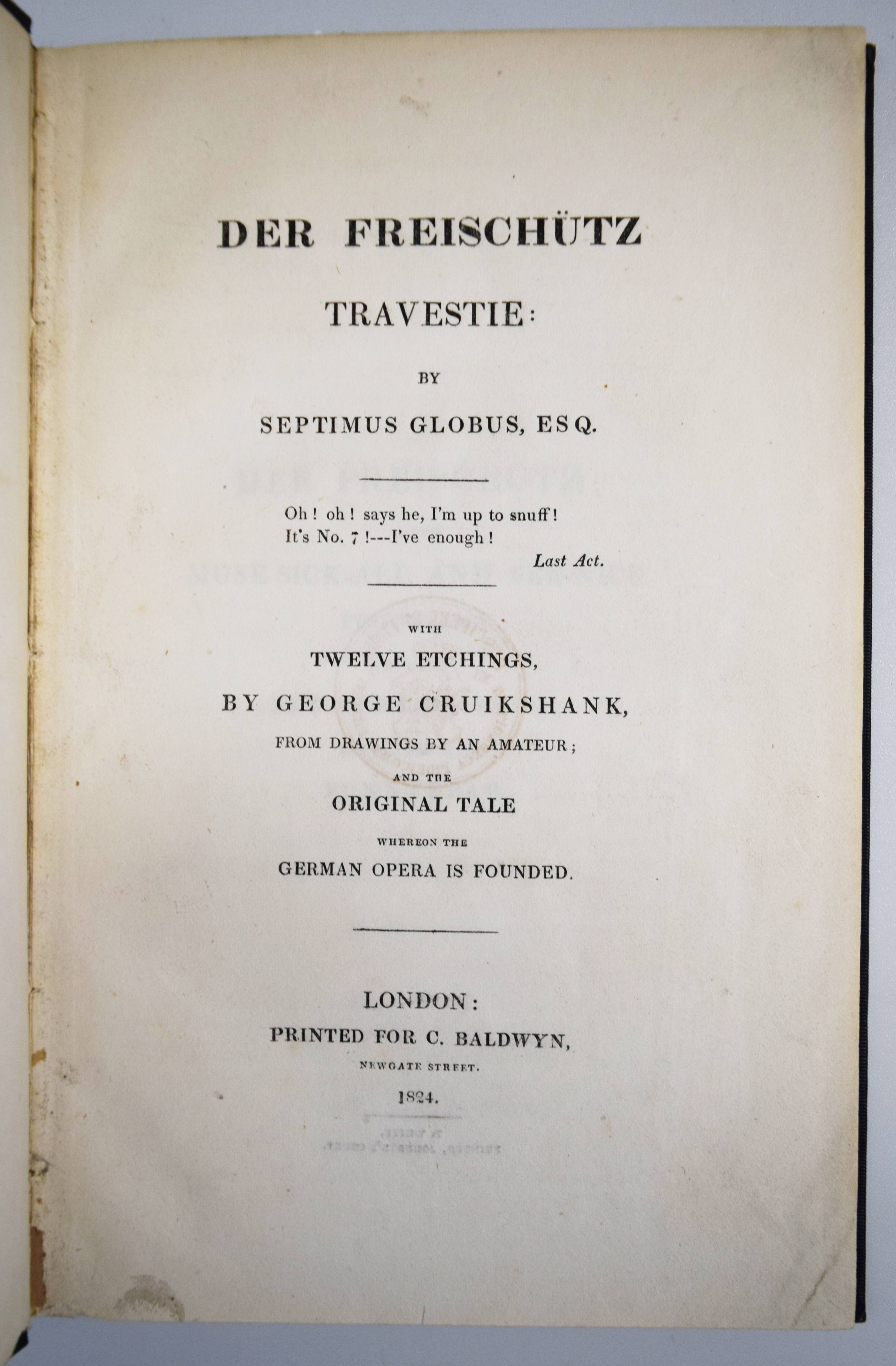 Septimus Globus (d. i. Johann August Apel). Der Freischütz. Travestie. With twelve etchings by George Cruikshank, from drawings by an amateur (Alfred Henry Forrester, pseud. A. Crowquill); and the originale tale whereon the German opera is founded. London, C. Baldwyn 1824. Gr.-8° (24 x 15 cm.). [2] Bl., 68 S. mit 12 ganzs. Radierungen. Dunkelgrüner Leinenband der Zeit mit goldgepr. Wappen-Supralibros (Ernst August, König von Hannover). Cohn 36. Rümann, Illustrierte Bücher S. 66. – Erste Ausgabe. – Amüsant illustrierte Parodie der 1822 erschienenen deutschen Nationaloper, zu der Carl Maria von Weber durch ein Gespensterbuch der damaligen Zeit angeregt worden sein soll. Cruikshank stach die Illustrationen nach Vorlagen des jungen Alfred Crowquill (1804–1872). – Schönes, sauberes und dekorativ gebundenes Exemplar aus der Bibliothek von Ernst August, König von Hannover (1771-1851) mit Wappen-Stempel verso Titel.