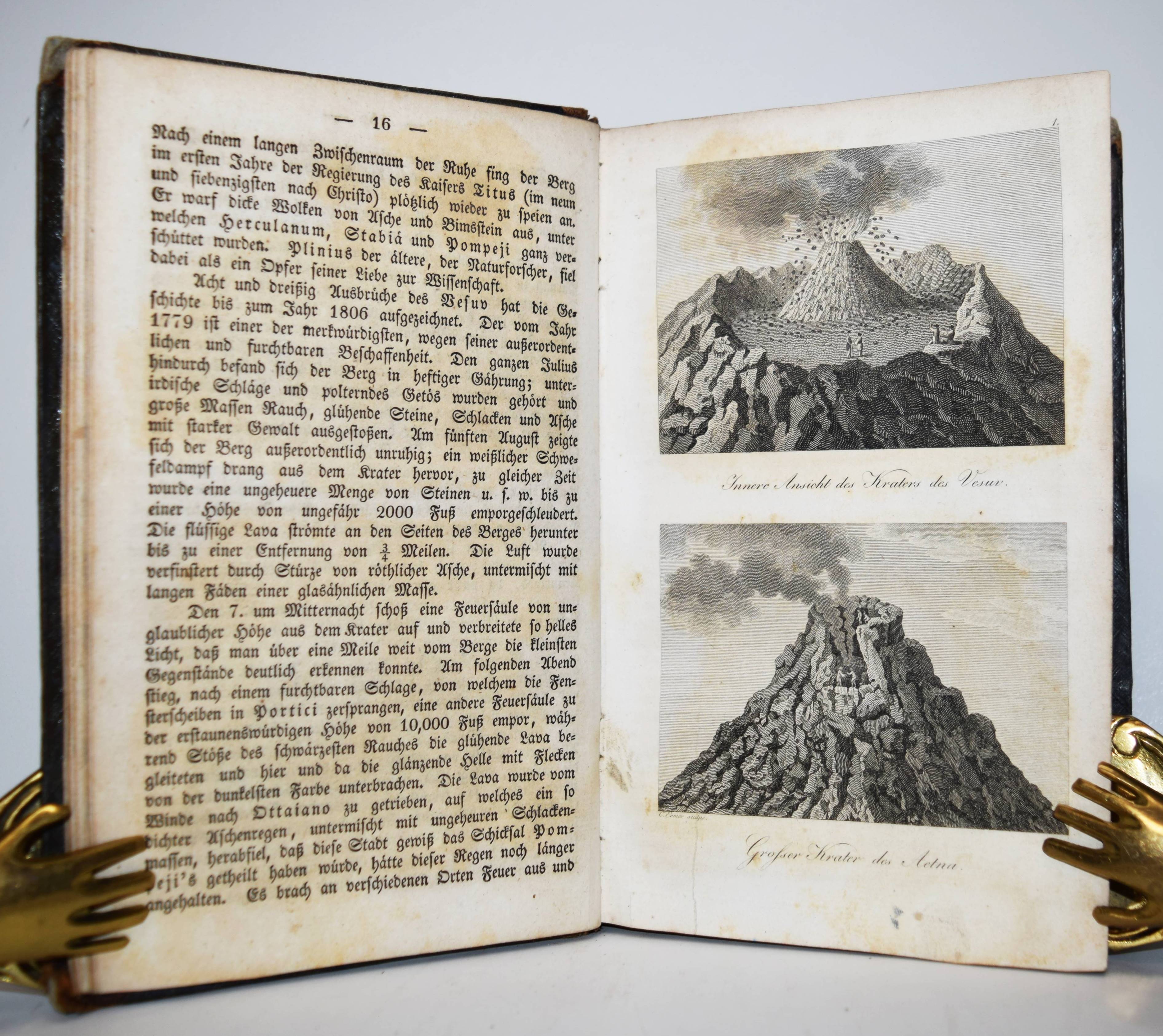 Clarke, C(harles) C(owden). Die hundert Wunder der Welt und der drei Naturreiche. Nach den besten und neuesten Quellen beschrieben und durch Abbildungen versinntlicht. Nach der achten Auflage der englischen Urschrift übersetzt von Gustav Heinrich Haumann. 4., durch L. v. Alvensleben vermehrte und verbesserte Auflage. Weimar, B. F. Voigt 1840. 8°. XVI, 626 S. mit gestoch. Frontispiz, 9 Abbildungen auf 5 Kupfertafeln und 1 Holzschnitt im Text. Halblederband der Zeit mit Rückenvergoldung. Vgl. Engelmann 45. – Die erste deutsche Ausgabe erschien 1821 mit Holzschnitt-Abbildungen; die dritte Auflage erschien 1831 mit den Kupfertafeln. – Beschreibt Wunder des Tier- und Pflanzenreichs, geographische und geologische Erscheinungen, metereologische Phänomene, besondere Bauwerke, Erfindungen (Automaten, Dampfmaschine, Taucherglocke, Fallschirm, Eisenbahn, Buchdruckerpresse etc.). – Die Kupfertafeln zeigen: „Der Porellanthurm zu Namking“, Vesuv und Aetna, die Niagara-Fälle, Fingalhöhle und Felsenbrücke in Virginien, Gardbrücke bei Nismes und „Coliseum zu Rom“, Leuchtturm und die Peterskirche in Rom. Der Holzschnitt zeigt eine Dampfmaschine. – Rücken berieben, Rückenvergoldung oxidiert, freie Vorsätze fehlen, durchgehend etwas braunfleckig, die ersten Blätter stärker, insgesamt gut erhalten.