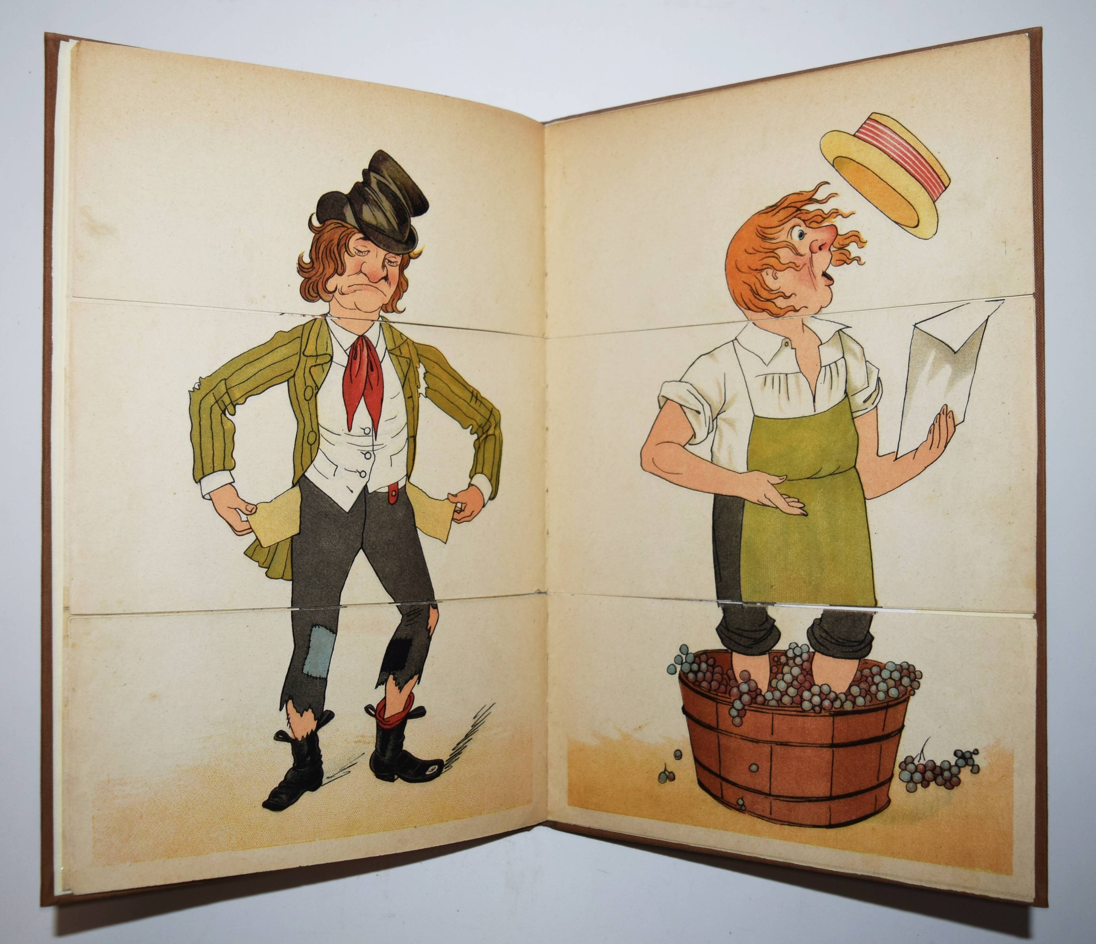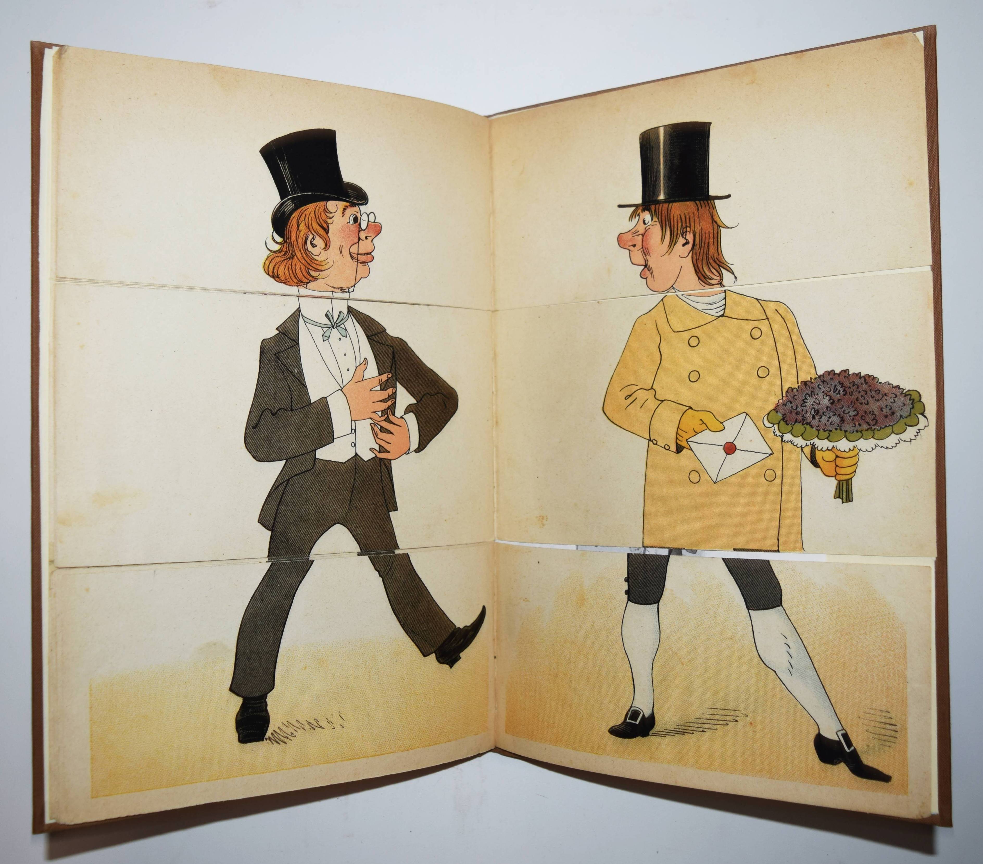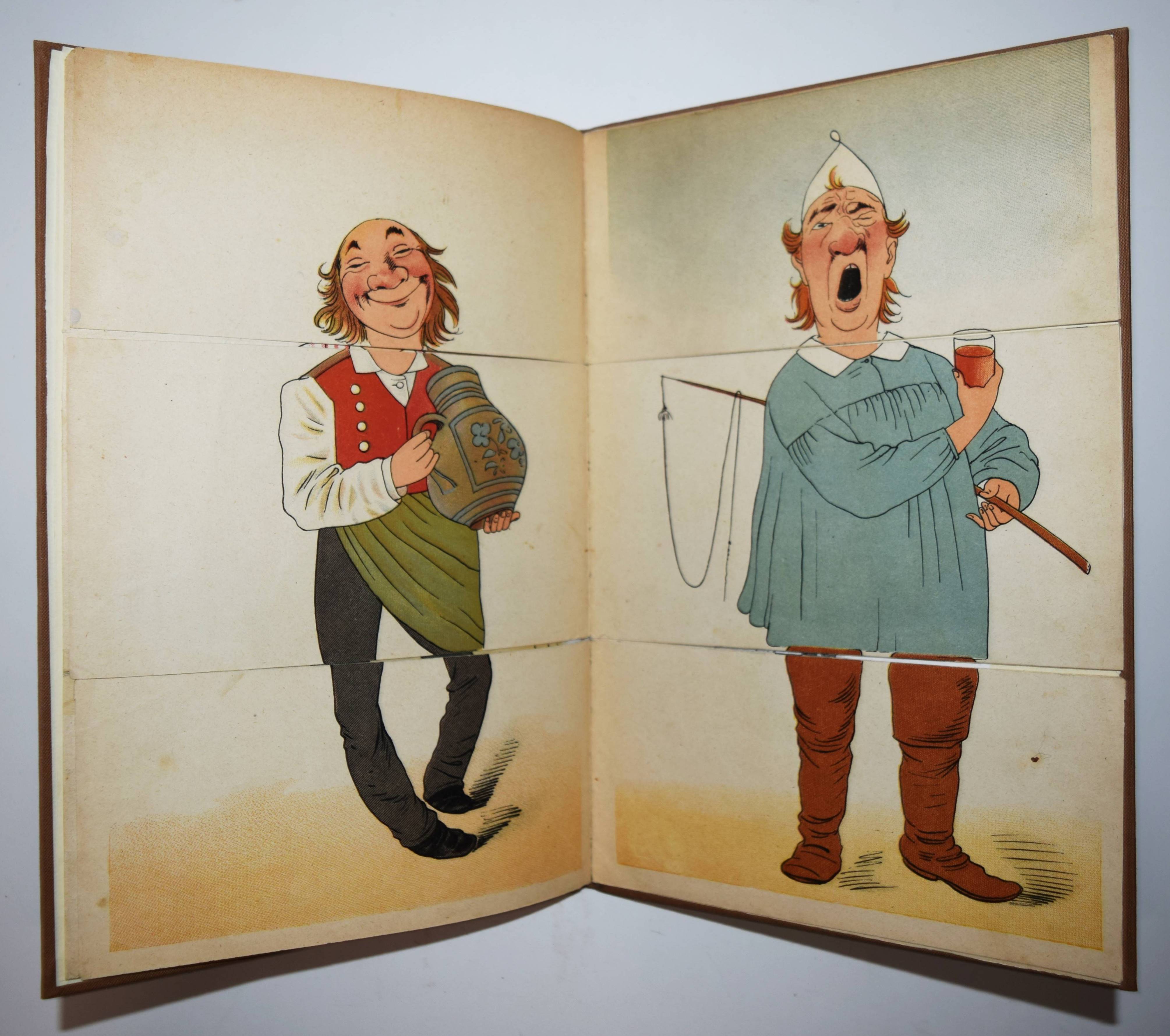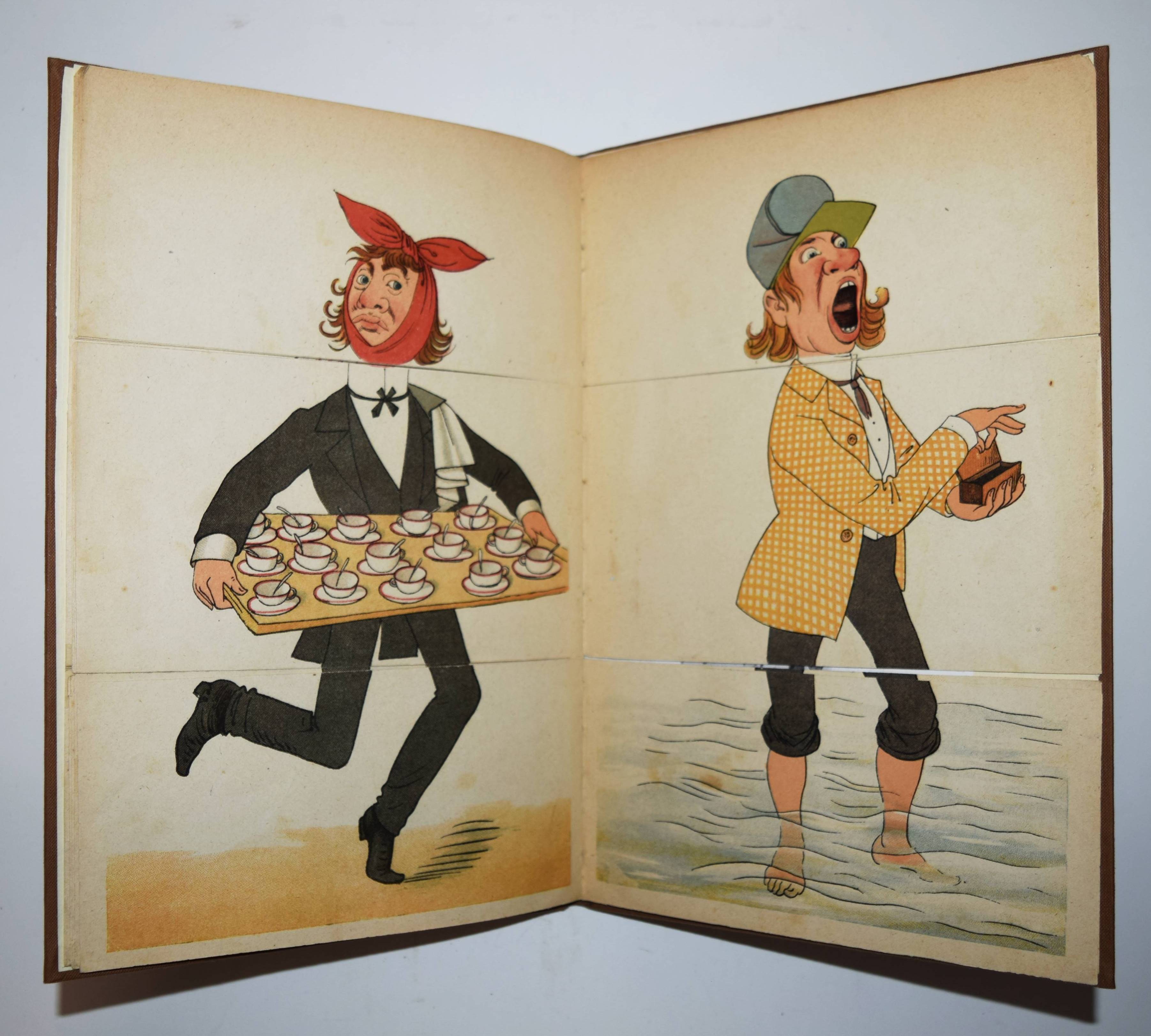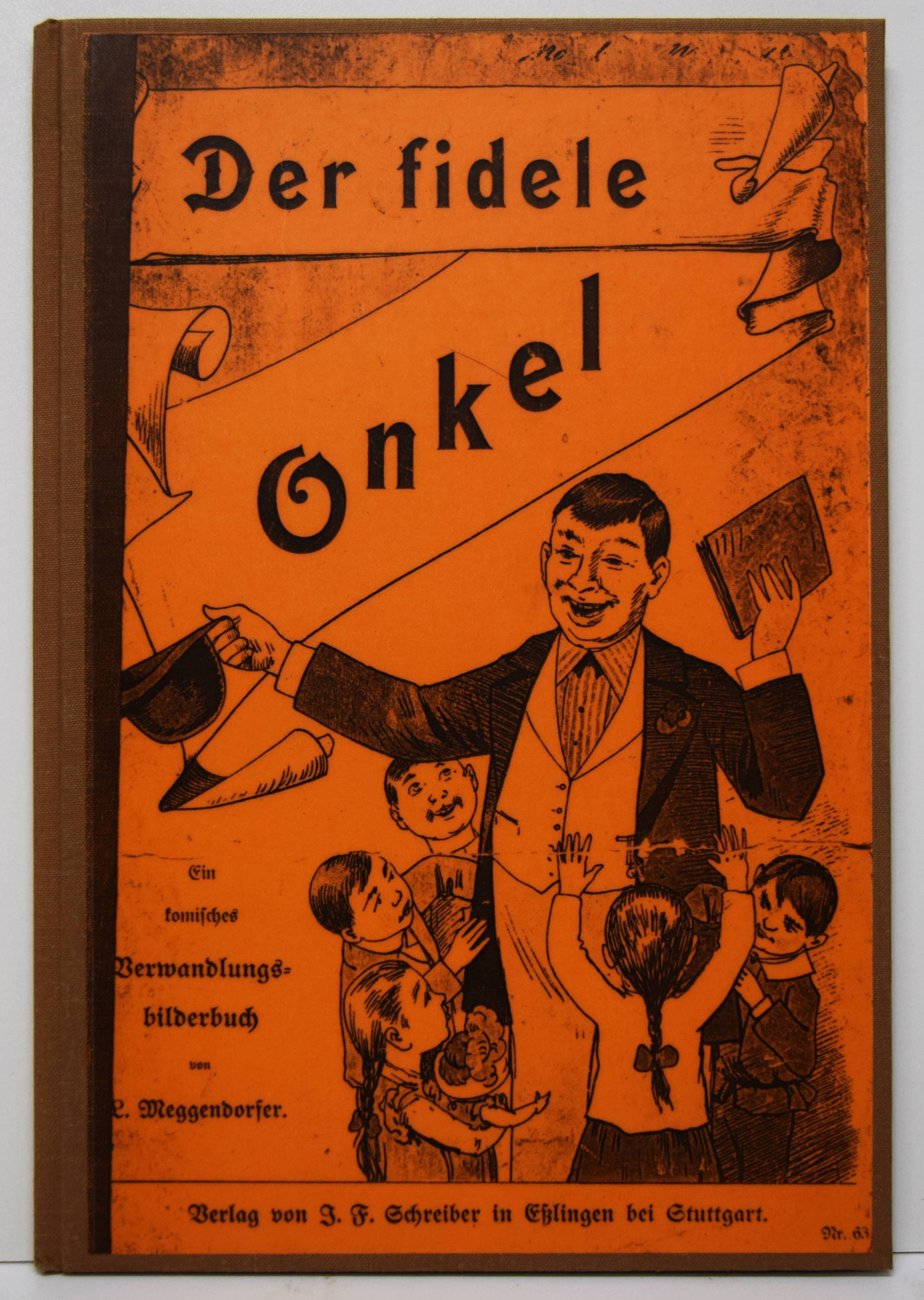 Meggendorfer, Lothar. Der fidele Onkel. Ein komisches Verwandlungsbilderbuch. Esslingen, J. F. Schreiber o. J. (1891). 4° (28 x 19 cm.). 14 chromolithographierte Tafeln (inkl. vorderem Umschlagdeckel), davon 12 (6 Bl.) zweifach waagerecht durchgeschnitten. Moderner Leinenband mit fotokopiertem Deckelbild. (Verlags-Nr. 63). Katzenheim S. 90. Krahé 36. LKJ II, 460. Ries 713, 74. Vgl. Slg. Breitschwerdt 116 (spätere Ausgabe). – Erste Ausgabe; bei späteren Ausgaben sind 14 Tafeln zweimal durchgeschnitten. „Nicht abschließend geklärt ist, ob der Titel zunächst in einer Ausgabe mit 12 Bildern erschien, die dann in einer weiteren Ausgabe um zwei Bilder auf 14 Bilder erweitert wurde“ (G. F. v. Katzenheim). Vor 1912 erschien der Titel auch als „Metamorphosenspiel mit 14 Figuren“. – „Mit ihren Tausenden von Kombinationsmöglichkeiten stellen diese Bücher eine unversiegliche Unterhaltungsquelle dar. Meggendorfer huldigte dem Typus mehrfach, nachdem er ihm, wie bei Krahé Seite 104 ausgeführt, in dem 1889 bei Stroefer verlegten, von ihm mit einer Umschlagzeichnung ausgestatteten Titel ,Kochs drolliges-Bilderbuch’ zum ersten Mal begegnet war“ (Hans Ries S. 55/3). – Einband und Vorsätze fachgerecht erneuert, der beigebundene Vorderdeckel mit Japanpapier kaschiert und restauriertem waagerechten Durchriss im unteren Drittel, im Blattrand teils etwas fingerfleckig, sonst gut erhalten.