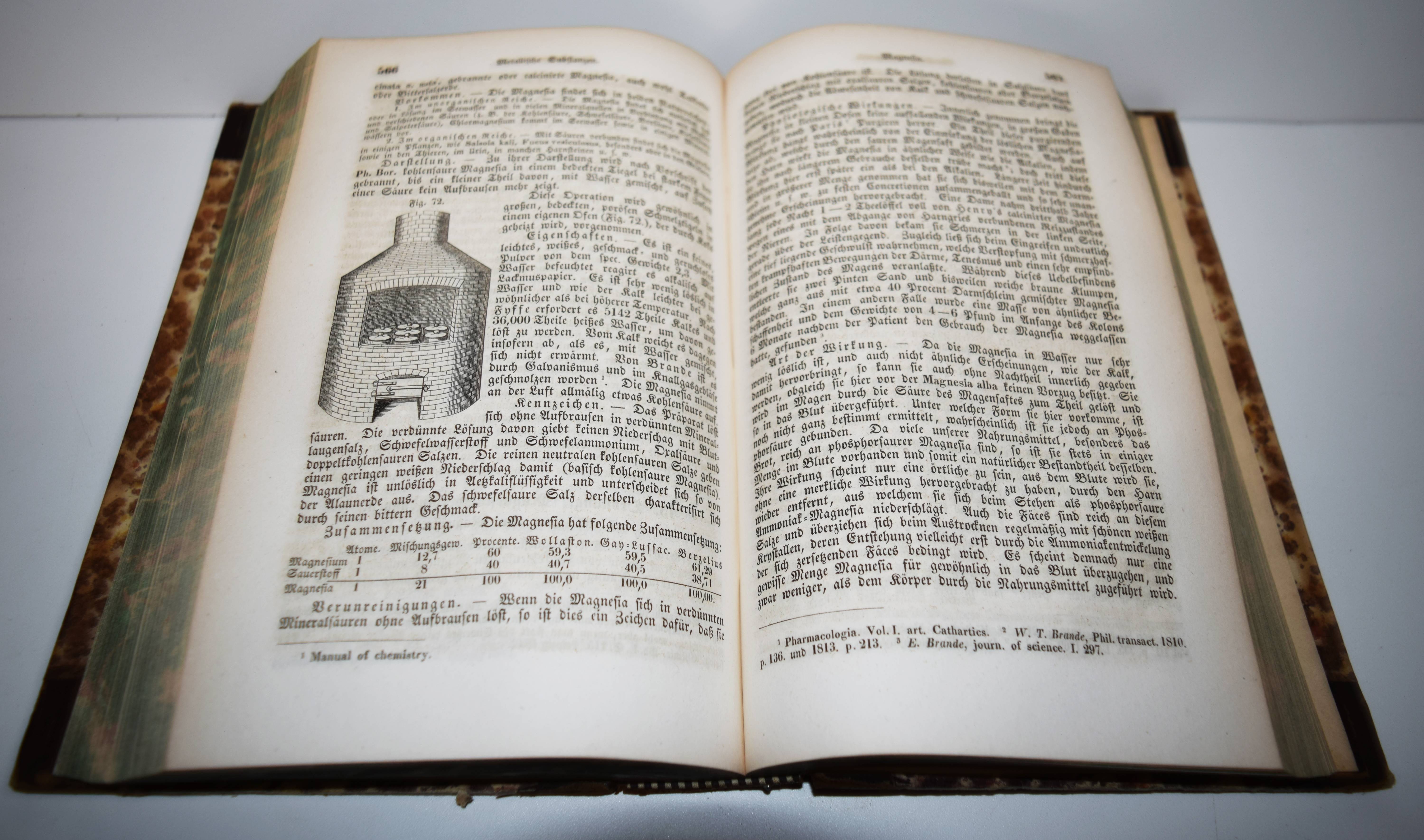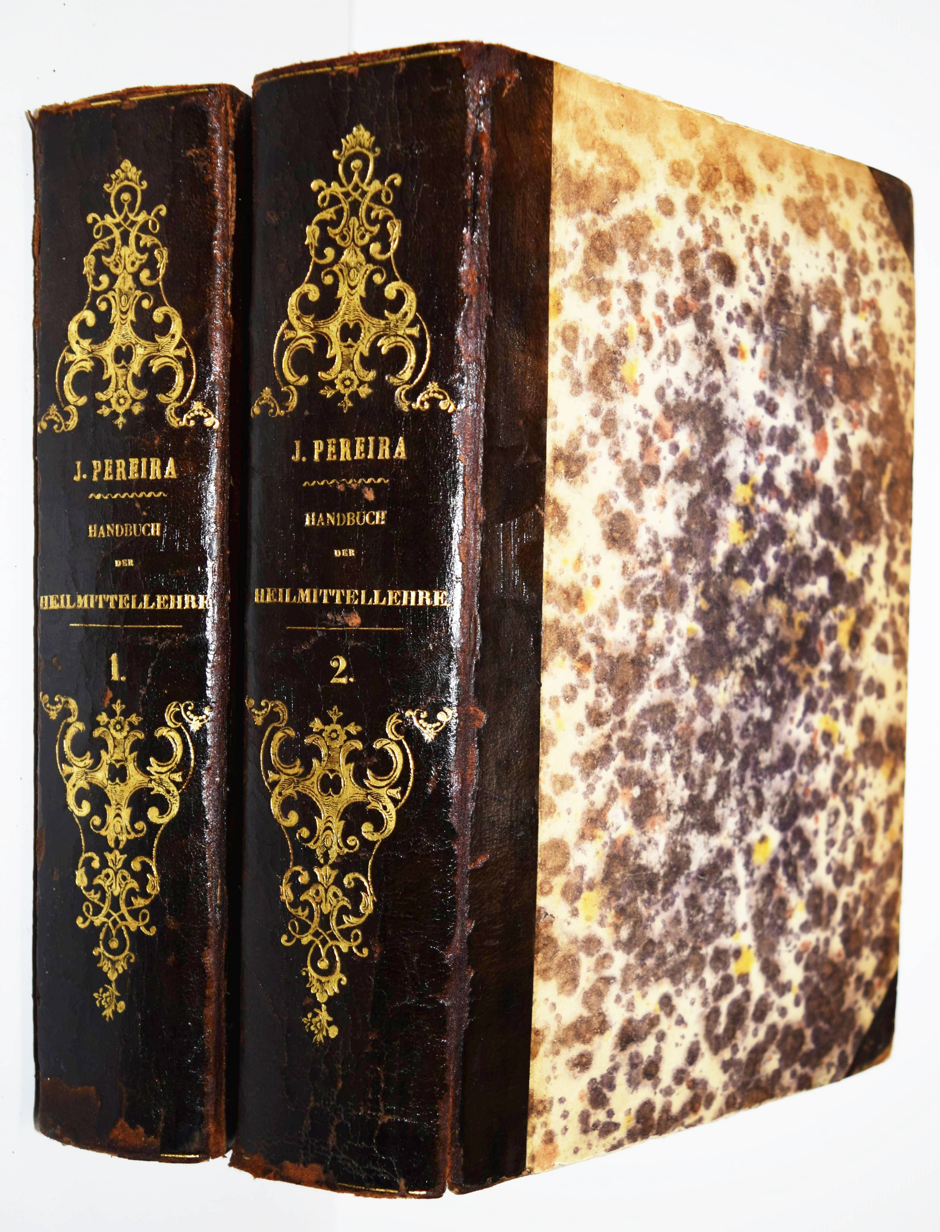 Pereira, Jonathan. Handbuch der Heilmittellehre. Nach dem Standpunkte der deutschen Medicin bearbeitet von Rudolf Buchheim. 2 Bände. Leipzig, Leopold Voß 1846-1848. Gr.-8° (23,5 x 14,5 cm.). XLVIII, 844 S.; XXII, 929, (1) S. Halblederbände der Zeit mit Romantikervergoldung. Hirsch-Hübotter I, 747 und IV, 555. Schelenz 677. – Erste deutsche Ausgabe (bearbeitete nach der 2. Englischen der „Elements of Materia Medica“, London 1842-43). – Rücken berieben, Gelenke spröde, sonst gut erhalten.