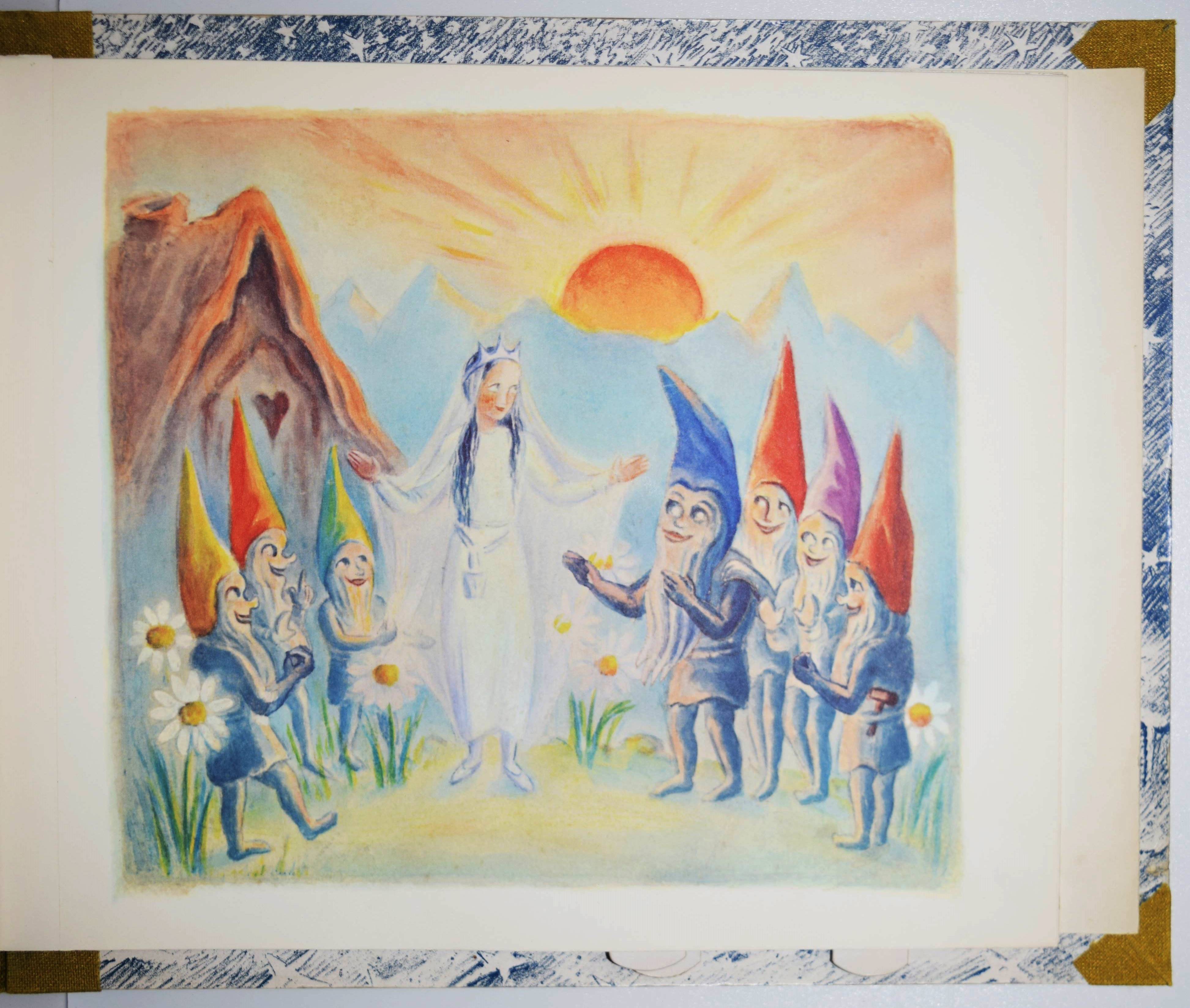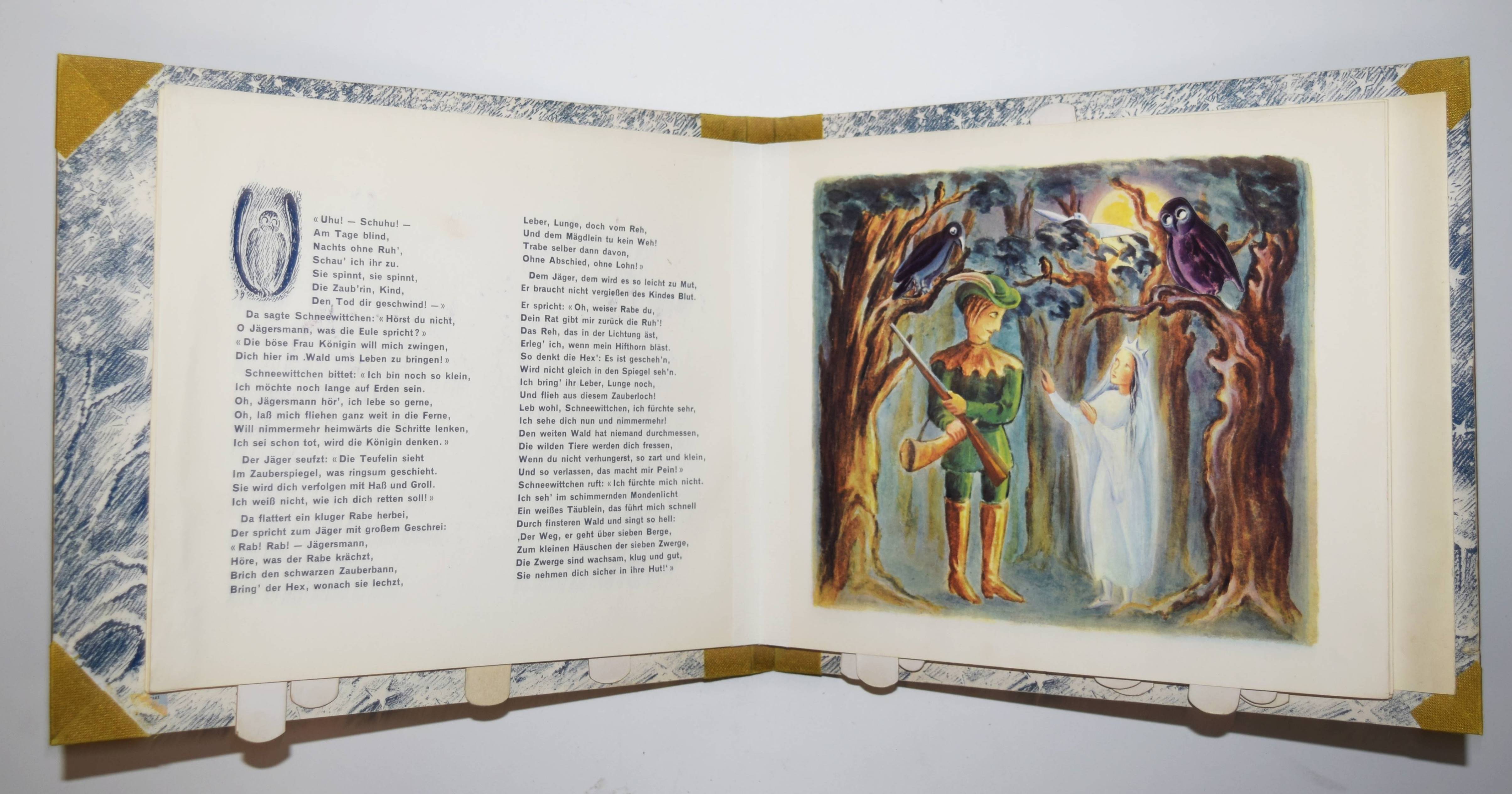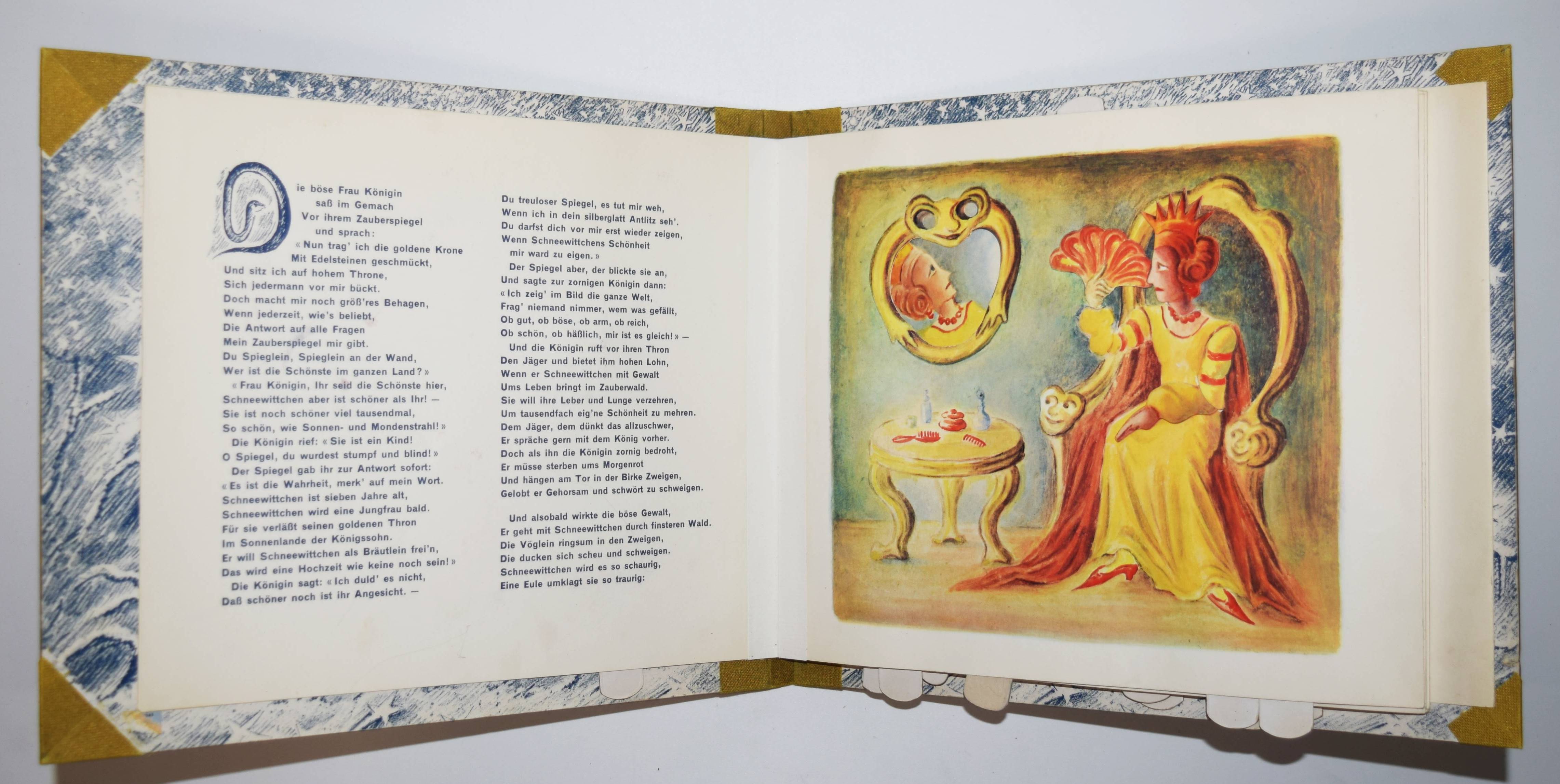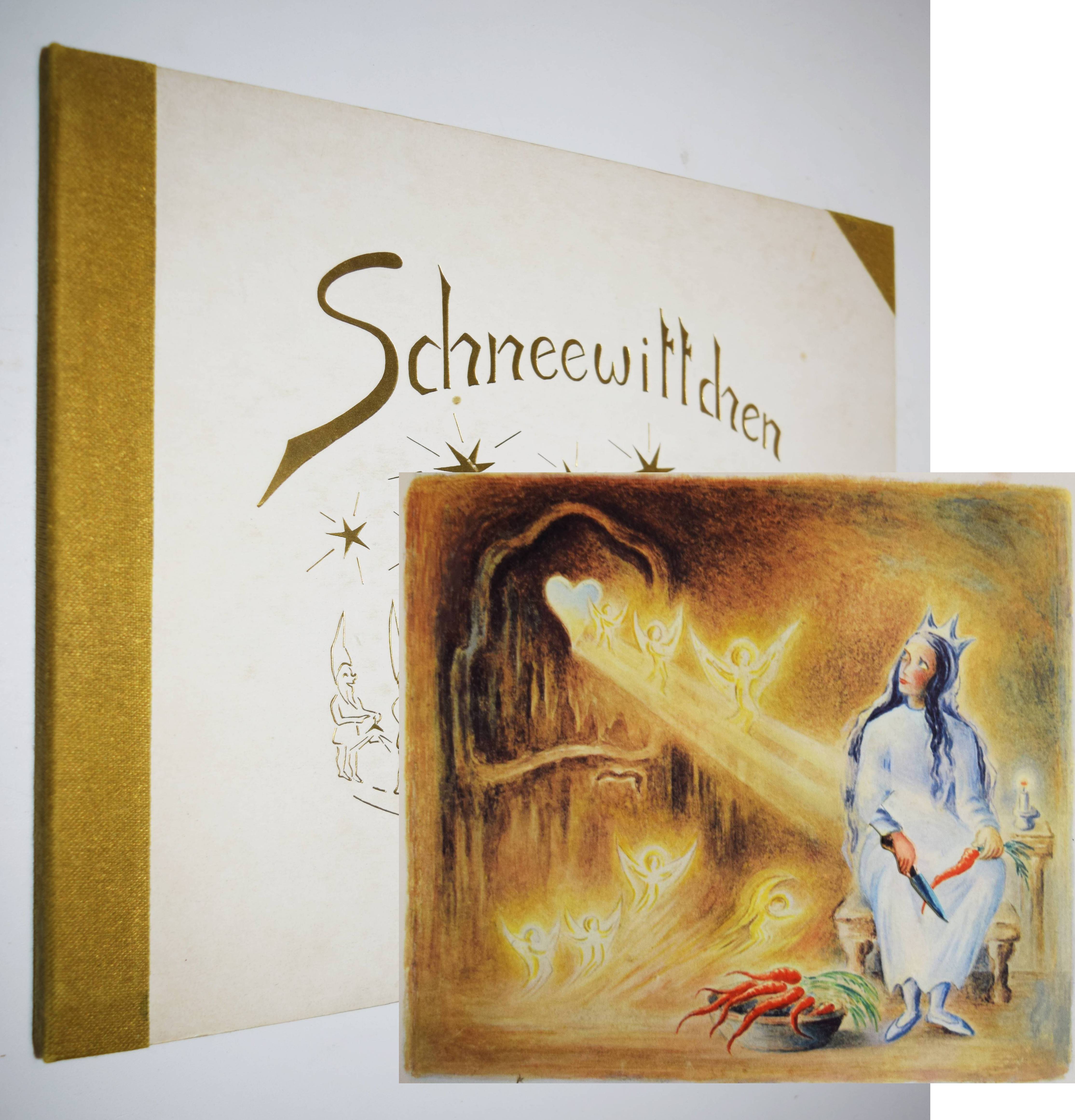 Strachwitz, Marta. Schneewittchen. Ziehbilderbuch von Hilde Langen. Dornach, Verlag der Werkstatt „Zu den sieben Zwergen“ 1967. Quer-4°. [15] Bl. mit illustr. Titel, 12 (1 doppelblattgr.) farblithogr. Tafeln, davon 6 mit beweglichen Teilen und Ziehmechanismus und Illustrationen im Text. Illustr. Orig.-Halbleinenband. Vgl. Muck II, 5498 (erste Ausgabe von 1947). Nicht bei im Lexikon Schweizer Bilderbuch-Illustratoren (SBI). – Seltenes anthroposophisches Spiel-Bilderbuch. Bei den Tafeln können meist mehrere Teile durch einen Ziehmechanismus bewegt werden. – Sehr gutes Exemplar.