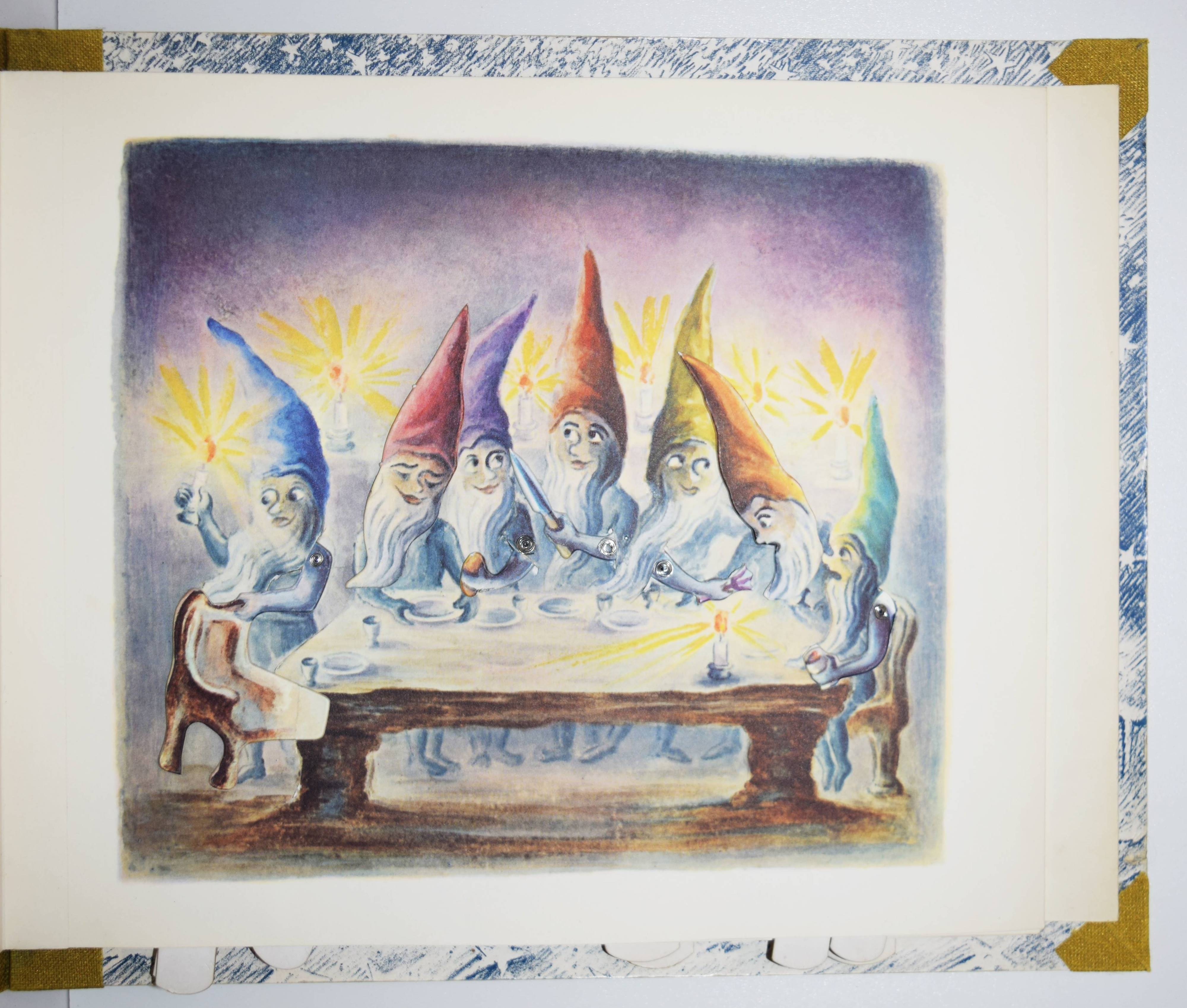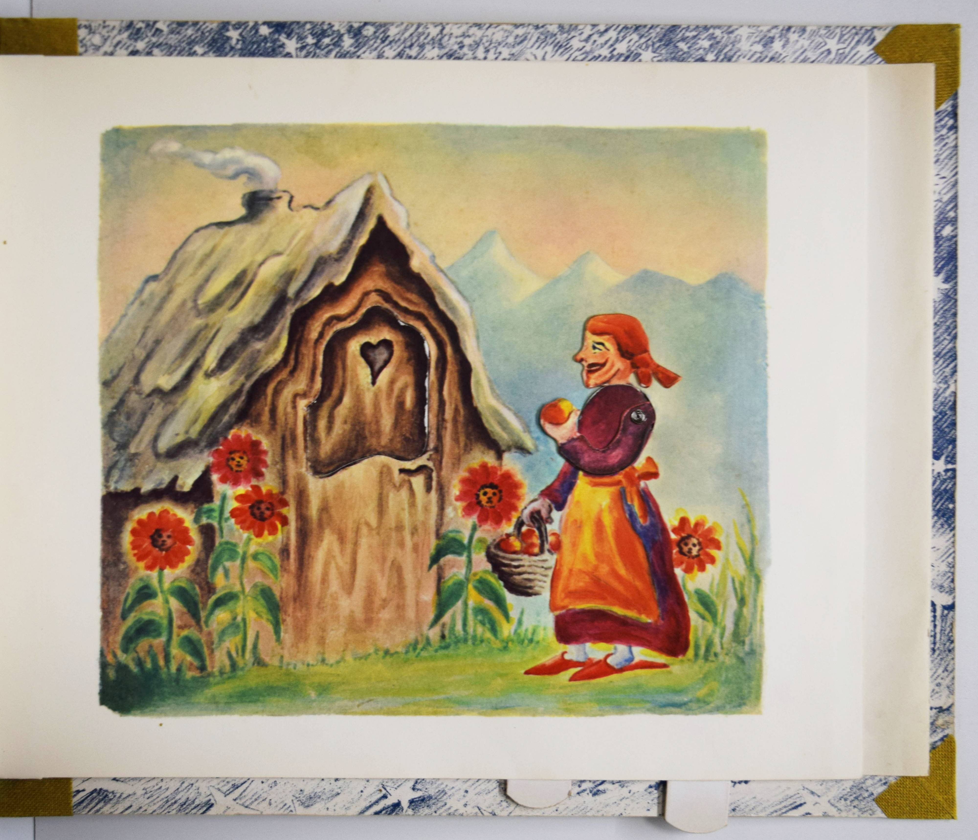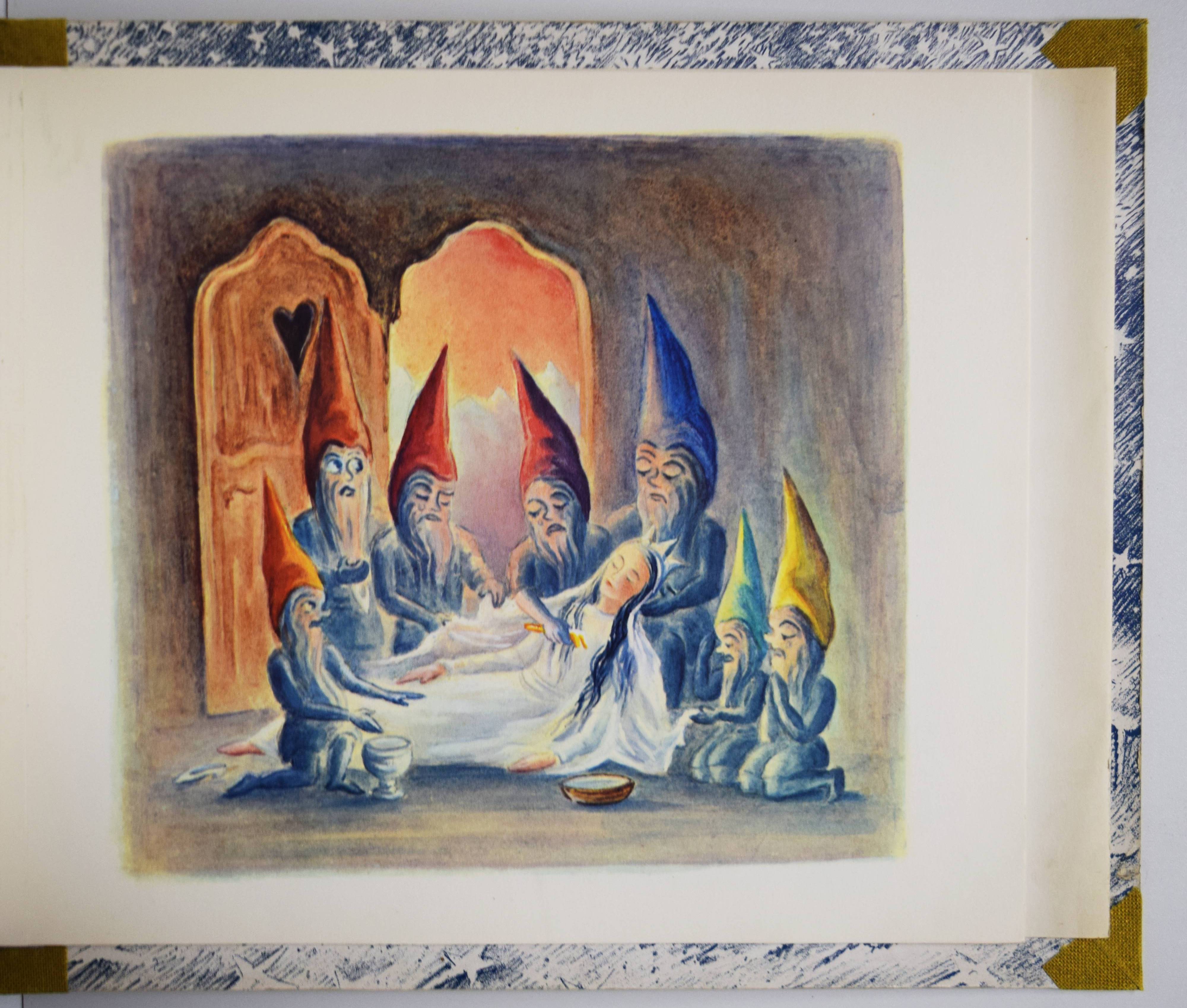 Strachwitz, Marta. Schneewittchen. Ziehbilderbuch von Hilde Langen. Dornach, Verlag der Werkstatt „Zu den sieben Zwergen“ 1967. Quer-4°. [15] Bl. mit illustr. Titel, 12 (1 doppelblattgr.) farblithogr. Tafeln, davon 6 mit beweglichen Teilen und Ziehmechanismus und Illustrationen im Text. Illustr. Orig.-Halbleinenband. Vgl. Muck II, 5498 (erste Ausgabe von 1947). Nicht bei im Lexikon Schweizer Bilderbuch-Illustratoren (SBI). – Seltenes anthroposophisches Spiel-Bilderbuch. Bei den Tafeln können meist mehrere Teile durch einen Ziehmechanismus bewegt werden. – Sehr gutes Exemplar.