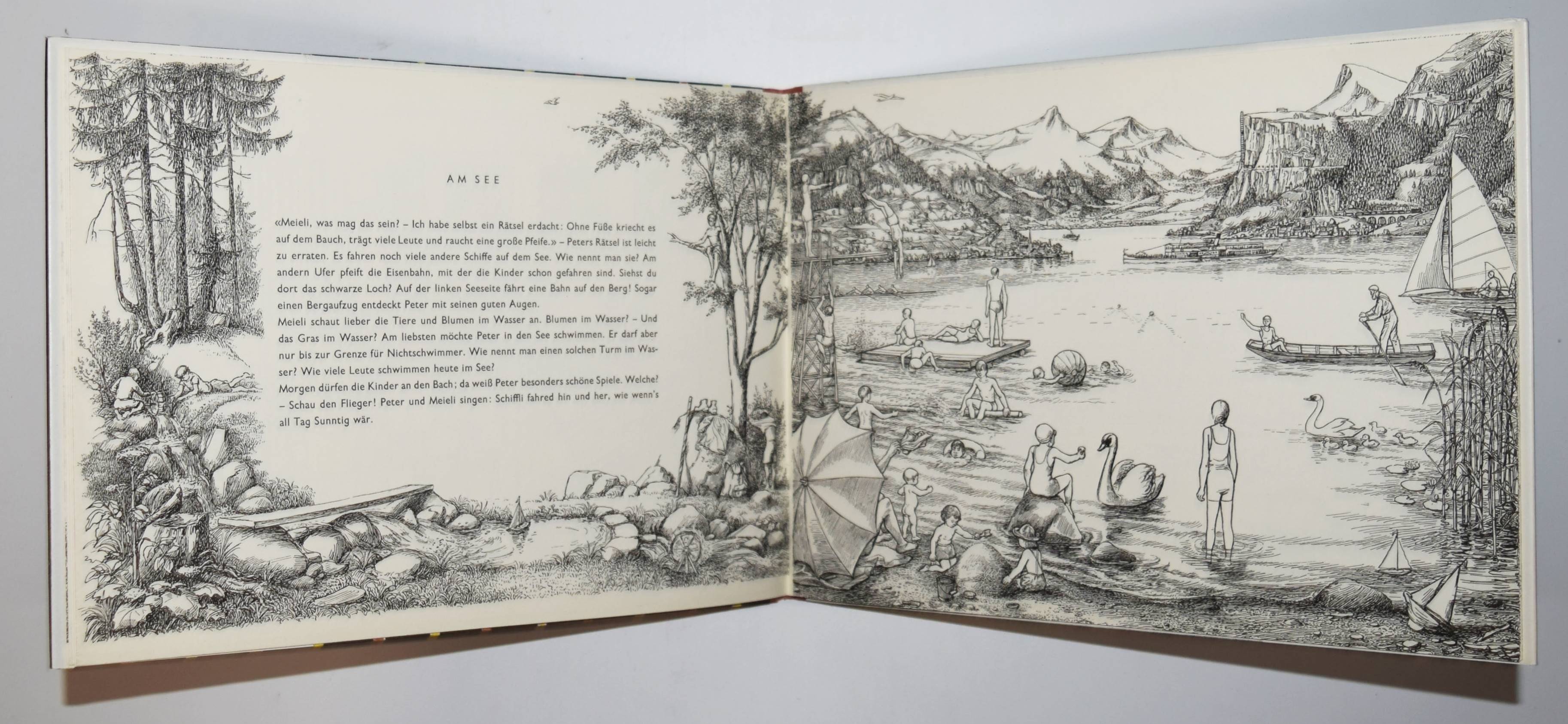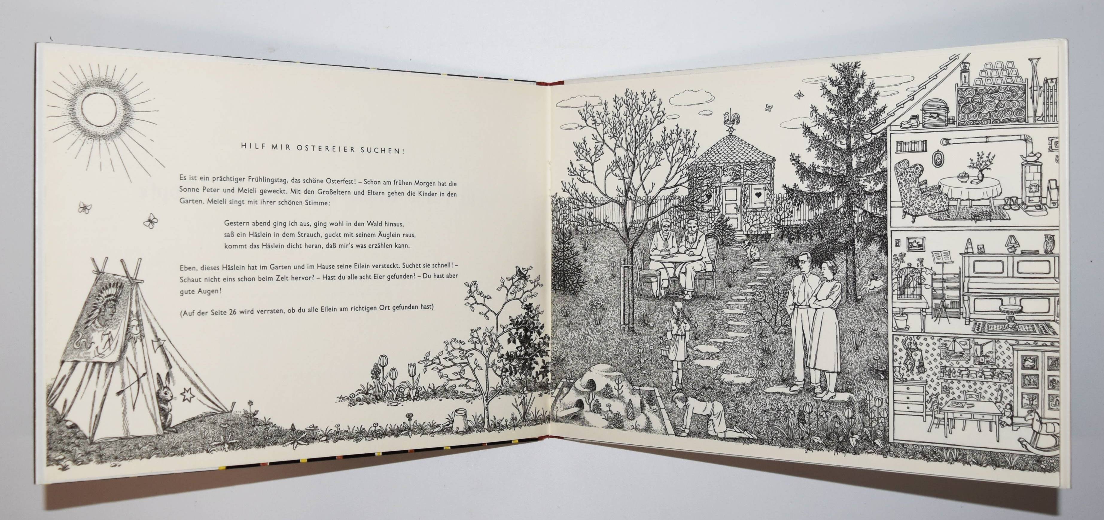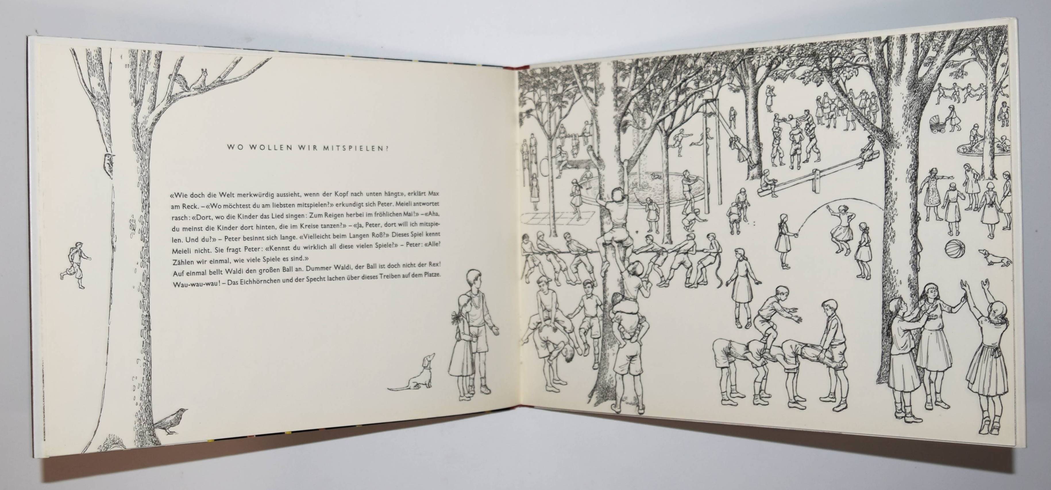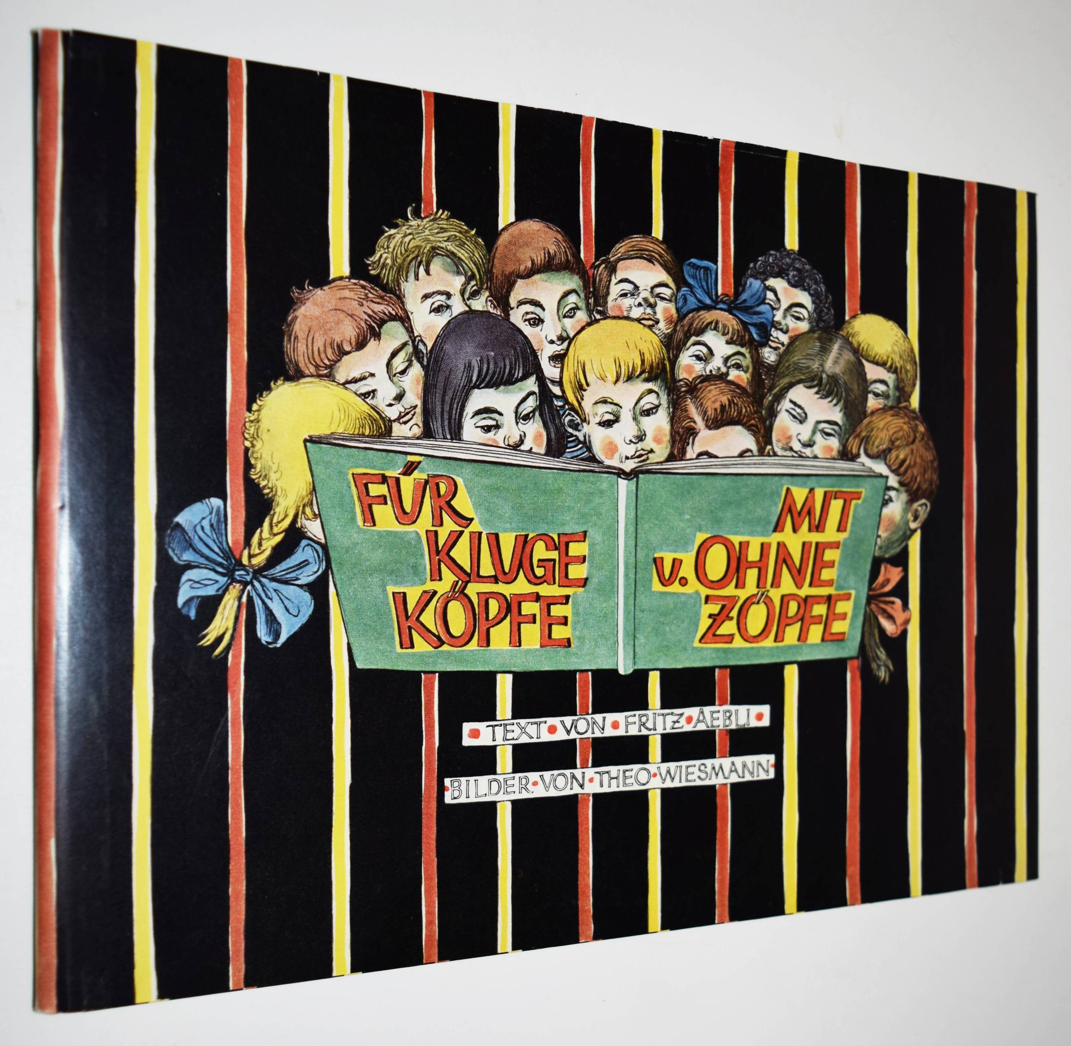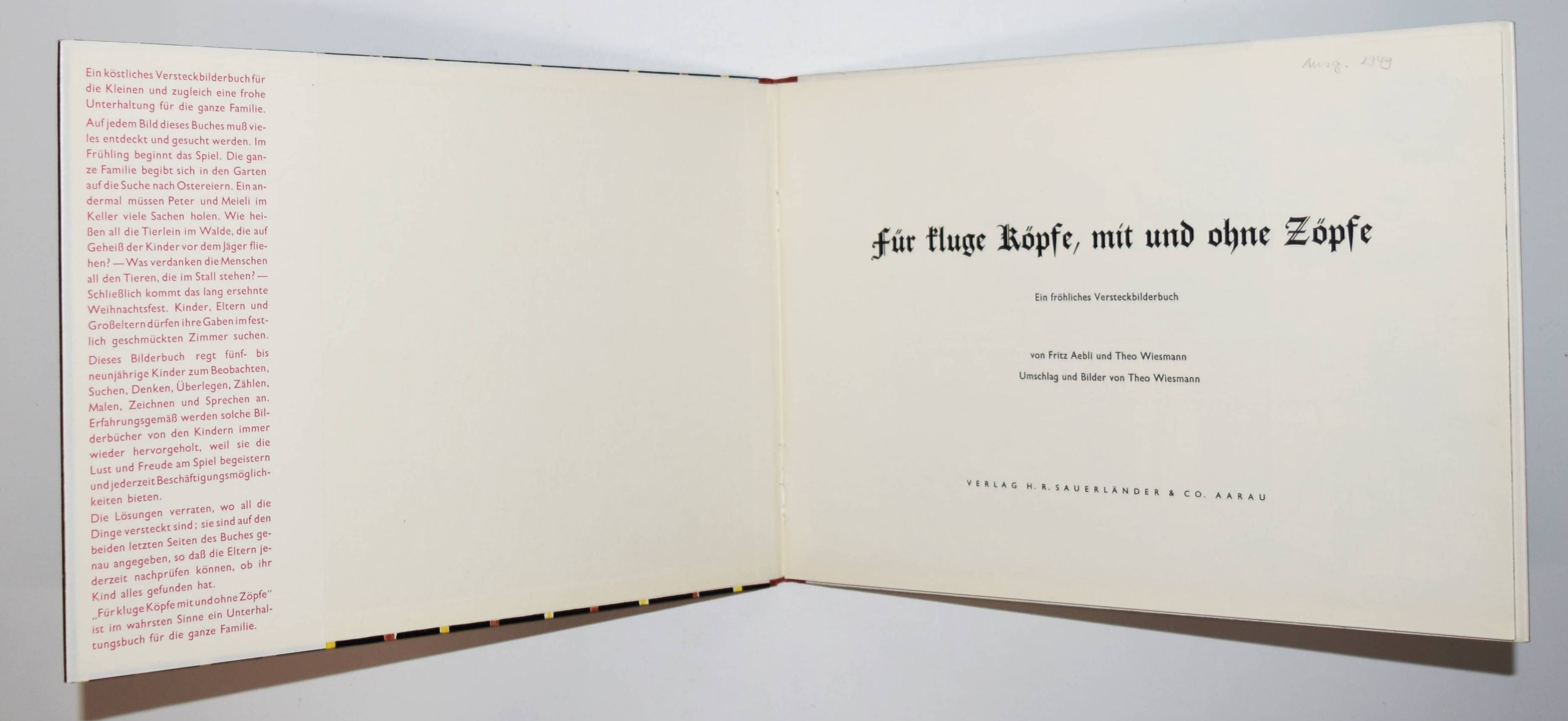 Aebli, Fritz. Für kluge Köpfe, mit und ohne Zöpfe. Ein fröhliches Versteckbilderbuch. Umschlag und Bilder von Theo Wiesmann. Aarau, H. R. Sauerländer & Co. (1949). Quer-Gr.-8° (21,5 x 30 cm.). [14] Bl. mit zahlr. teils ganzs. Illustrationen. Farbig illustr. Orig.-Halbleinenband mit farbig illustr. Schutzumschlag. Klotz, Bilderbücher 6397/7. Muck II, 1678. SBI 297 und S. 84. – Erste und einzige Ausgabe. – „Für kluge Köpfe, mit und ohne Zöpfe ist ein Versteckbilderbuch, in dem auf jedem der detailreichen Bilder etwas gesucht werden muss. „Bei den Federzeichnungen für das Bilderbuch ‘Für kluge Köpfe… genoss ich die Möglichkeit einer dichten, erzählerischen Schilderung. Jeglicher Verzicht auf Farbe war mir aber doch etwas Zwang, und dieser Zwang führte wohl zu einer gewissen Spröde. Später hätte ich die Arbeit freier, malerische gelöst“ (T. Wiesmann). – Sehr gutes Exemplar mit dem meist fehlenden Schutzumschlag.