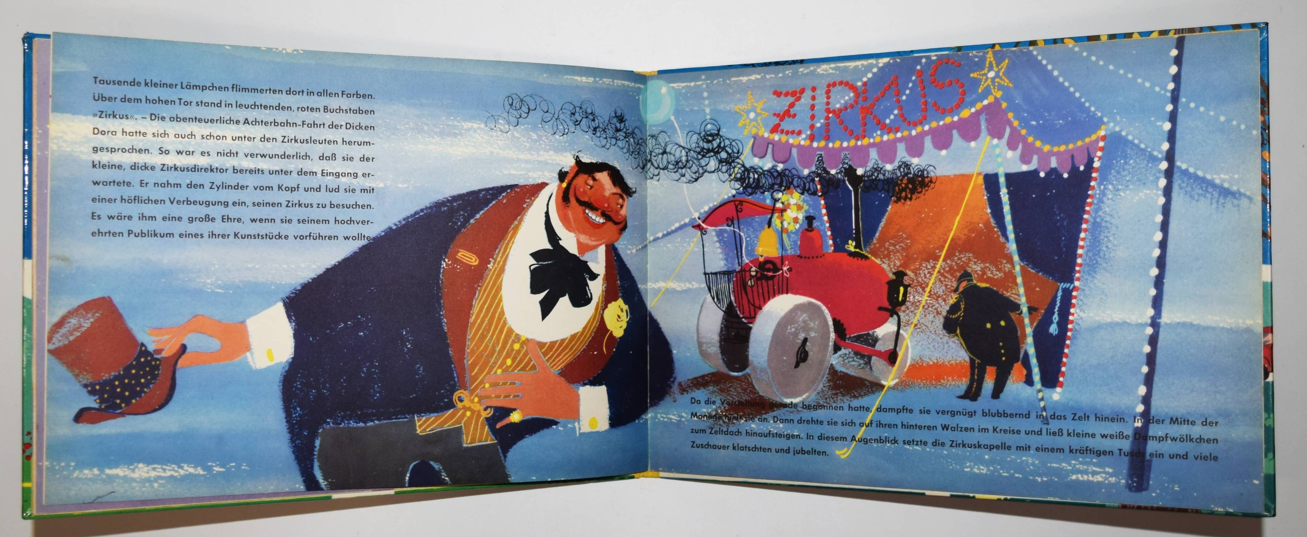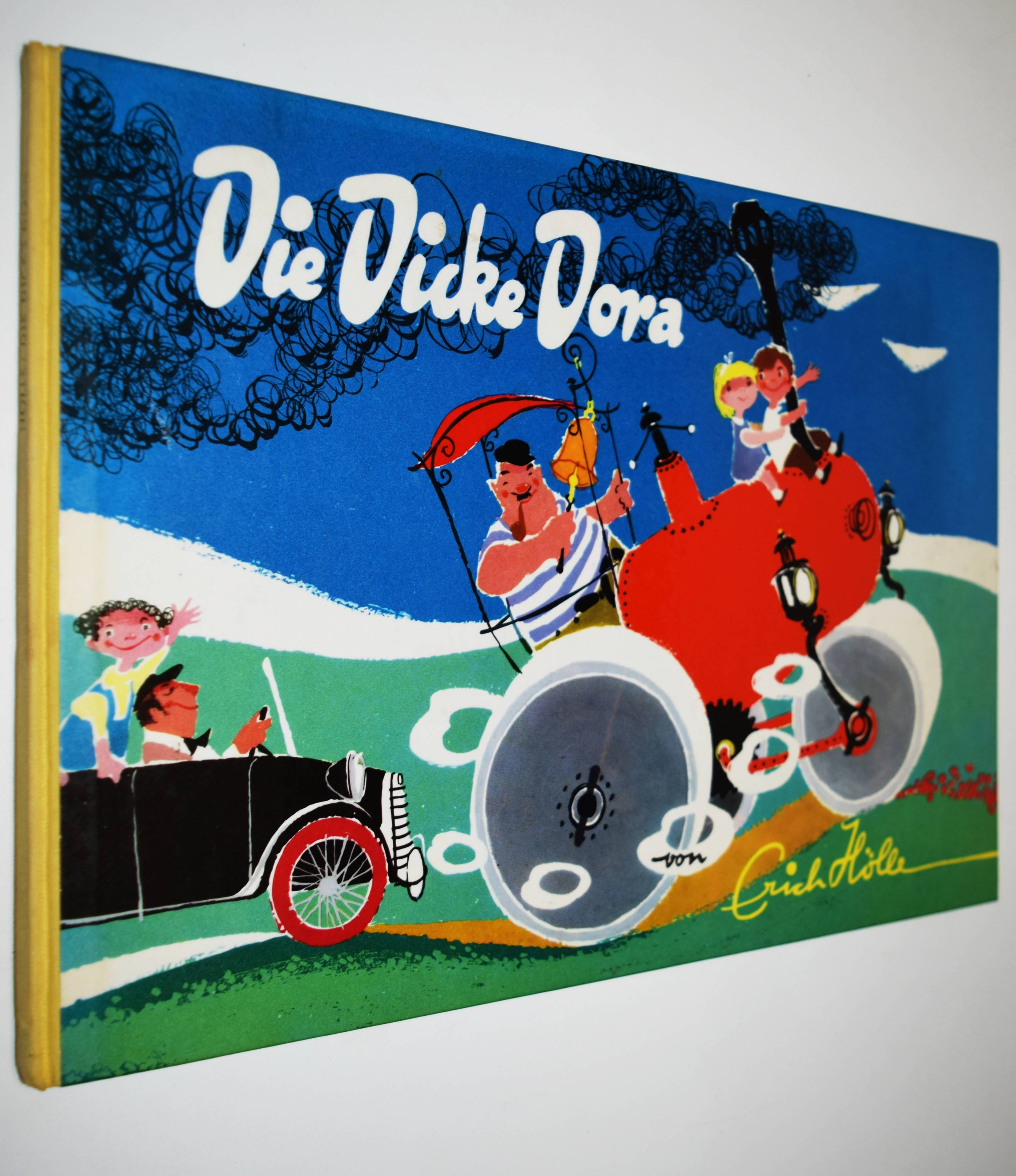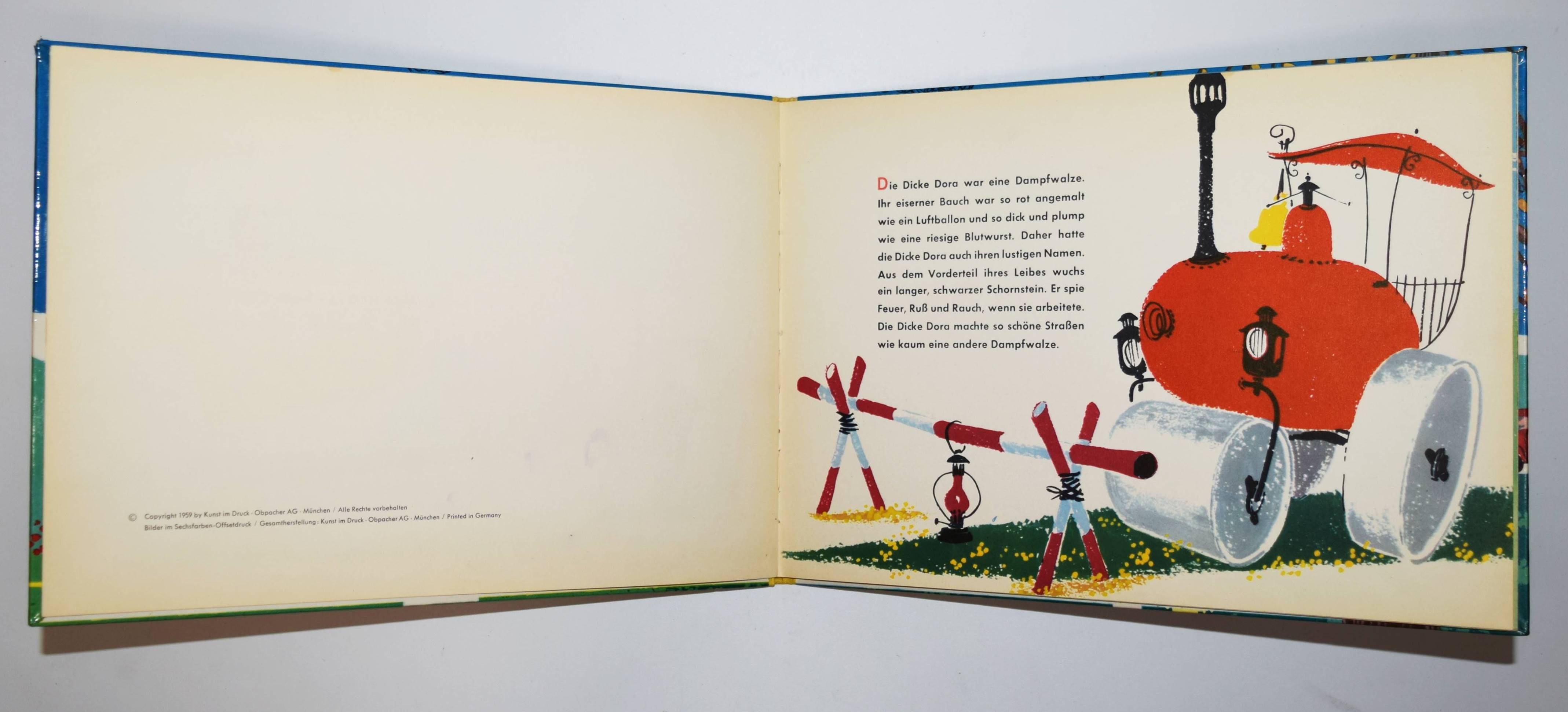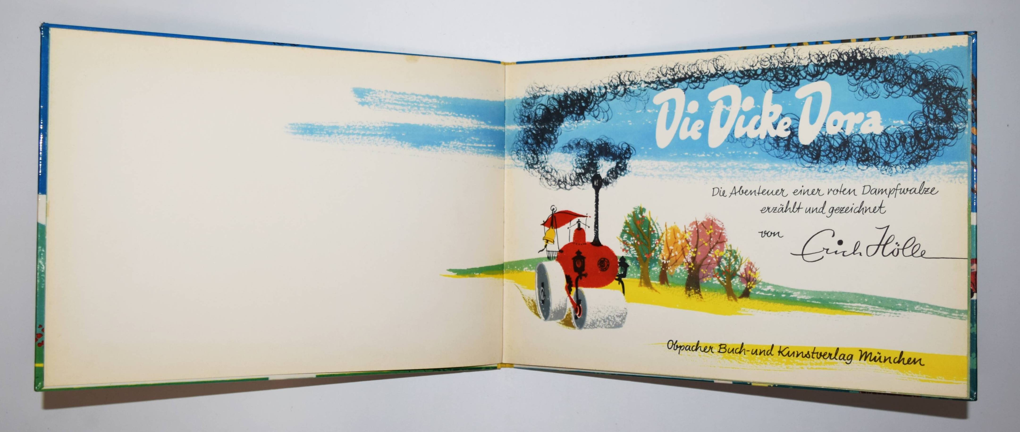 Hölle, Erich. Die dicke Dora. Die Abenteuer einer roten Dampfwalze erzählt und gezeichnet. München, Obpacher Buch- und Kunstverlag (1959). Quer-4° (23,5 x 33 cm.). [18] Bl. mit farbigen Illustrationen. Farbig illustr. Orig.-Halbleinenband. Doderer/Müller 996. LKJ IV, 287 f. – Erste Ausgabe des zweiten Bilderbuchs von E. Holle, der durch seine Illustrationen zu Max Kruses „Urmel aus dem Eis“ (1969) bekannt wurde. – Sehr gutes sauberes Exemplar.
