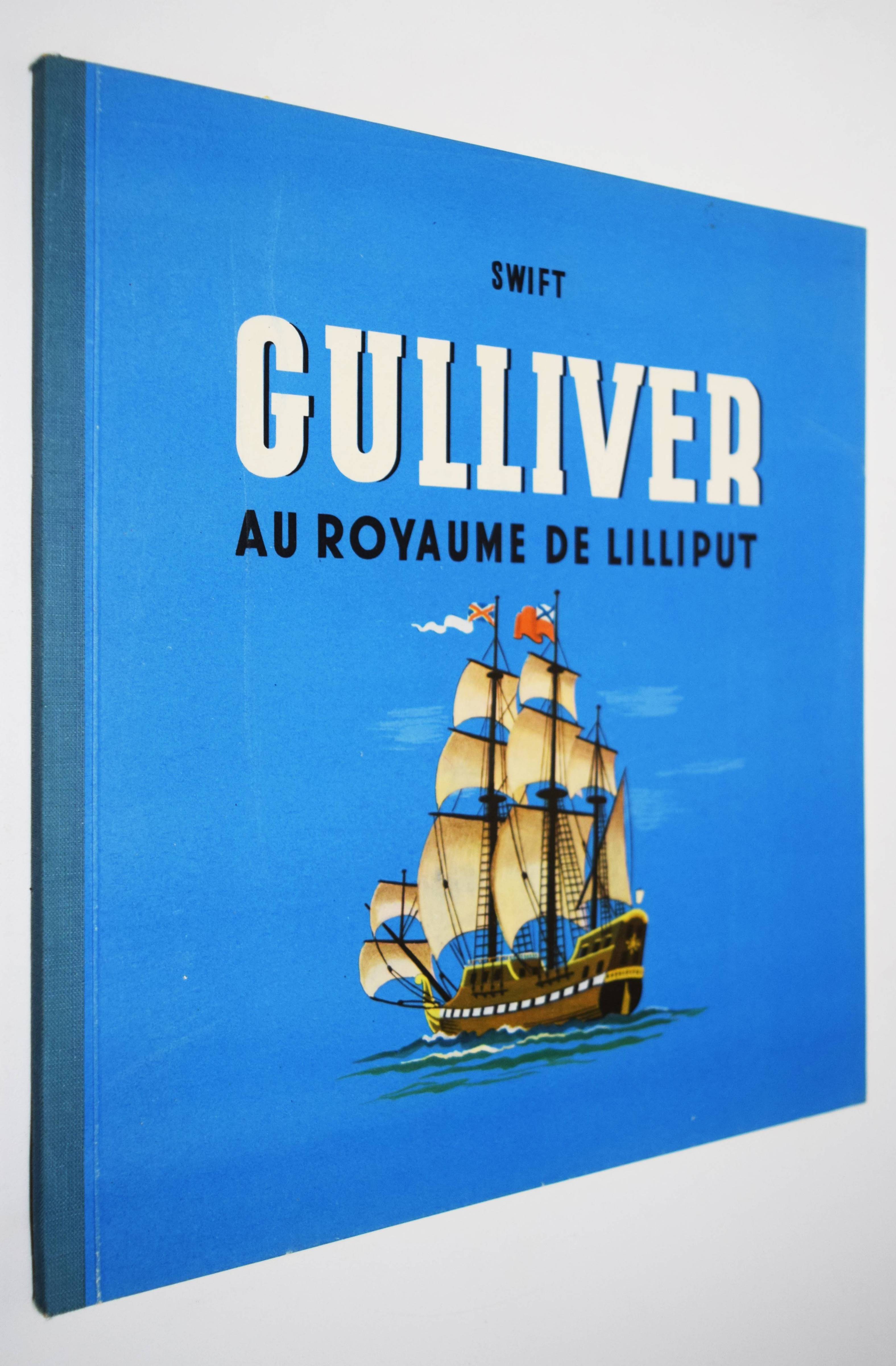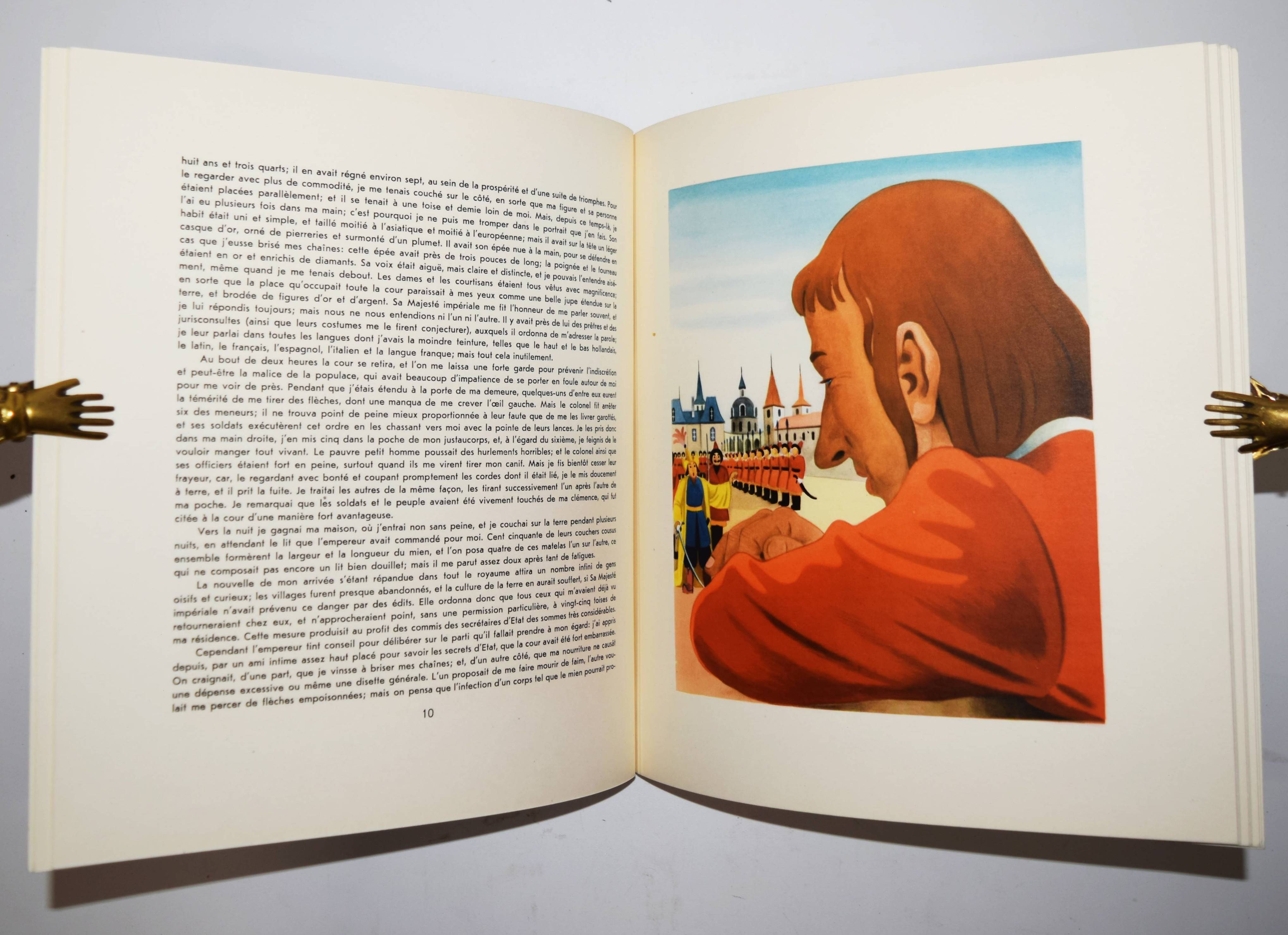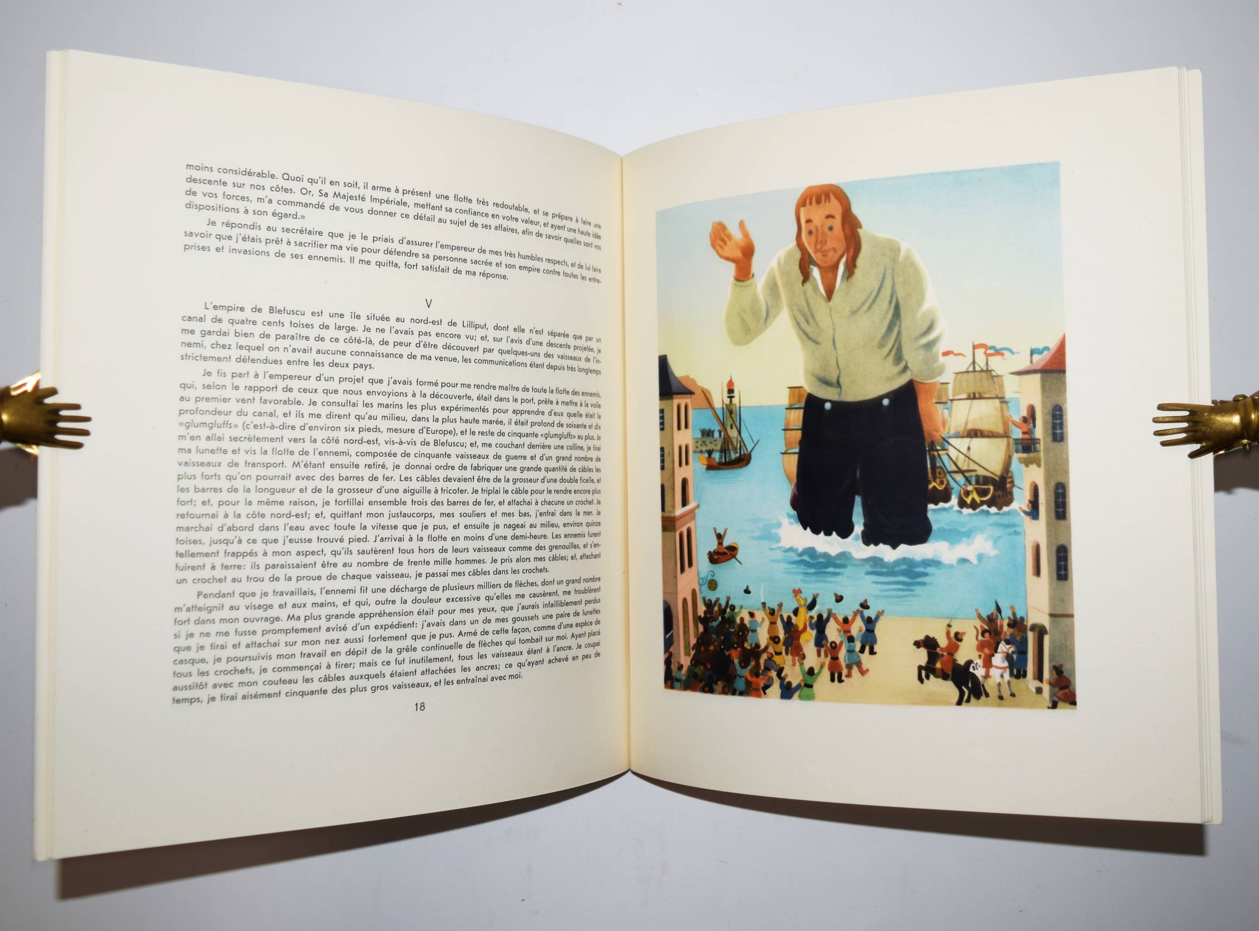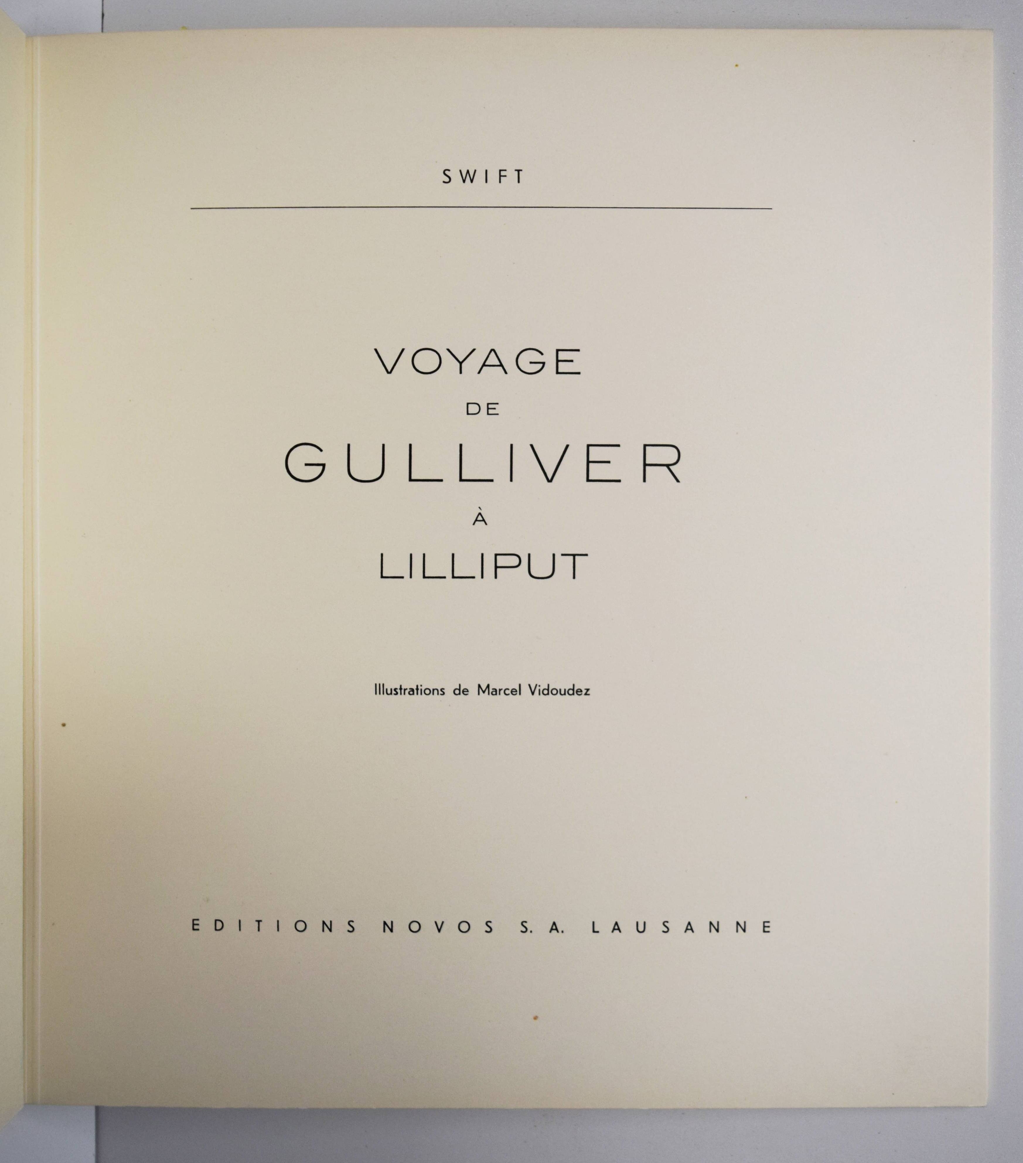 Swift, Jonathan. Voyage de Gulliver à Lilliput. Illustrations de Marcel Vidoudez. Lausanne, Èditions Novos (1945). 4° (26,5 x 25,5 cm.). 28 S. mit 4 Farbtafeln und Illustrationen im Text. Farbig illustr. Orig.-Halbleinenband. SBI 1034 und S. 80. – Erste französische Ausgabe; erschien gleichzeitig mit der deutschen Ausgabe. – Marcel Vidoudez (1900-1968) studierte an der Kunstgewerbeschule in Bern (1916-1918) und an der Ecole des Beaux-Arts in Lausanne und Paris (1920-1924). Er hat zahlreiche Bücher illustriert und auch als Gebrauchsgraphiker gearbeitet. – Sehr gutes sauberes Exemplar.