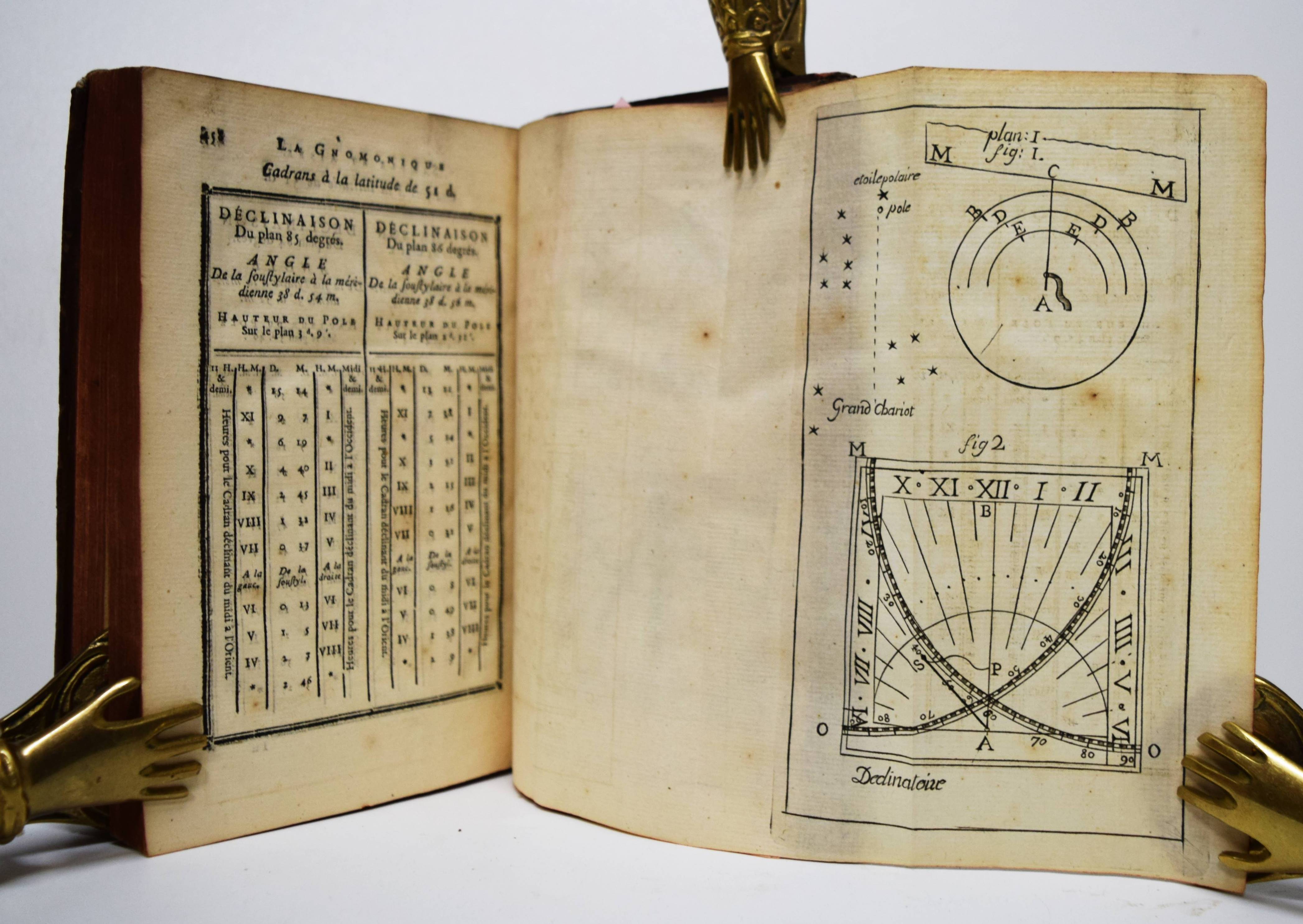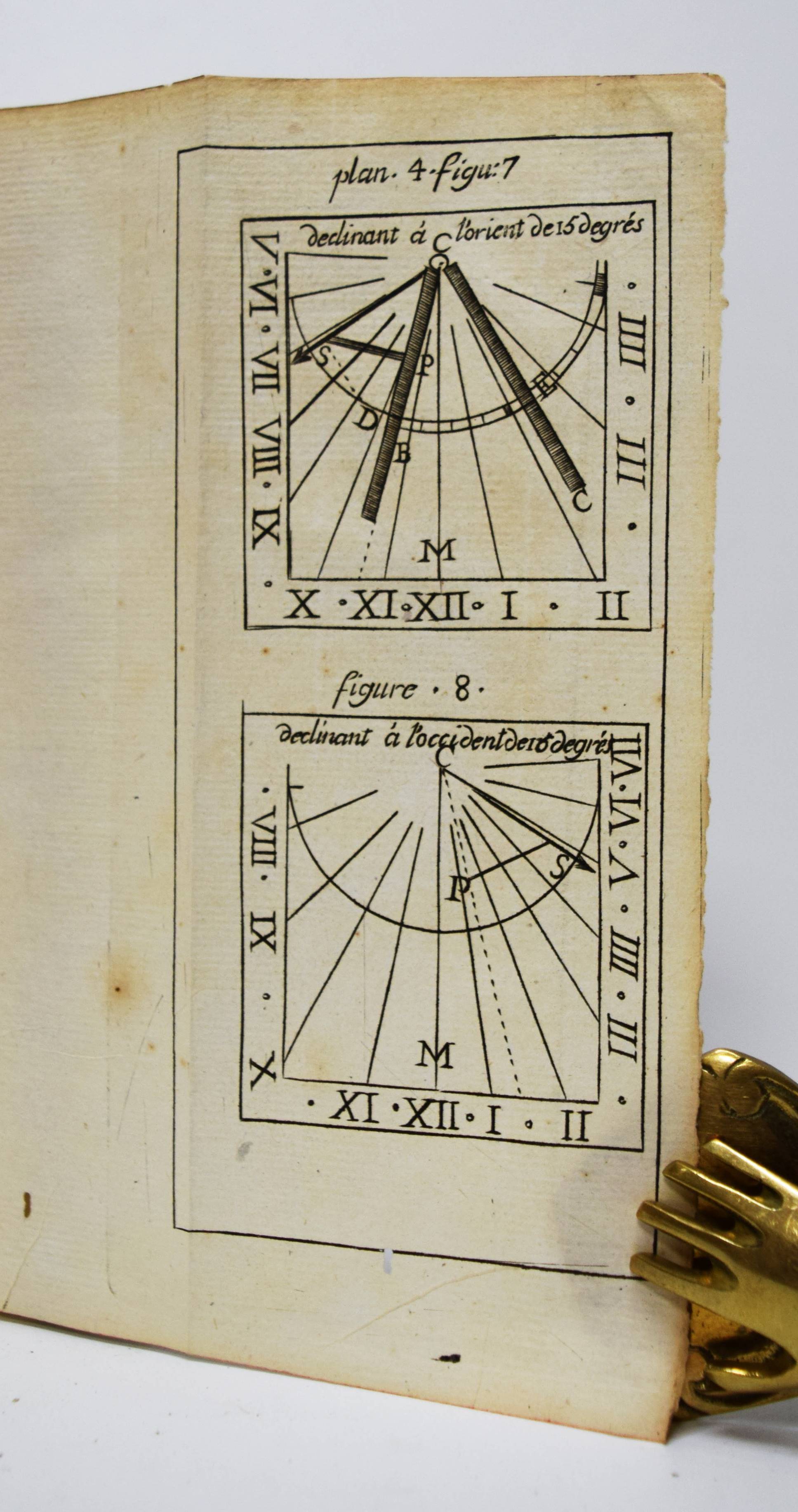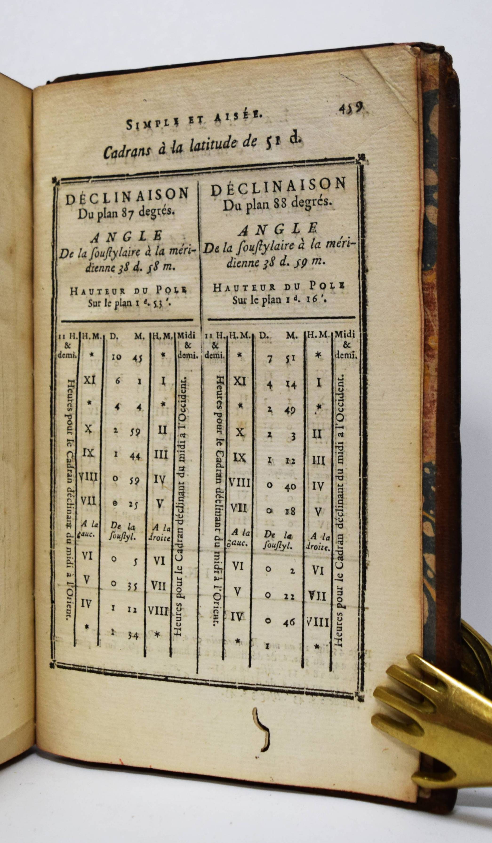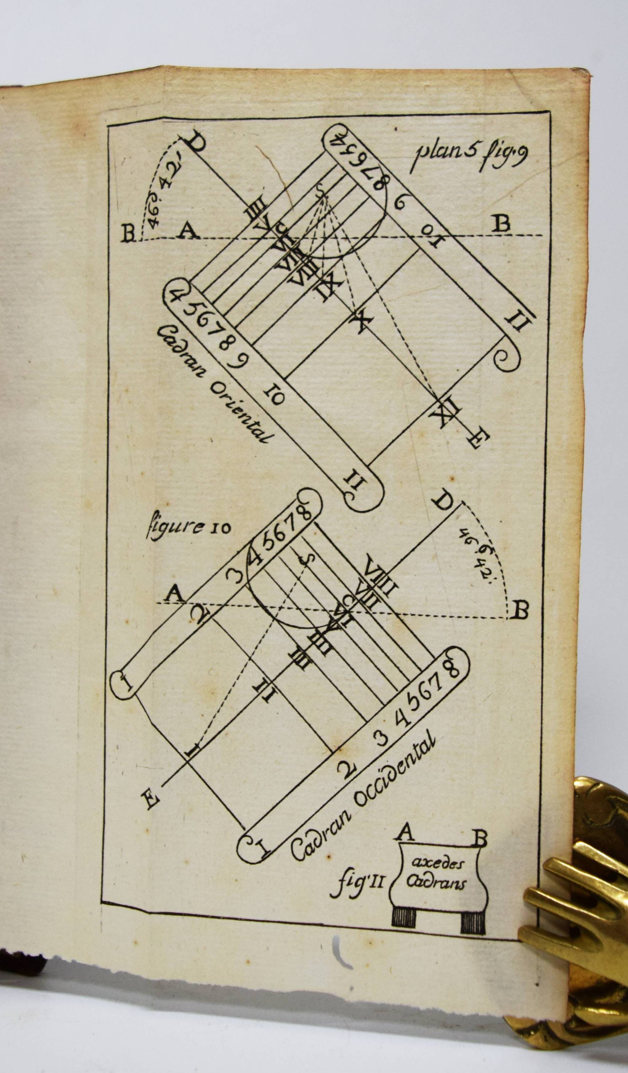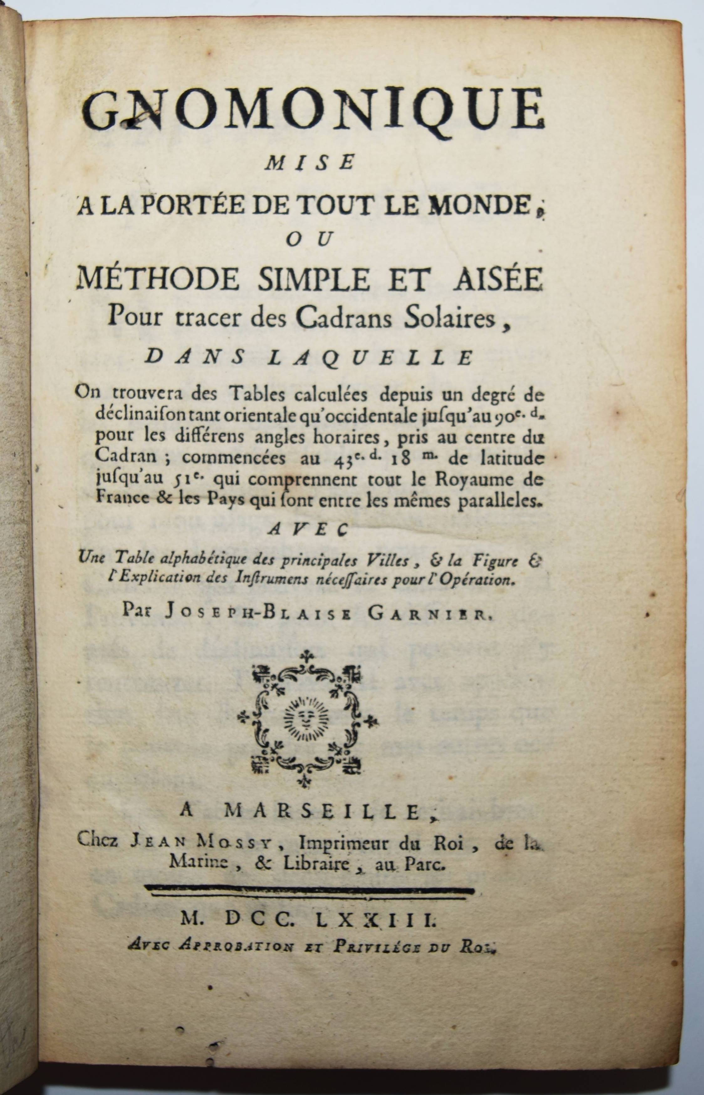 Garnier, Joseph-Blaise. Gnomonique mise à la portée de tout le monde, ou méthode simple et aisée pour tracer des cadrans solaires. Dans laquelle on trouvera des tables calculées depuis un degré de déclinaison tant orientale qu’occidentale jusqu’au 90 degré … Avec une table alphabétique des principales villes, & la fugure & l’explication des instrumens nécessaires pour l’opération. Marseille, Jean Mossy 1773. 8°. X, [1] Bl., 460 S. mit zahlr. Tabellen und 9 Abbildungen auf 5 gefalt. Kupfertafeln. Kalbslederband der Zeit mit goldgepr. Rückenschild und floraler Rückenvergoldung. Houzeau-Lancaster I, 11670. Lalande 535. Quérard III, 264. – Seltener erster Druck der ersten Ausgabe; der zweite Druck erschien bei Vincent in Paris. – Nach 37 Seiten Text folgen die Tabellen und die fünf Kupfertafeln. – Einband teils stärker bestoßen, sonst gut erhalten.