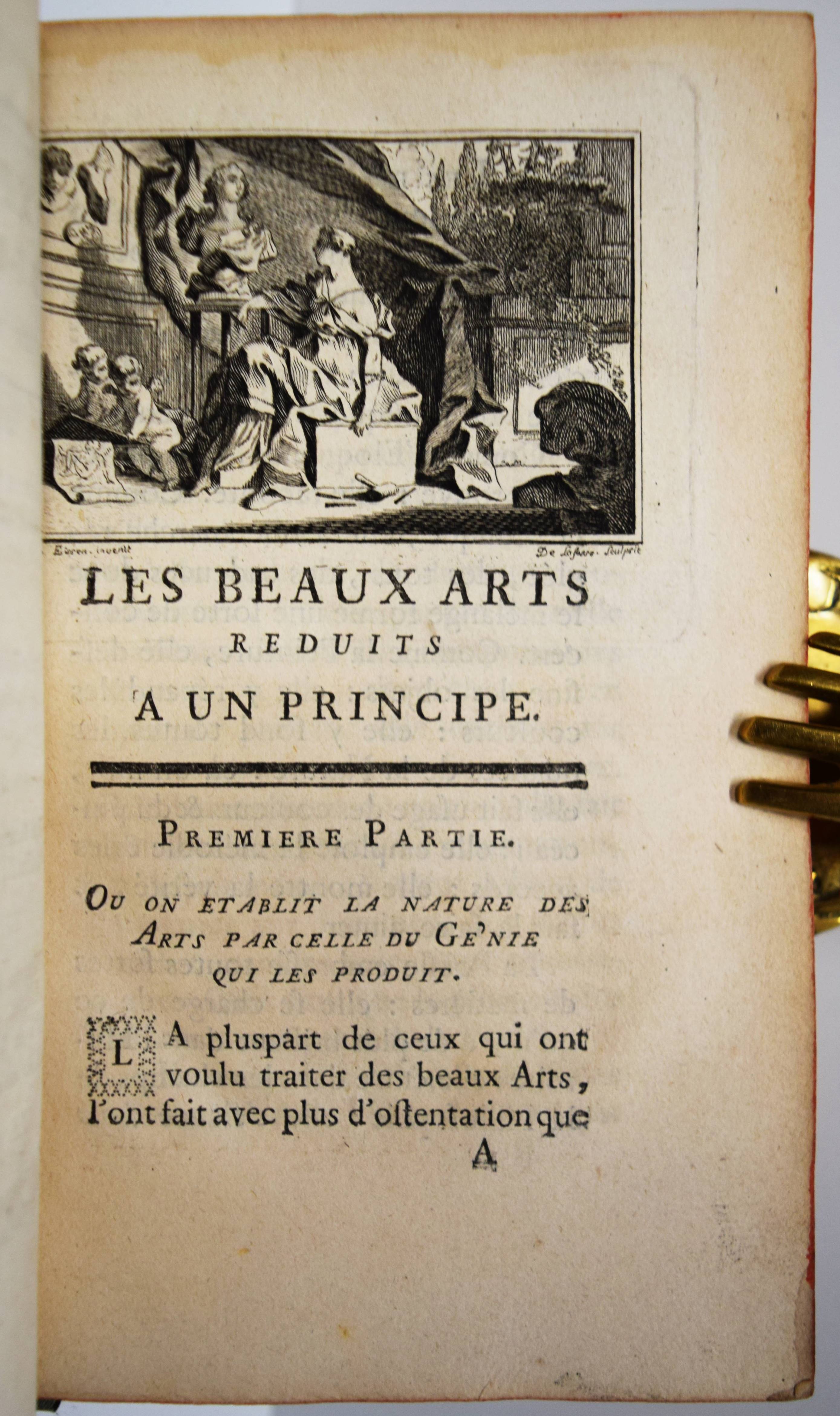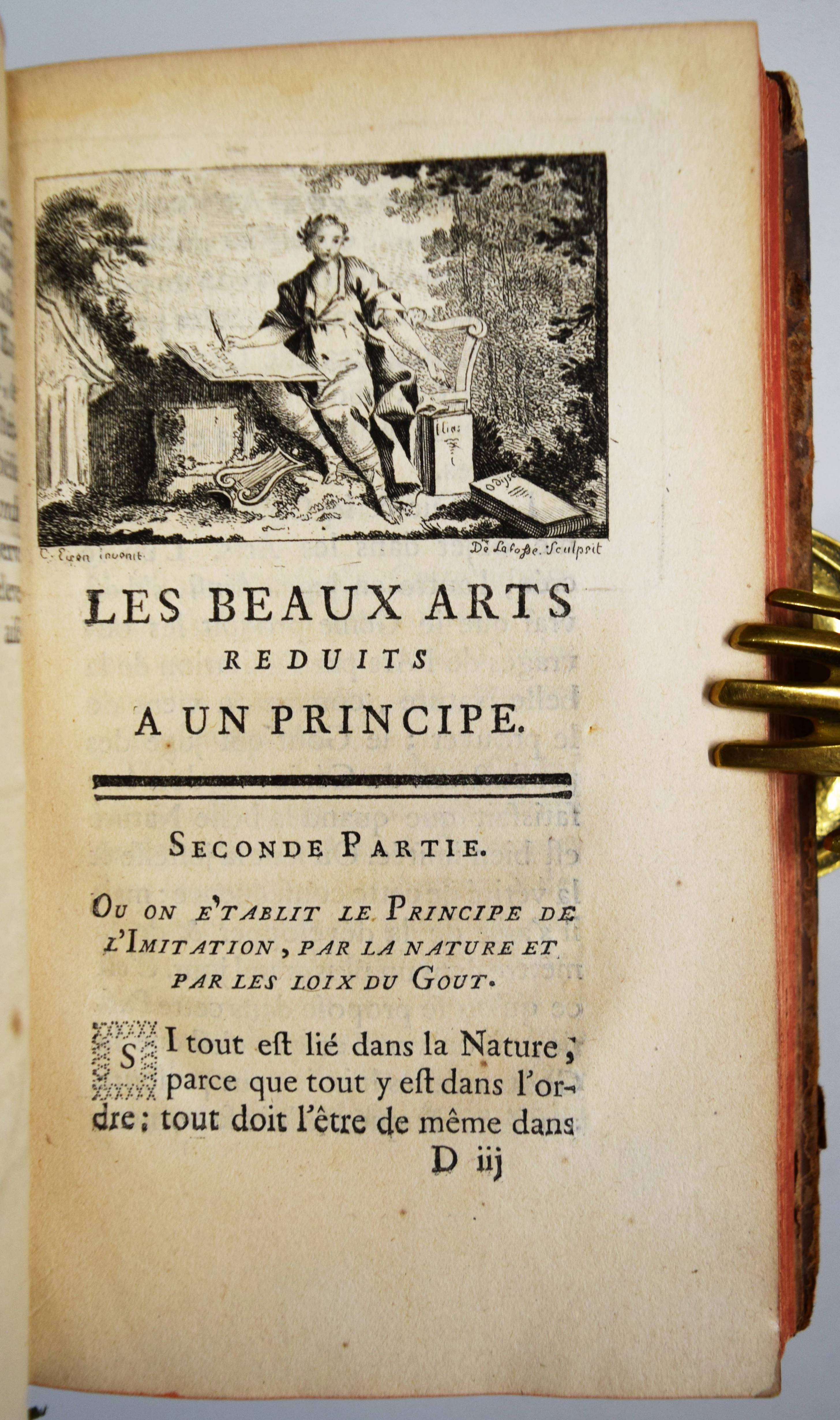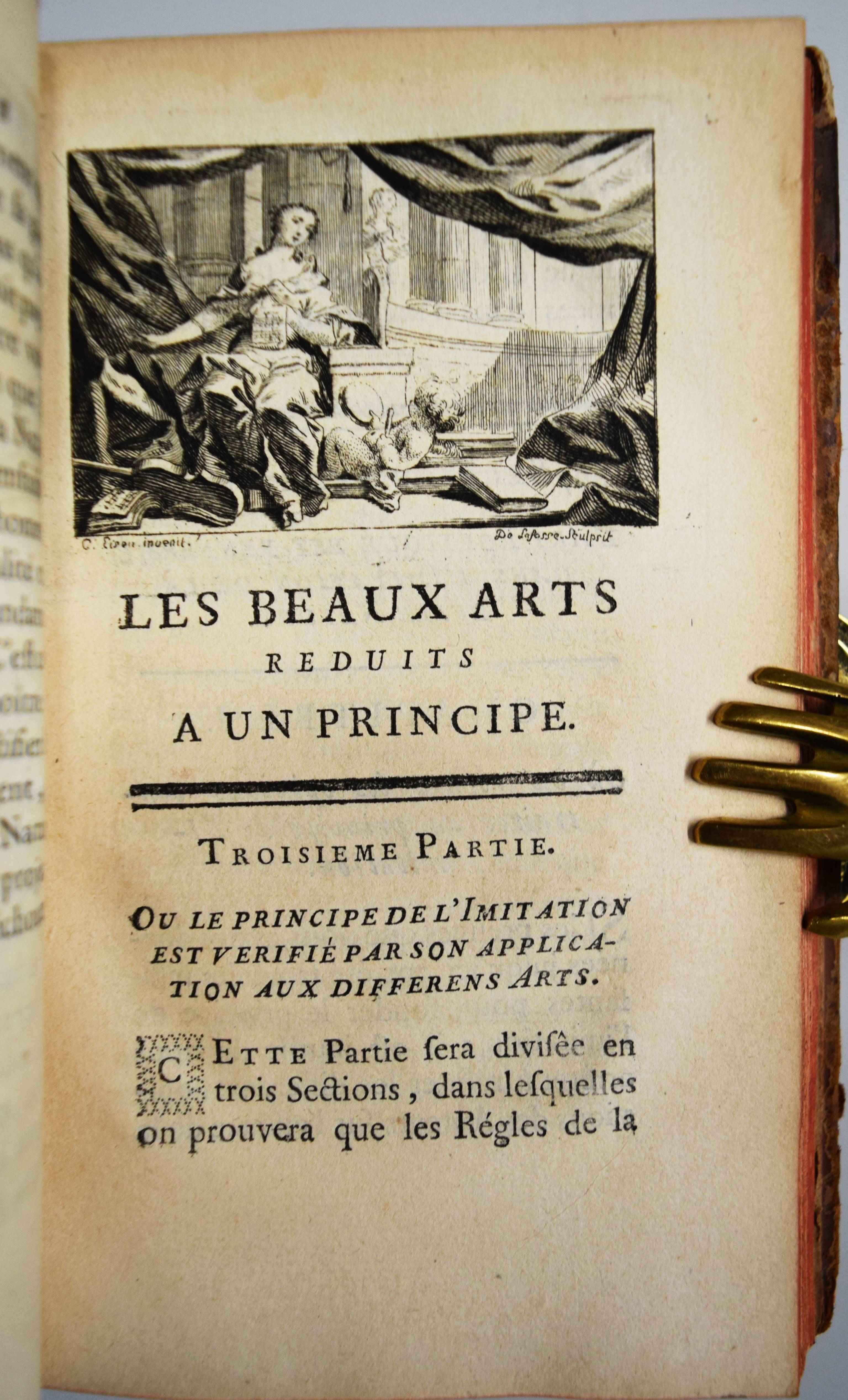 Batteux, (Charles). Les beaux arts réduits à un même principe. Paris, chez Durand 1747. Kl.-8° (1605 x 10 cm.). XIII, (6), 308 S., [7] Bl. mit gestoch. Frontispiz, gestoch. Titelvignette, gestoch. Wappen und 3 gestoch. Vignetten im Text von de Lafosse nach Charles Eisen. Kalbslederband der Zeit mit goldgepr. Rückenschild und floraler Rückenvergoldung. Barbier I, 393 a. – Dritte Ausgabe der Werke des Philosophen und Ästhetizisten Charles Batteux (1713-1780), die einen großen Einfluss auf die Ästhetik von Alexander Gottlieb Baumgarten (1714-1762) hatte. – Einband berieben, vorderes Gelenk stellenweise angeplatzt, sonst gut erhalten.