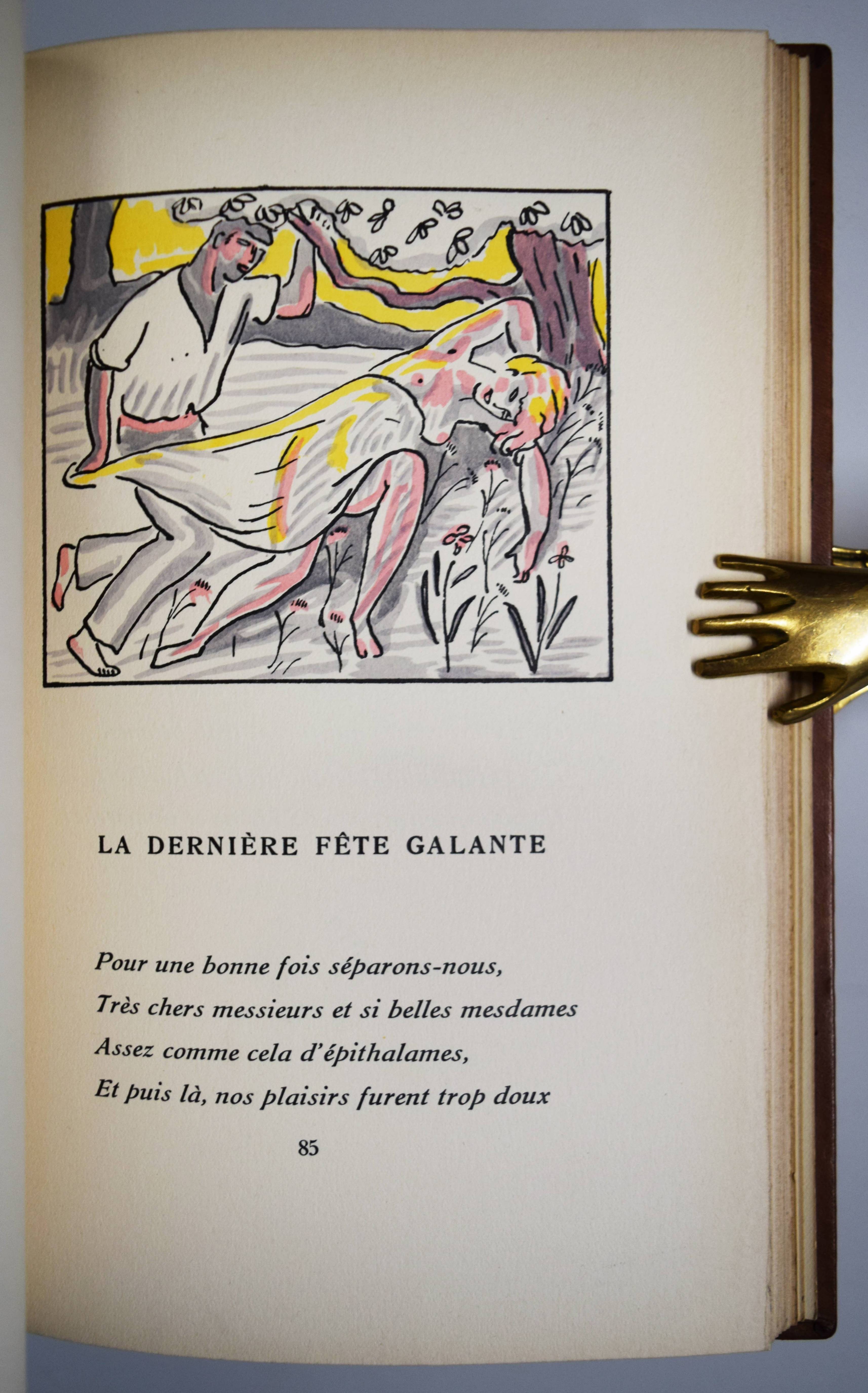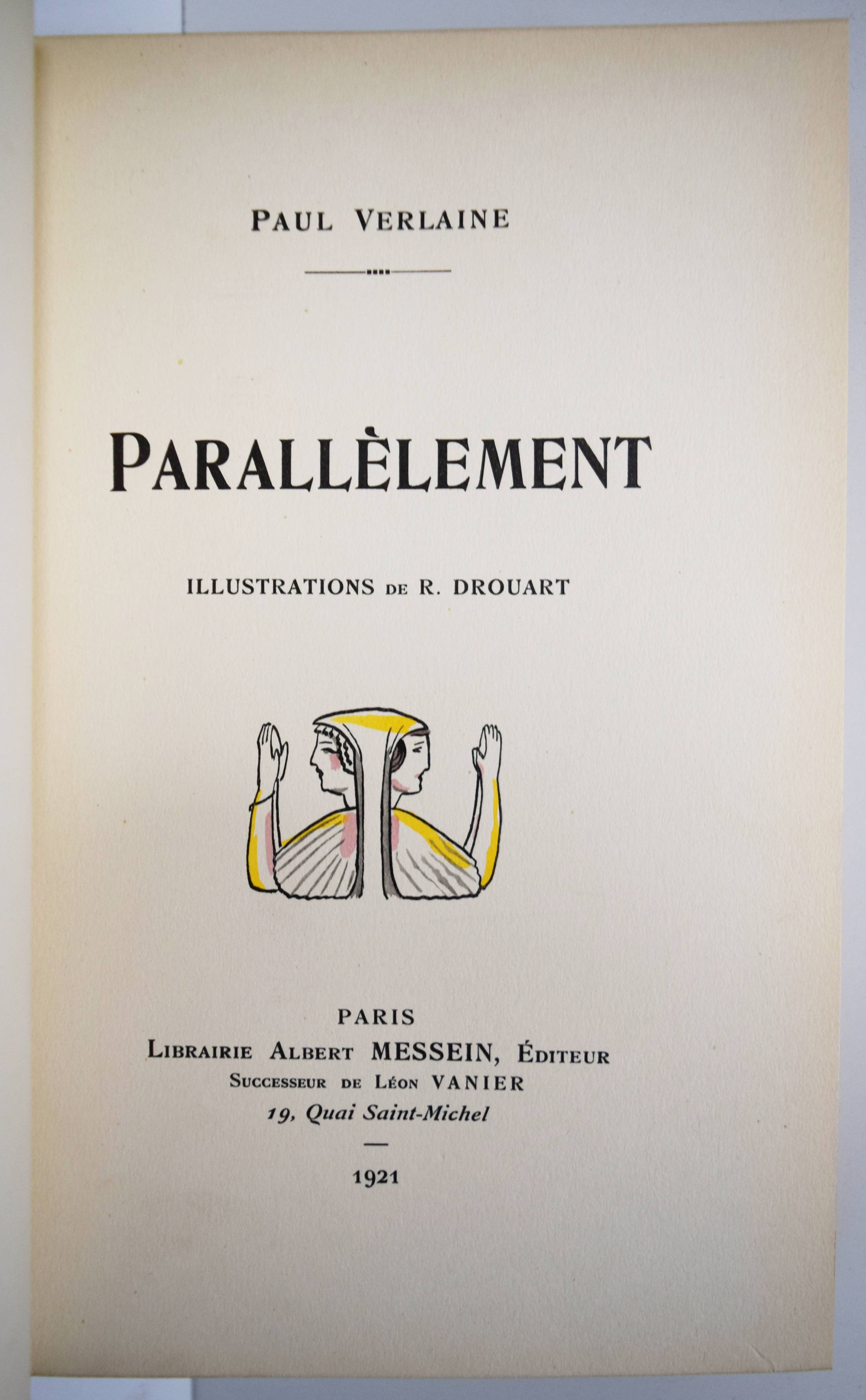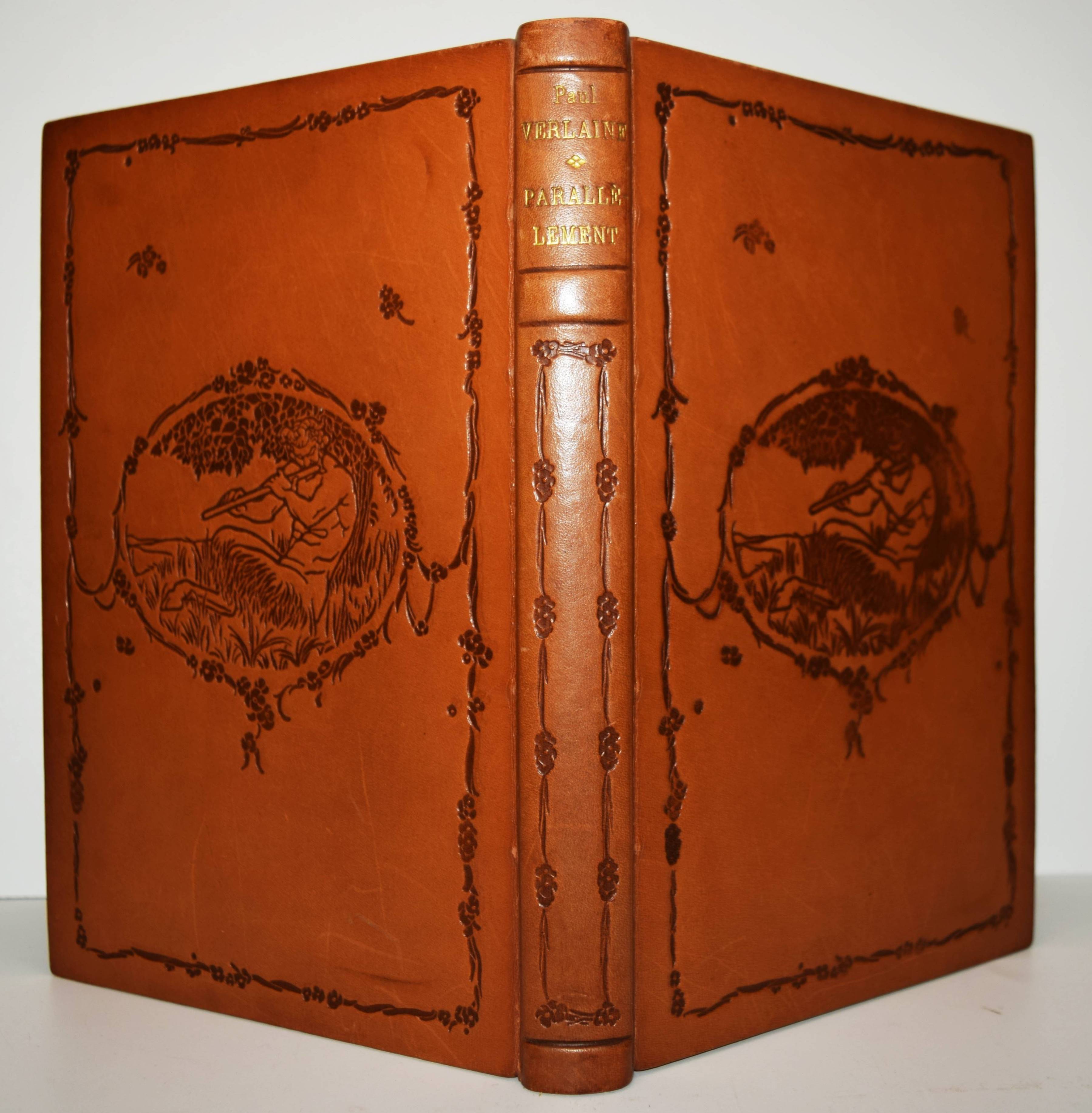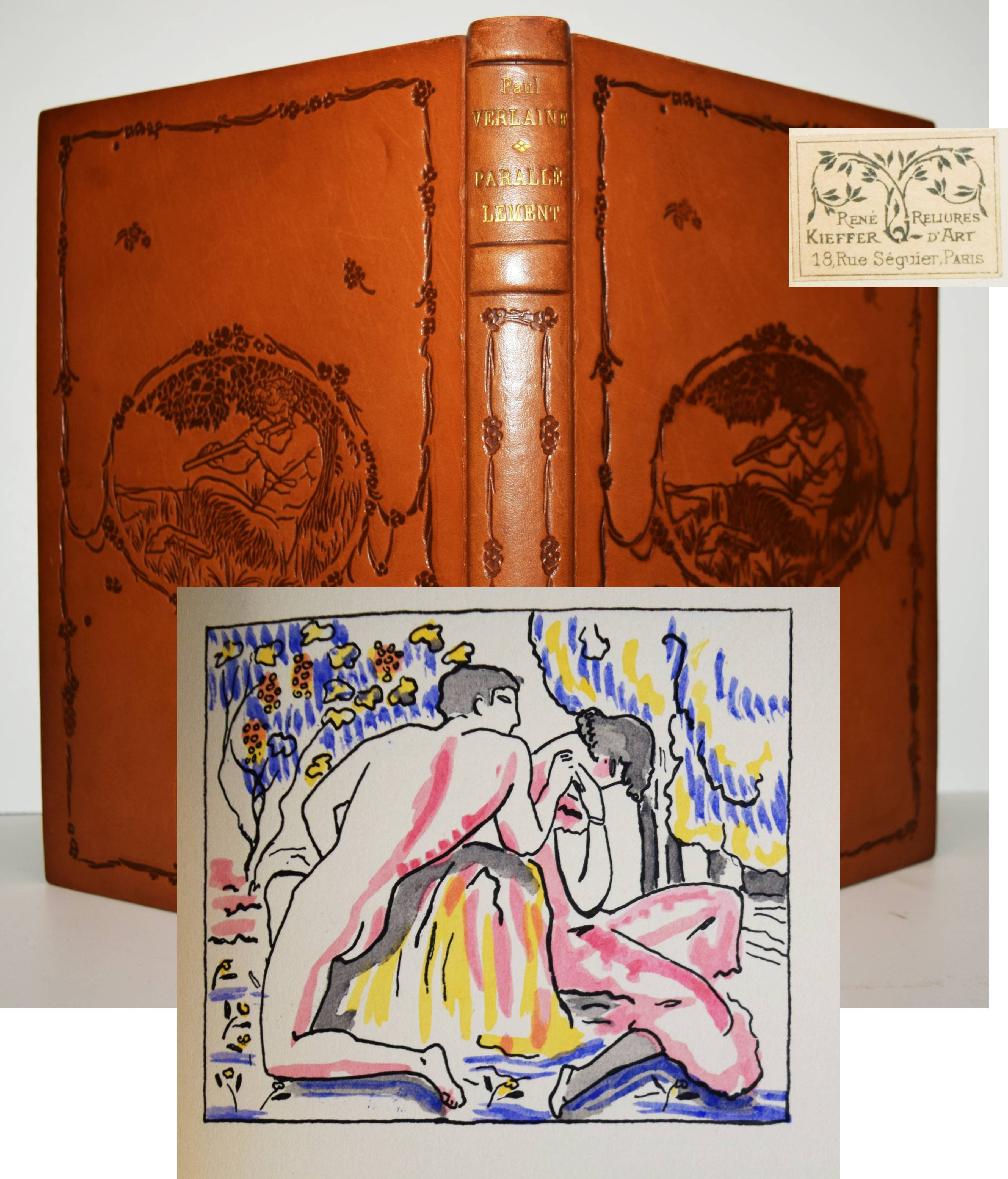 Verlaine, Paul. Parallèlement. Illustrations de R(aphaël) Drouart. Paris, Librairie Albert Messein 1921. Gr.-8° (25,5 x 16,5 cm.). 144 S., [1] Bl. mit 77 pochoir-kolorierten Illustrationen. Kalbslederband mit goldgepr. Rückentitel, blindgepr. Deckelillustration und Kopfgoldschnitt (signiert: René Kieffer, Orig.-Umschlag beigebunden). Eines von 500 num. Exemplaren auf Vélin à la forme (Gesamtauflage 550 Exemplare). – Édition „de luxe qui ne sera jamais réimprimée“. – Reliure en plein chargin à gros grain marron signée René Kieffer. Dos à nerfs, portant titre et auteur en lettres dorées et des motifs pressés à froid. Plats orné d’un décor à froid illustrant un satyre jouant de la flûte.