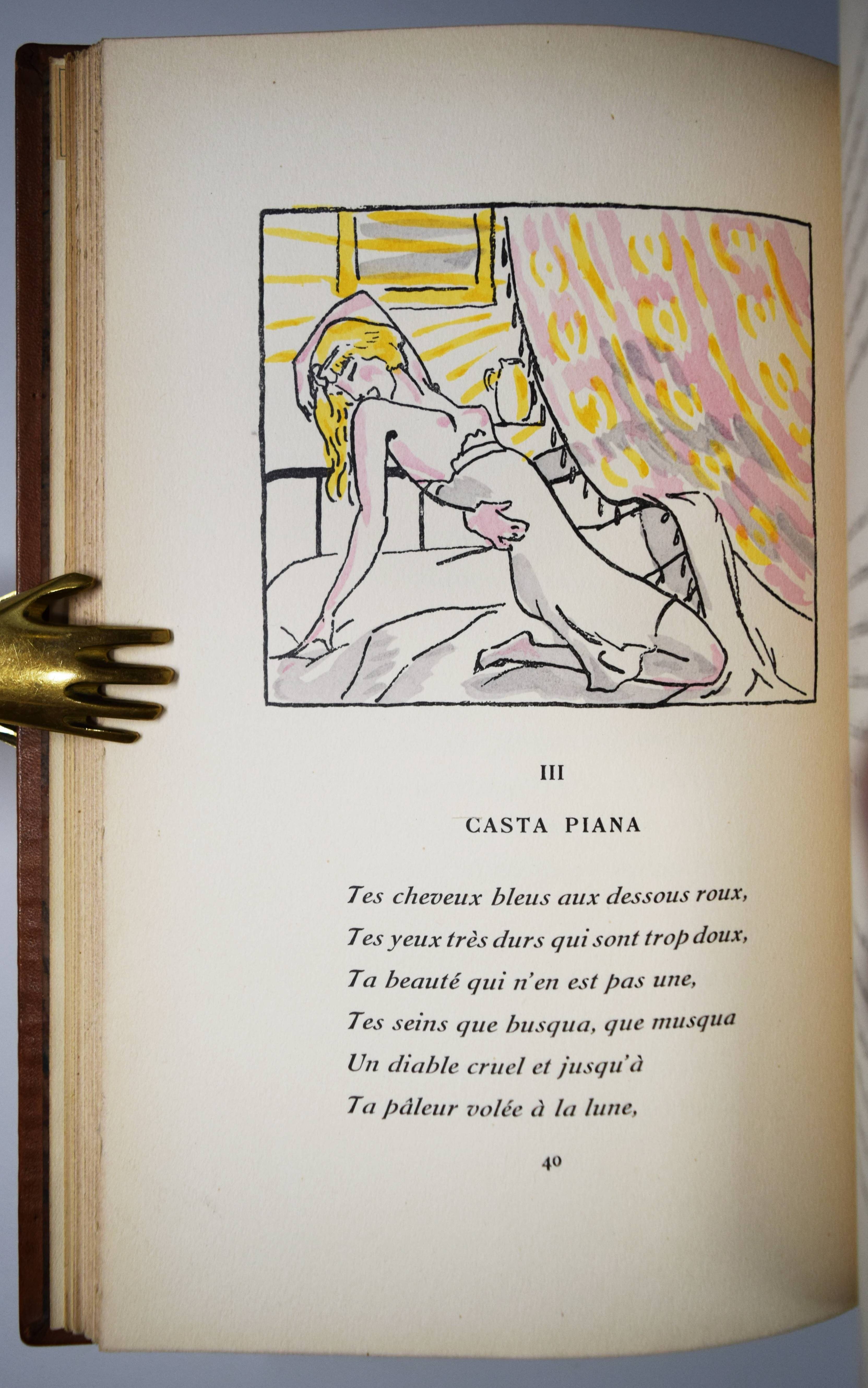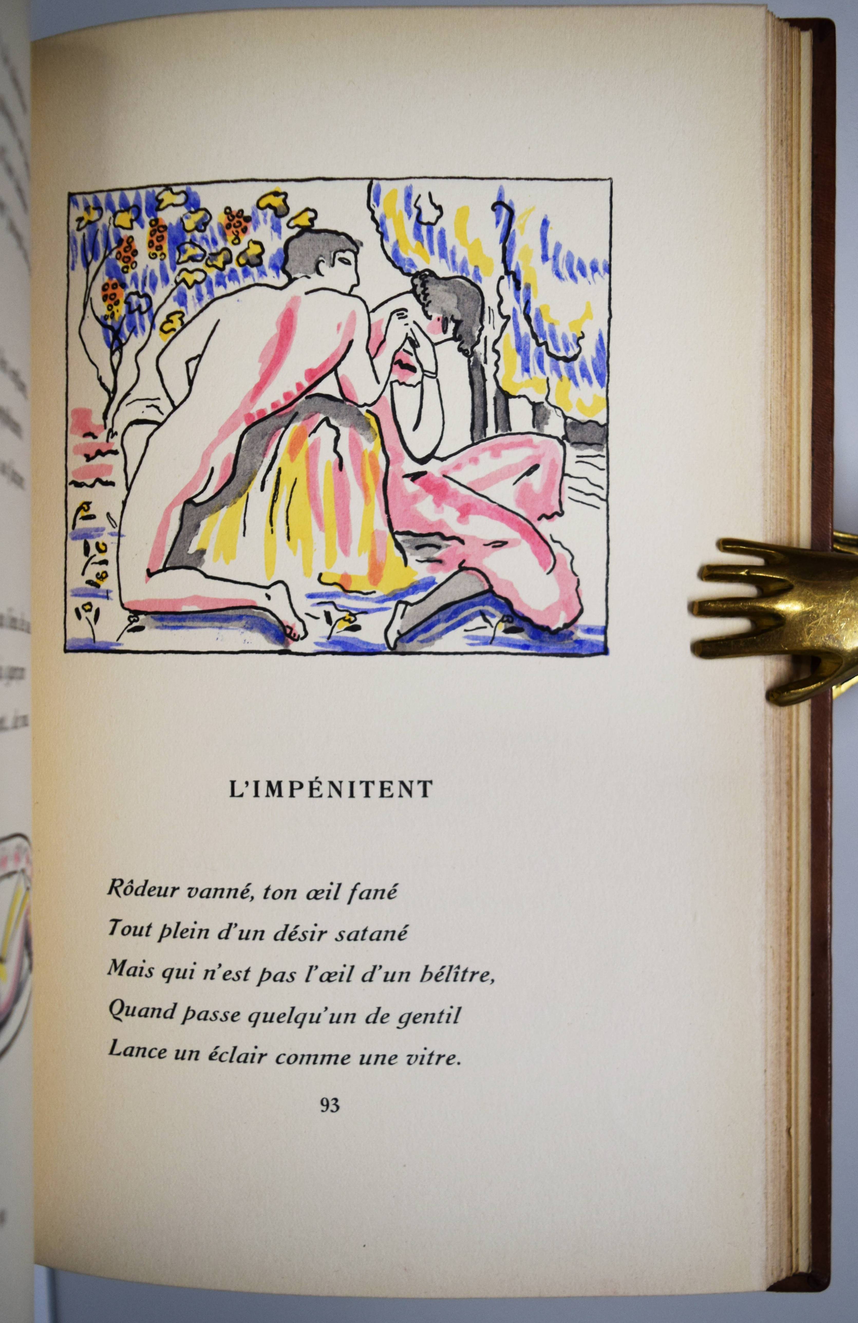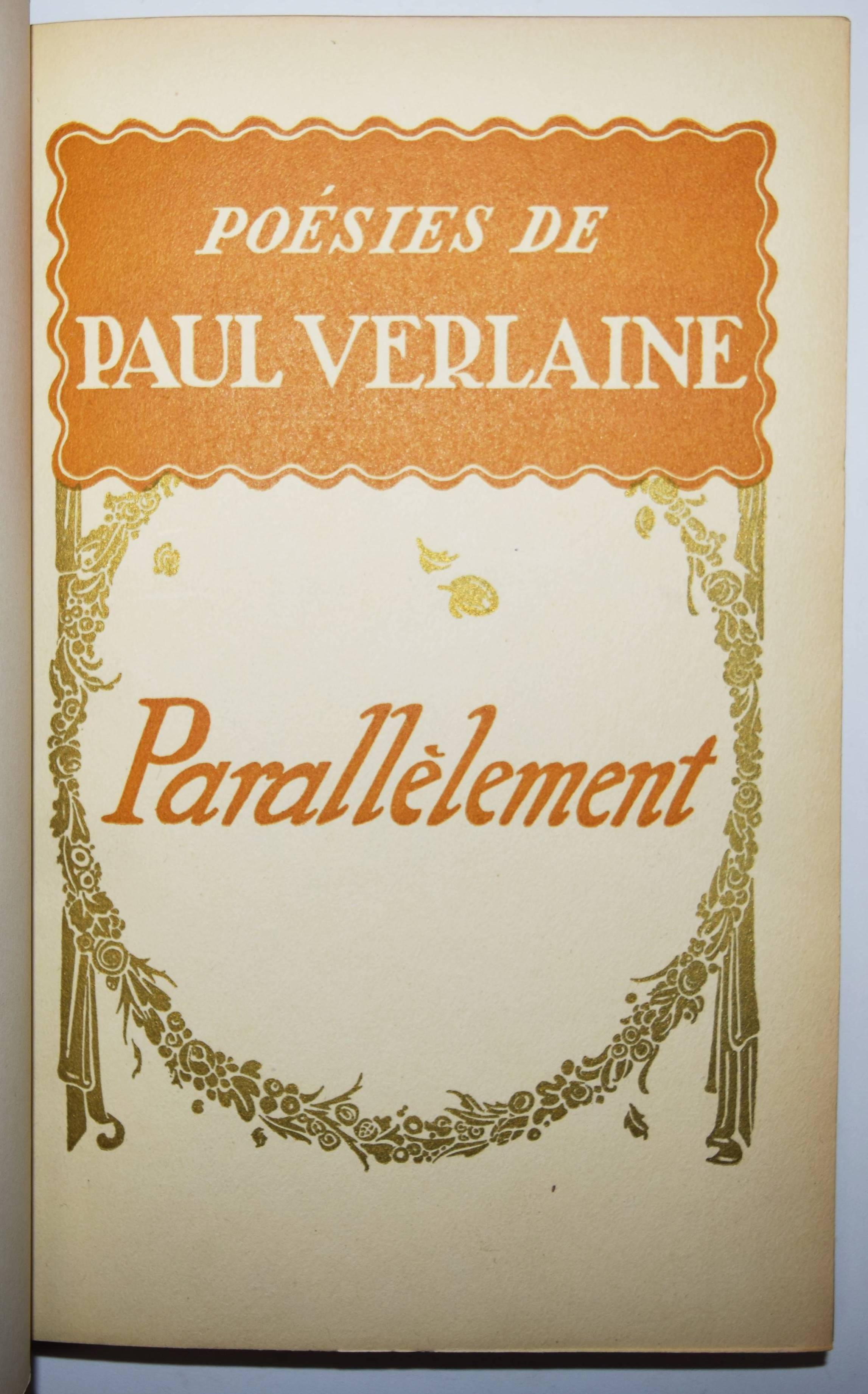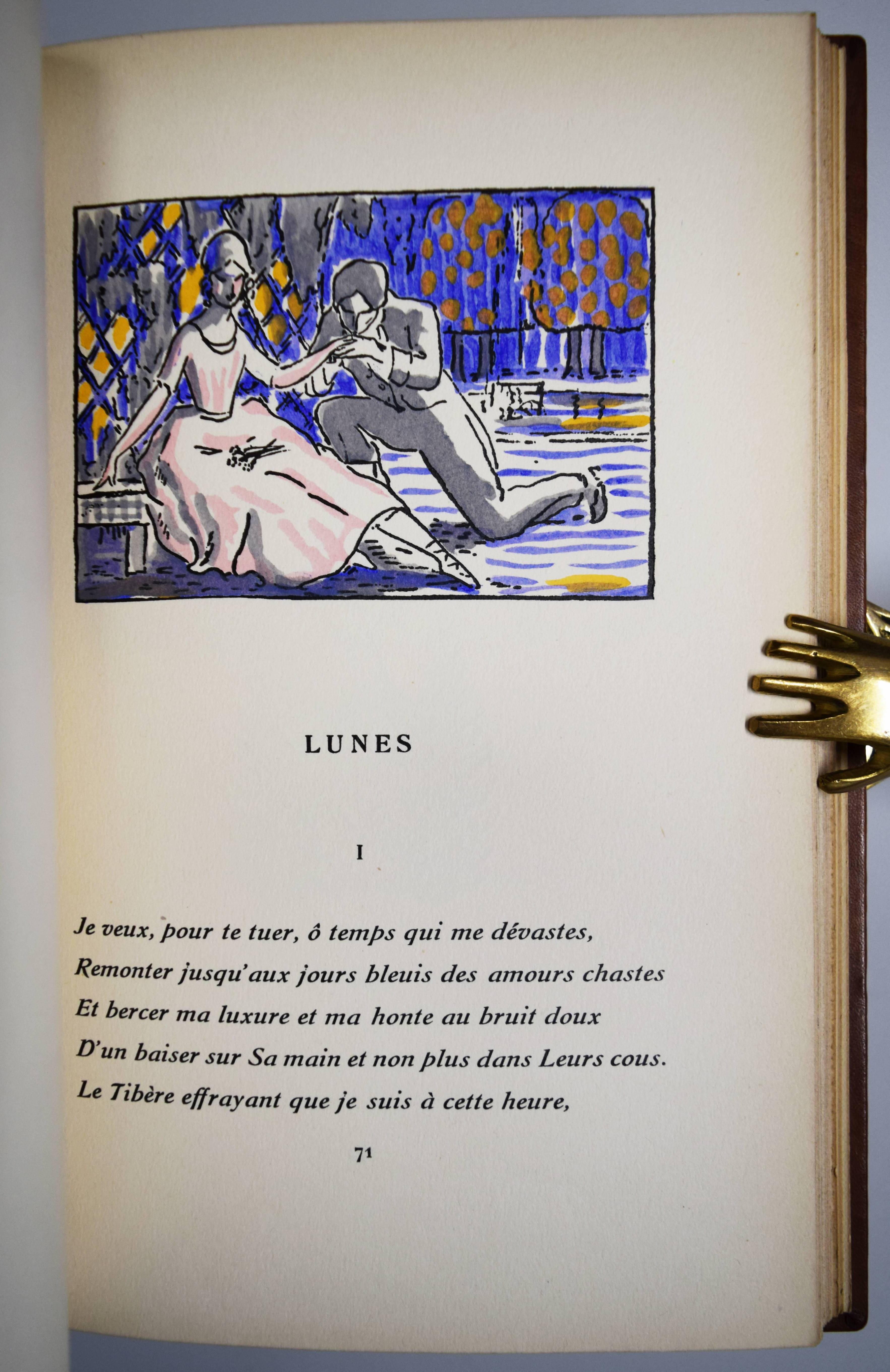 Verlaine, Paul. Parallèlement. Illustrations de R(aphaël) Drouart. Paris, Librairie Albert Messein 1921. Gr.-8° (25,5 x 16,5 cm.). 144 S., [1] Bl. mit 77 pochoir-kolorierten Illustrationen. Kalbslederband mit goldgepr. Rückentitel, blindgepr. Deckelillustration und Kopfgoldschnitt (signiert: René Kieffer, Orig.-Umschlag beigebunden). Eines von 500 num. Exemplaren auf Vélin à la forme (Gesamtauflage 550 Exemplare). – Édition „de luxe qui ne sera jamais réimprimée“. – Reliure en plein chargin à gros grain marron signée René Kieffer. Dos à nerfs, portant titre et auteur en lettres dorées et des motifs pressés à froid. Plats orné d’un décor à froid illustrant un satyre jouant de la flûte.