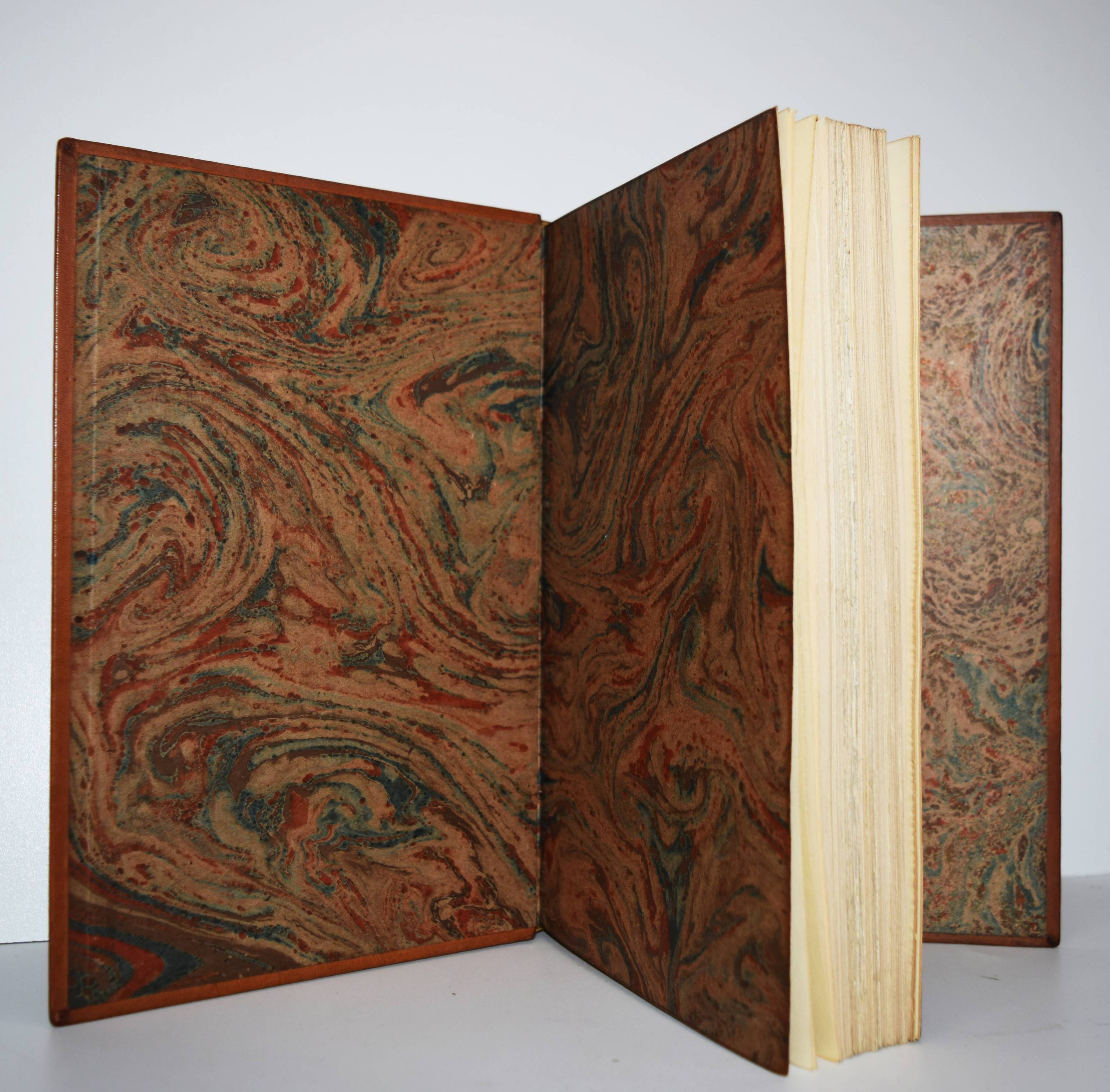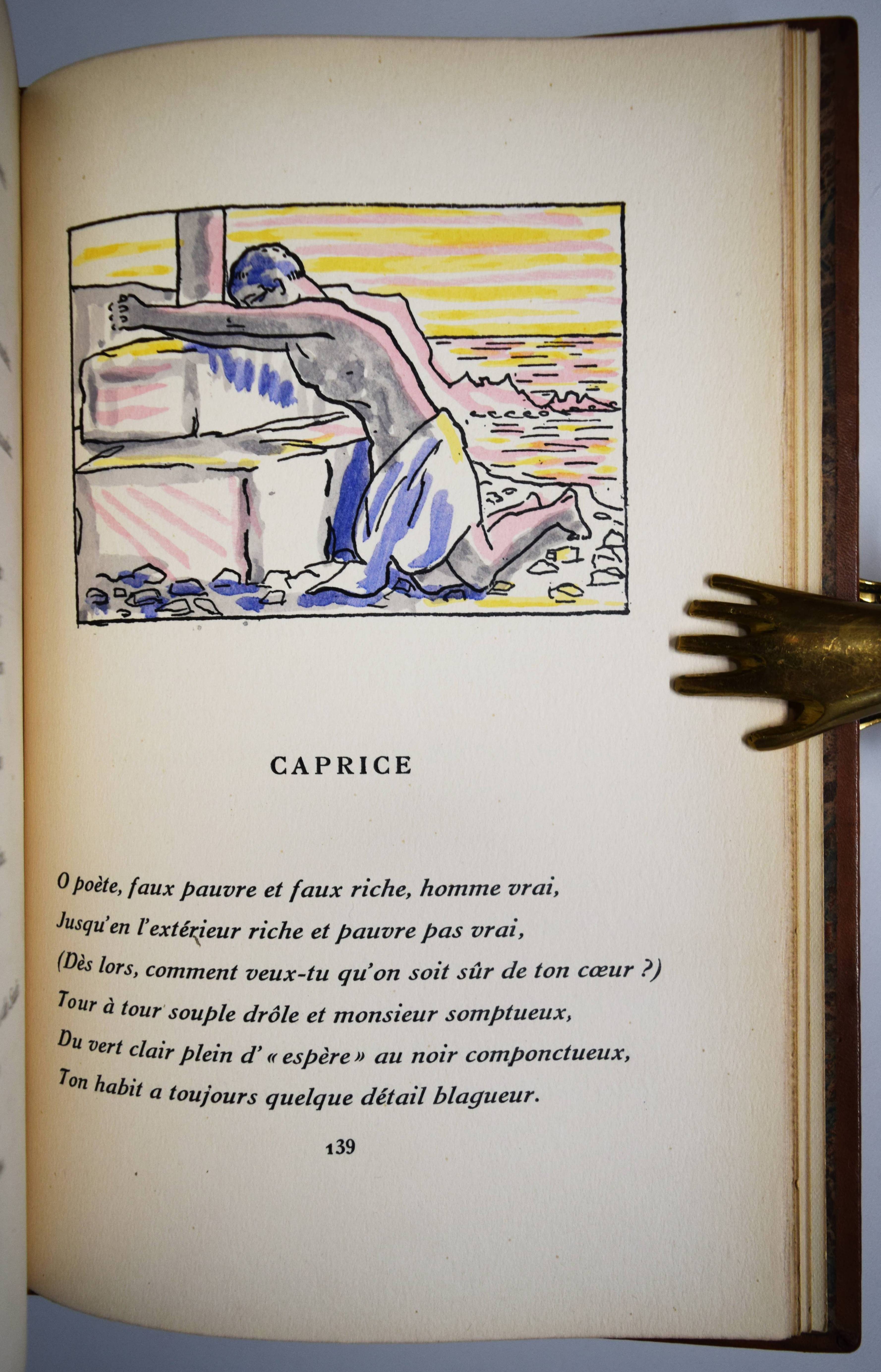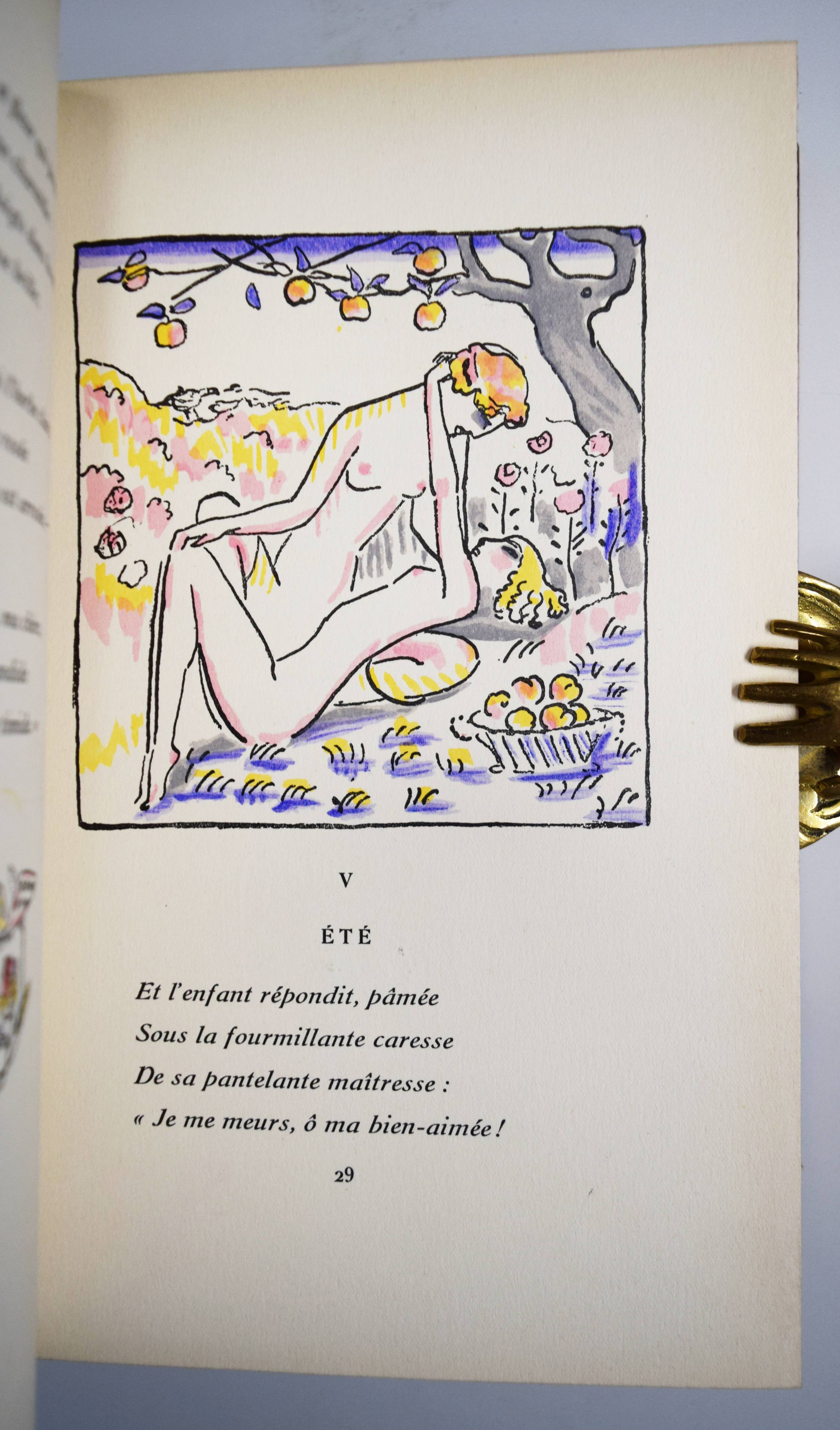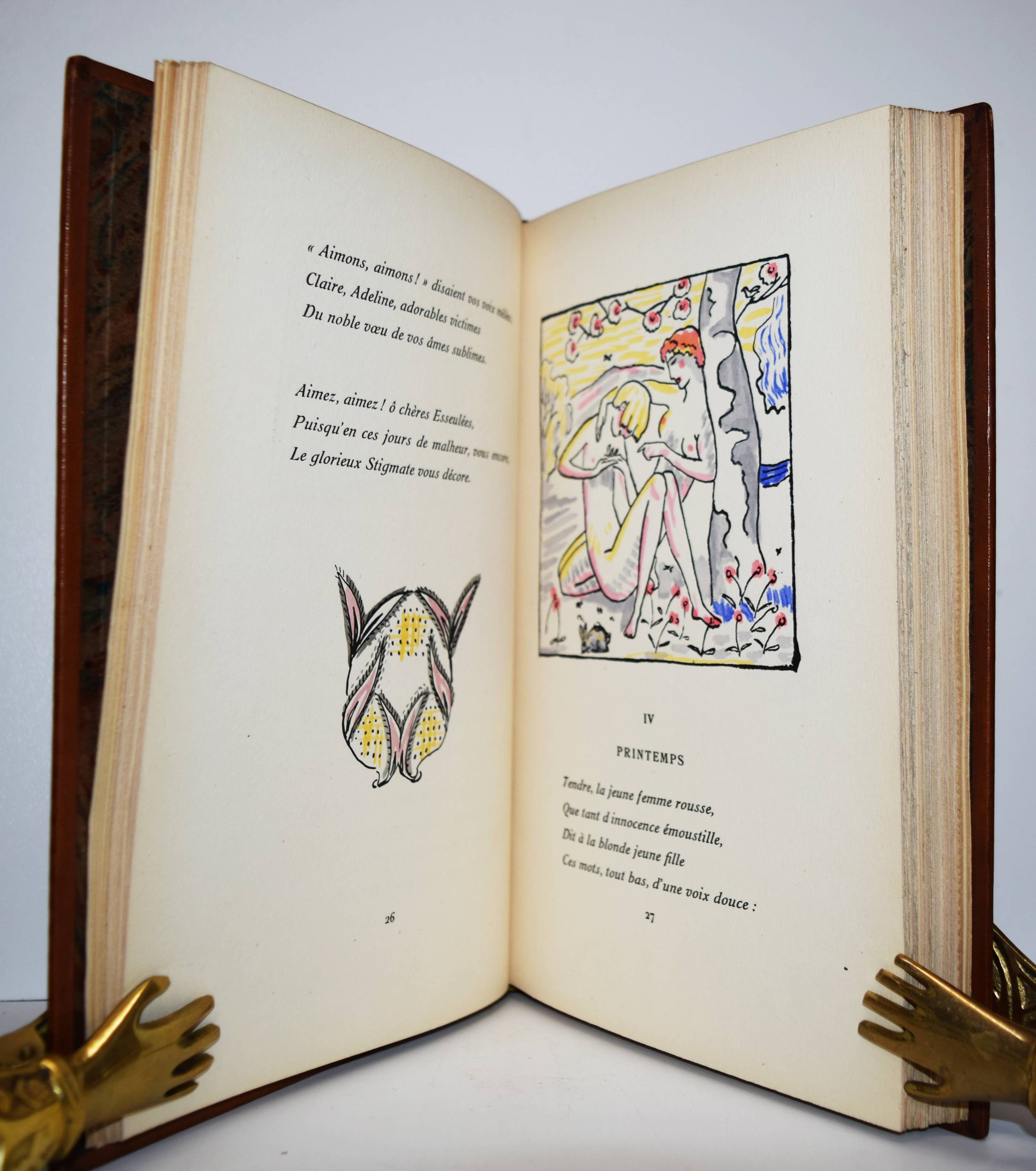 Verlaine, Paul. Parallèlement. Illustrations de R(aphaël) Drouart. Paris, Librairie Albert Messein 1921. Gr.-8° (25,5 x 16,5 cm.). 144 S., [1] Bl. mit 77 pochoir-kolorierten Illustrationen. Kalbslederband mit goldgepr. Rückentitel, blindgepr. Deckelillustration und Kopfgoldschnitt (signiert: René Kieffer, Orig.-Umschlag beigebunden). Eines von 500 num. Exemplaren auf Vélin à la forme (Gesamtauflage 550 Exemplare). – Édition „de luxe qui ne sera jamais réimprimée“. – Reliure en plein chargin à gros grain marron signée René Kieffer. Dos à nerfs, portant titre et auteur en lettres dorées et des motifs pressés à froid. Plats orné d’un décor à froid illustrant un satyre jouant de la flûte.