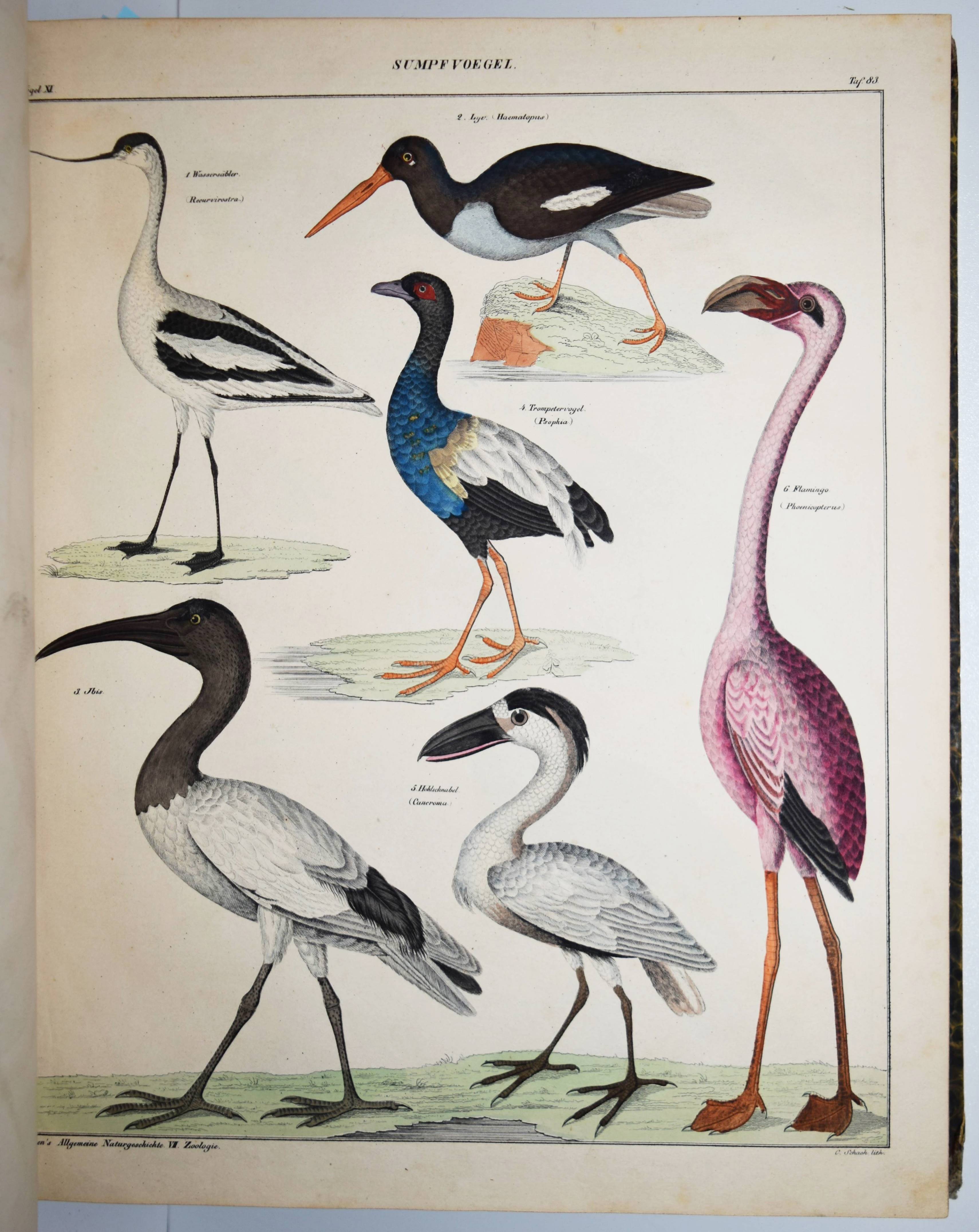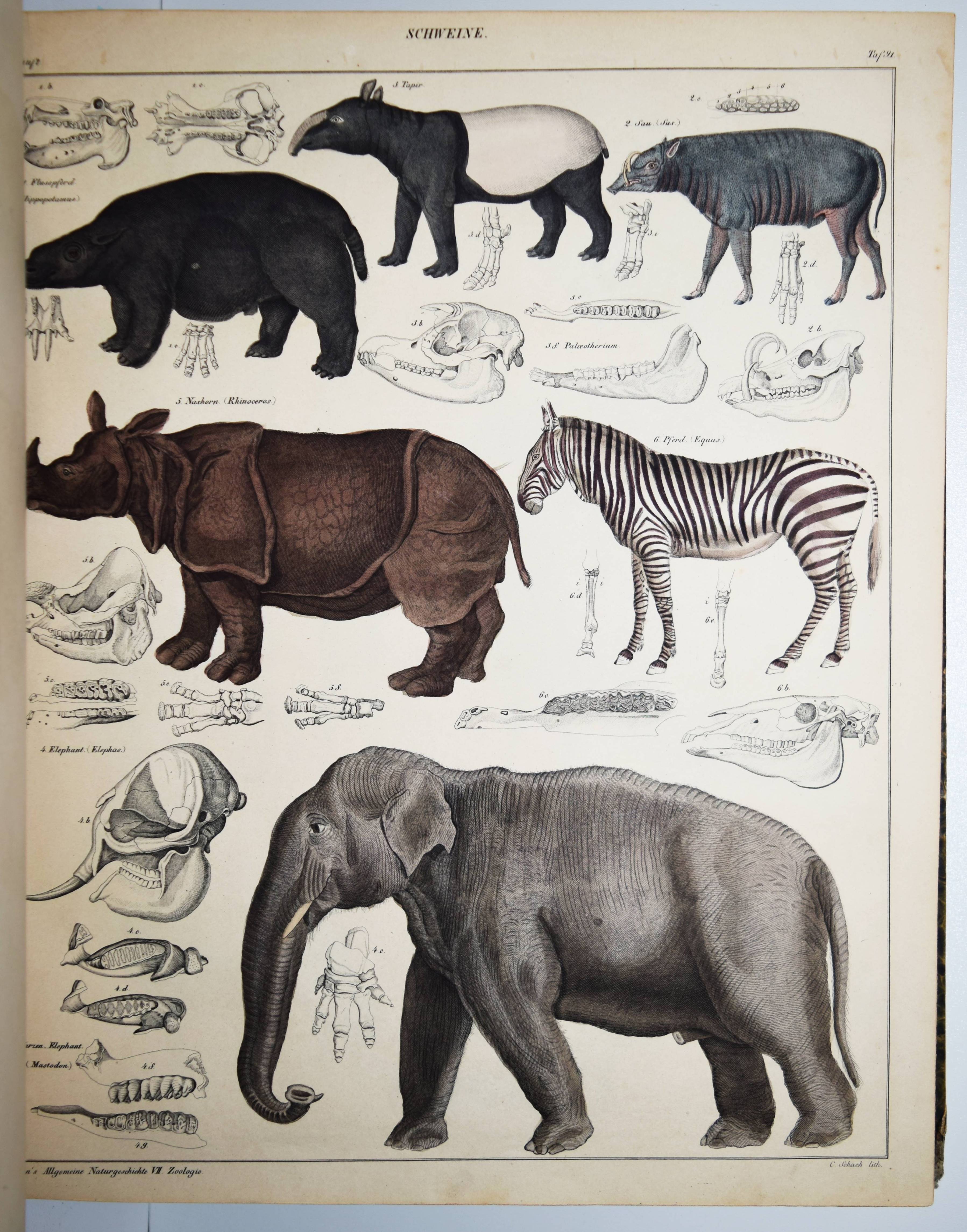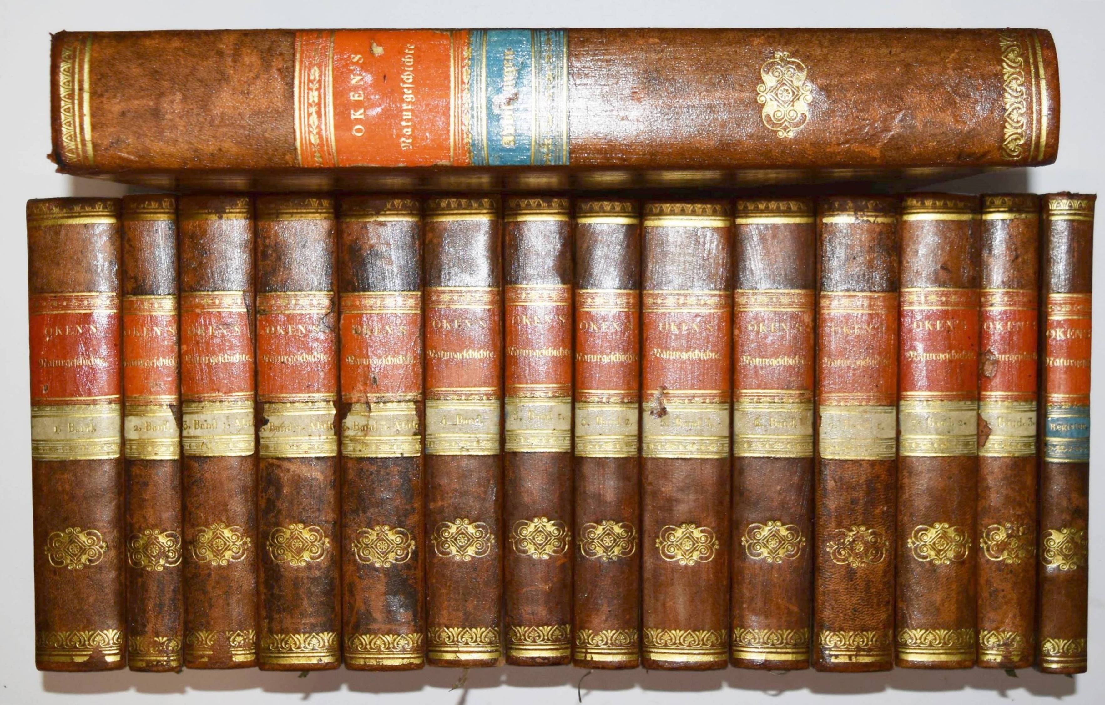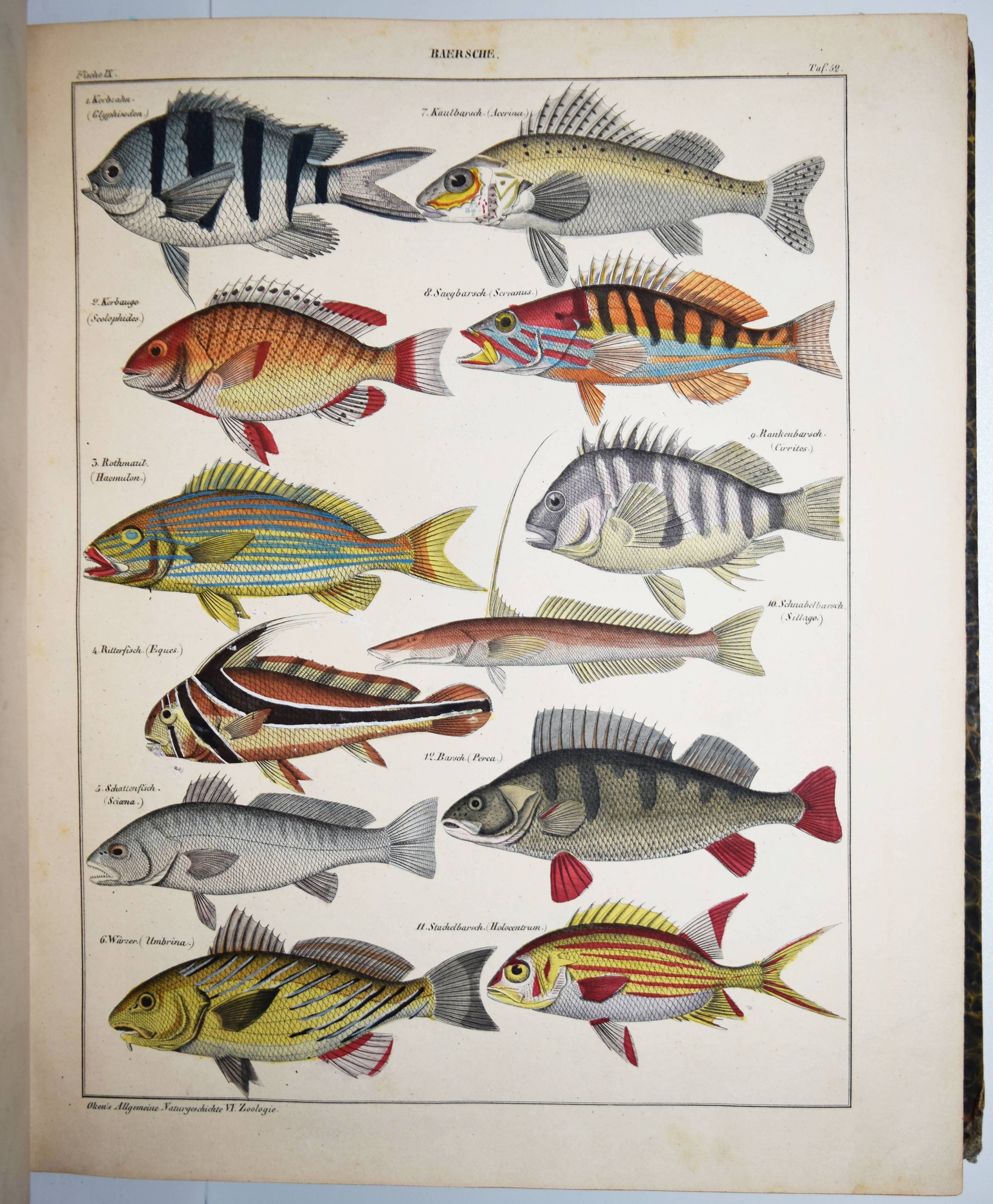 Oken, (Lorenz). Allgemeine Naturgeschichte für alle Stände. 7 Textbände in 14 (inkl. Registerband) und Tafelband (zus. 15 Bände). Stuttgart, Hoffmann 1838-1843. 8° (21 x 14 cm.) und Folio (35 x 29 cm.). Mit lithogr. illustr. Titel und 164 (132 handkolorierte) lithogr. Tafeln. Halblederbände der Zeit mit zweifarbigen goldgepr. Rückenschildern und Rückenvergoldung. ADB XXIV, 216 ff. Anker 375. Graesse V, 16. Horn-Schenkling 16535. Nissen, ZBI 3006. – Erste Ausgabe. – I. Mineralogie und Geognosie bearbeitet von F. A. Walchner. – II. und III., 1-3. Botanik. – IV. bis VII. Thierreich. – Registerband. – Tafelband mit Tafeln zur Mineralogie, Botanik, Anatomie und Zoologie, mit schönen Abbildungen von Fischen, Schmetterlingen, Vögeln u. a., deren Darstellung geht auf vergleichbare Sachbücher zurückgeht und die noch in der Tradition von Sammlerkabinetten steht. – „Seine große Naturgeschichte ist wohl das letzte Werk, in welchem ein und derselbe Verfasser die ganze Naturgeschichte erschöpfend behandelt. Sie ist eine weitere große Leistung Oken’s; denn wenn man auch zweifelhaft sein kann, ob das darin enthaltene Naturphilosophische anregend und befruchtend gewirkt hat, so ist doch der specielle Theil so reichhaltig und dabei so klar und faßlich behandelt, daß das vielverbreitete Werk oft und gern zu Rathe gezogen, „viel mehr benutzt als citirt wurde“. Von der Naturgeschichte des Mineralreichs stammt nur die allgemeine Einleitung aus Oken’s Feder. O. hatte schon 1809 eine eigene Classification der Mineralien aufgestellt, von der wenigstens die obersten Eintheilungen vielfach angenommen wurden. Die Botanik und Zoologie ist ganz Oken’s eigene Arbeit. Bei beiden geht dem speciellen, ausführlichen Theile eine allgemeine Einleitung voraus, welche vergleichende und descriptive Anatomie, Physiologie, Principien der Classification, geographische Verbreitung, Geschichte u. s. w. enthält. In der Einleitung zur Zoologie findet sich eine überaus klar und verständlich geschriebene, populäre Anatomie des Menschen. Als ein wirkliches Verdienst Oken’s gilt es, daß er vornehmlich in der Classification neben Fremdwörtern deutsche Termini nicht nur für Arten und Gattungen, sondern auch für die höheren Abtheilungen einführte“ (A. Lang in ADB). – Einbände etwas berieben und bestoßen, Tafel 57 (Fisch-Anatomie) mit restauriertem Eckabriß (minimaler Bildverlust), stellenweise etwas braunfleckig, sehr gutes dekorativ gebundenes Exemplar, vollständig mit dem Register- und Tafelband selten.