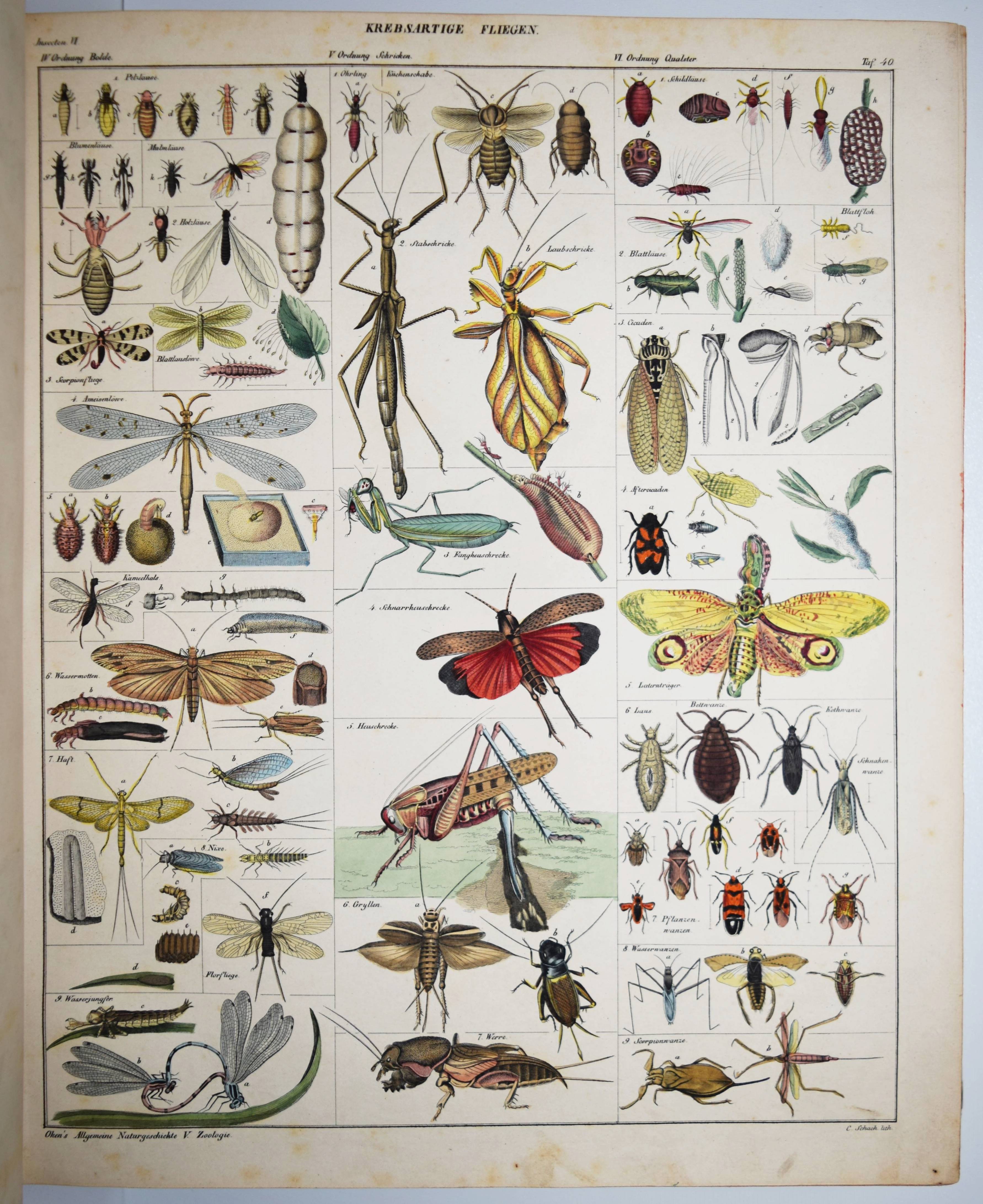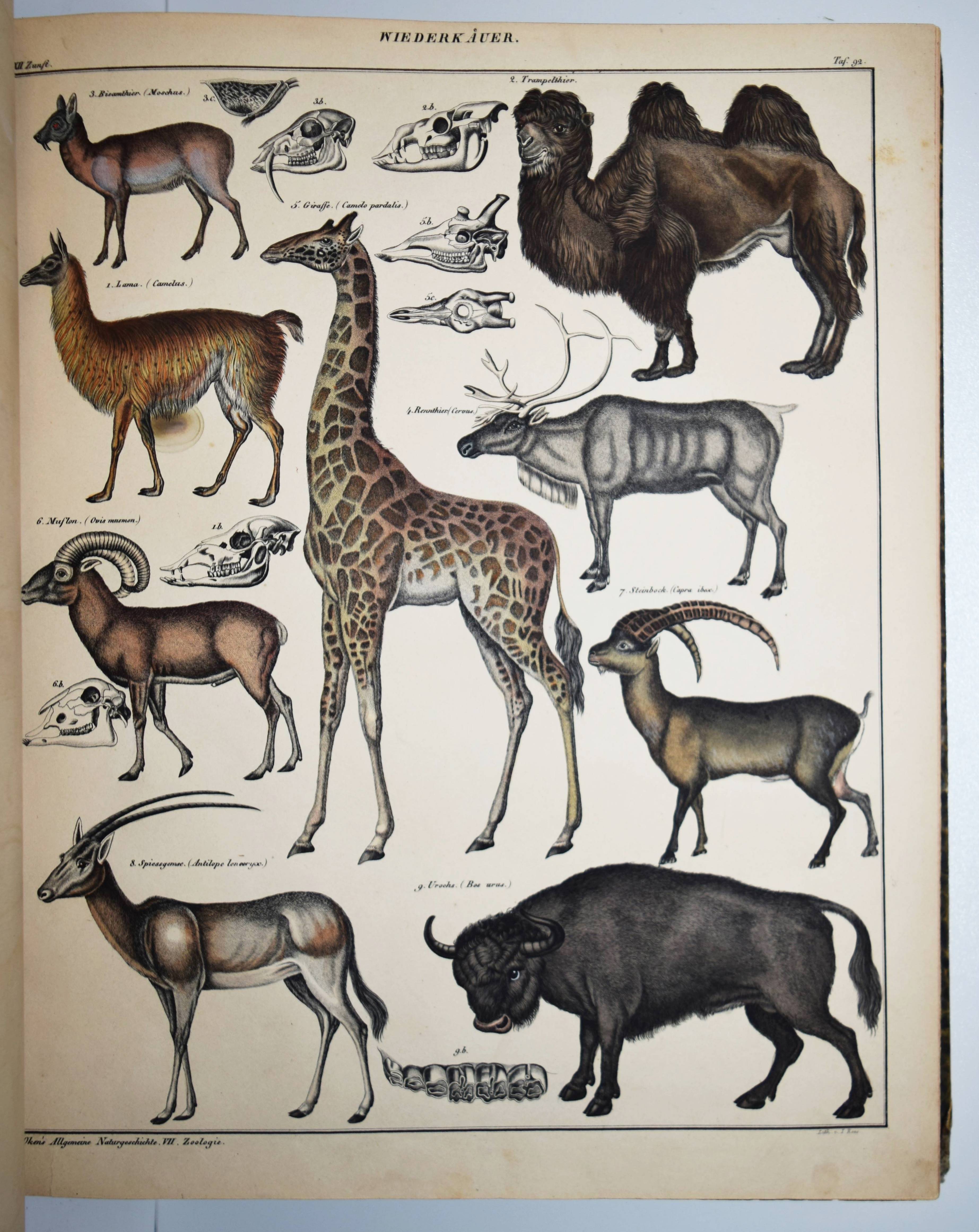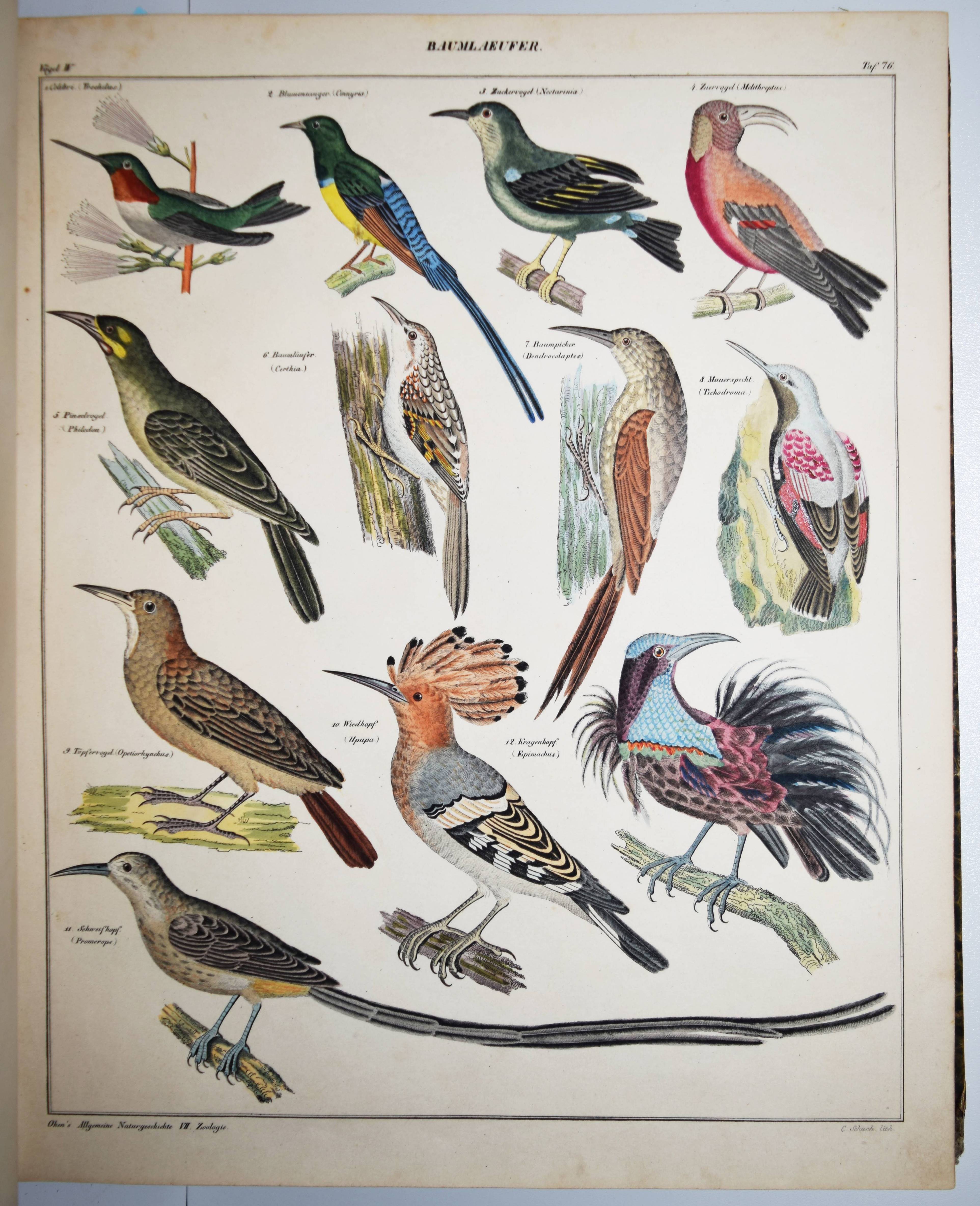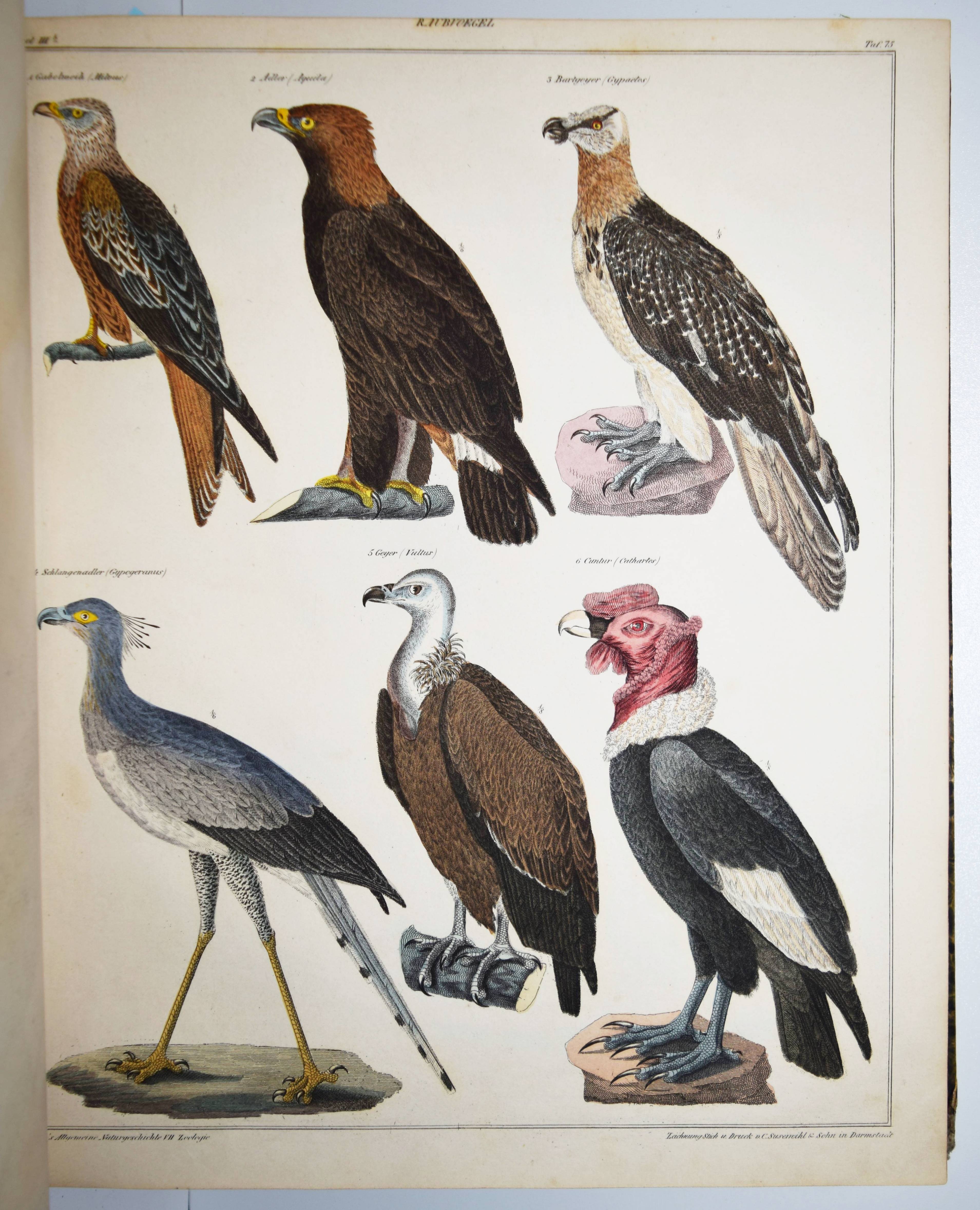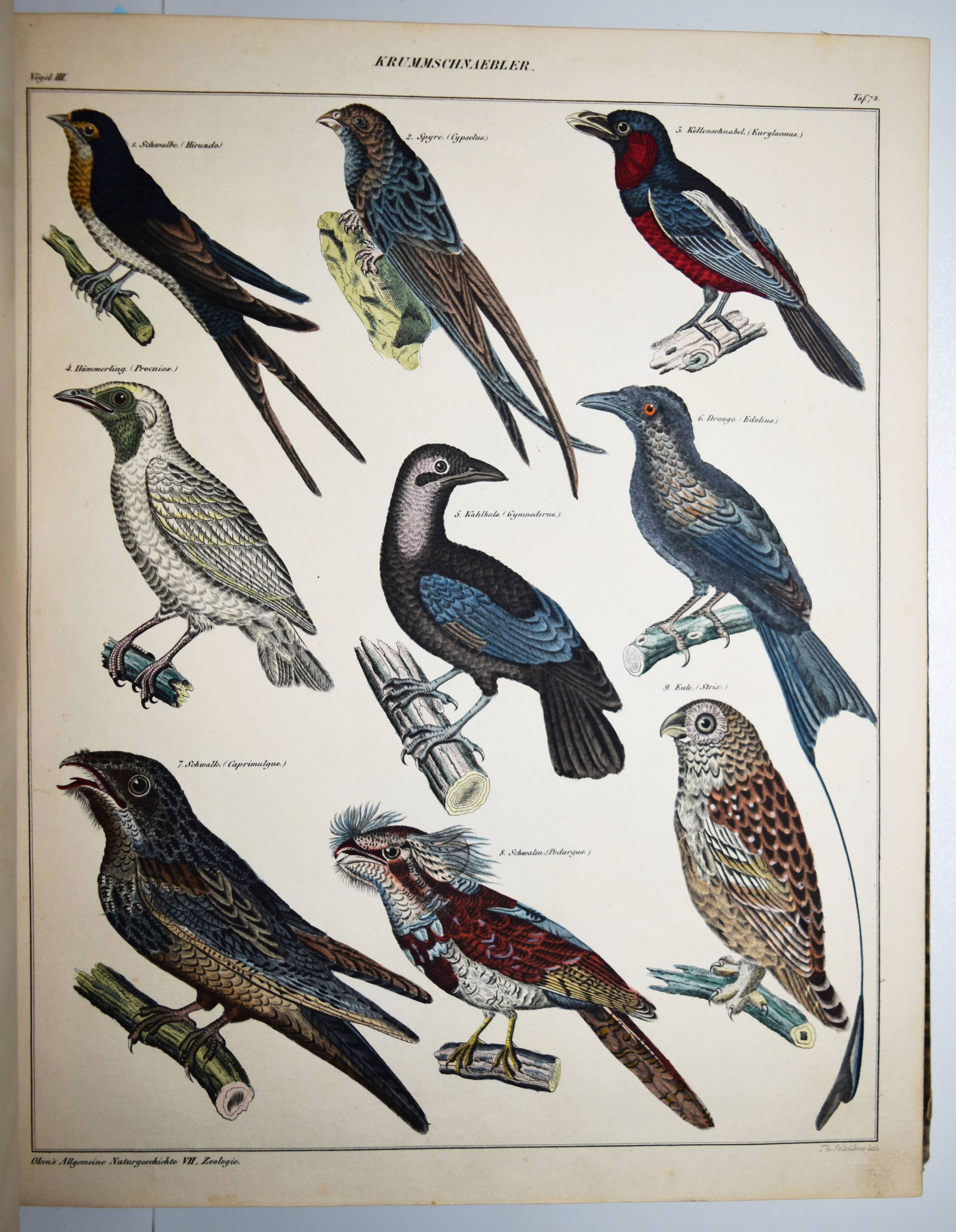 Oken, (Lorenz). Allgemeine Naturgeschichte für alle Stände. 7 Textbände in 14 (inkl. Registerband) und Tafelband (zus. 15 Bände). Stuttgart, Hoffmann 1838-1843. 8° (21 x 14 cm.) und Folio (35 x 29 cm.). Mit lithogr. illustr. Titel und 164 (132 handkolorierte) lithogr. Tafeln. Halblederbände der Zeit mit zweifarbigen goldgepr. Rückenschildern und Rückenvergoldung. ADB XXIV, 216 ff. Anker 375. Graesse V, 16. Horn-Schenkling 16535. Nissen, ZBI 3006. – Erste Ausgabe. – I. Mineralogie und Geognosie bearbeitet von F. A. Walchner. – II. und III., 1-3. Botanik. – IV. bis VII. Thierreich. – Registerband. – Tafelband mit Tafeln zur Mineralogie, Botanik, Anatomie und Zoologie, mit schönen Abbildungen von Fischen, Schmetterlingen, Vögeln u. a., deren Darstellung geht auf vergleichbare Sachbücher zurückgeht und die noch in der Tradition von Sammlerkabinetten steht. – „Seine große Naturgeschichte ist wohl das letzte Werk, in welchem ein und derselbe Verfasser die ganze Naturgeschichte erschöpfend behandelt. Sie ist eine weitere große Leistung Oken’s; denn wenn man auch zweifelhaft sein kann, ob das darin enthaltene Naturphilosophische anregend und befruchtend gewirkt hat, so ist doch der specielle Theil so reichhaltig und dabei so klar und faßlich behandelt, daß das vielverbreitete Werk oft und gern zu Rathe gezogen, „viel mehr benutzt als citirt wurde“. Von der Naturgeschichte des Mineralreichs stammt nur die allgemeine Einleitung aus Oken’s Feder. O. hatte schon 1809 eine eigene Classification der Mineralien aufgestellt, von der wenigstens die obersten Eintheilungen vielfach angenommen wurden. Die Botanik und Zoologie ist ganz Oken’s eigene Arbeit. Bei beiden geht dem speciellen, ausführlichen Theile eine allgemeine Einleitung voraus, welche vergleichende und descriptive Anatomie, Physiologie, Principien der Classification, geographische Verbreitung, Geschichte u. s. w. enthält. In der Einleitung zur Zoologie findet sich eine überaus klar und verständlich geschriebene, populäre Anatomie des Menschen. Als ein wirkliches Verdienst Oken’s gilt es, daß er vornehmlich in der Classification neben Fremdwörtern deutsche Termini nicht nur für Arten und Gattungen, sondern auch für die höheren Abtheilungen einführte“ (A. Lang in ADB). – Einbände etwas berieben und bestoßen, Tafel 57 (Fisch-Anatomie) mit restauriertem Eckabriß (minimaler Bildverlust), stellenweise etwas braunfleckig, sehr gutes dekorativ gebundenes Exemplar, vollständig mit dem Register- und Tafelband selten.