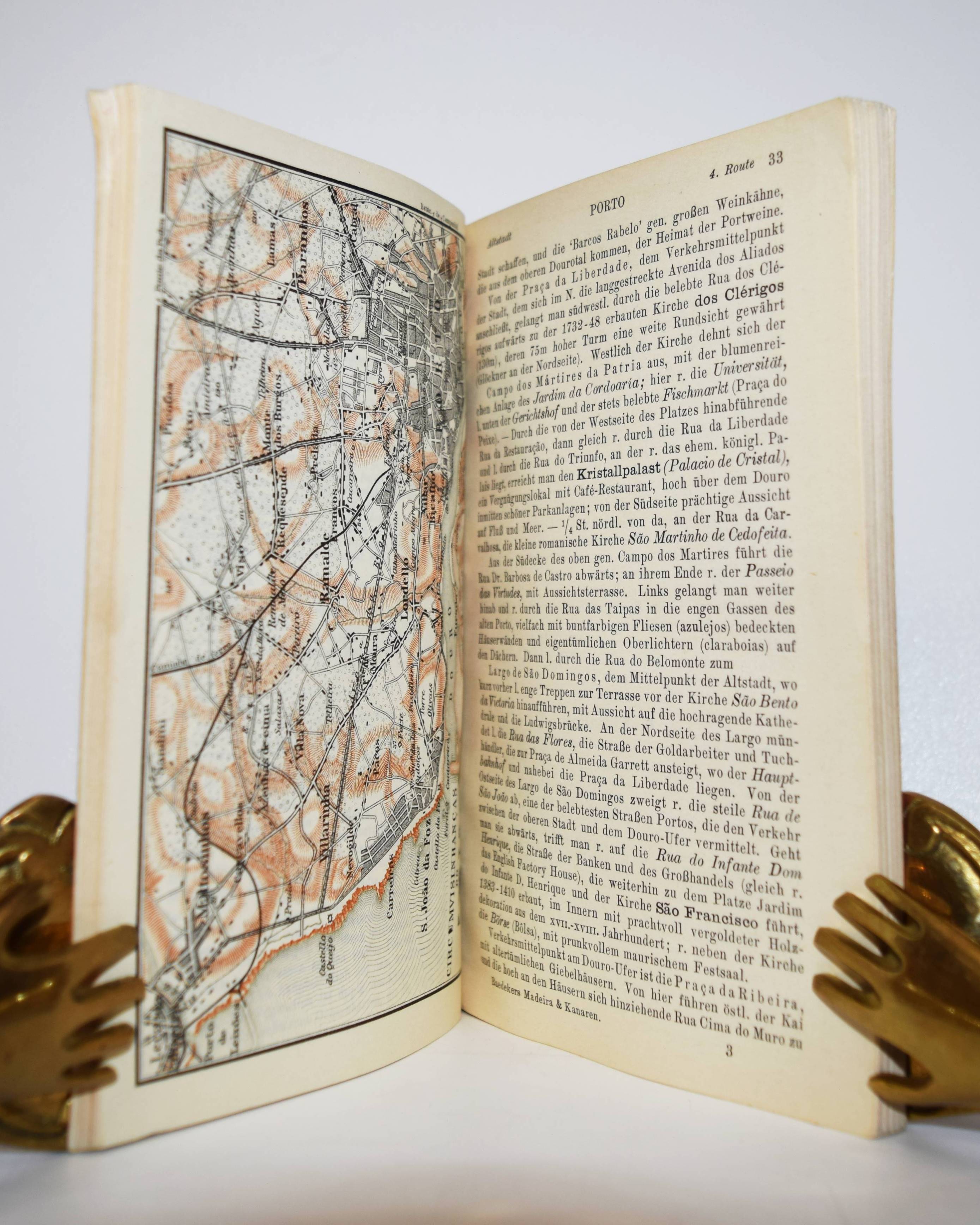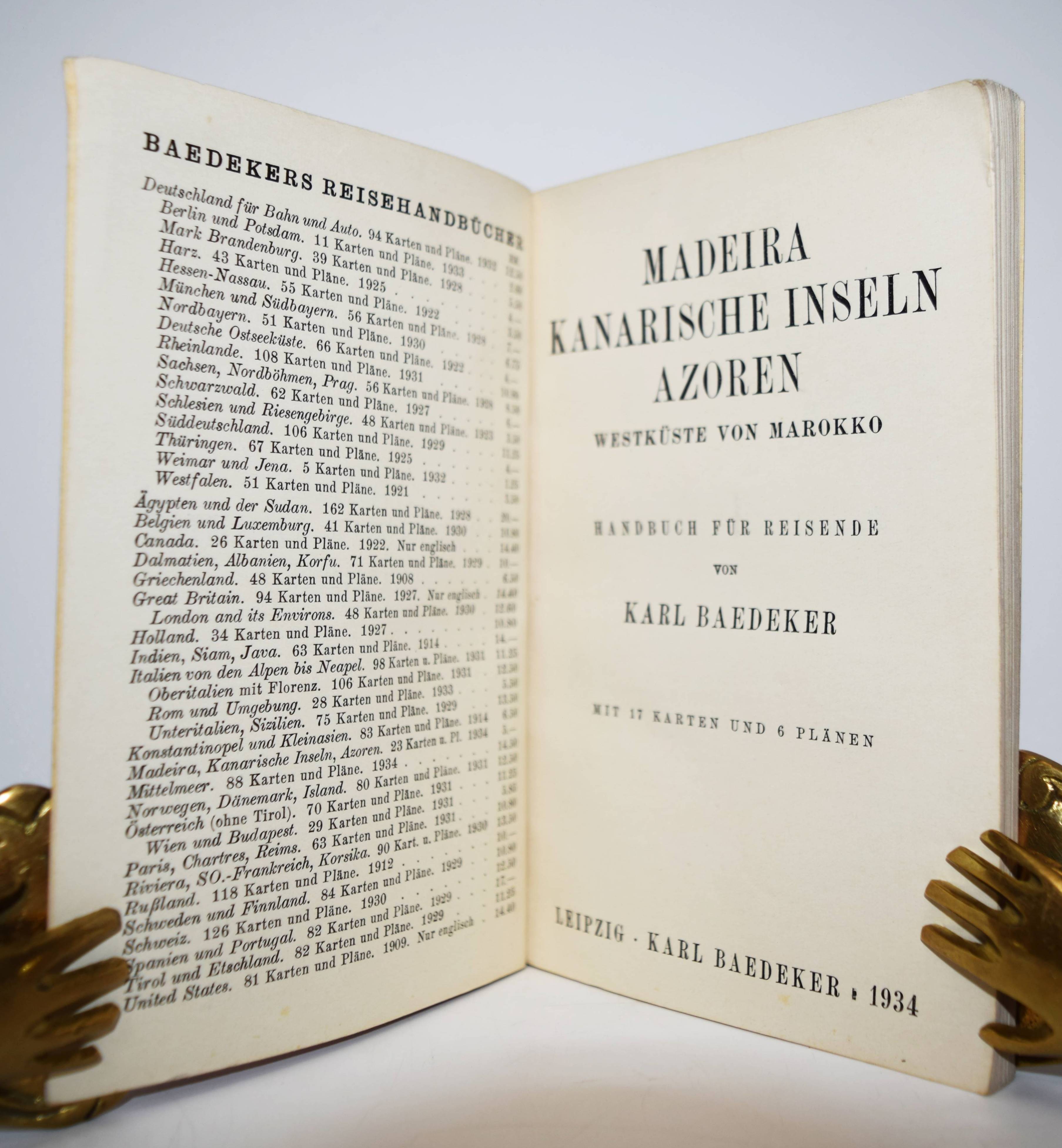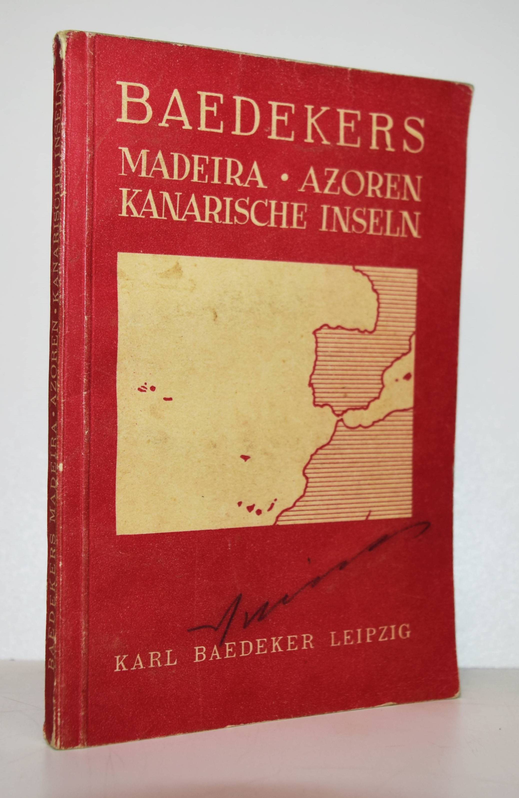Baedeker, Karl. Madeira. Kanarische Inseln, Azoren, Westküste von Marokko. Handbuch für Reisende. Leipzig, Karl Baedeker 1934. Kl.-8°. 112 S. mit 17 farbigen Karten und 6 Stadtplänen. Illustr. Kartonumschlag. Hinrichsen D 477. – Erste und einzige Ausgabe. – Umschlag etwas berieben, Vorderdeckel mit zeitgenöss. Besitzvermerk, sonst gut erhalten.