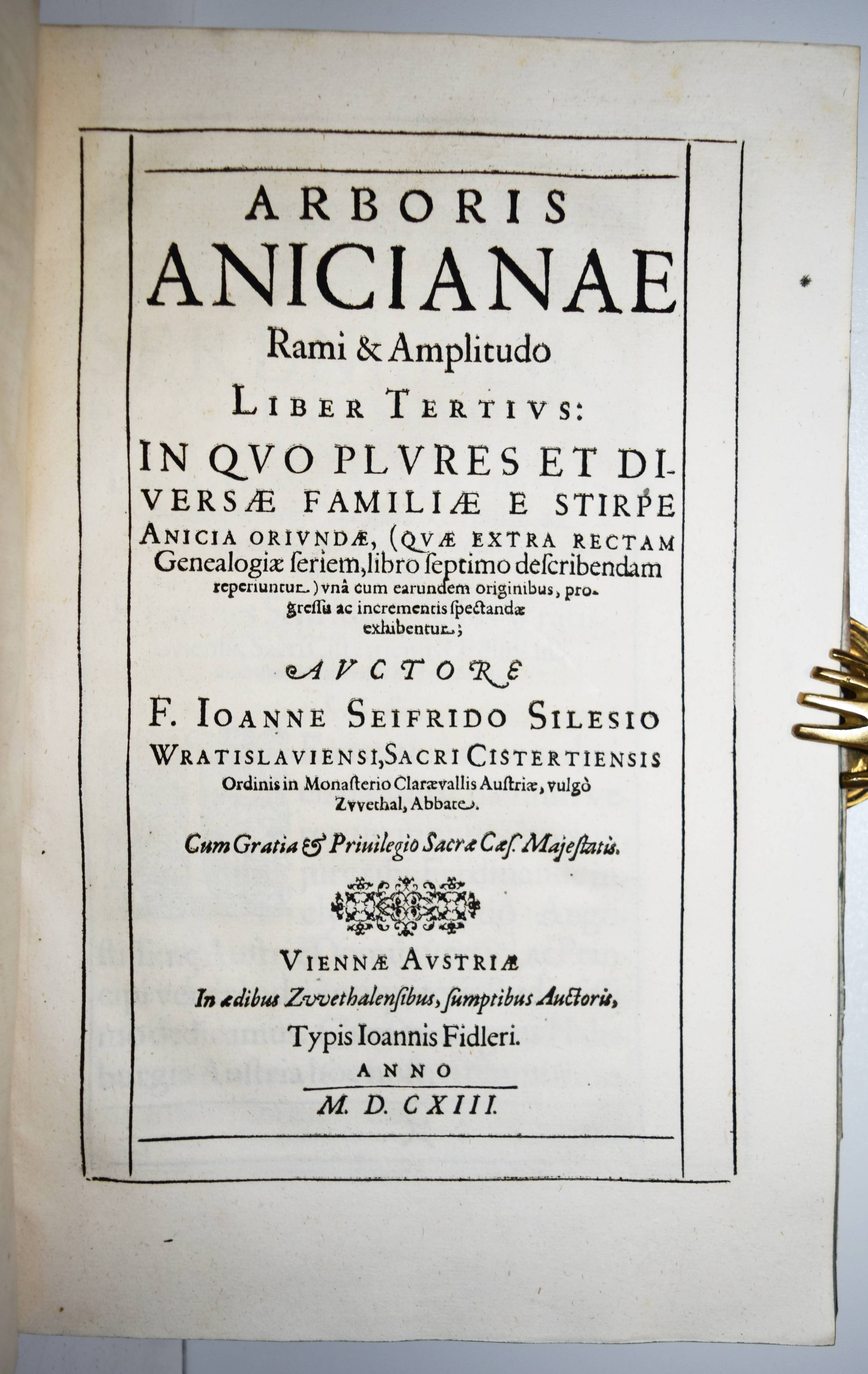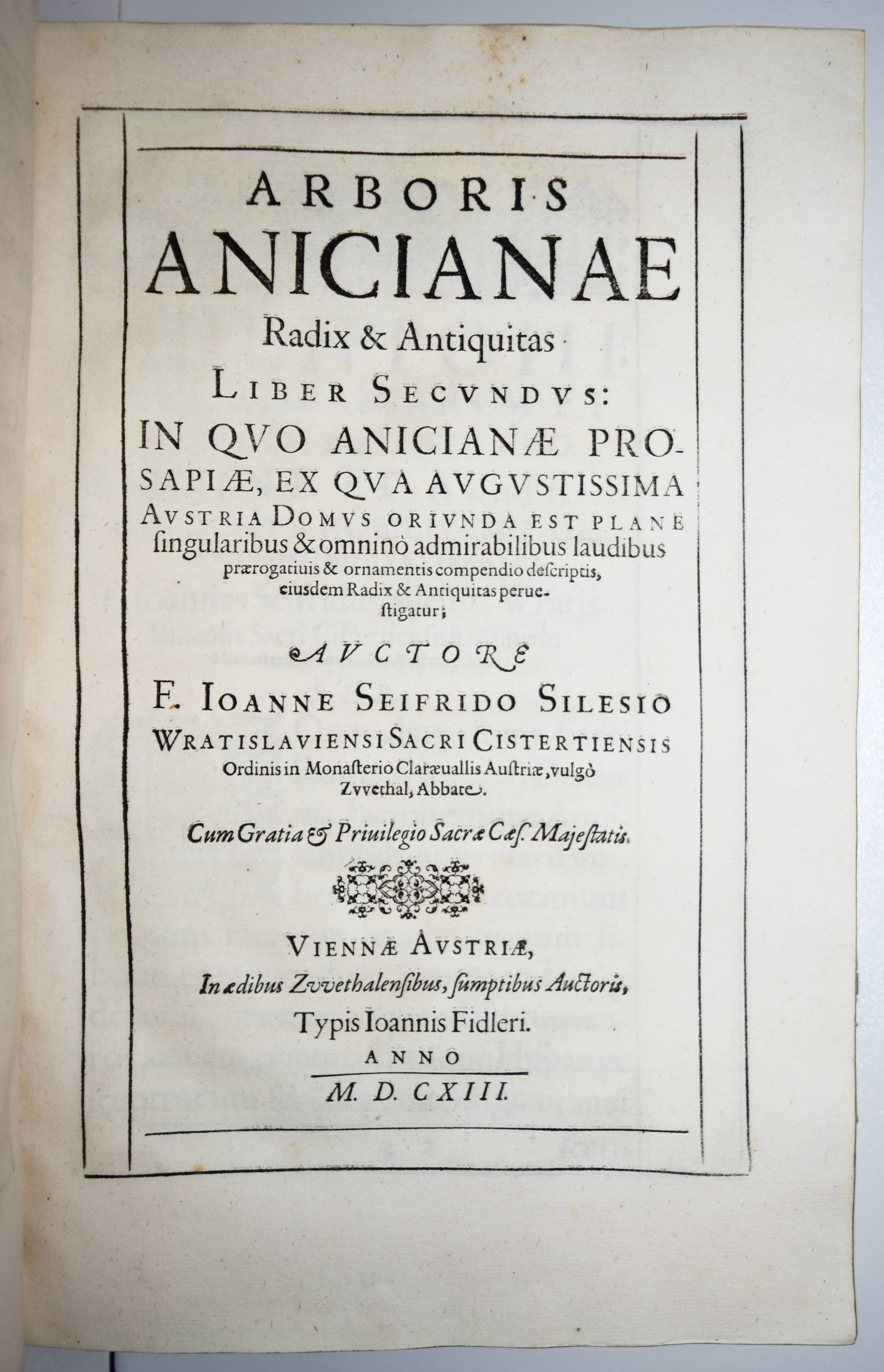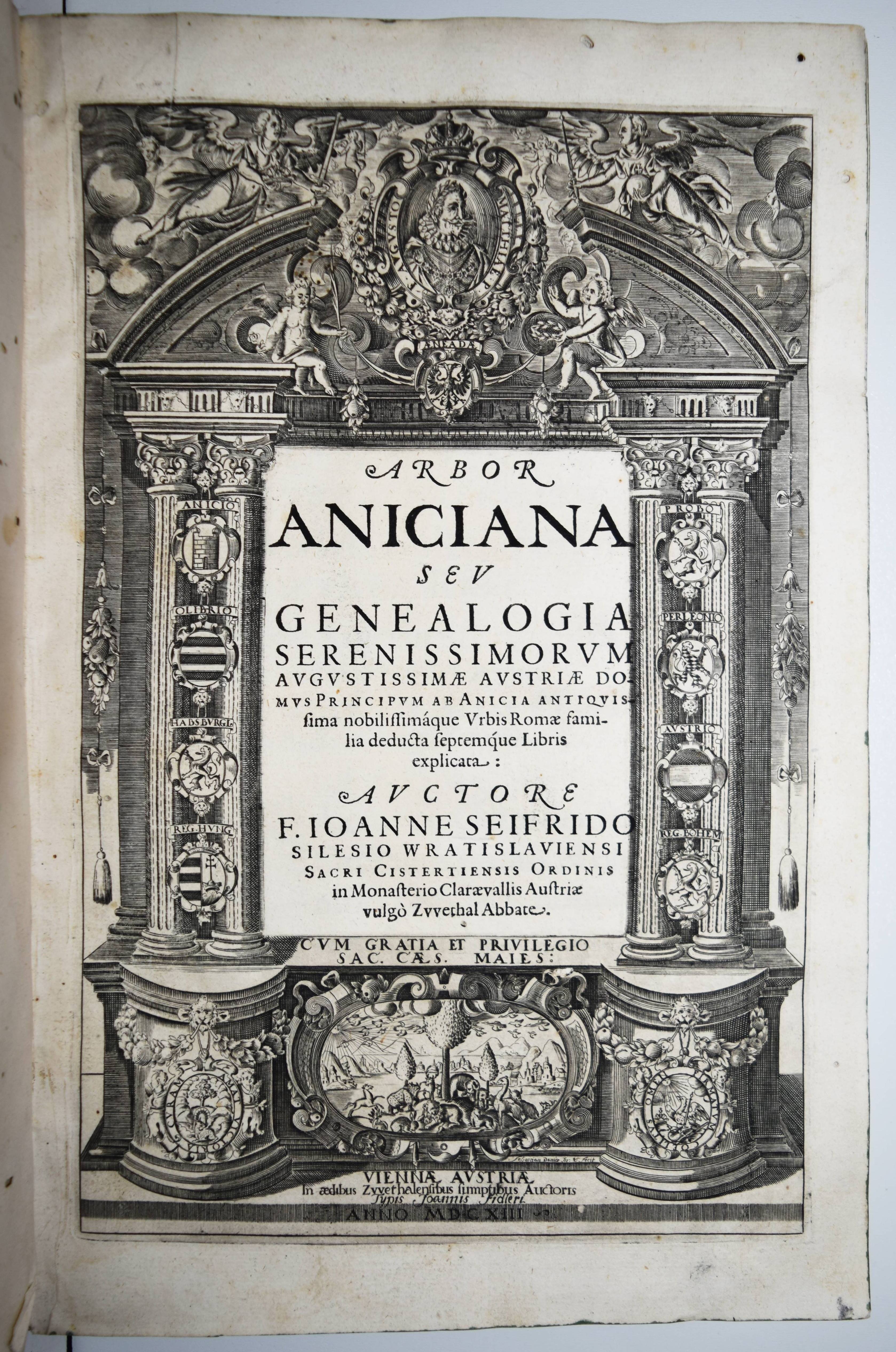 Seifried, Johann. Arbor Aniciana seu genealogia serenissimorum Augustissimae Austriae domus principum. Ab anicia antiquissima nobilissimaque urbis Romae familia deducta septemque libris explicata. 3 Teile in 1 Band (mehr nicht erschienen). Wien, Johann Fidler für den Autor in Zwettl 1613. Folio (31 x 21 cm.). [22] Bl., 83 S.; [5] Bl., 44 S.; 7 (erstes w.) Bl., 134 S., 1 Bl. Titel mit breitem Kupferstichrahmen und 9 Textkupfern. Pergamentband der Zeit. Coreth 31. Benzing, Buchdrucker 489. Bernd 2527 a. Jöcher IV, 485. Mayer I, 925. VD17 23:296807P. – Einzige Ausgabe, ursprünglich auf sieben Teile geplant. – Sehr seltener Wiener Druck; Johann Fidler war zwar Bürger der Universität, aber nicht Bürger der Stadt und konnte daher nur unter größten Schwierigkeiten drucken. Neben diesem Privatdruck ist nur ein weiterer Titel von ihm bekannt. – Eine der letzten Schriften, in der der römische Ursprung der Habsburger verfochten wurde. Johann Seifried stammte aus Breslau und war von 1612 bis 1625 Abt im Stift Zwettl. – Die Kupferstiche zeigen Münzen und Wappen. – Einband teils stärker angestaubt und fleckig, zu Beginn und Ende etwas wurmstichig, sonst gut erhalten.