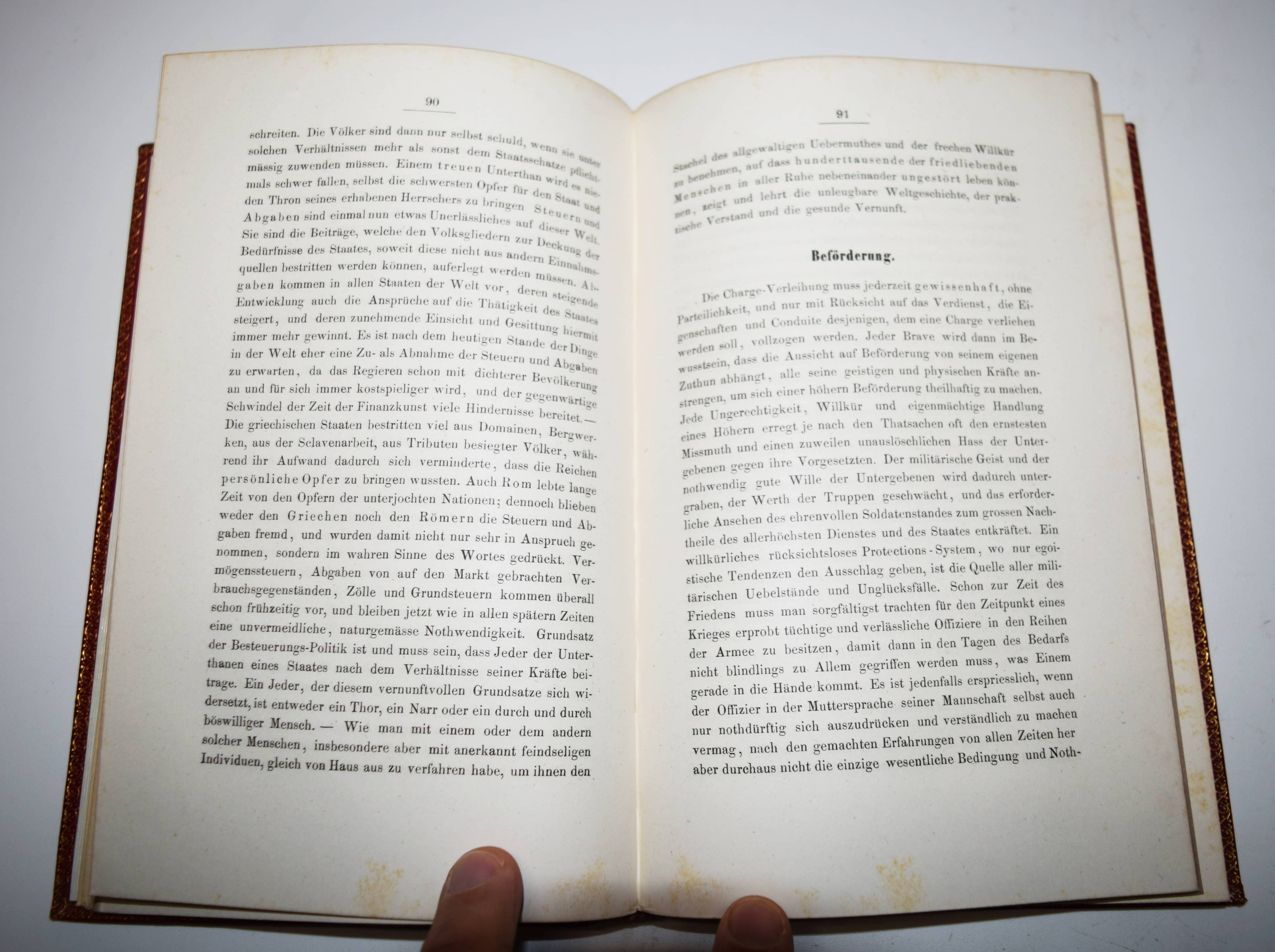 Herminenthal, Rudolph Jakob v. Der Soldatenstand. Wien, Druck und Verlag der typographisch-literatisch-artistischen Anstalt 1862. 8°. [6] Bl., 305, (5) S. Weinroter Maroquin-Lederband mit goldgepr. Rückentitel, Rücken-, Deckel- und Innenkanten, goldgepr. Deckelvignette (Doppeladler) und Goldschnitt. Erste Ausgabe; sehr selten, wohl nur in kleiner Auflage erschienen. – Sehr dekorativ gebundenes Geschenkexemplar. – Gewidmet Kronprinz Rudolph. Enthält Kapitel u. a. über Gebieten und Befehlen; Exerciren; Verpflegung des Soldaten; Beförderung; Heldenmuth; Fahnen und Standarten; Operationspläne; Kriegsgefangenschaft; Adjutant; General und General-Stab. – Der Autor war k.k. Major im Feldmarschall-Lieutenant Ladislaus Freiherrn Nagy von Also-Szopor Linien-Infanterie-Regimente Nr. 70. – Teils braunfleckig, schönes Exemplar aus der Bibliothek von Rolf Keller mit dessen Exlibris (gestaltet 1929 von Rudolf Oeffinger).