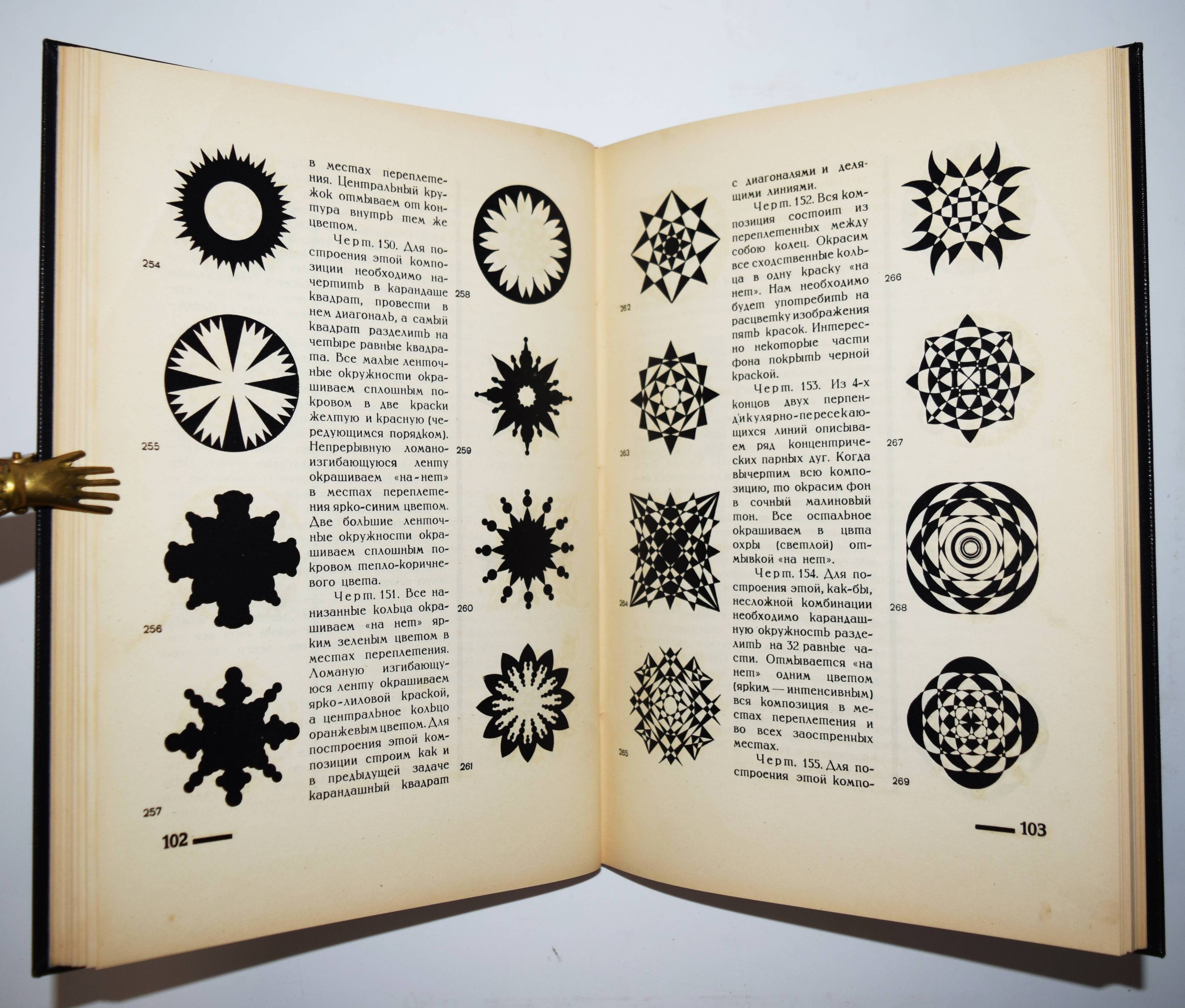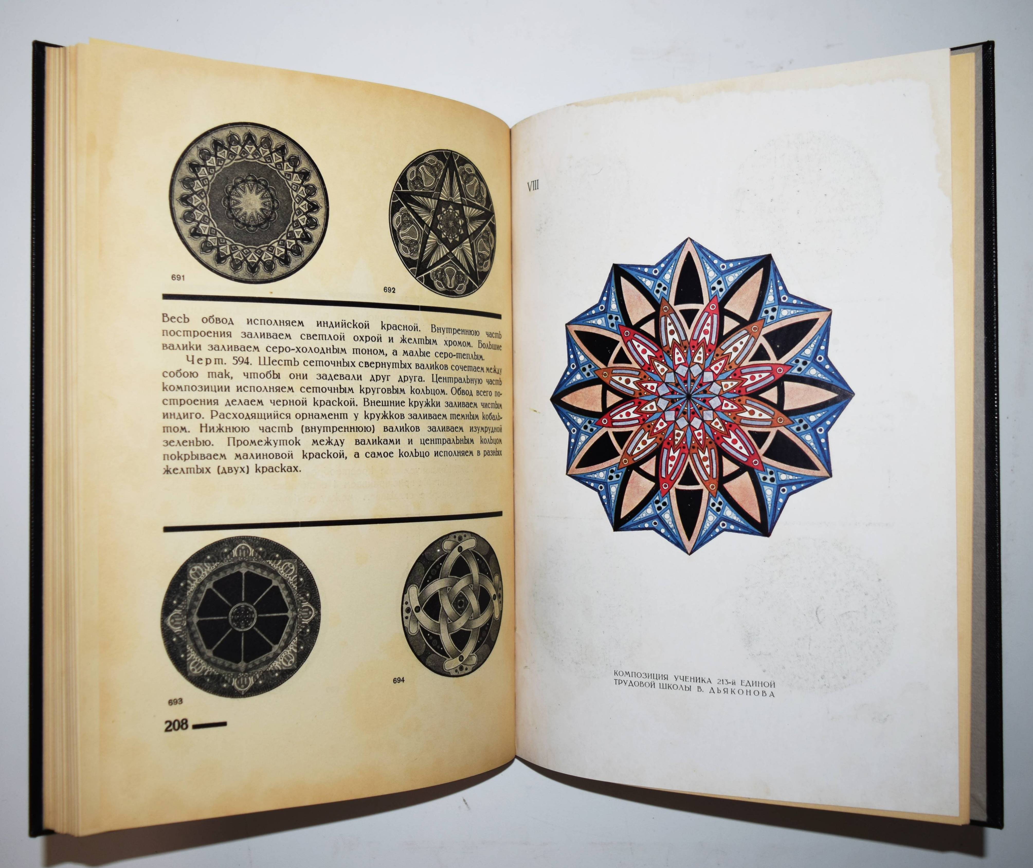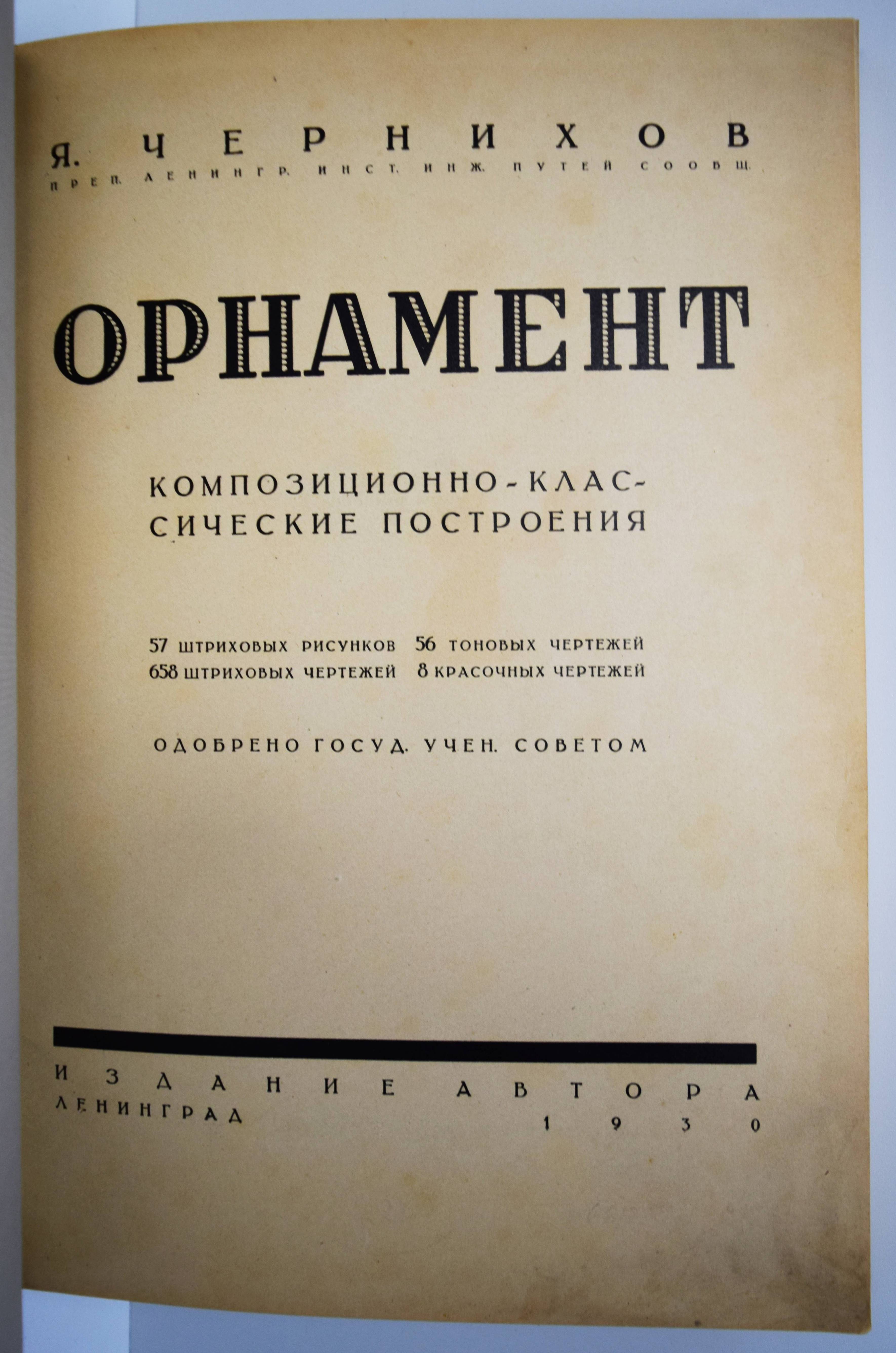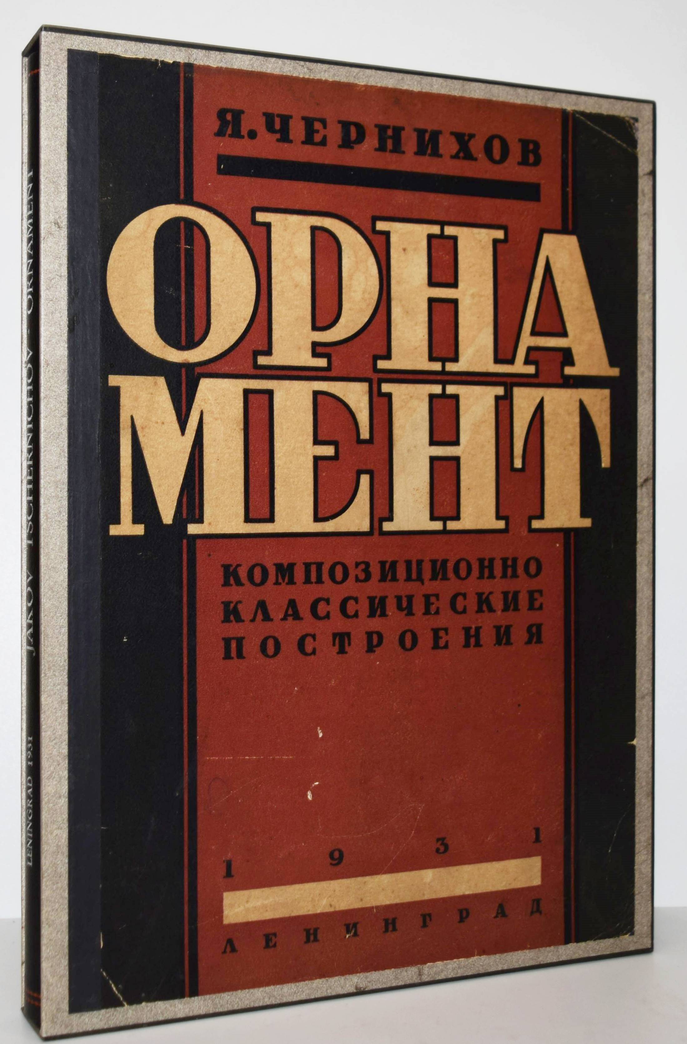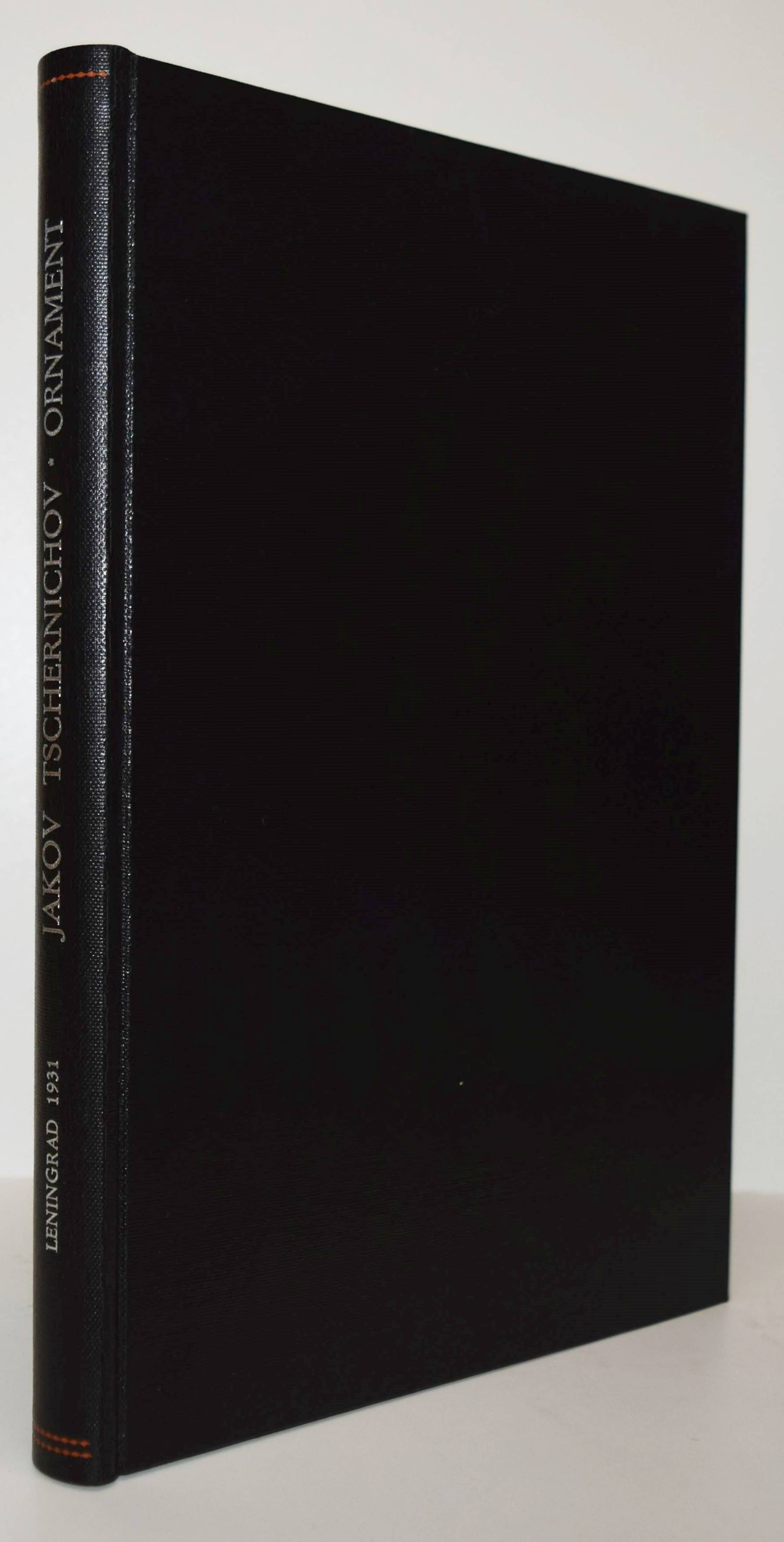 Chernikhov (Tschernychow, Tchernikhov), Iakov (Georgievich). Ornament. Kompozitsionno-klassicheskie postroeniia. (Compositional-Classical Constructions, Konstruktion klassischer Komposition). Leningrad, Eigenverlag 1930/1931. 4° (30 x 22,5 cm.). 221 S., [3] Bl. mit 8 Farbtafeln und 772 weiteren Abbildungen im Text. Moderner schwarzer Leinenband mit silbergeprägtem Rückentitel in Pappschuber mit montiertem Orig.-Umschlag (hinterer Umschlagdeckel liegt bei). Compton, Russian Avant-Garde Books 1917-34, S. 142. Hellyer 73. Rowell/Wye 857 (verz. nur 7 Farbtafeln). – Sehr seltene erste Ausgabe von Chernikhovs berühmtem Lehrbuch zur avantgardistischen Formenlehre. Nur in 3100 Exemplaren erschienen. – „A practical textbook aimed at students, with illustrations of correct and incorrect ways to draw, color, etc., and it seems remarkable today for its myriad of geometric conceits generated without the help of a computer“ (Compton). – Sehr gutes Exemplar.